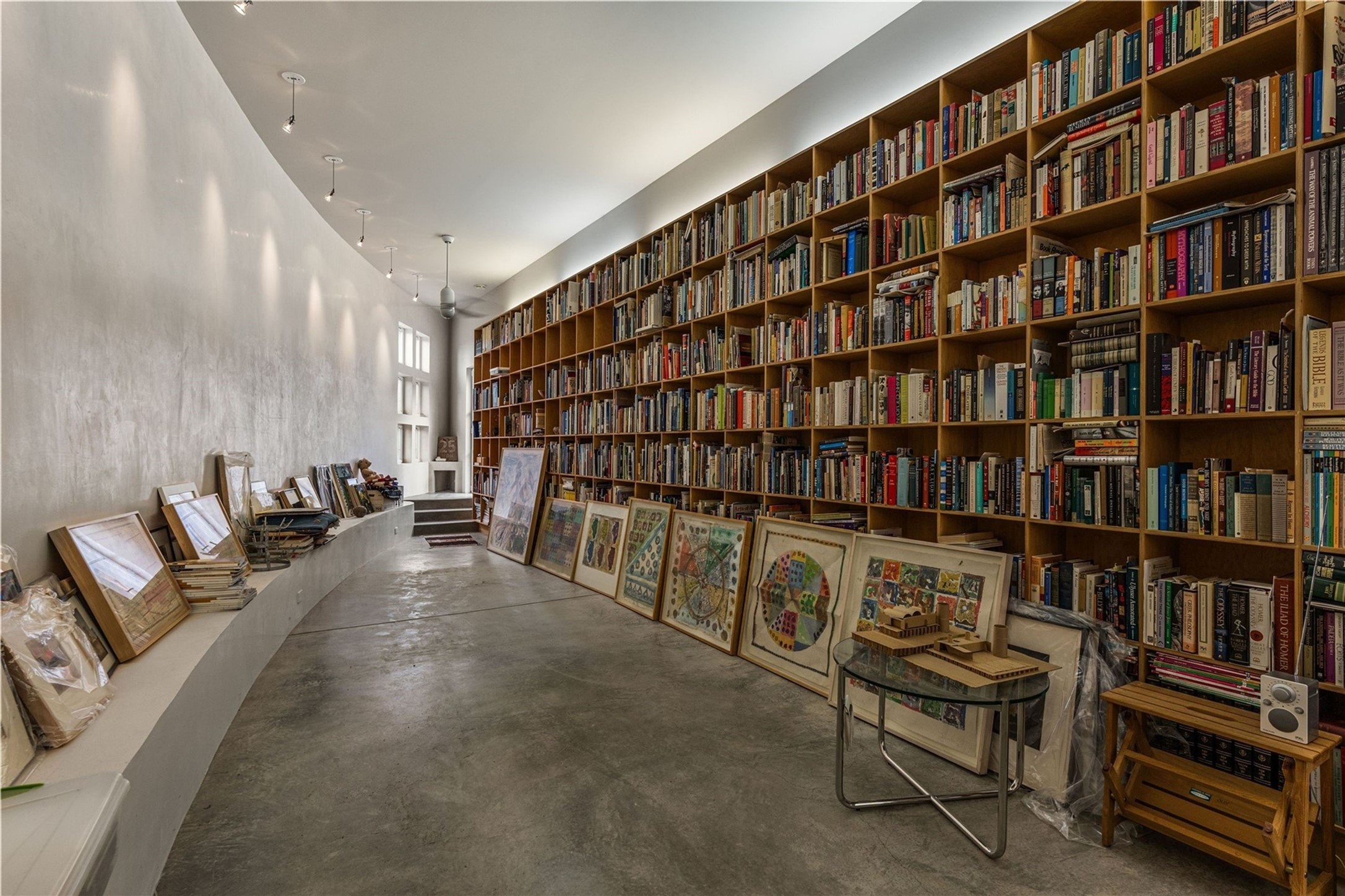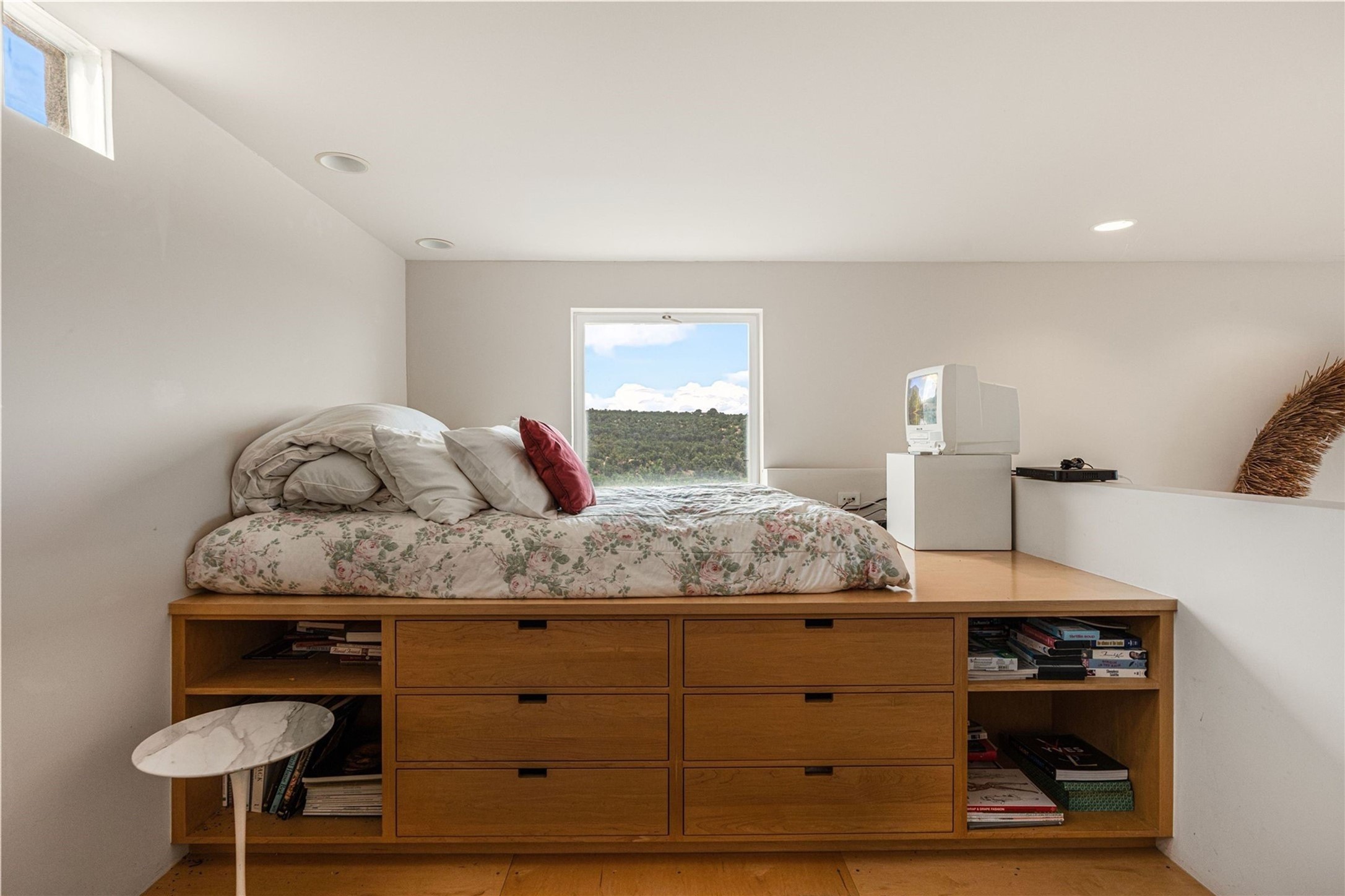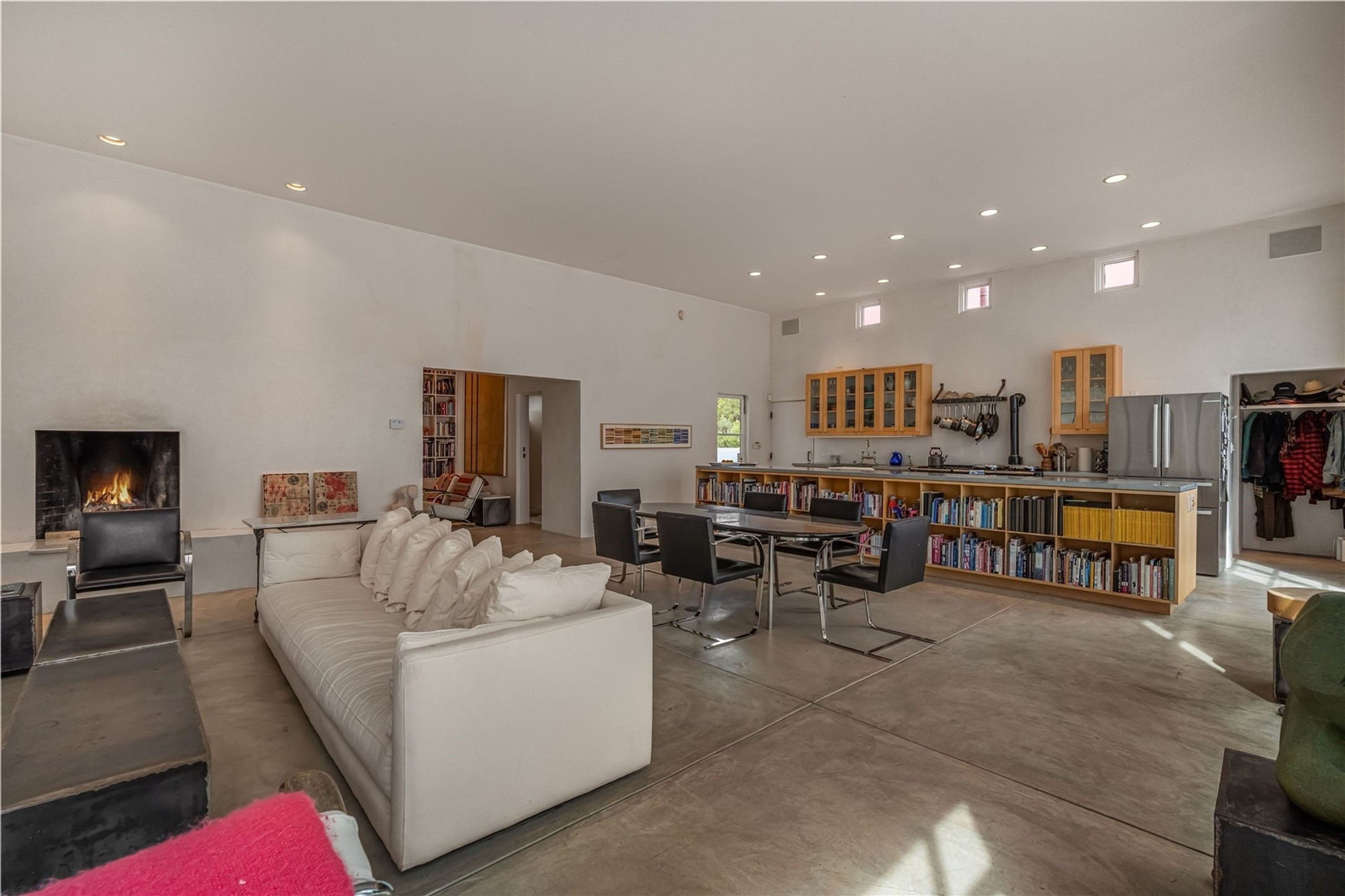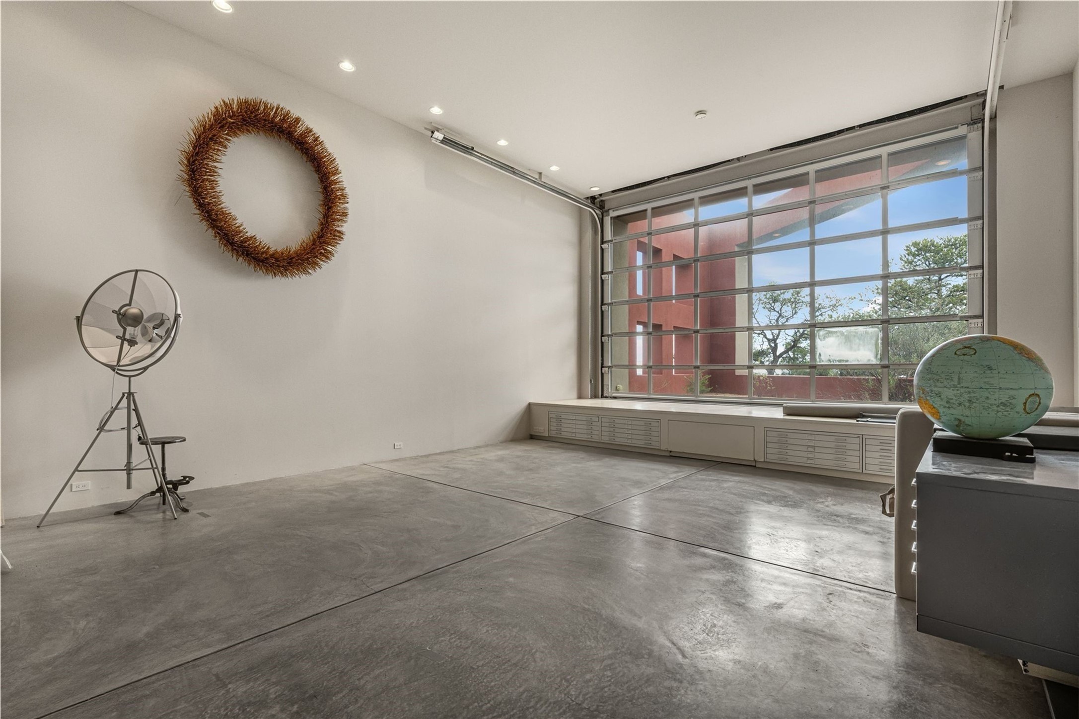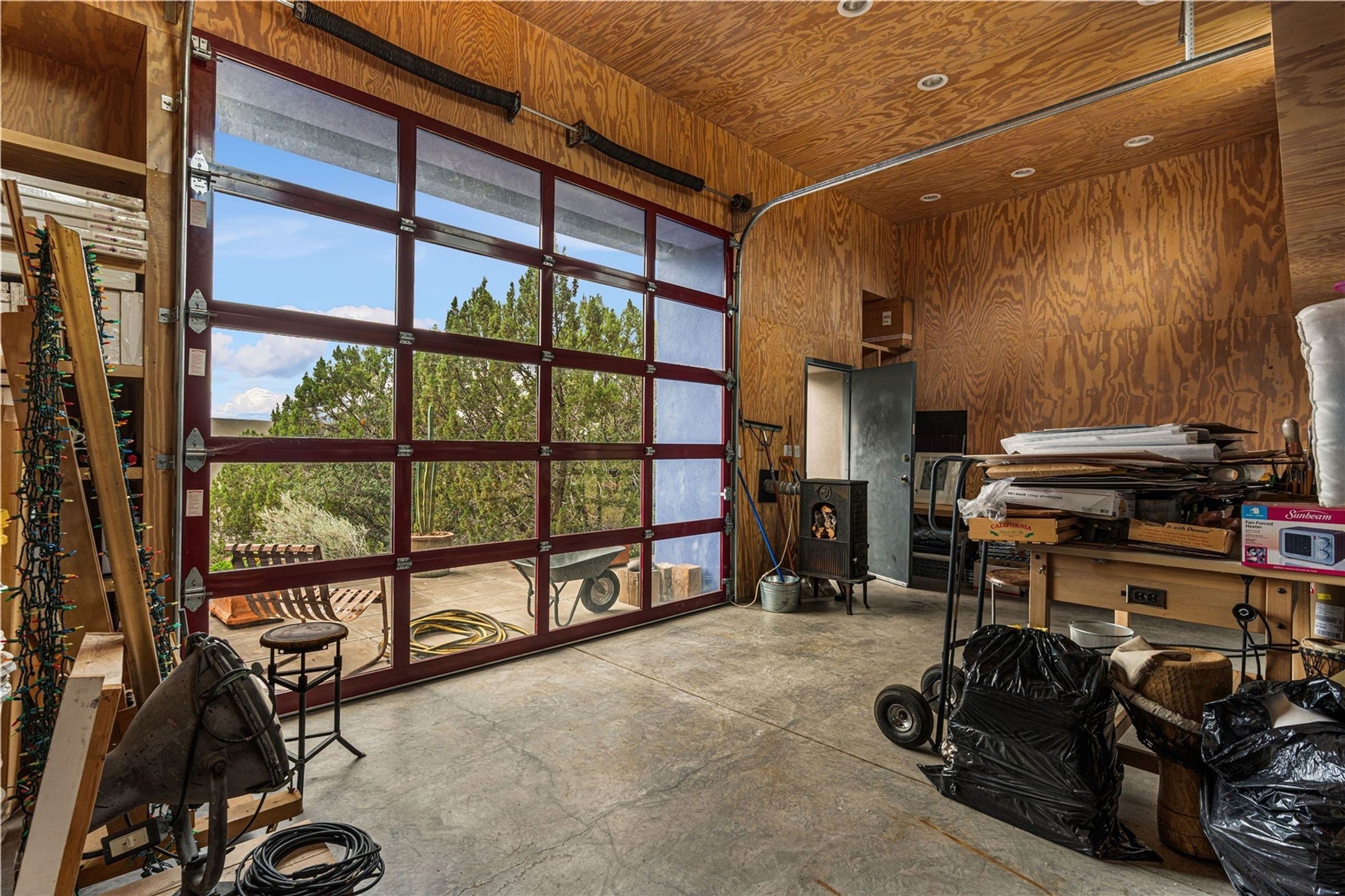Stunning Modernist artist retreat in Tesuque located on a heavily wooded 7+/- acre view lot. Conceived by the owner as a private residence including a spectacular professional studio high on a ridge above the residence, the living quarters are divided into two structures separated by a spacious bricked patio.The larger of the two structures includes a well-equipped kitchen featuring an Aga stove, zinc counters that separate the dining area which leads to the living area. Open concept design, 12 foot ceilings throughout, surrounded by 10' glass walls on two sides, there are polished concrete floors, in-floor radiant heat, all adding to a great sense of volume and space. In intimate study that functions as a occasional guest bedroom includes a 3/4 bath. There is passive solar heating assistAccoss the bricked patio is the second structure including a massive bedroom, a large walk-in closet and full bath with jetted tub, twin sinks and shower compartment. 12' ceilings, diamond plastered walls and polished concrete floors with in-floor radiant heat and 10' glass walls.On the ridge above is an amazing professional studio that has been used for photography. A full dark room is included. There are polished concrete floors with radiant heat, 12' ceilings and a huge glass wall with a roll-up glass door. Also there is a guest space that includes a kitchen, a 3/4 bath and sleeping loft. Adjacent but completely separate is a stunning 65' long gallery and library with 10' high wood grid bookshelves.