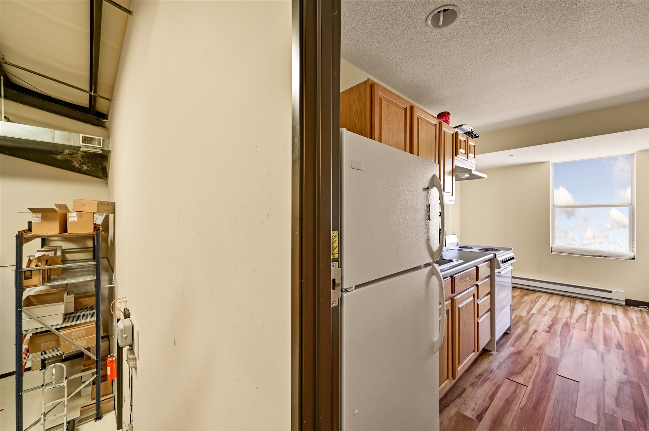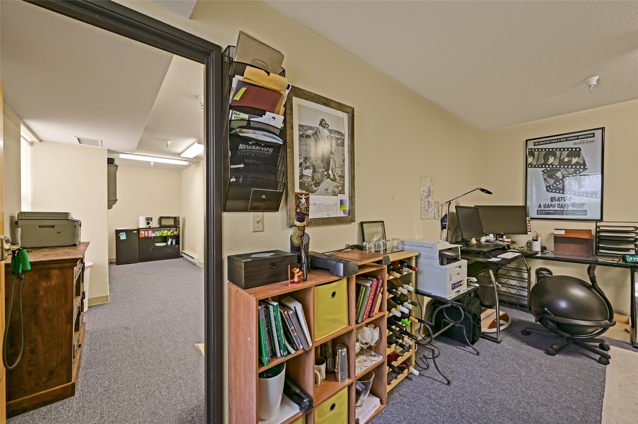 Versatile live/work space featuring a reception/waiting or showroom area, office, and half restroom, along with an L-shaped warehouse that includes a large 12' roll-up door and 23' ceilings. Upstairs offers a studio apartment with a kitchenette and three-quarter bath. This flexible property is ideal for small distribution, light manufacturing, storage, or boutique fitness classes. Additional highlights include ample parking, a convenient location, and excellent proximity to 599, I-25, and Highway 14. The well-maintained Condo Association has a monthly unit fee of approx. $325. This property is currently occupied with a tenant in place until June 30, 2026, providing immediate rental income for the new owner.Tenant Renewal Option: 3-year extension available.