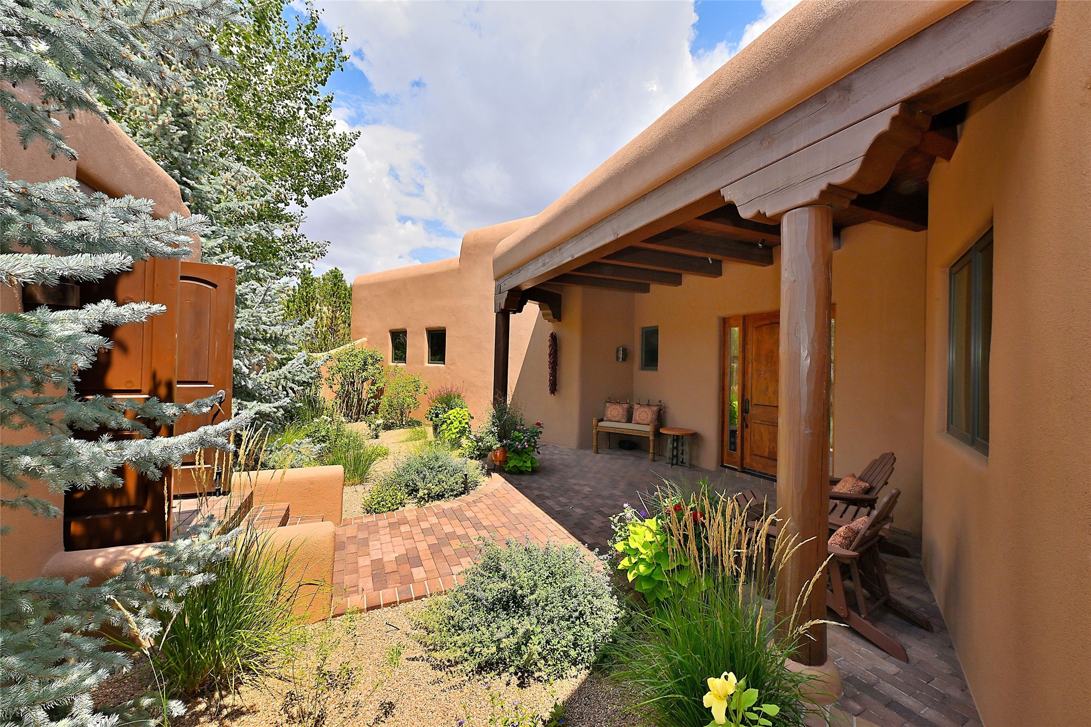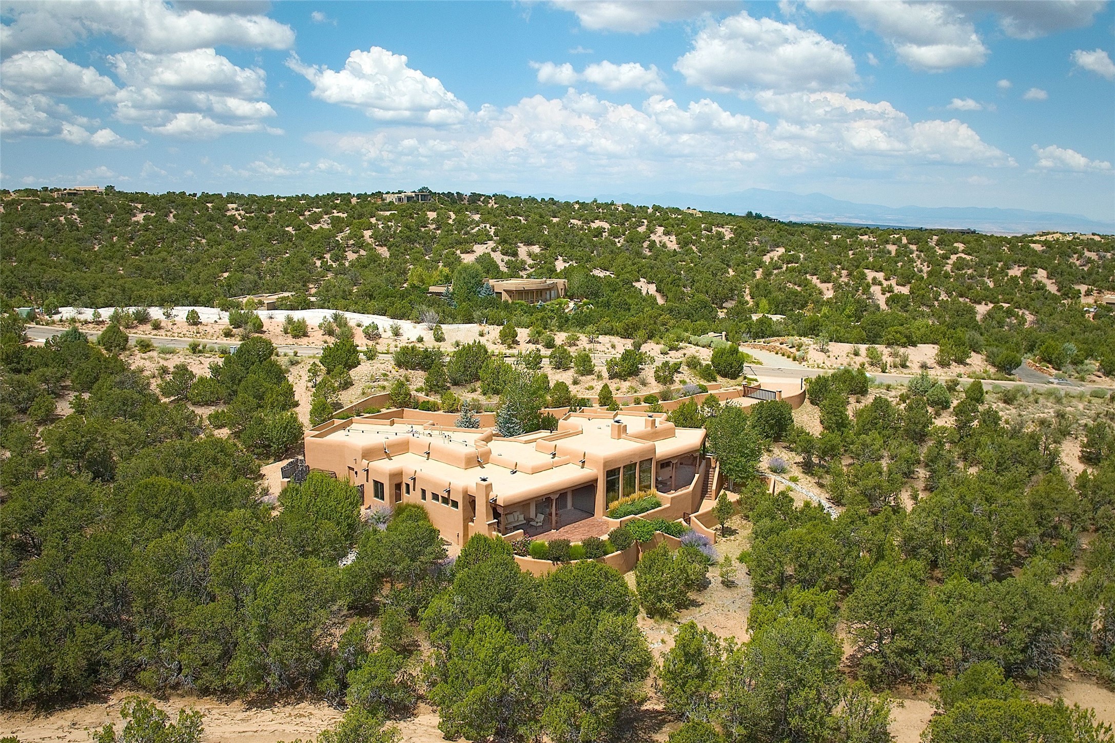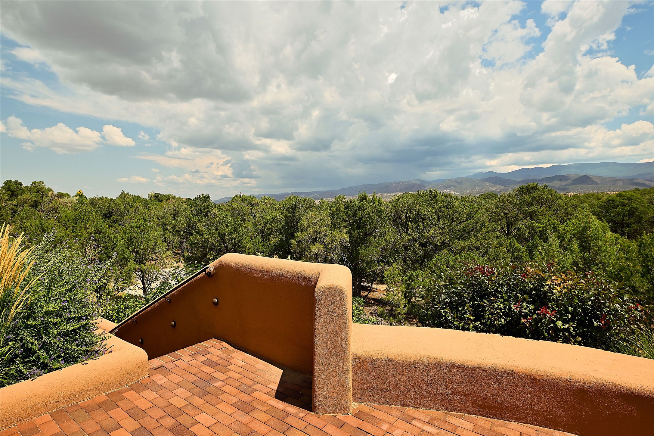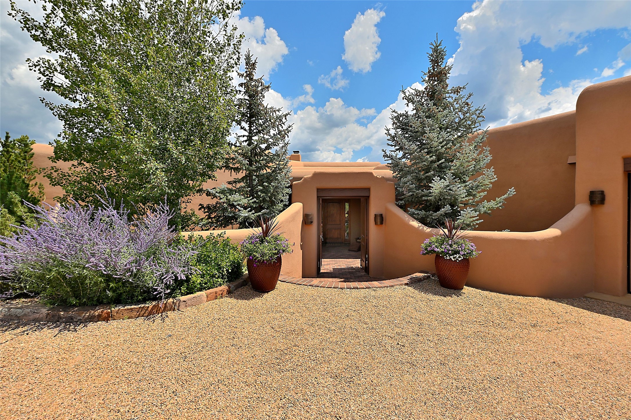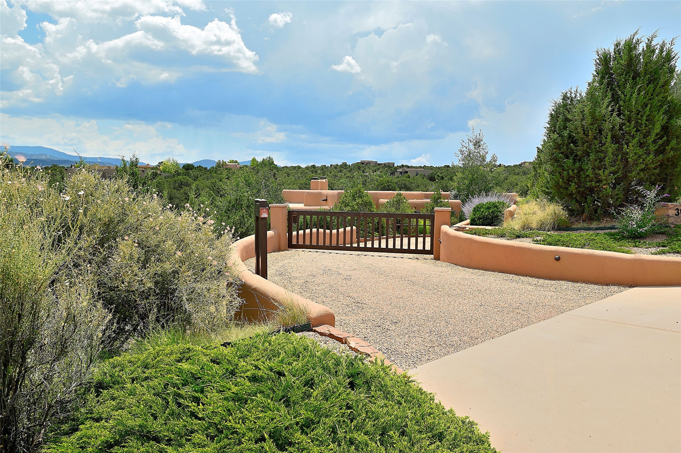 The moment you enter through the private gate, you realize this home is special in its privacy and quality construction. In all of Monte Sereno, truly unobstructed views of the Sangre de Cristo Mountains are rare, but due to adjoining lot configurations, this classic Pueblo Revival masterpiece built by Dressel Construction captures enormous views yet maintains its autonomy. The three bedroom and a study floor plan, along with high ceilings and a large portal area - are all adorned with true "high-end" finishes. The open floor plan allows for easy access to the living room/dining room/kitchen space - all of which flows to the grand outdoor portal space. The primary suite is entered through a private study area - all of which is separated from the other two bedroom suites. Architect Larry Andreen intentionally designed angles to the home to maximize the views and to avoid boring linear spaces. The finishes throughout are top-of-the-line, and exudes quality at every turn.