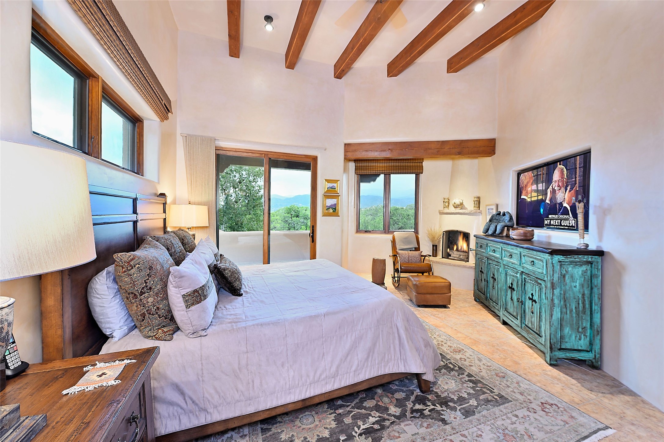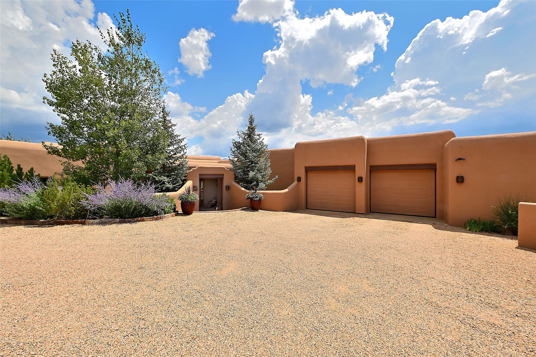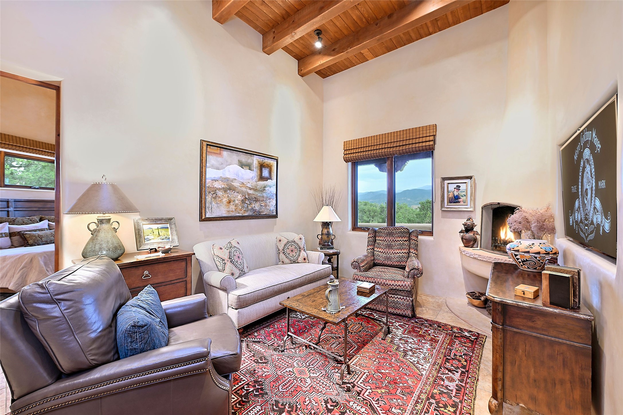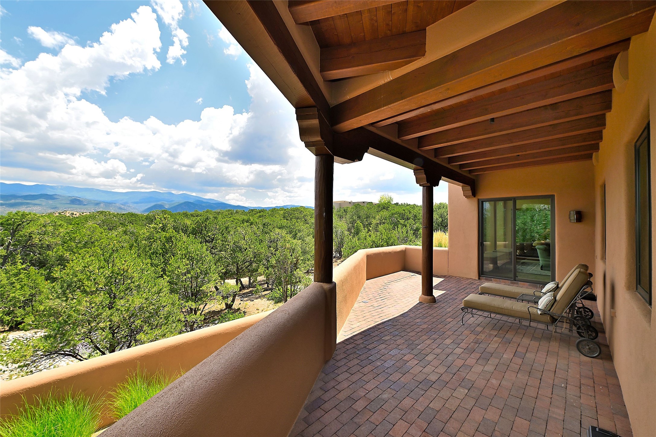 The moment you enter through the private gate, you realize this home is special in its privacy and quality construction. In all of Monte Sereno, truly unobstructed views of the Sangre de Cristo Mountains are rare, but due to adjoining lot configurations, this classic Pueblo Revival masterpiece built by Dressel Construction captures enormous views yet maintains its autonomy. The three bedroom and a study floor plan, along with high ceilings and a large portal area - are all adorned with true "high-end" finishes. The open floor plan allows for easy access to the living room/dining room/kitchen space - all of which flows to the grand outdoor portal space. The primary suite is entered through a private study area - all of which is separated from the other two bedroom suites. Architect Larry Andreen intentionally designed angles to the home to maximize the views and to avoid boring linear spaces. The finishes throughout are top-of-the-line, and exudes quality at every turn.