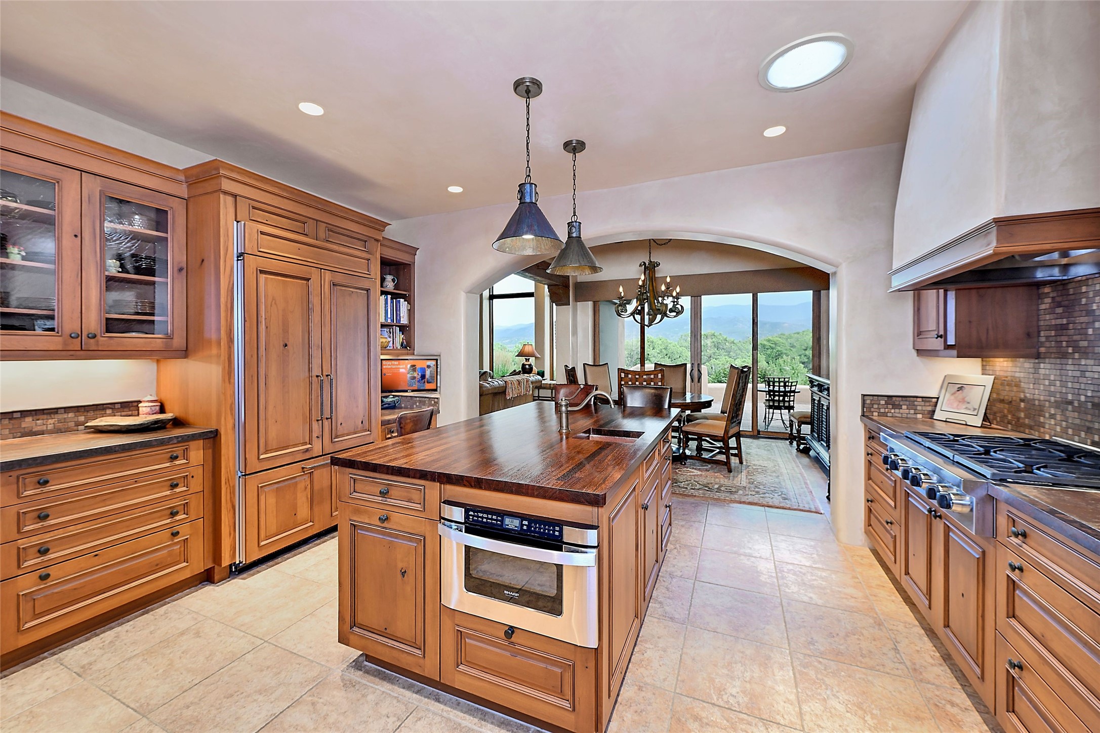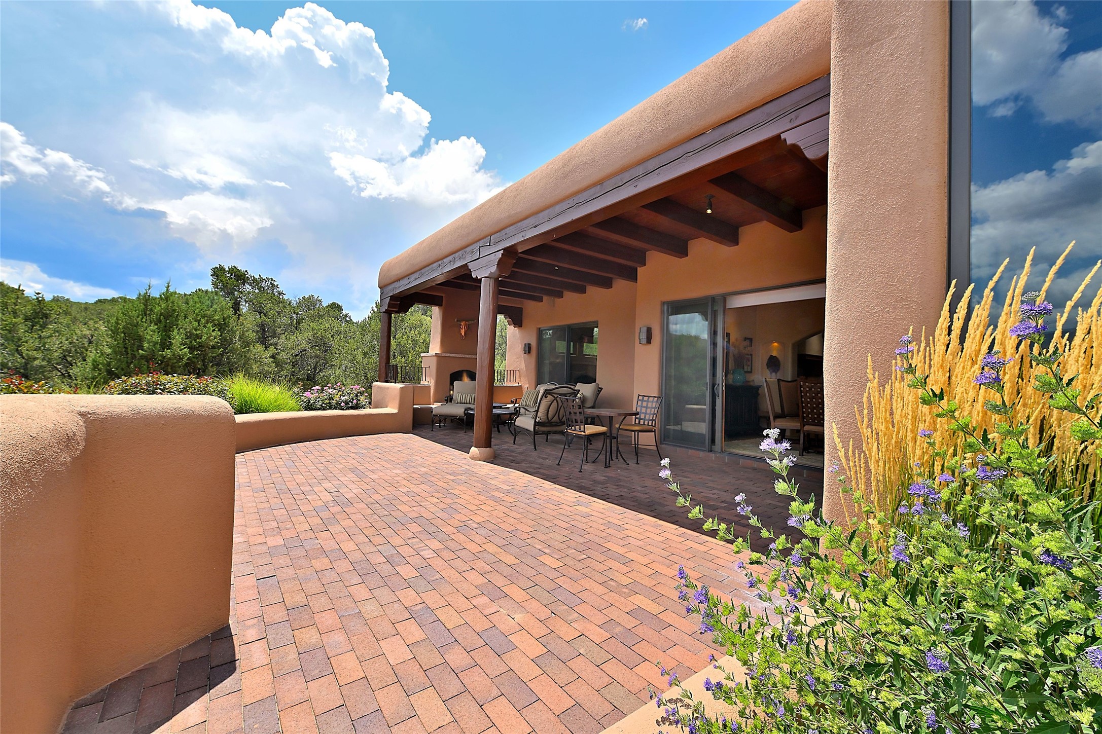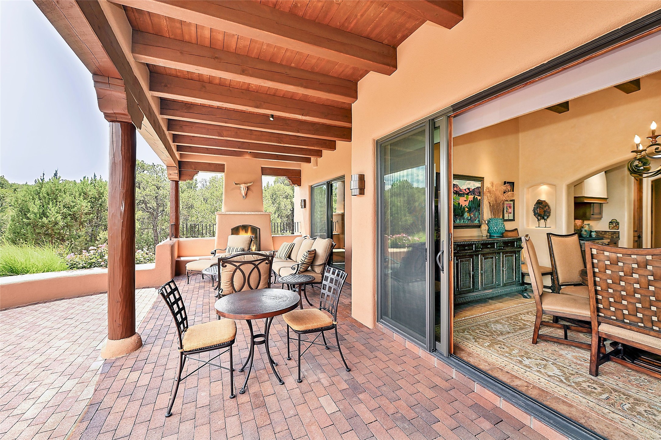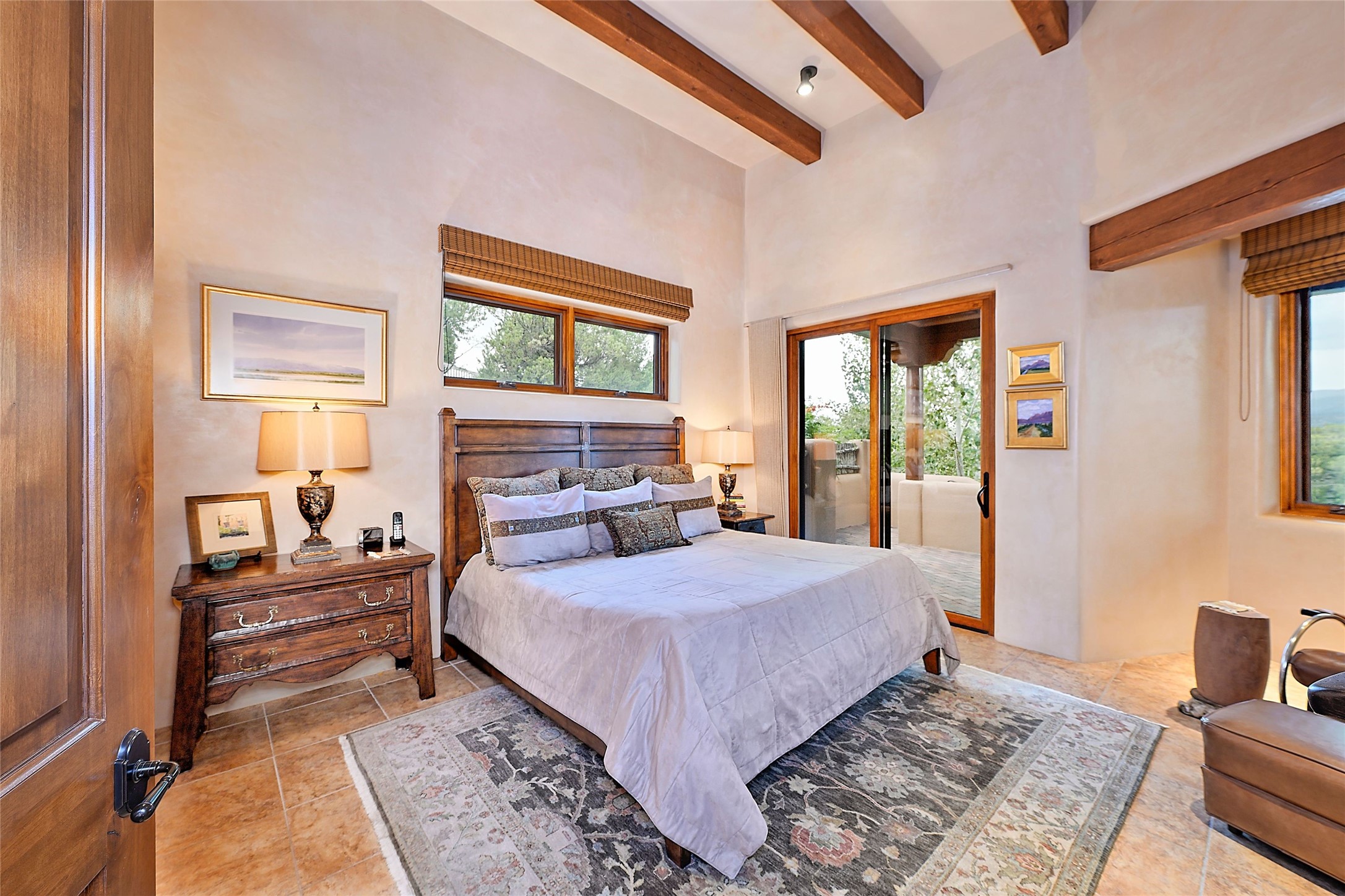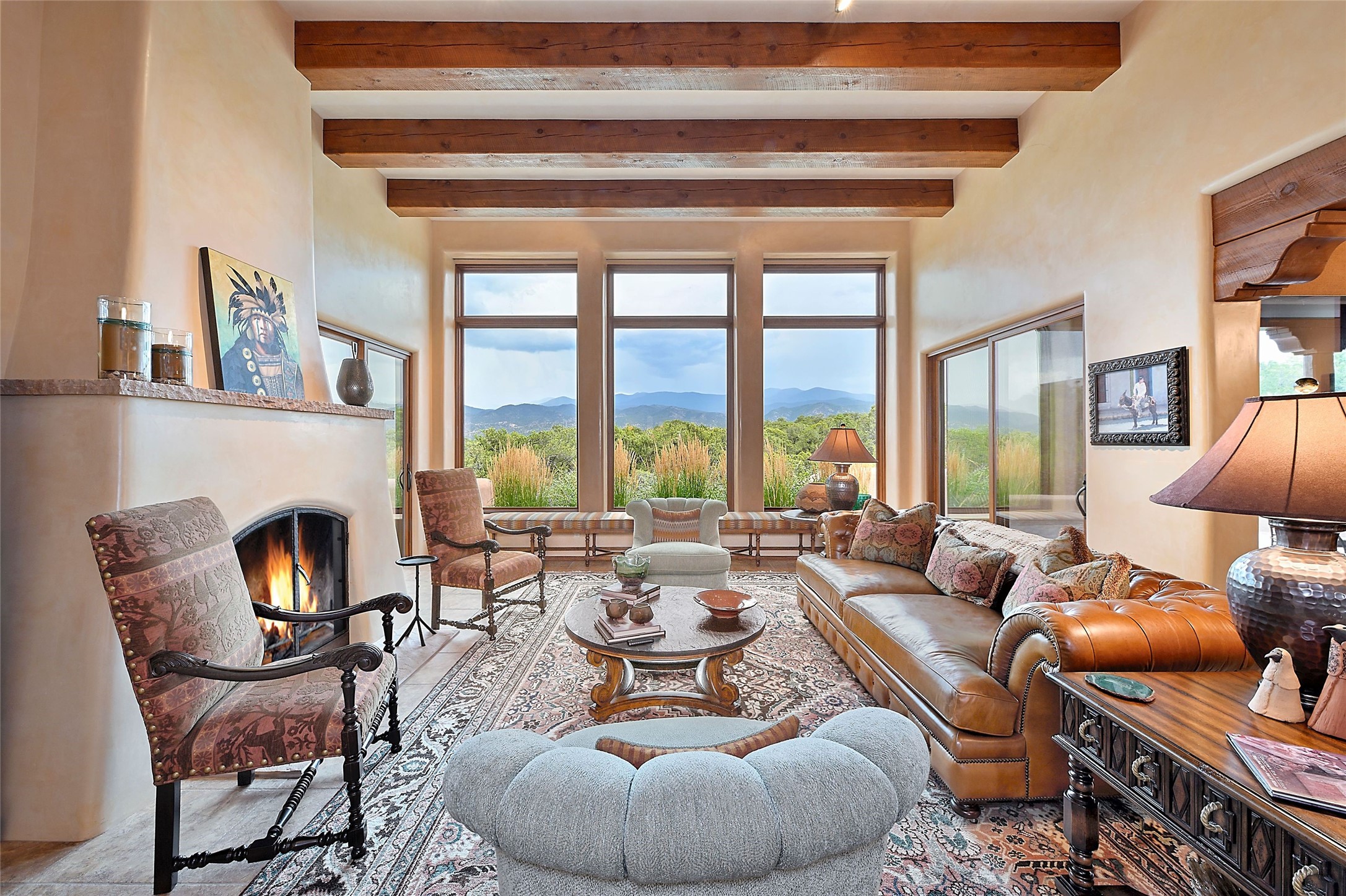 The moment you enter through the private gate, you realize this home is special in its privacy and quality construction. In all of Monte Sereno, truly unobstructed views of the Sangre de Cristo Mountains are rare, but due to adjoining lot configurations, this classic Pueblo Revival masterpiece built by Dressel Construction captures enormous views yet maintains its autonomy. The three bedroom and a study floor plan, along with high ceilings and a large portal area - are all adorned with true "high-end" finishes. The open floor plan allows for easy access to the living room/dining room/kitchen space - all of which flows to the grand outdoor portal space. The primary suite is entered through a private study area - all of which is separated from the other two bedroom suites. Architect Larry Andreen intentionally designed angles to the home to maximize the views and to avoid boring linear spaces. The finishes throughout are top-of-the-line, and exudes quality at every turn.