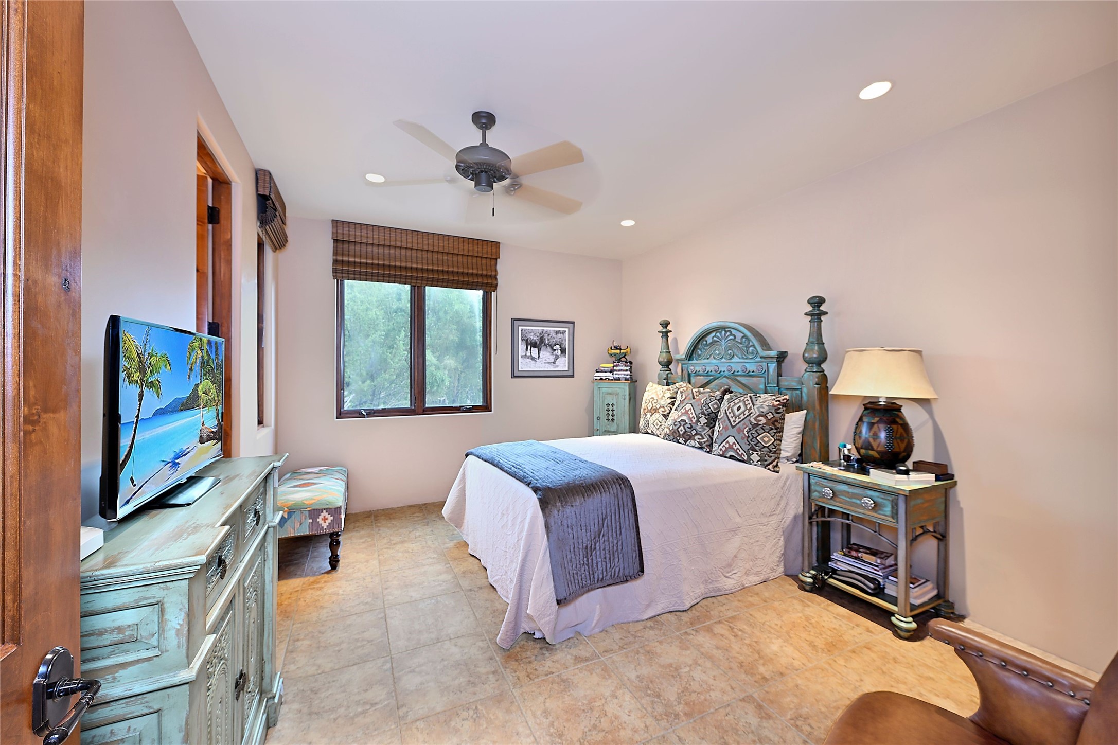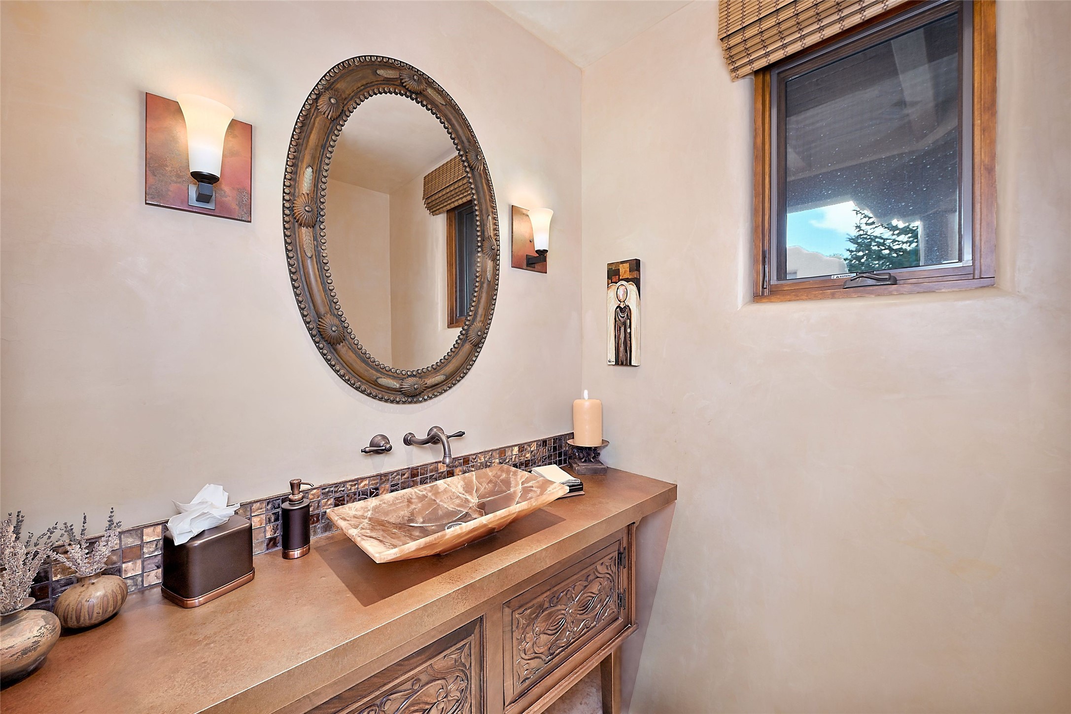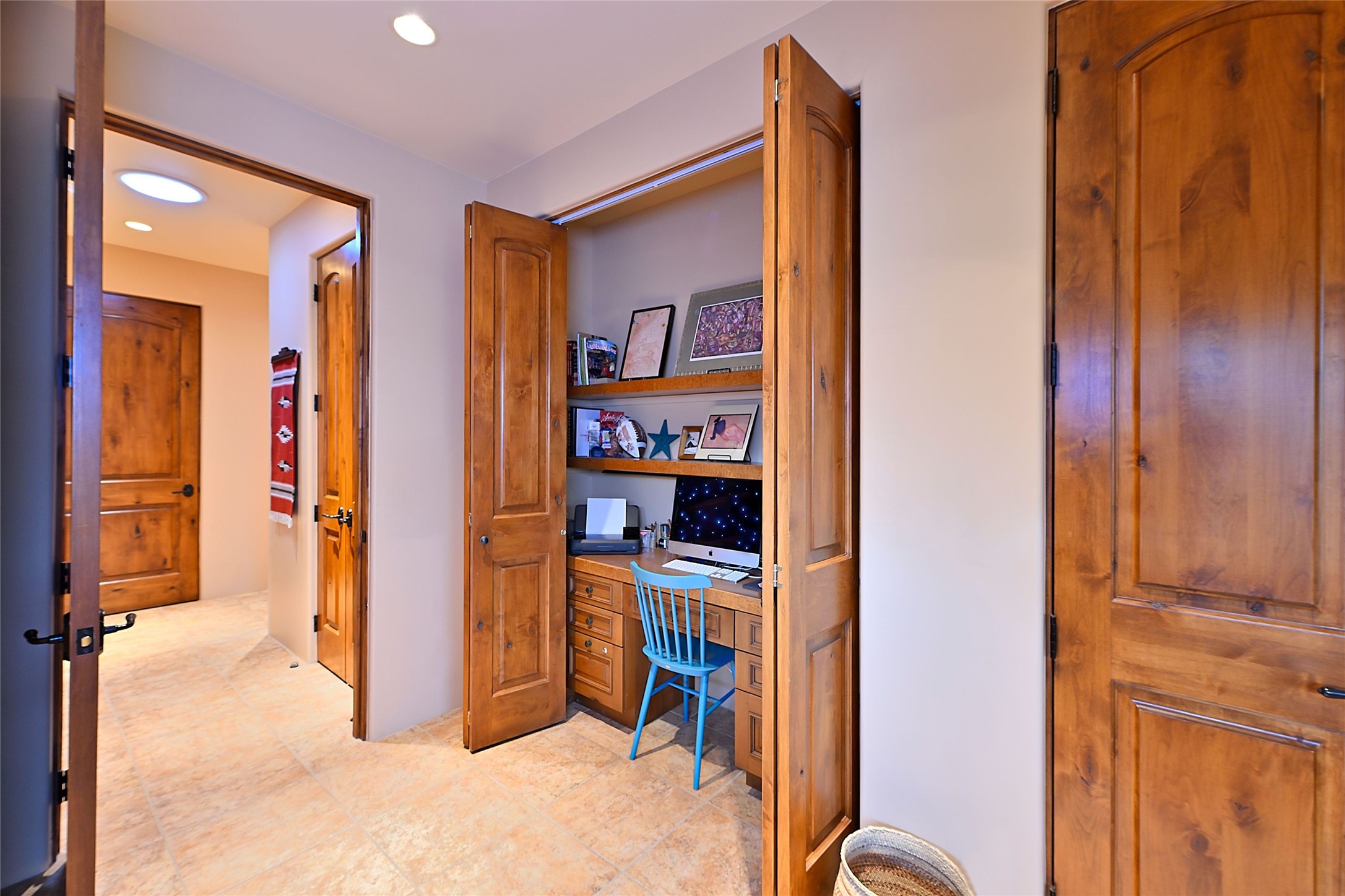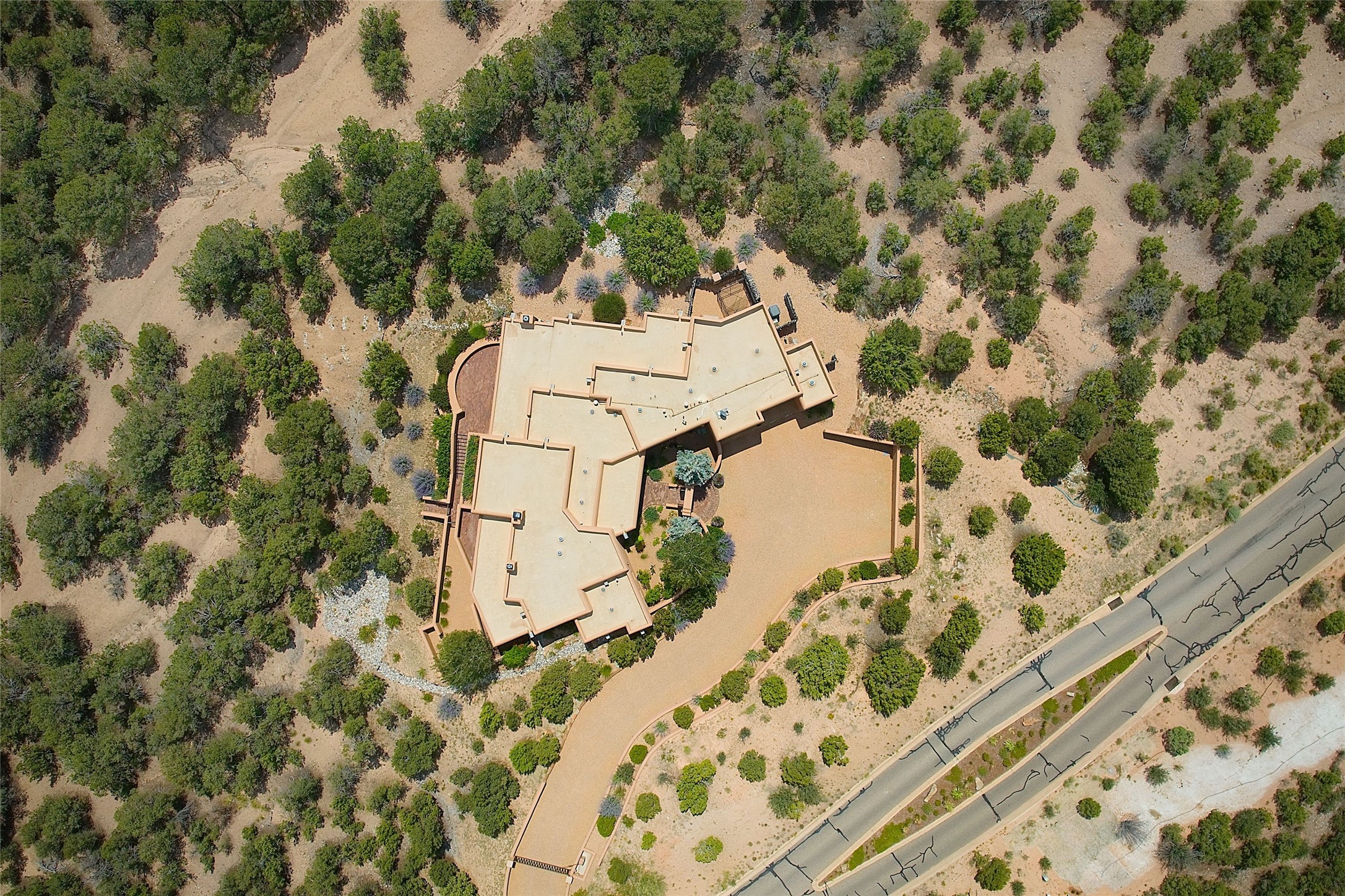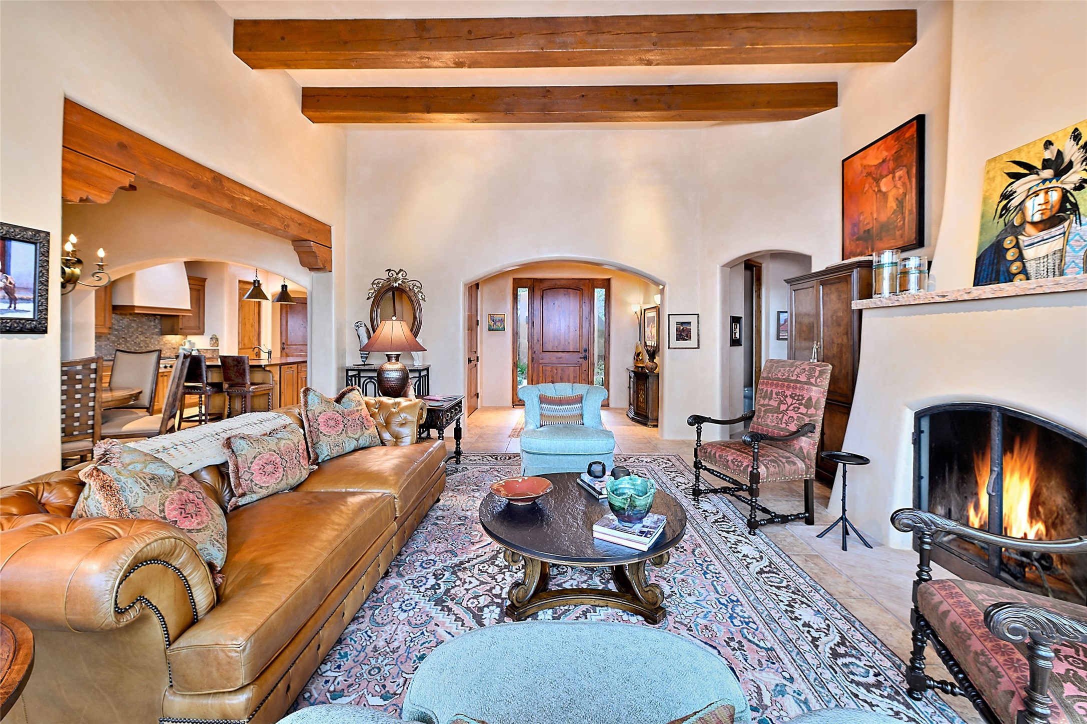 The moment you enter through the private gate, you realize this home is special in its privacy and quality construction. In all of Monte Sereno, truly unobstructed views of the Sangre de Cristo Mountains are rare, but due to adjoining lot configurations, this classic Pueblo Revival masterpiece built by Dressel Construction captures enormous views yet maintains its autonomy. The three bedroom and a study floor plan, along with high ceilings and a large portal area - are all adorned with true "high-end" finishes. The open floor plan allows for easy access to the living room/dining room/kitchen space - all of which flows to the grand outdoor portal space. The primary suite is entered through a private study area - all of which is separated from the other two bedroom suites. Architect Larry Andreen intentionally designed angles to the home to maximize the views and to avoid boring linear spaces. The finishes throughout are top-of-the-line, and exudes quality at every turn.