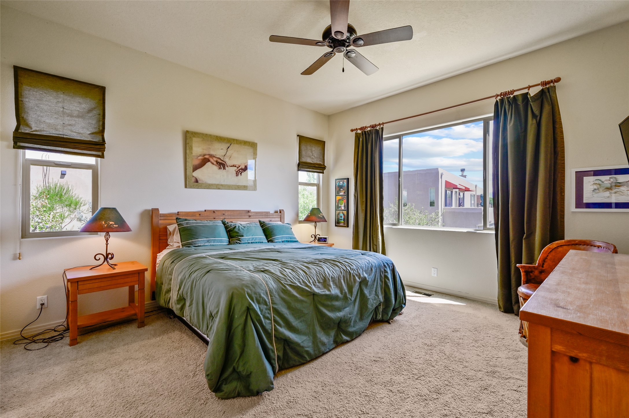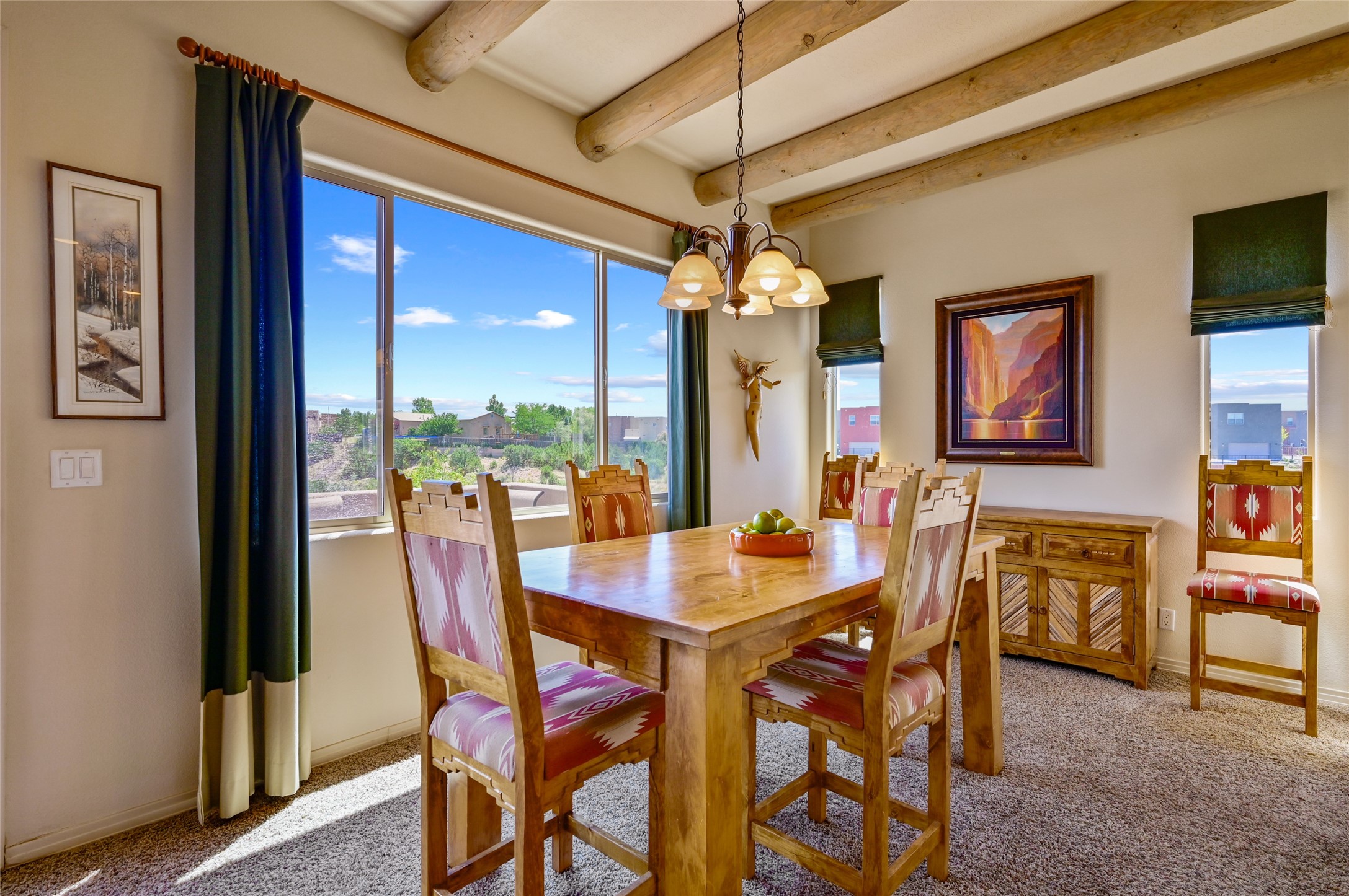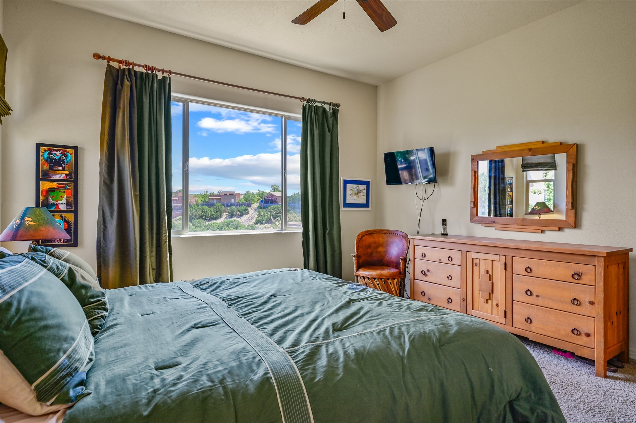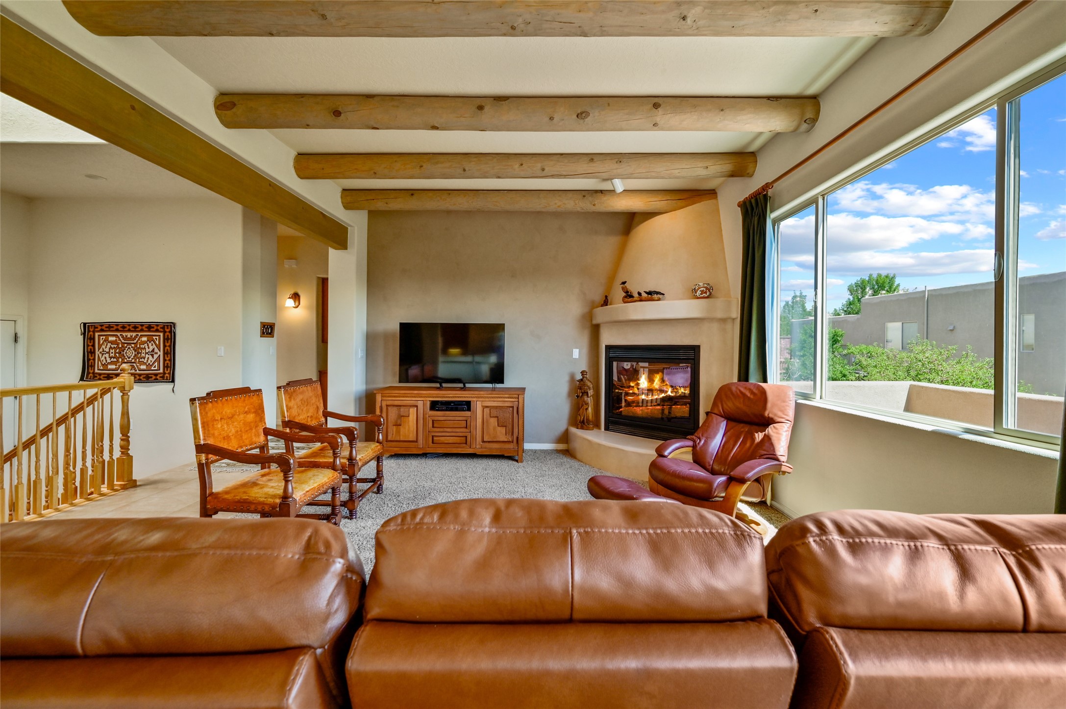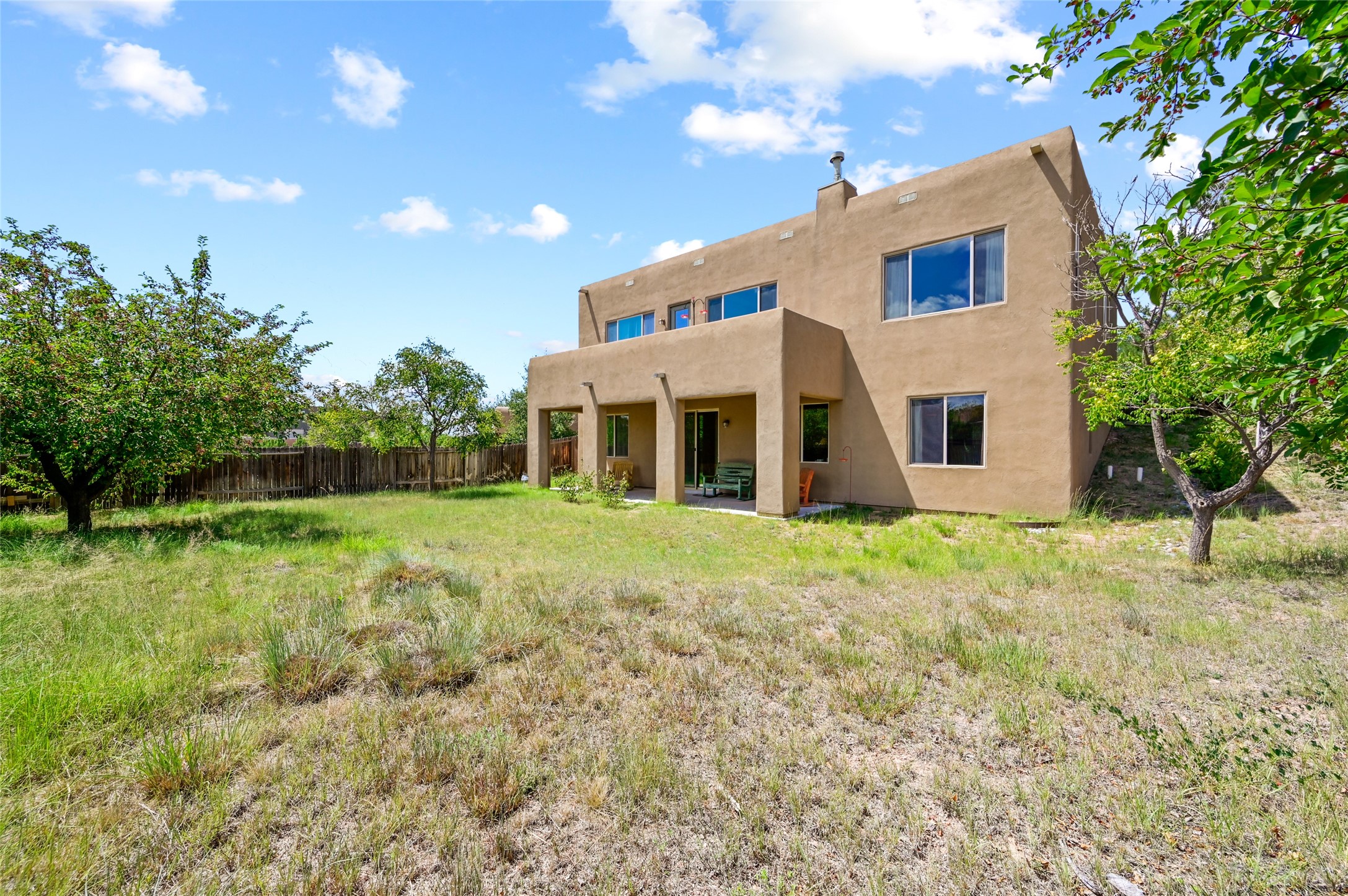 Enjoy mountain views from this light & bright spacious two-story home in Santa Fe's Tierra Contenta neighborhood. Built in 2007 by BT Homes, the residence features a stacked-stone faade, central heating and air conditioning, and a thoughtful layout designed for comfort and convenience. The main level includes the primary suite with ensuite bath, a powder bath, a bright living room with gas fireplace and access to a deck with mountain views and an abundance of greenspace. In addition, an open kitchen with eating area and dining area. The lower level offers two additional bedrooms, each with their own ensuite bath, along with living space, large fenced yard and covered portal providing privacy for guests or family. A two-car garage completes this special home. Conveniently located with easy access to Highway 599 and downtown or the Santa Fe Airport, this property is ideal for commuters and travelers alike. Furniture package available upon request.