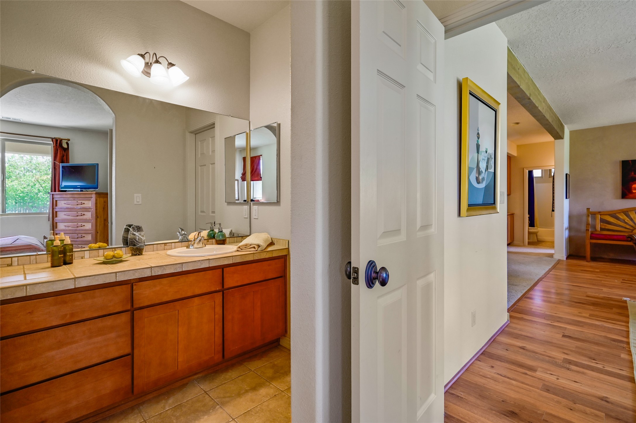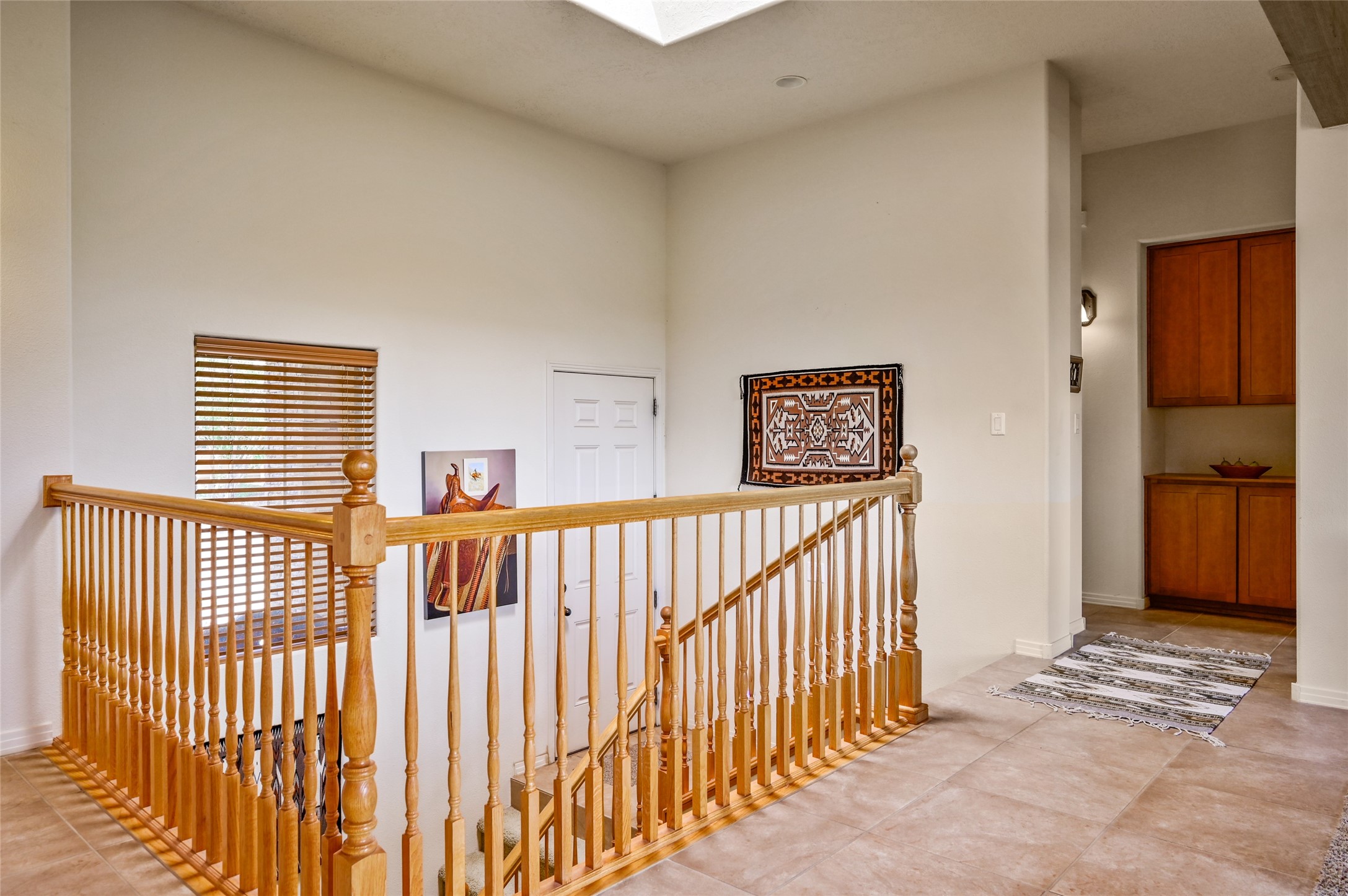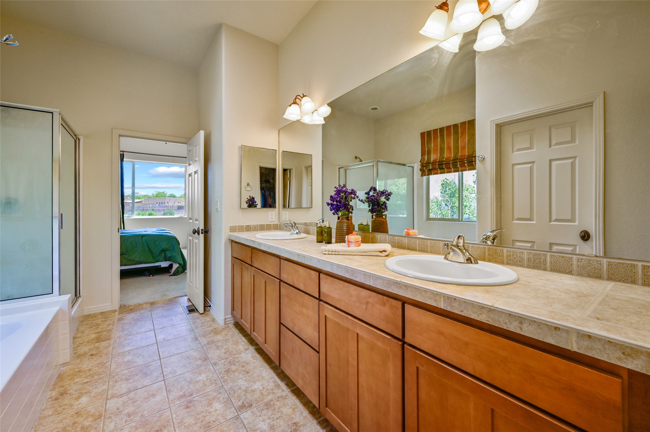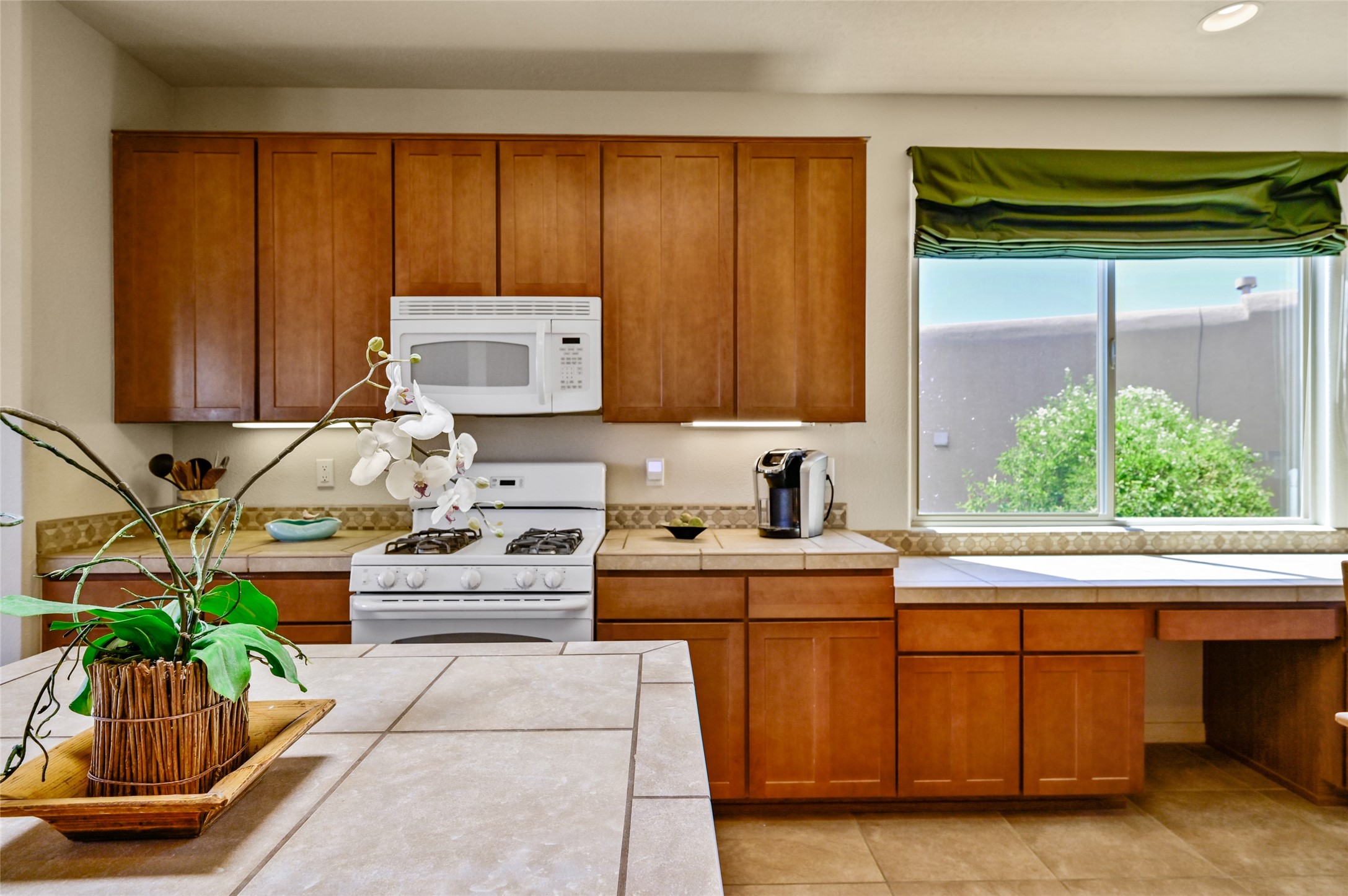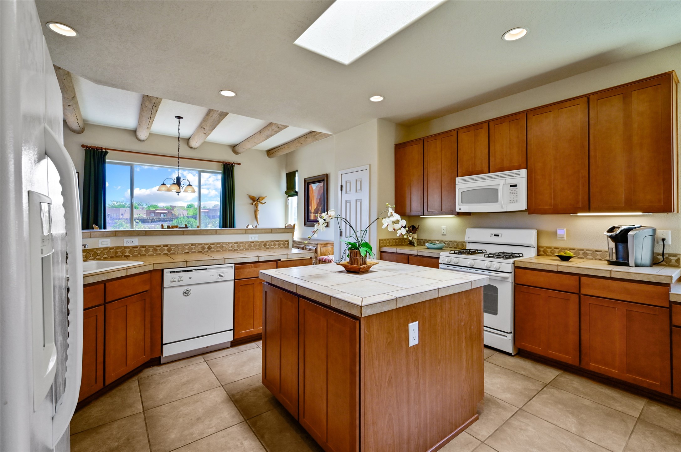 Enjoy mountain views from this light & bright spacious two-story home in Santa Fe's Tierra Contenta neighborhood. Built in 2007 by BT Homes, the residence features a stacked-stone faade, central heating and air conditioning, and a thoughtful layout designed for comfort and convenience. The main level includes the primary suite with ensuite bath, a powder bath, a bright living room with gas fireplace and access to a deck with mountain views and an abundance of greenspace. In addition, an open kitchen with eating area and dining area. The lower level offers two additional bedrooms, each with their own ensuite bath, along with living space, large fenced yard and covered portal providing privacy for guests or family. A two-car garage completes this special home. Conveniently located with easy access to Highway 599 and downtown or the Santa Fe Airport, this property is ideal for commuters and travelers alike. Furniture package available upon request.