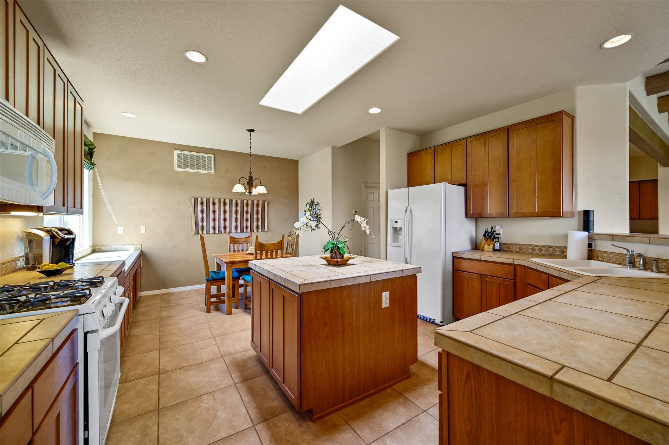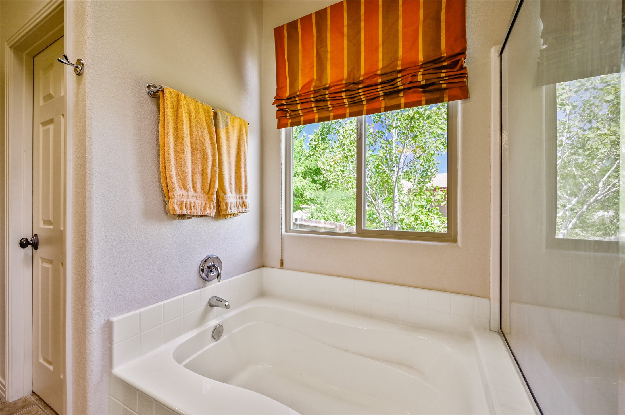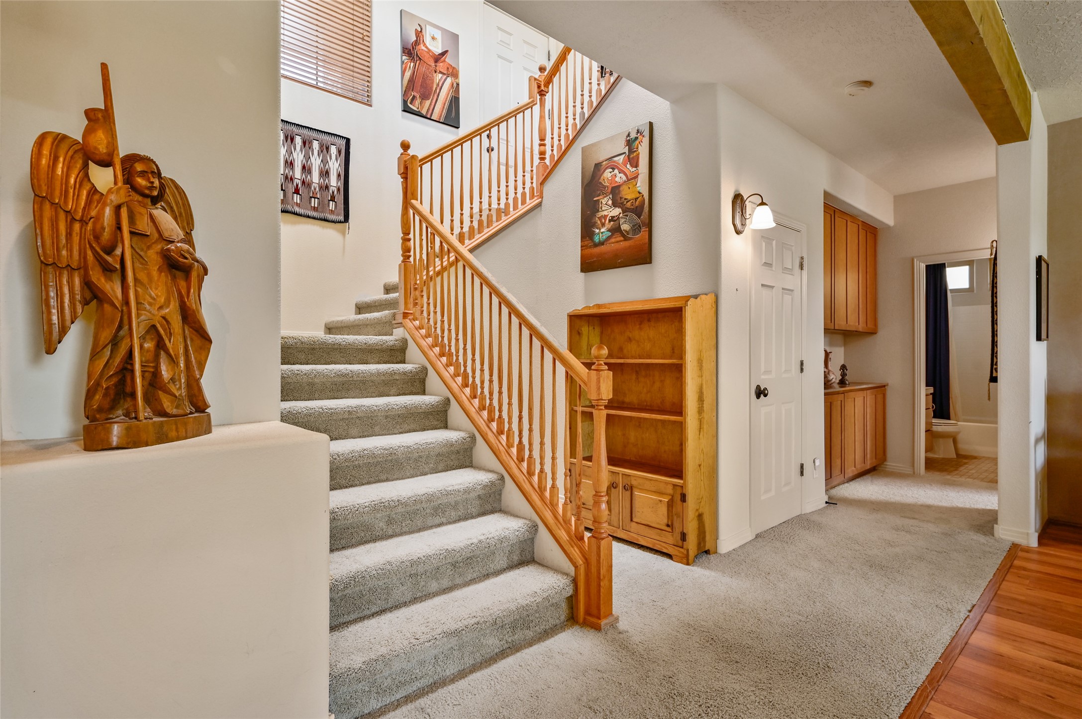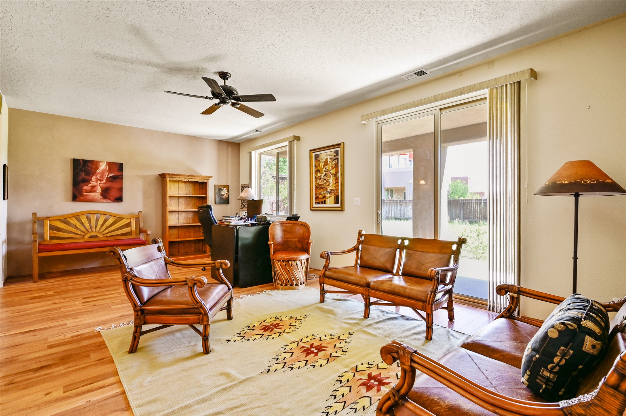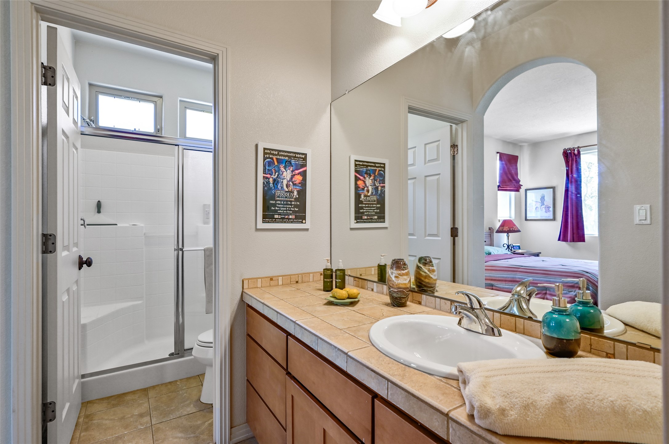 Enjoy mountain views from this light & bright spacious two-story home in Santa Fe's Tierra Contenta neighborhood. Built in 2007 by BT Homes, the residence features a stacked-stone faade, central heating and air conditioning, and a thoughtful layout designed for comfort and convenience. The main level includes the primary suite with ensuite bath, a powder bath, a bright living room with gas fireplace and access to a deck with mountain views and an abundance of greenspace. In addition, an open kitchen with eating area and dining area. The lower level offers two additional bedrooms, each with their own ensuite bath, along with living space, large fenced yard and covered portal providing privacy for guests or family. A two-car garage completes this special home. Conveniently located with easy access to Highway 599 and downtown or the Santa Fe Airport, this property is ideal for commuters and travelers alike. Furniture package available upon request.