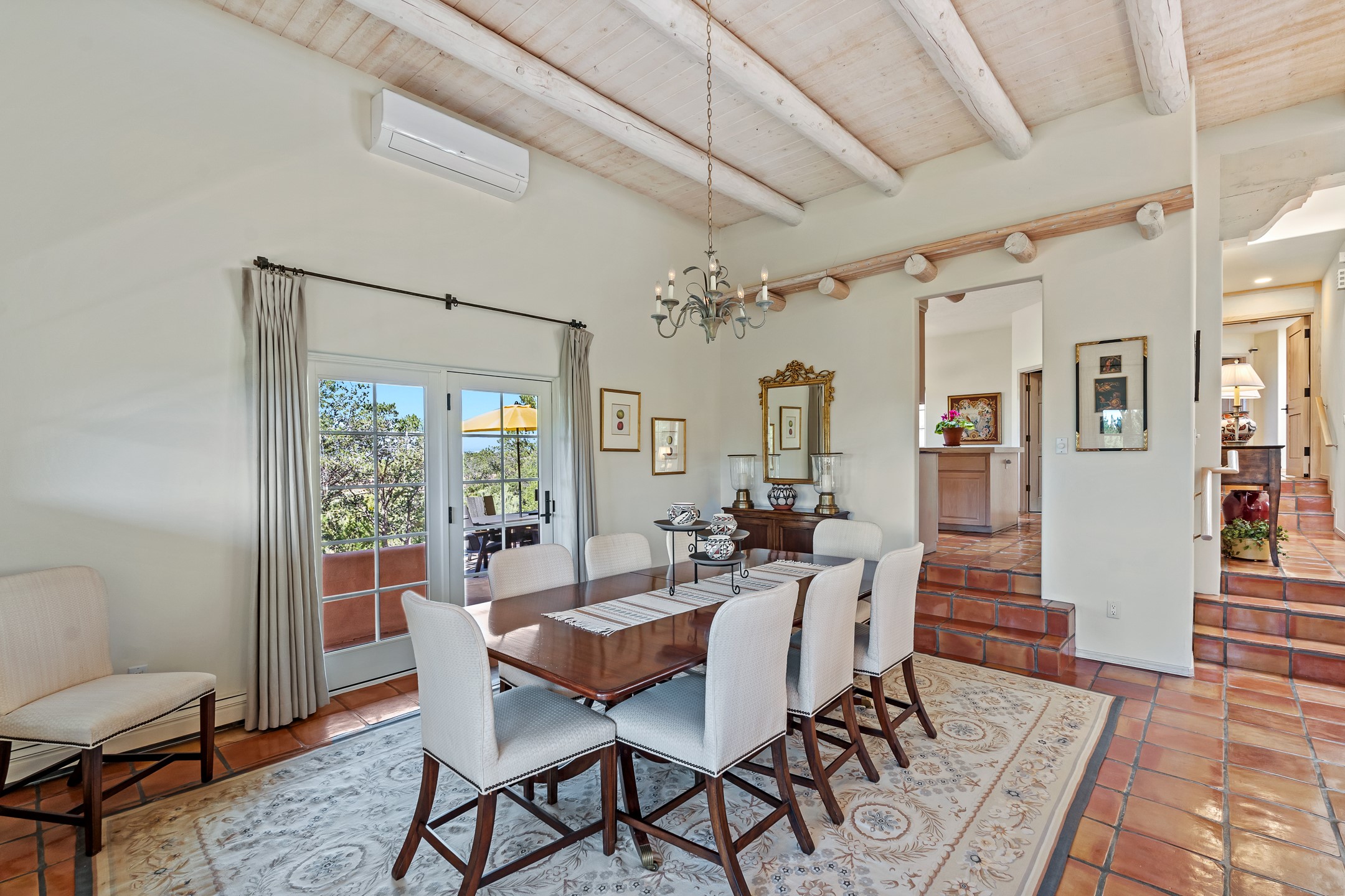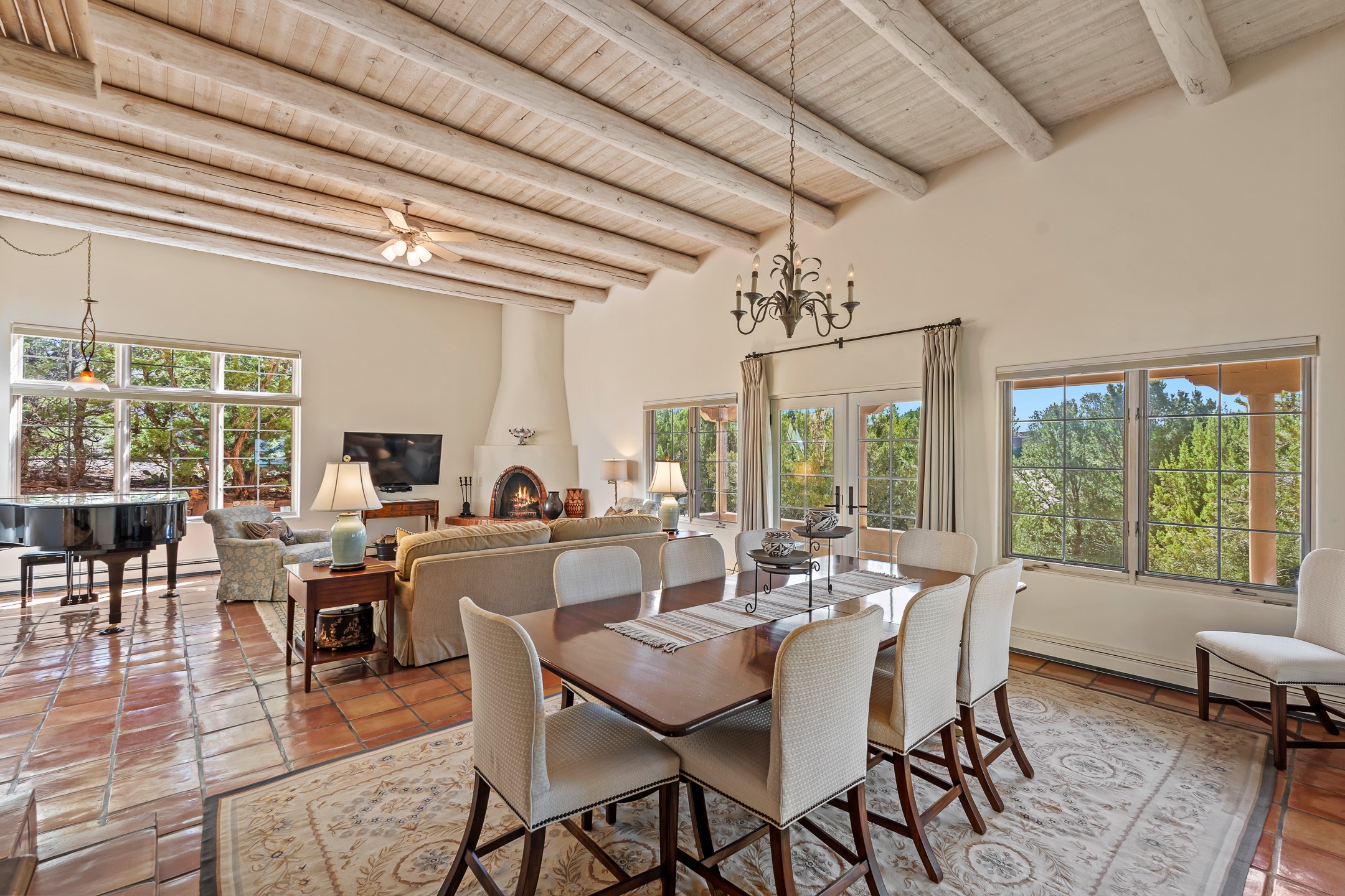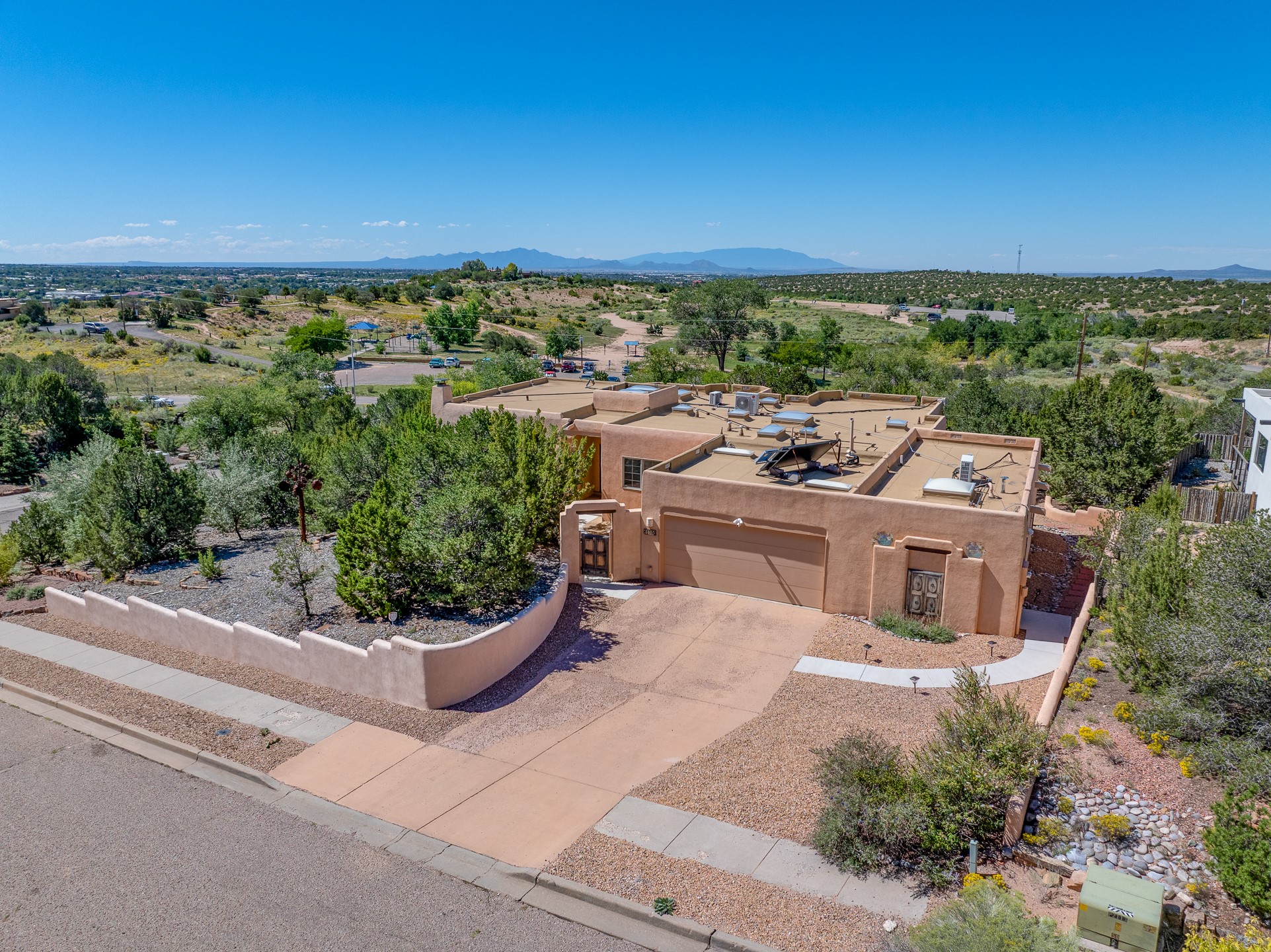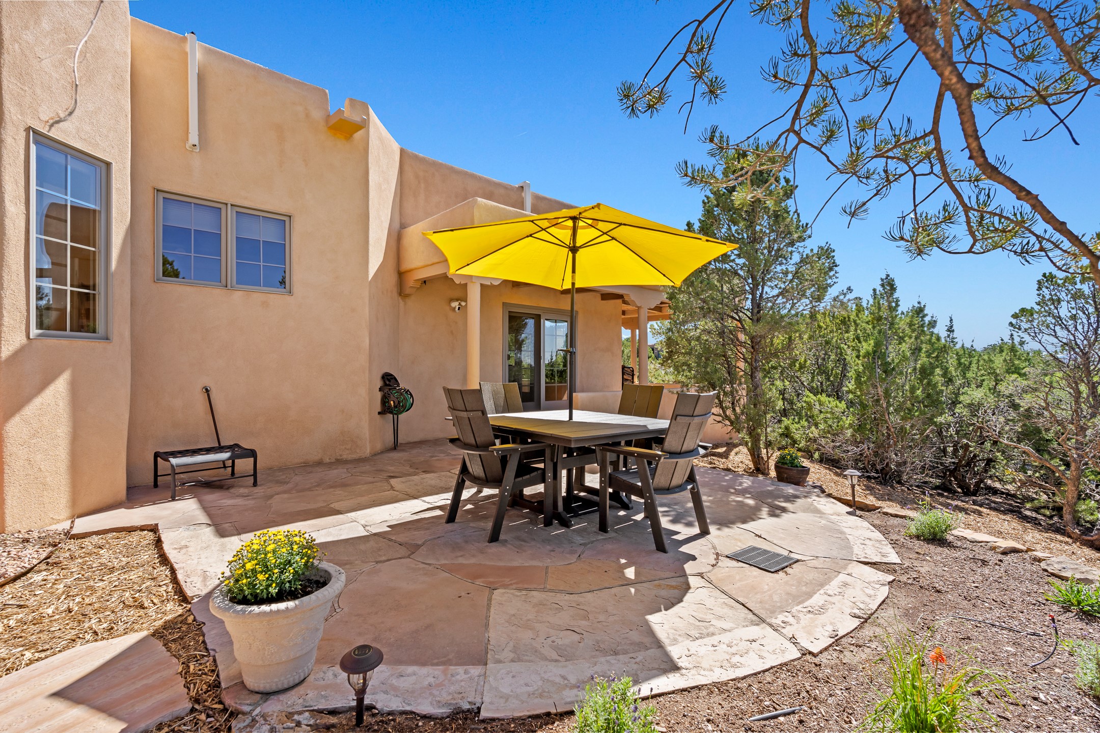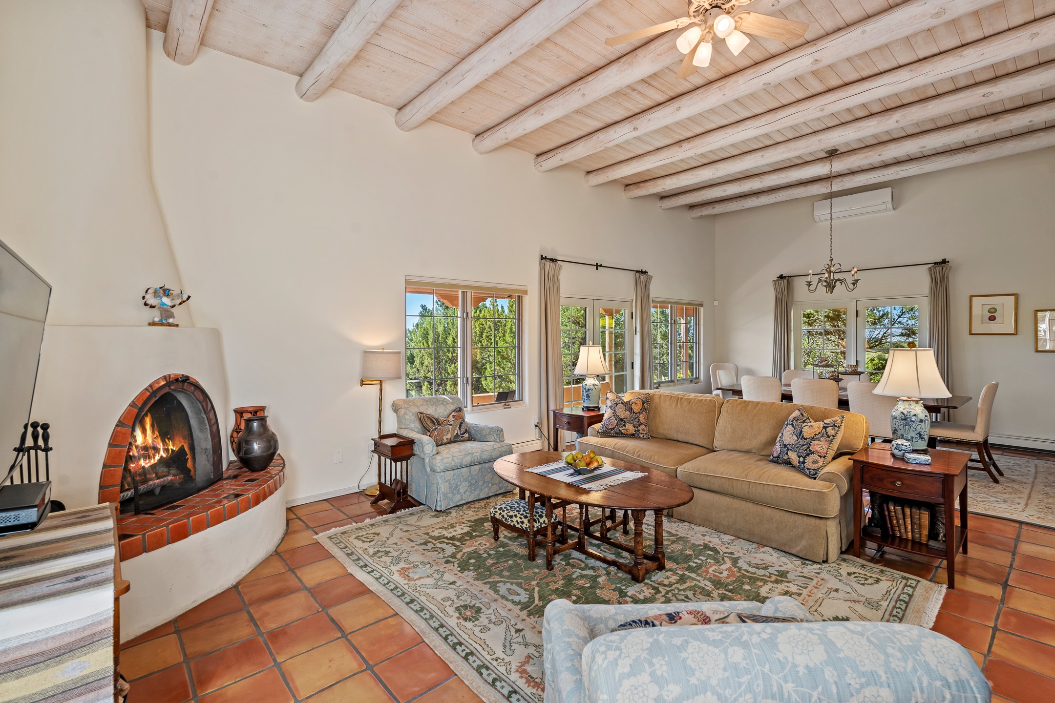 Perched above the city with beautiful Southern views of the Ortiz/Sandia and overlooking Santa Fe's beloved Ortiz Dog Park, this 2,814 sq. ft. residence offers 3 bedrooms and 3 bathrooms, including a beautifully designed, attached 1-bedroom, 1-bath guest house. The guest house has an interior connection to the home yet has its own private entrance, providing exceptional flexibility for extended family, guests, or income potential.The main living and dining area exudes Southwestern charm with high ceilings, vigas, a lovely wood-burning kiva fireplace, and French doors opening to a wraparound portal. A flagstone patio creates a magical outdoor dining setting to enjoy Santa Fe's sunsets and outdoor living. The kitchen, with its inviting breakfast nook, island, and warm regional details, is perfectly suited for both everyday living and entertaining.The spacious primary suite is a retreat of its own, with views, a luxurious bathroom featuring double vanities, a walk-in shower, and a deep soaking tub, plus an impressive walk-in closet. A guest bedroom and bath, set privately off the main hallway, complete the thoughtful floor plan.The guest house with full kitchen is accessible via an interior main house door or private exterior entrance, includes its own patio and offers endless possibilities--multi-generational living, a guest retreat, or a rental opportunity.Sited in a superior location just five minutes to downtown and ten minutes to the Plaza, this property combines views, versatility, and value in one of Santa Fe's most desirable settings. No HOA.