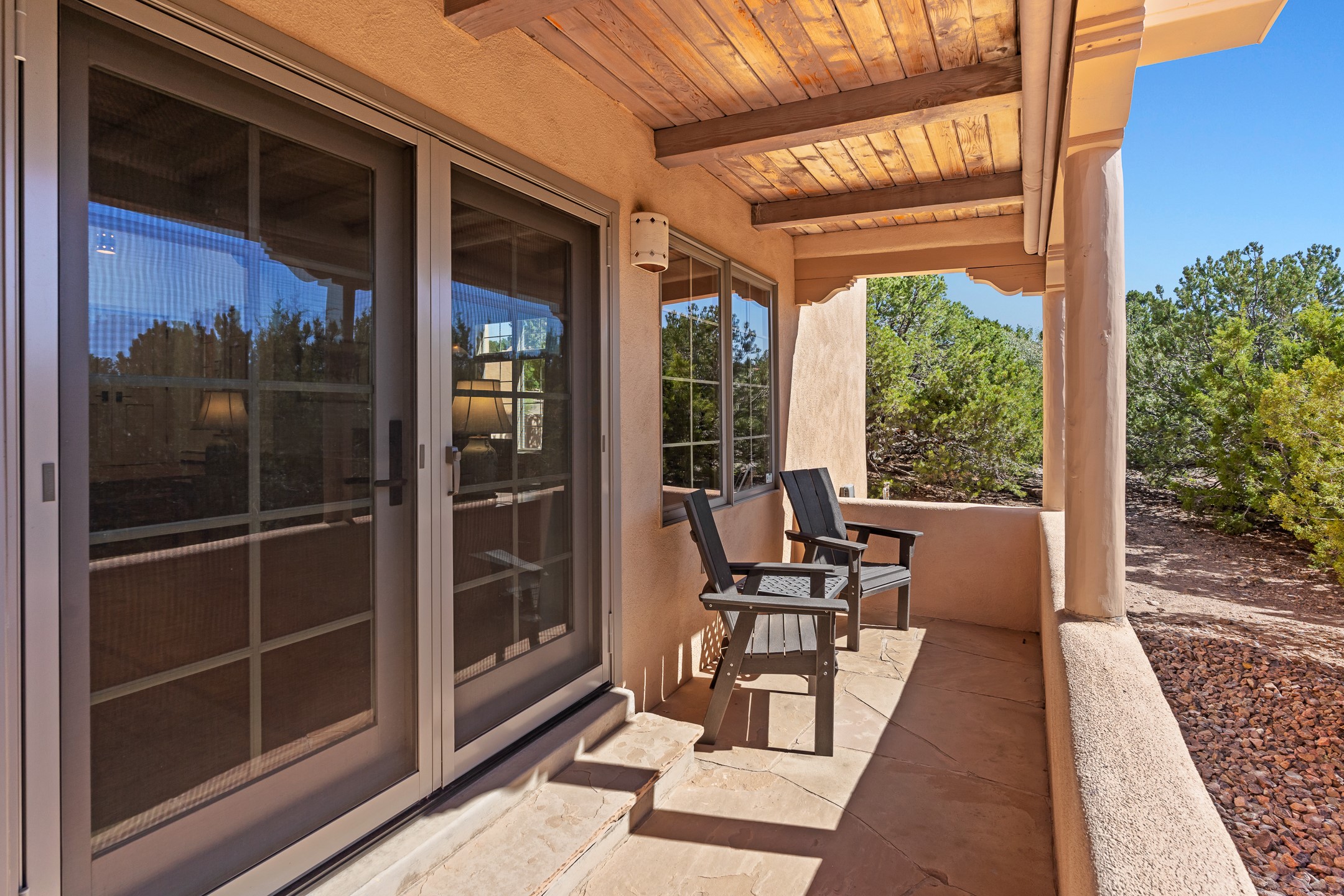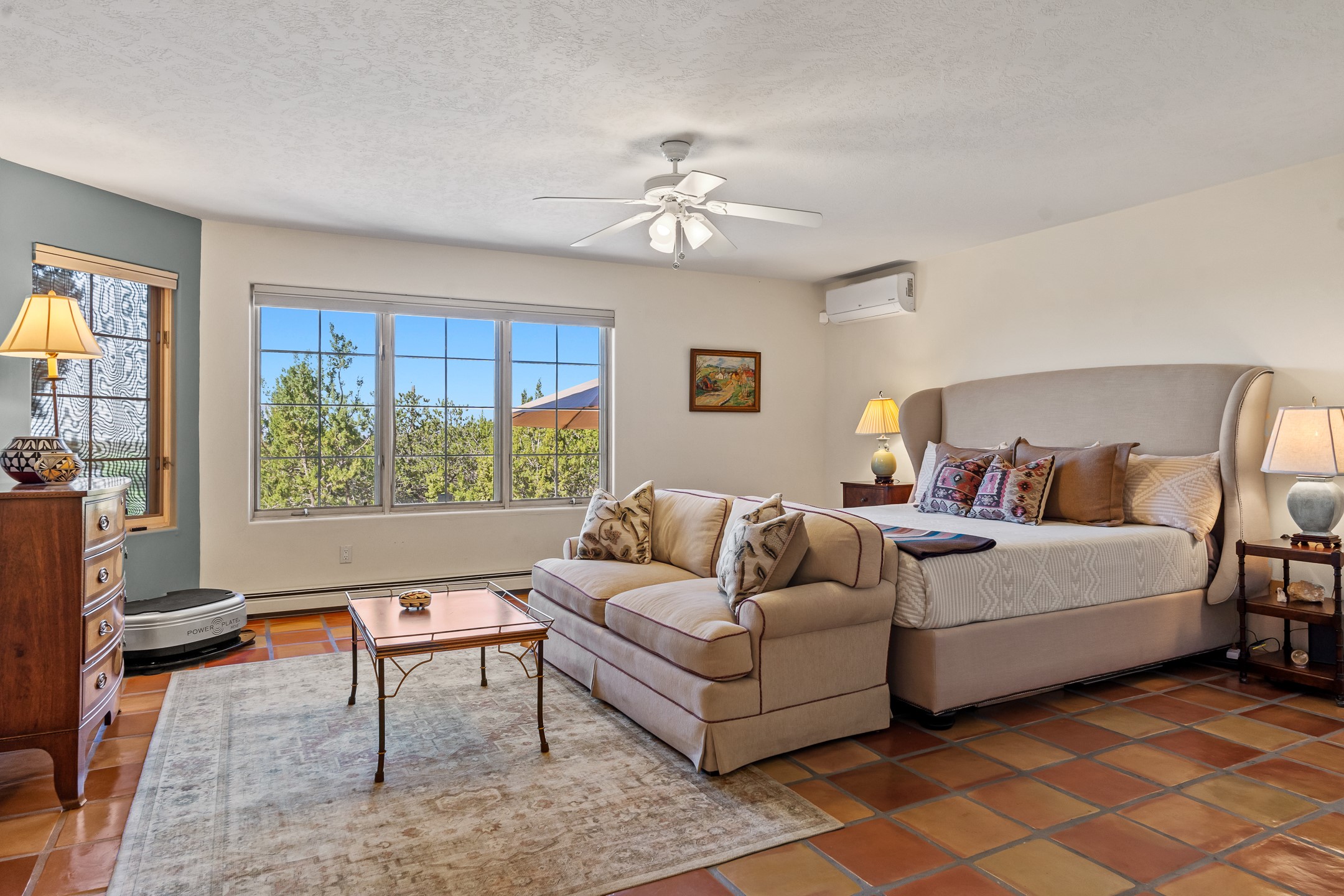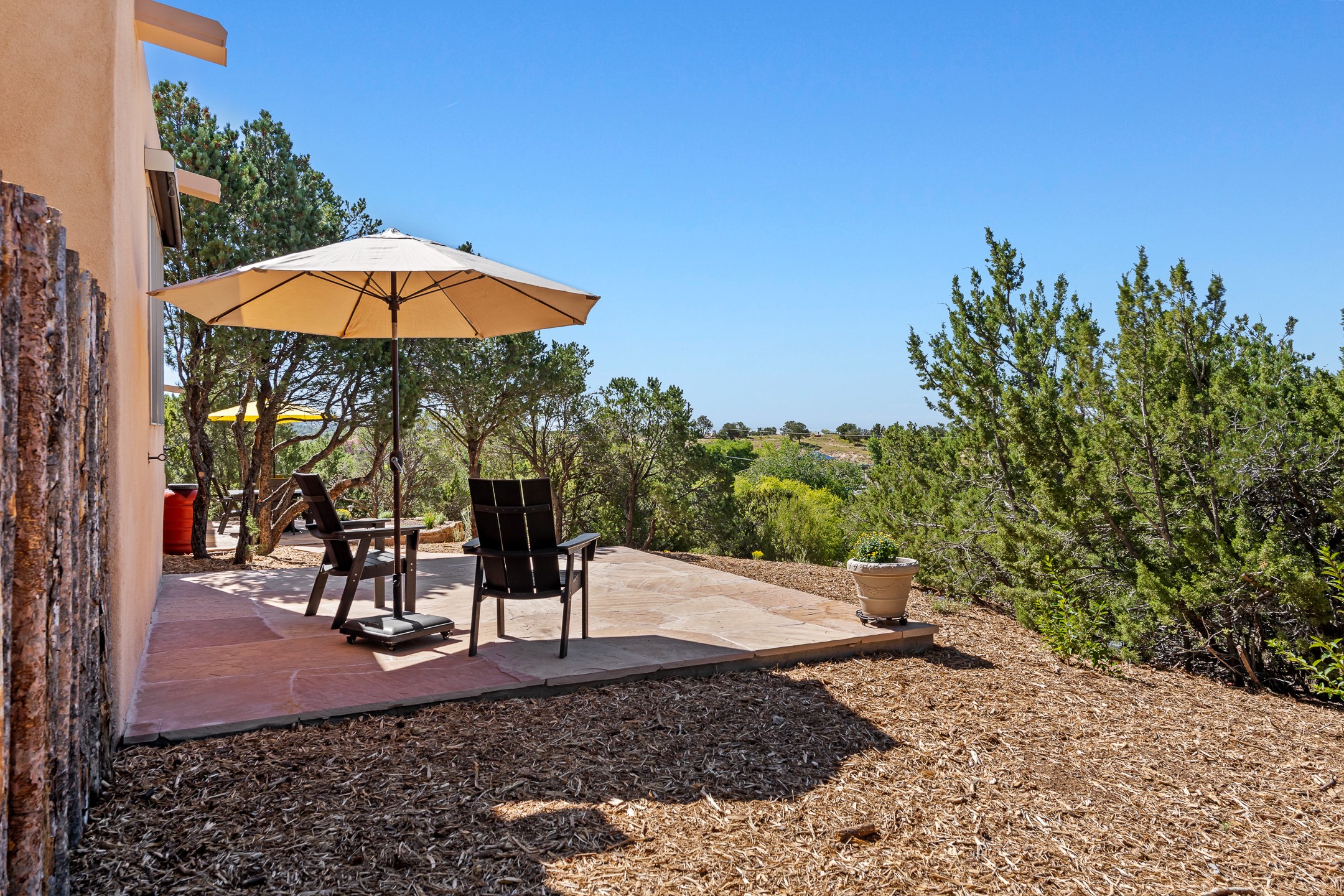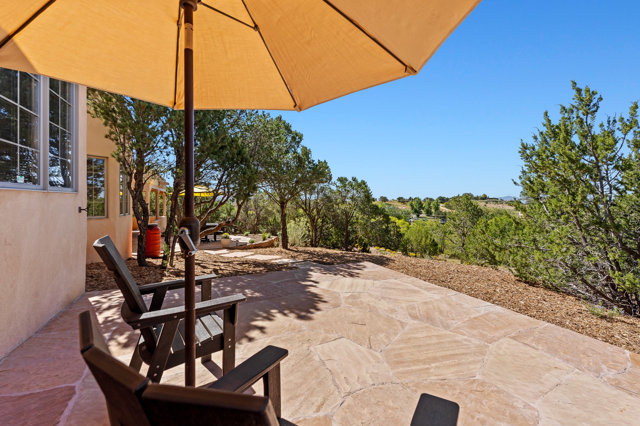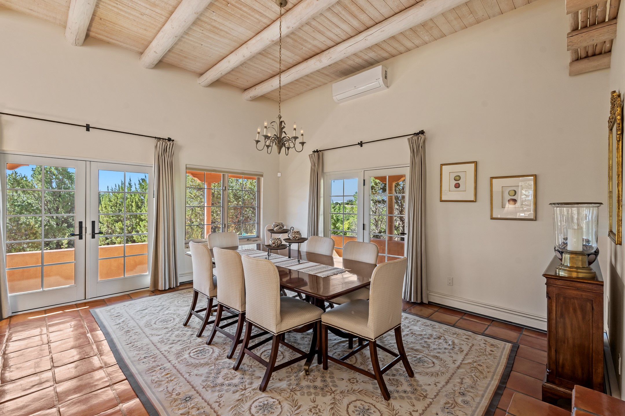 Perched above the city with beautiful Southern views of the Ortiz/Sandia and overlooking Santa Fe's beloved Ortiz Dog Park, this 2,814 sq. ft. residence offers 3 bedrooms and 3 bathrooms, including a beautifully designed, attached 1-bedroom, 1-bath guest house. The guest house has an interior connection to the home yet has its own private entrance, providing exceptional flexibility for extended family, guests, or income potential.The main living and dining area exudes Southwestern charm with high ceilings, vigas, a lovely wood-burning kiva fireplace, and French doors opening to a wraparound portal. A flagstone patio creates a magical outdoor dining setting to enjoy Santa Fe's sunsets and outdoor living. The kitchen, with its inviting breakfast nook, island, and warm regional details, is perfectly suited for both everyday living and entertaining.The spacious primary suite is a retreat of its own, with views, a luxurious bathroom featuring double vanities, a walk-in shower, and a deep soaking tub, plus an impressive walk-in closet. A guest bedroom and bath, set privately off the main hallway, complete the thoughtful floor plan.The guest house with full kitchen is accessible via an interior main house door or private exterior entrance, includes its own patio and offers endless possibilities--multi-generational living, a guest retreat, or a rental opportunity.Sited in a superior location just five minutes to downtown and ten minutes to the Plaza, this property combines views, versatility, and value in one of Santa Fe's most desirable settings. No HOA.