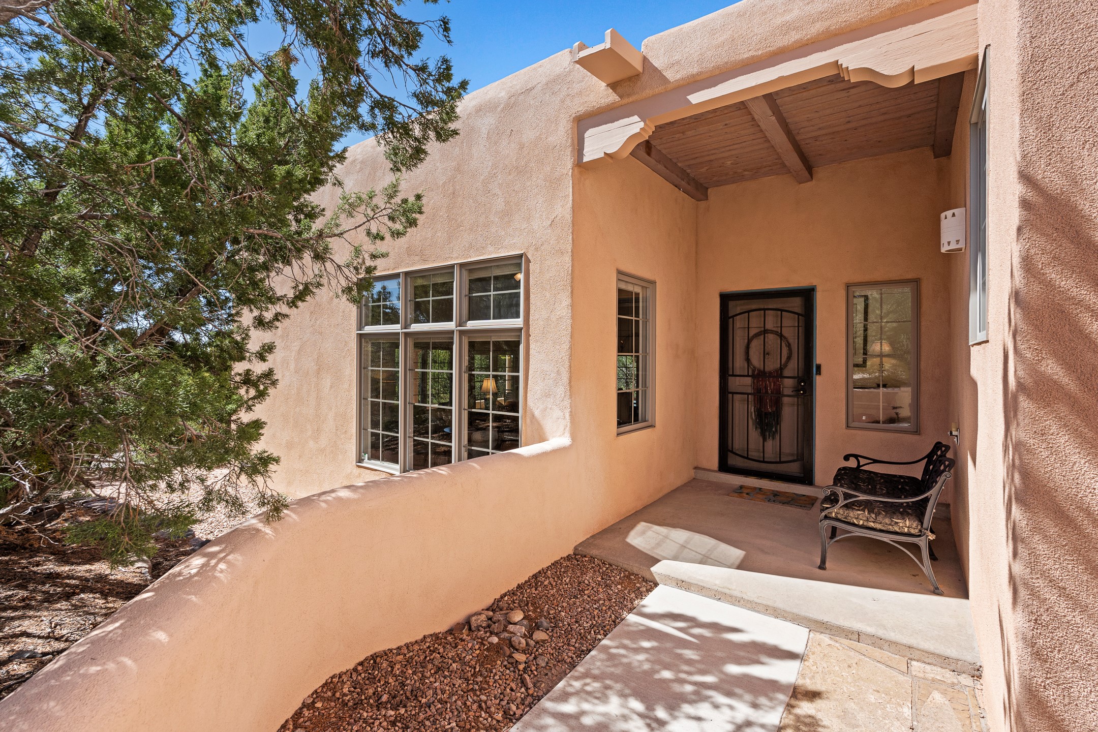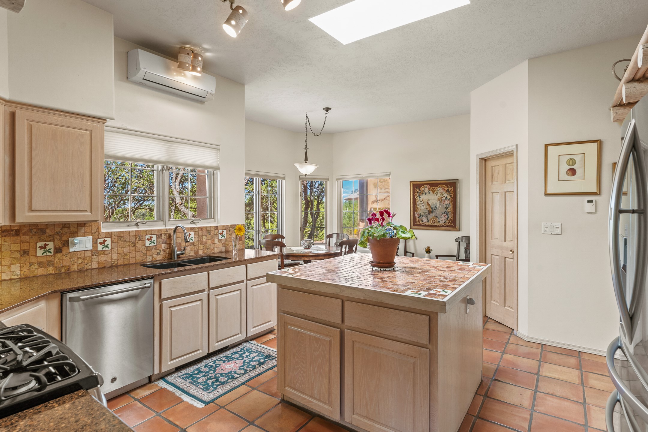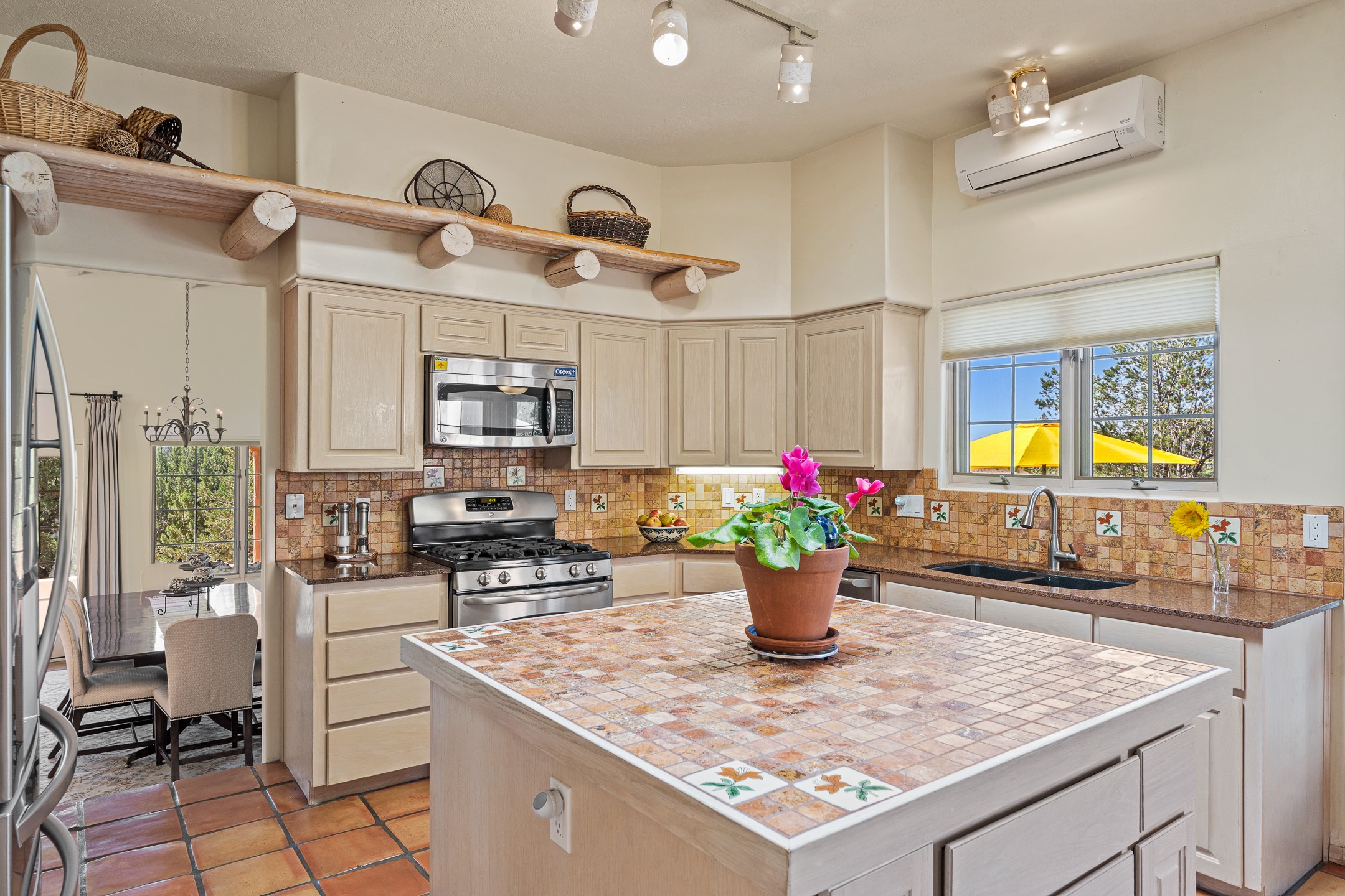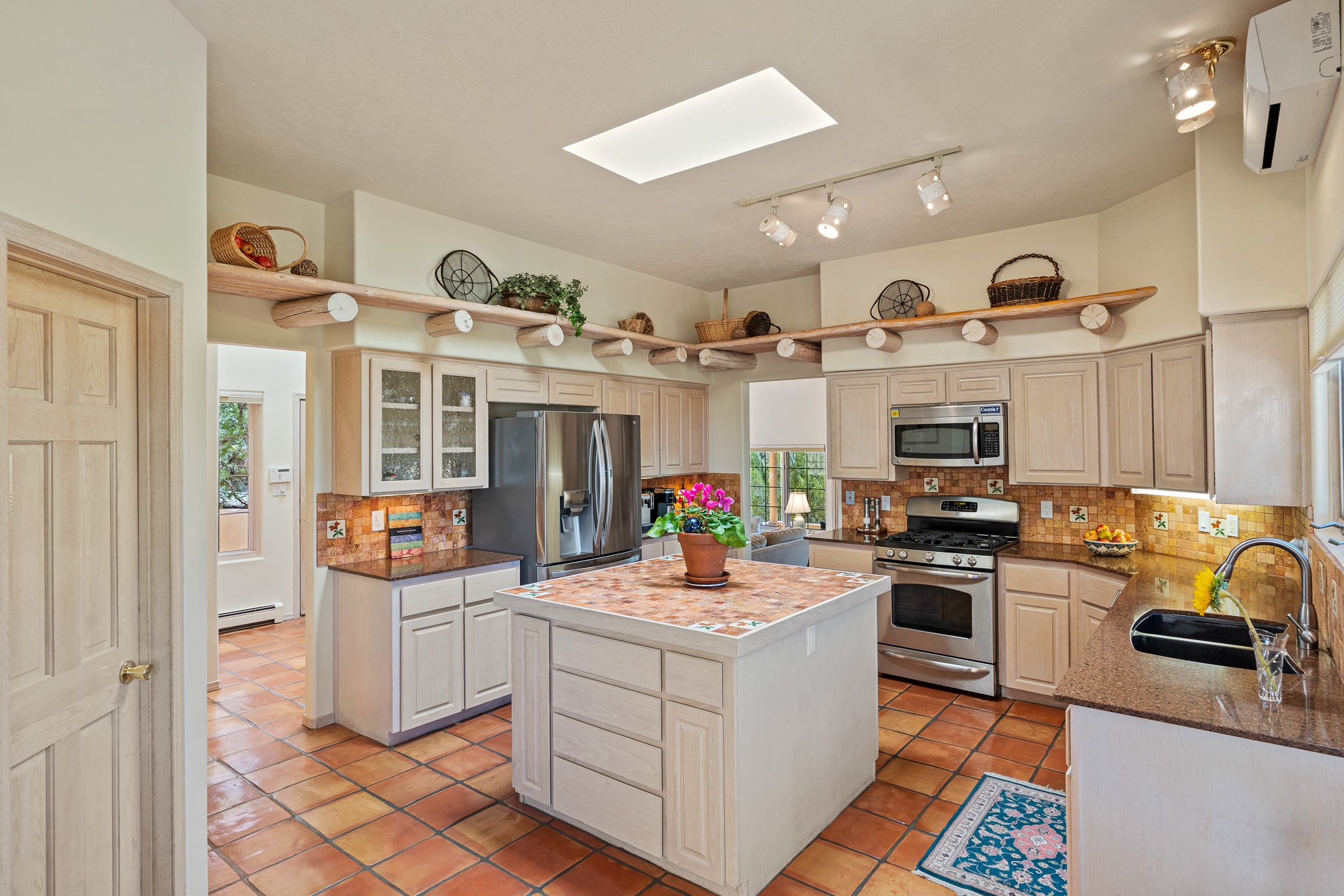 Perched above the city with beautiful Southern views of the Ortiz/Sandia and overlooking Santa Fe's beloved Ortiz Dog Park, this 2,814 sq. ft. residence offers 3 bedrooms and 3 bathrooms, including a beautifully designed, attached 1-bedroom, 1-bath guest house. The guest house has an interior connection to the home yet has its own private entrance, providing exceptional flexibility for extended family, guests, or income potential.The main living and dining area exudes Southwestern charm with high ceilings, vigas, a lovely wood-burning kiva fireplace, and French doors opening to a wraparound portal. A flagstone patio creates a magical outdoor dining setting to enjoy Santa Fe's sunsets and outdoor living. The kitchen, with its inviting breakfast nook, island, and warm regional details, is perfectly suited for both everyday living and entertaining.The spacious primary suite is a retreat of its own, with views, a luxurious bathroom featuring double vanities, a walk-in shower, and a deep soaking tub, plus an impressive walk-in closet. A guest bedroom and bath, set privately off the main hallway, complete the thoughtful floor plan.The guest house with full kitchen is accessible via an interior main house door or private exterior entrance, includes its own patio and offers endless possibilities--multi-generational living, a guest retreat, or a rental opportunity.Sited in a superior location just five minutes to downtown and ten minutes to the Plaza, this property combines views, versatility, and value in one of Santa Fe's most desirable settings. No HOA.