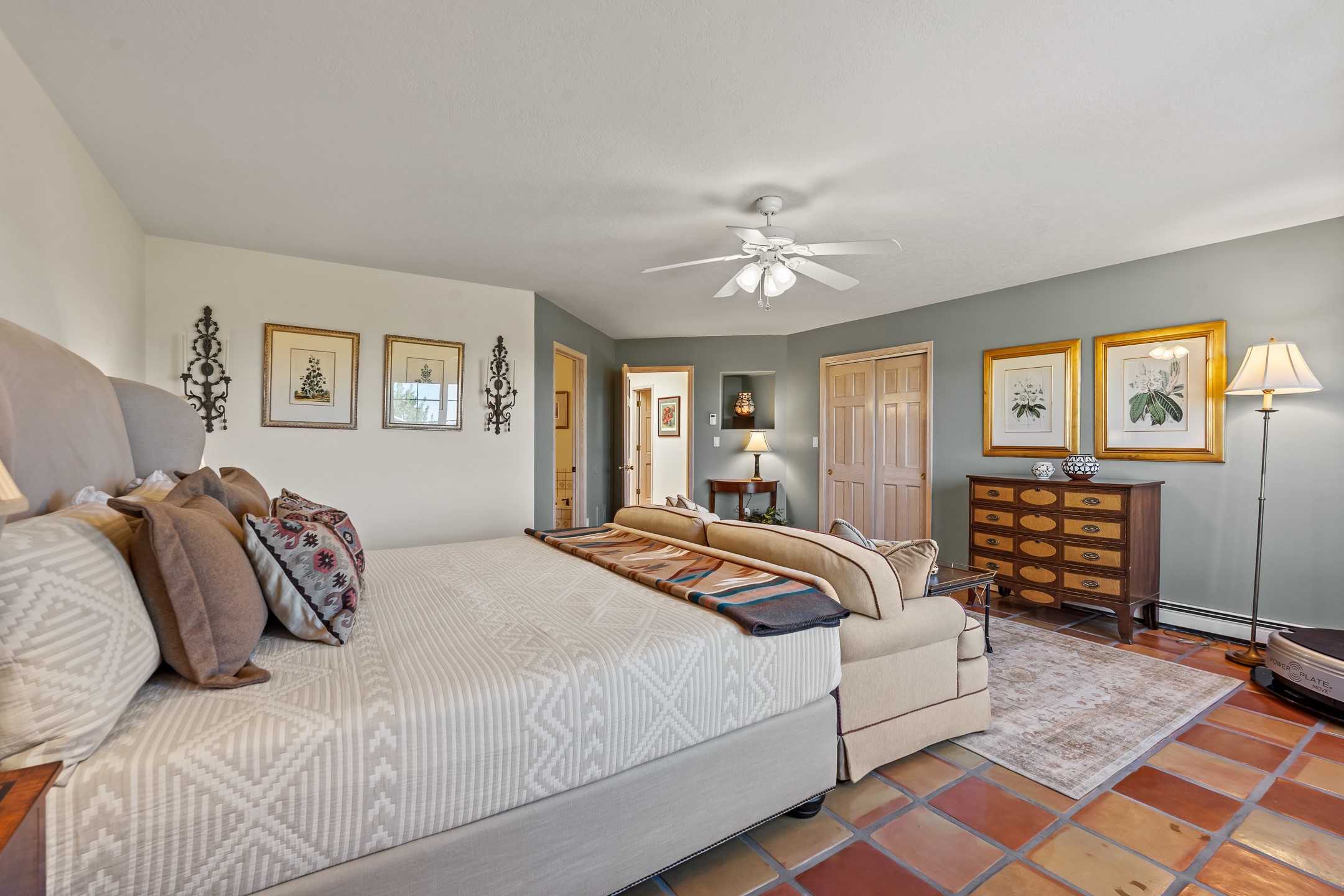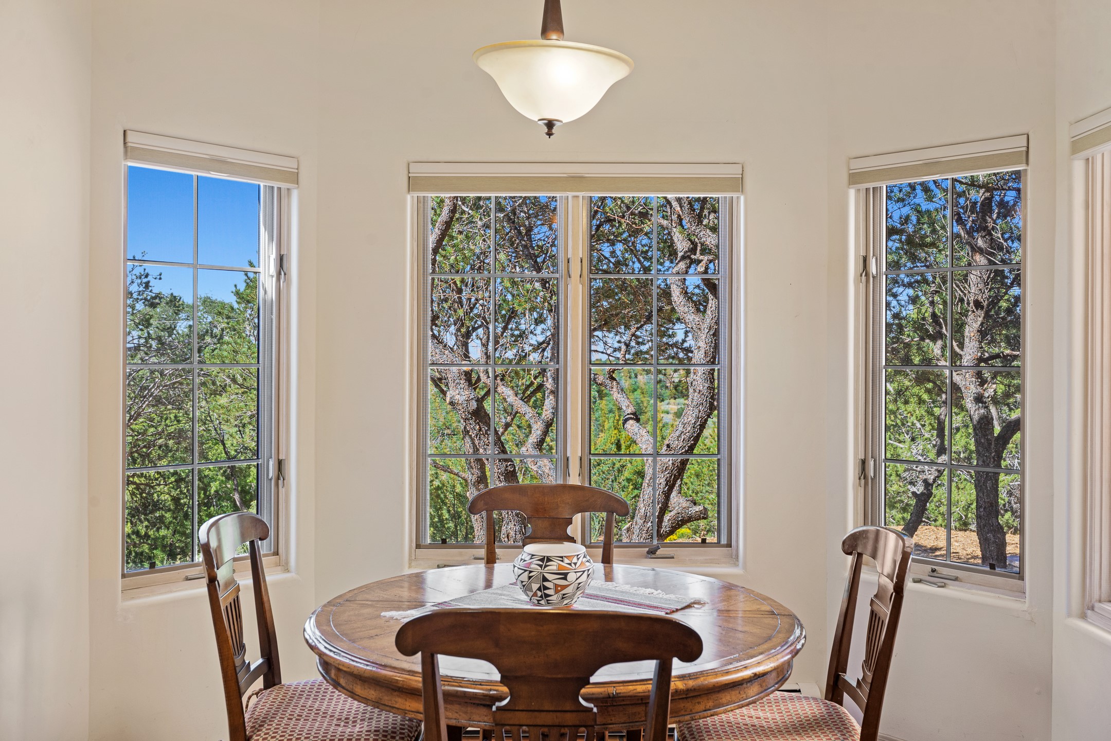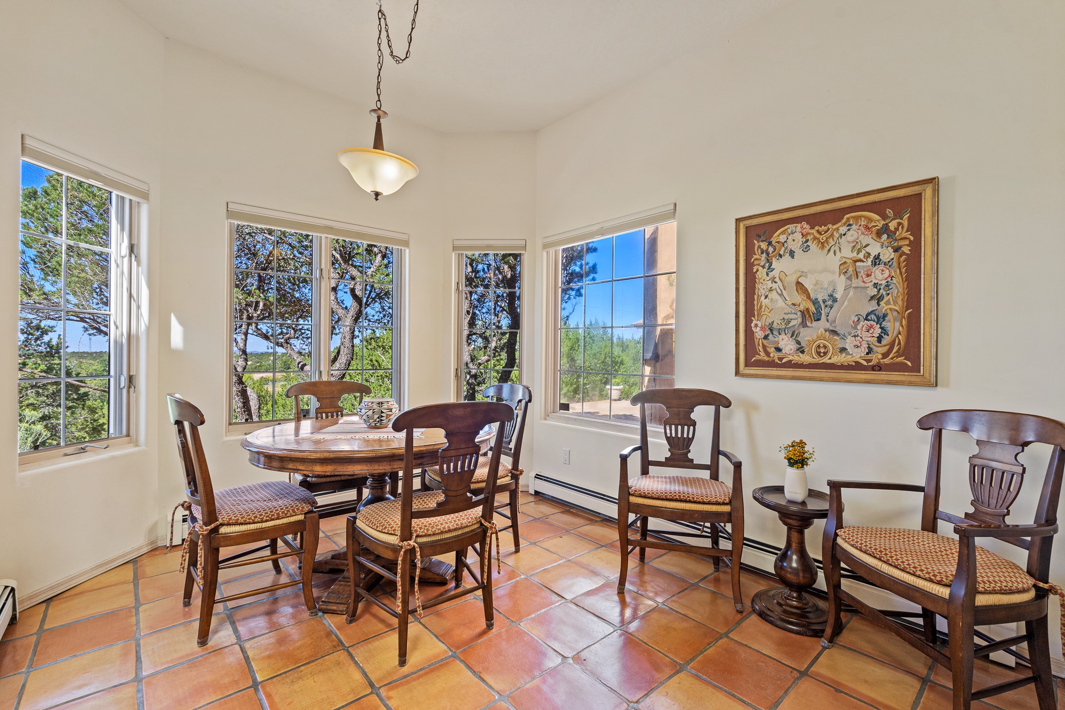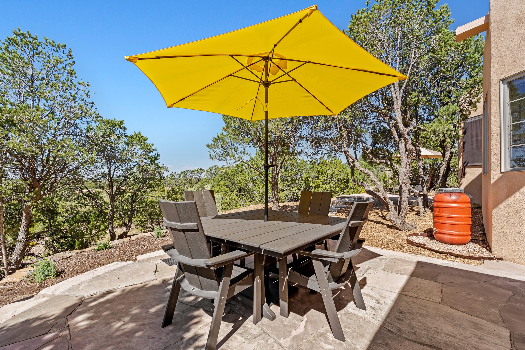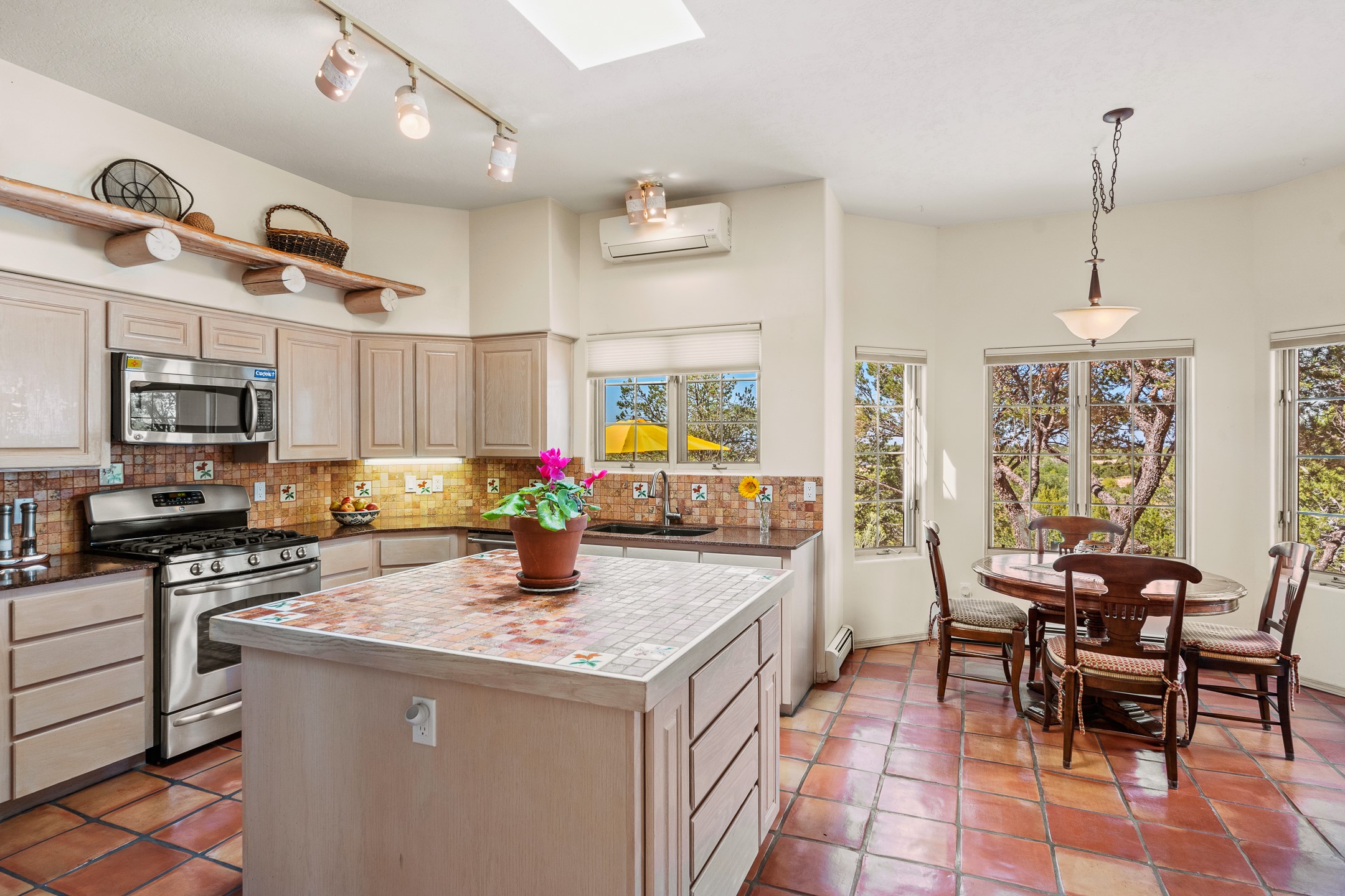 Perched above the city with beautiful Southern views of the Ortiz/Sandia and overlooking Santa Fe's beloved Ortiz Dog Park, this 2,814 sq. ft. residence offers 3 bedrooms and 3 bathrooms, including a beautifully designed, attached 1-bedroom, 1-bath guest house. The guest house has an interior connection to the home yet has its own private entrance, providing exceptional flexibility for extended family, guests, or income potential.The main living and dining area exudes Southwestern charm with high ceilings, vigas, a lovely wood-burning kiva fireplace, and French doors opening to a wraparound portal. A flagstone patio creates a magical outdoor dining setting to enjoy Santa Fe's sunsets and outdoor living. The kitchen, with its inviting breakfast nook, island, and warm regional details, is perfectly suited for both everyday living and entertaining.The spacious primary suite is a retreat of its own, with views, a luxurious bathroom featuring double vanities, a walk-in shower, and a deep soaking tub, plus an impressive walk-in closet. A guest bedroom and bath, set privately off the main hallway, complete the thoughtful floor plan.The guest house with full kitchen is accessible via an interior main house door or private exterior entrance, includes its own patio and offers endless possibilities--multi-generational living, a guest retreat, or a rental opportunity.Sited in a superior location just five minutes to downtown and ten minutes to the Plaza, this property combines views, versatility, and value in one of Santa Fe's most desirable settings. No HOA.