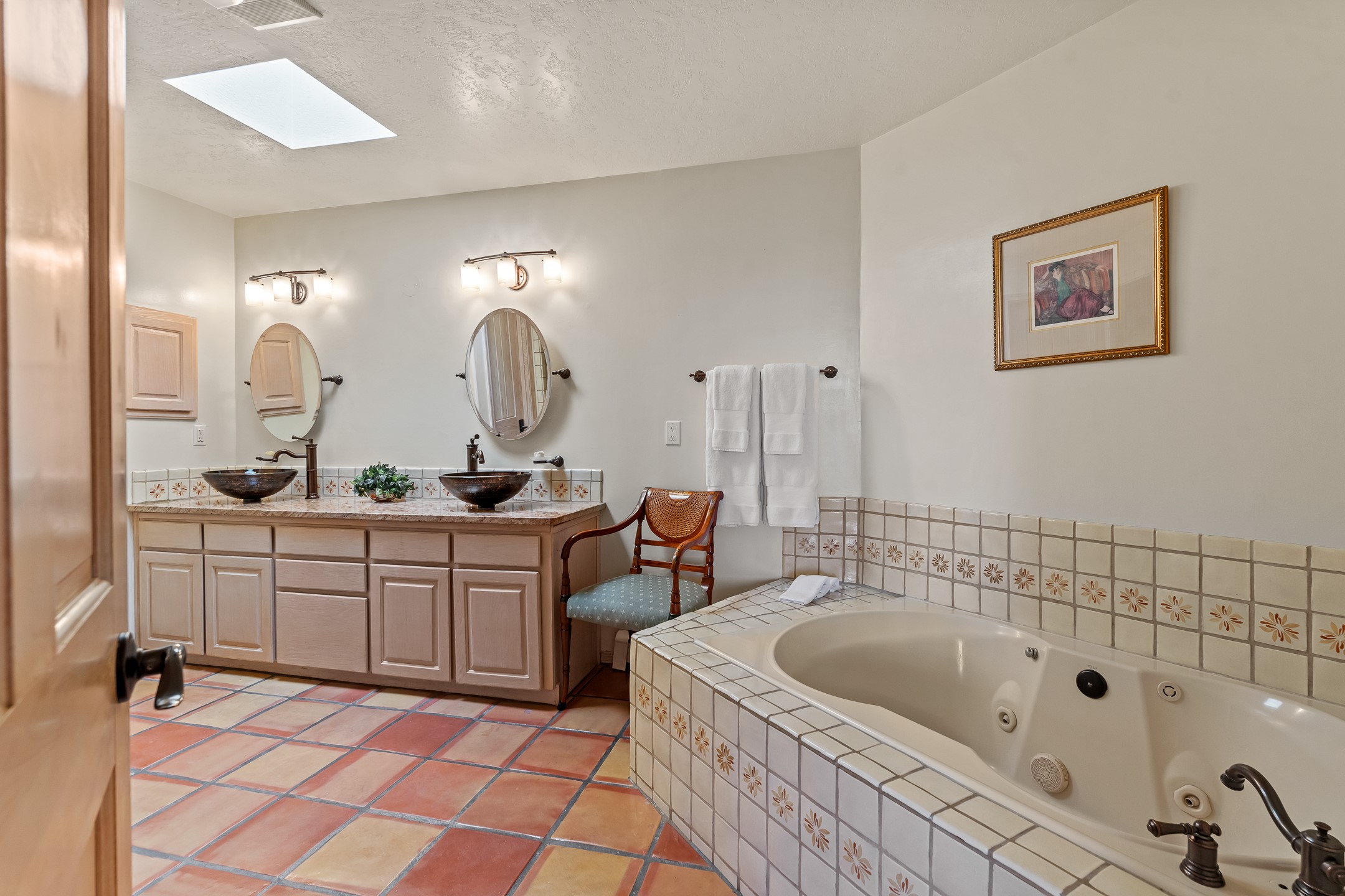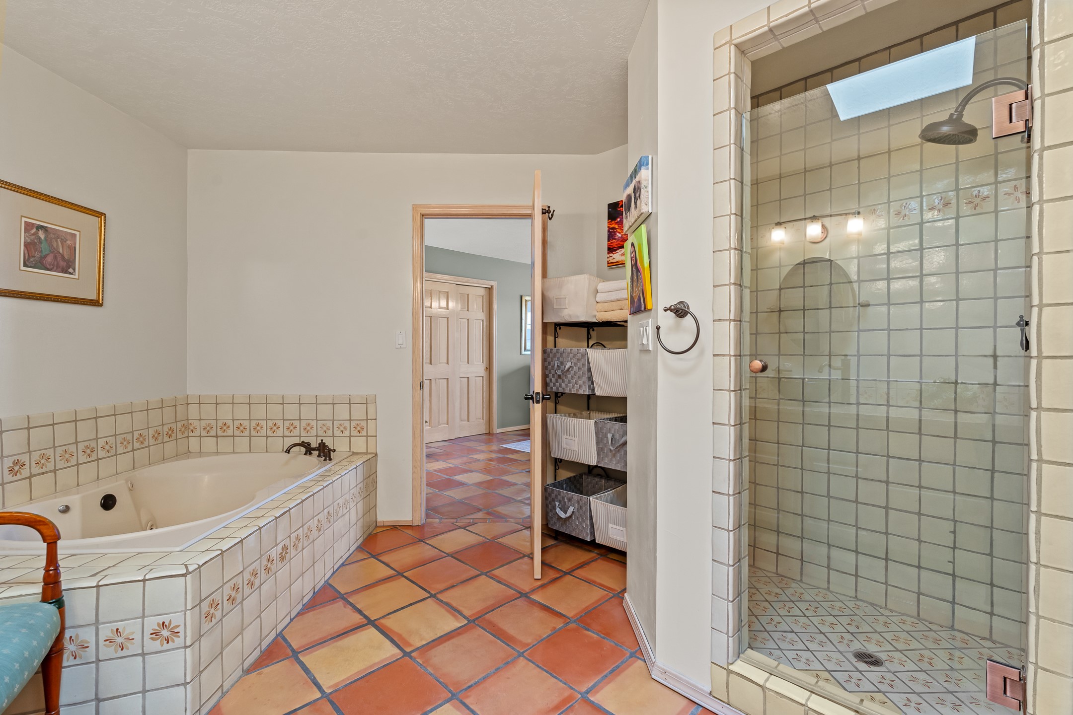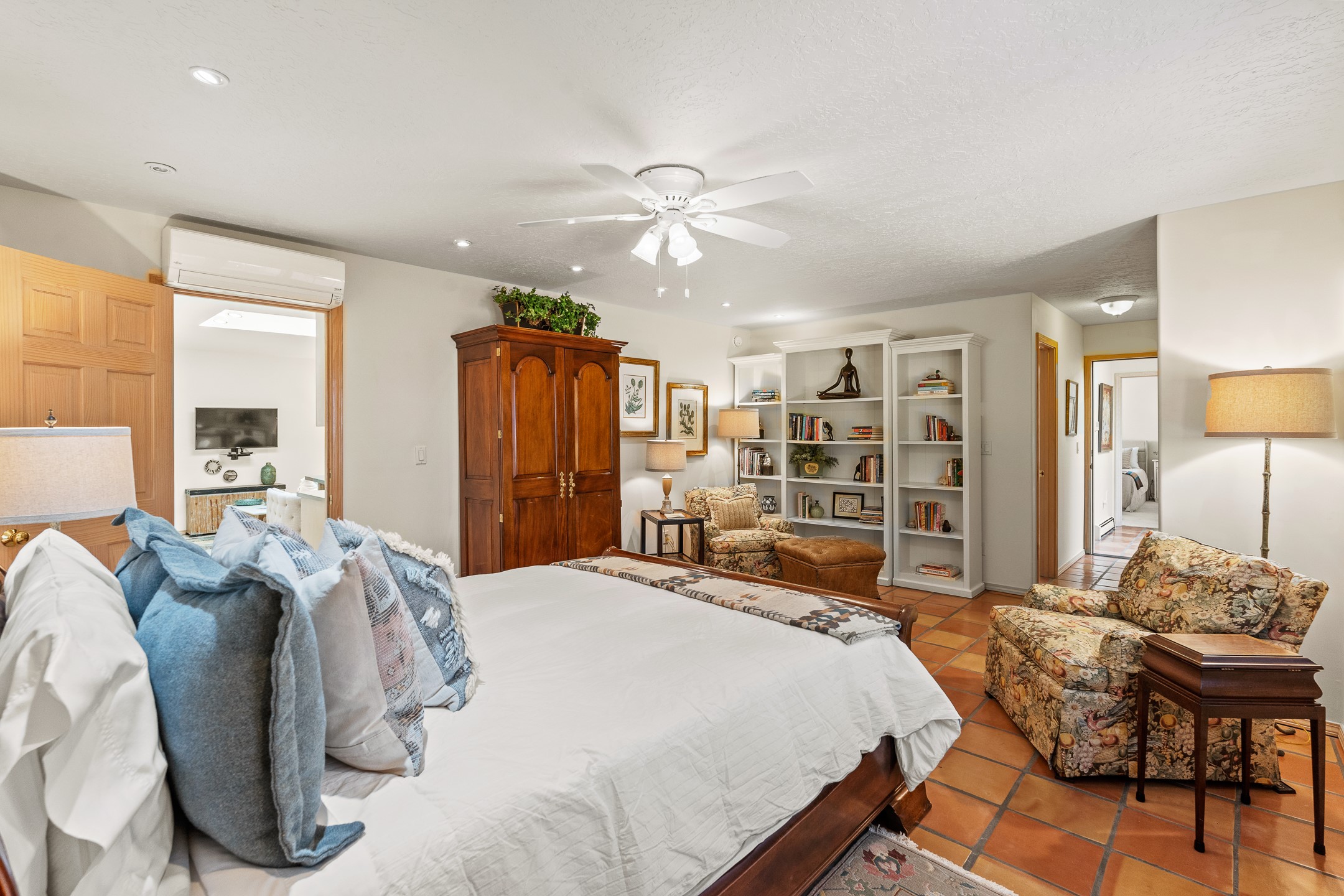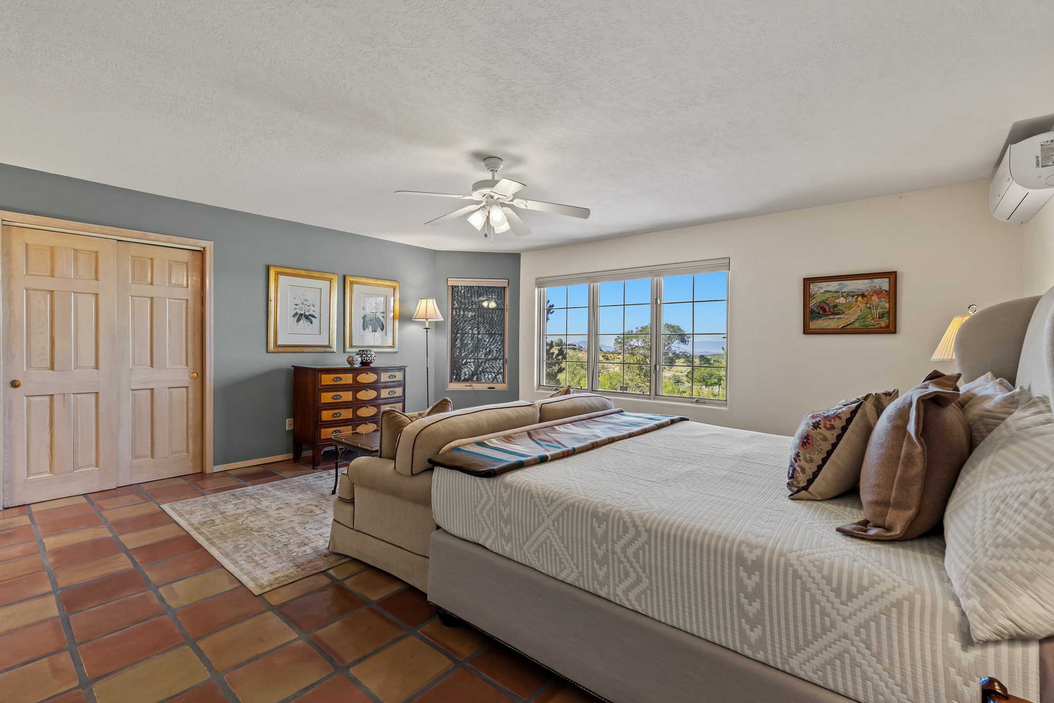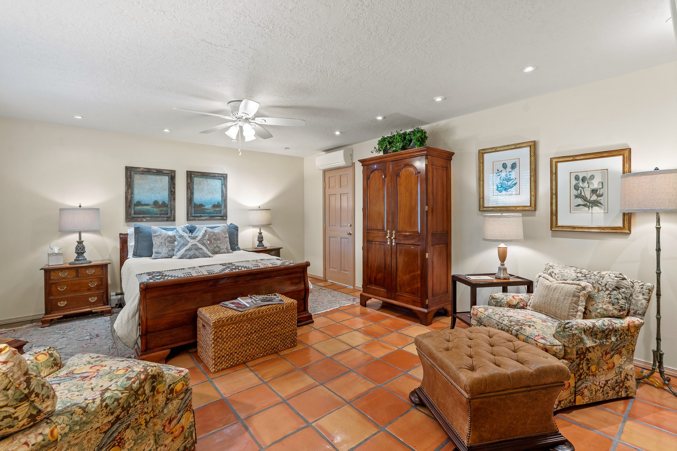 Perched above the city with beautiful Southern views of the Ortiz/Sandia and overlooking Santa Fe's beloved Ortiz Dog Park, this 2,814 sq. ft. residence offers 3 bedrooms and 3 bathrooms, including a beautifully designed, attached 1-bedroom, 1-bath guest house. The guest house has an interior connection to the home yet has its own private entrance, providing exceptional flexibility for extended family, guests, or income potential.The main living and dining area exudes Southwestern charm with high ceilings, vigas, a lovely wood-burning kiva fireplace, and French doors opening to a wraparound portal. A flagstone patio creates a magical outdoor dining setting to enjoy Santa Fe's sunsets and outdoor living. The kitchen, with its inviting breakfast nook, island, and warm regional details, is perfectly suited for both everyday living and entertaining.The spacious primary suite is a retreat of its own, with views, a luxurious bathroom featuring double vanities, a walk-in shower, and a deep soaking tub, plus an impressive walk-in closet. A guest bedroom and bath, set privately off the main hallway, complete the thoughtful floor plan.The guest house with full kitchen is accessible via an interior main house door or private exterior entrance, includes its own patio and offers endless possibilities--multi-generational living, a guest retreat, or a rental opportunity.Sited in a superior location just five minutes to downtown and ten minutes to the Plaza, this property combines views, versatility, and value in one of Santa Fe's most desirable settings. No HOA.