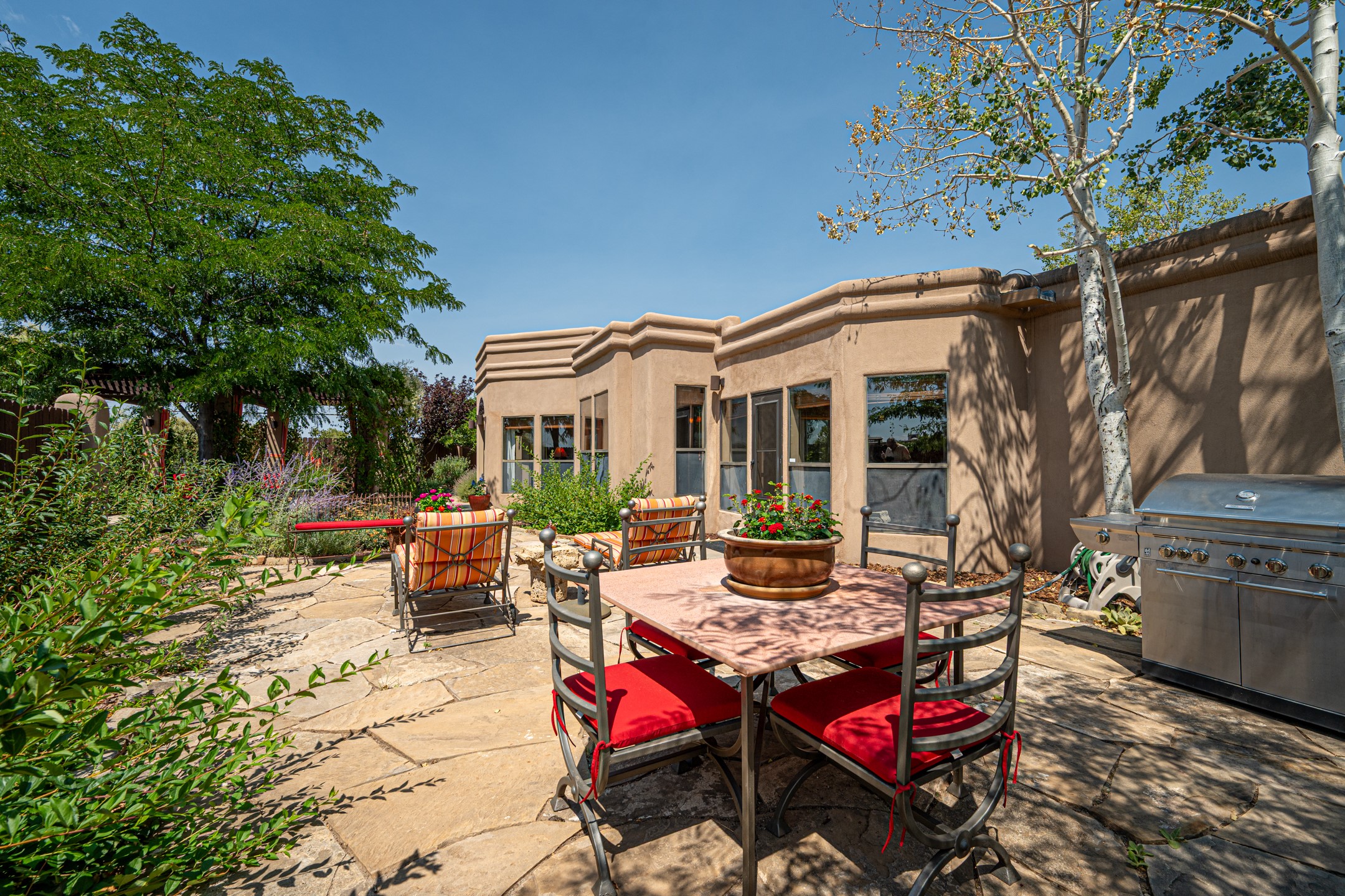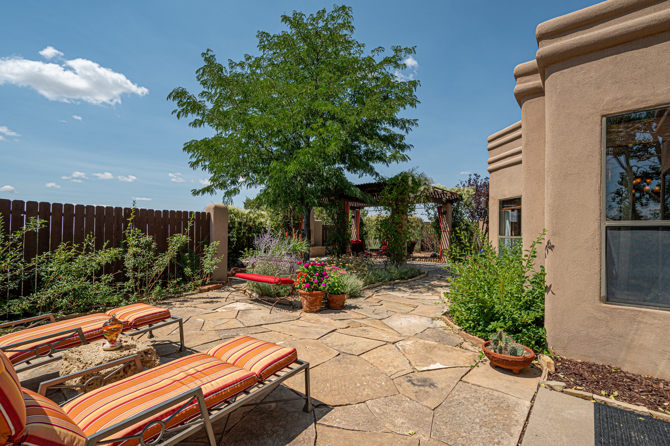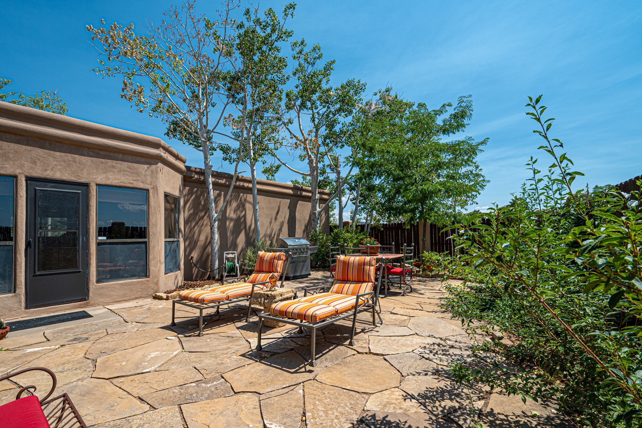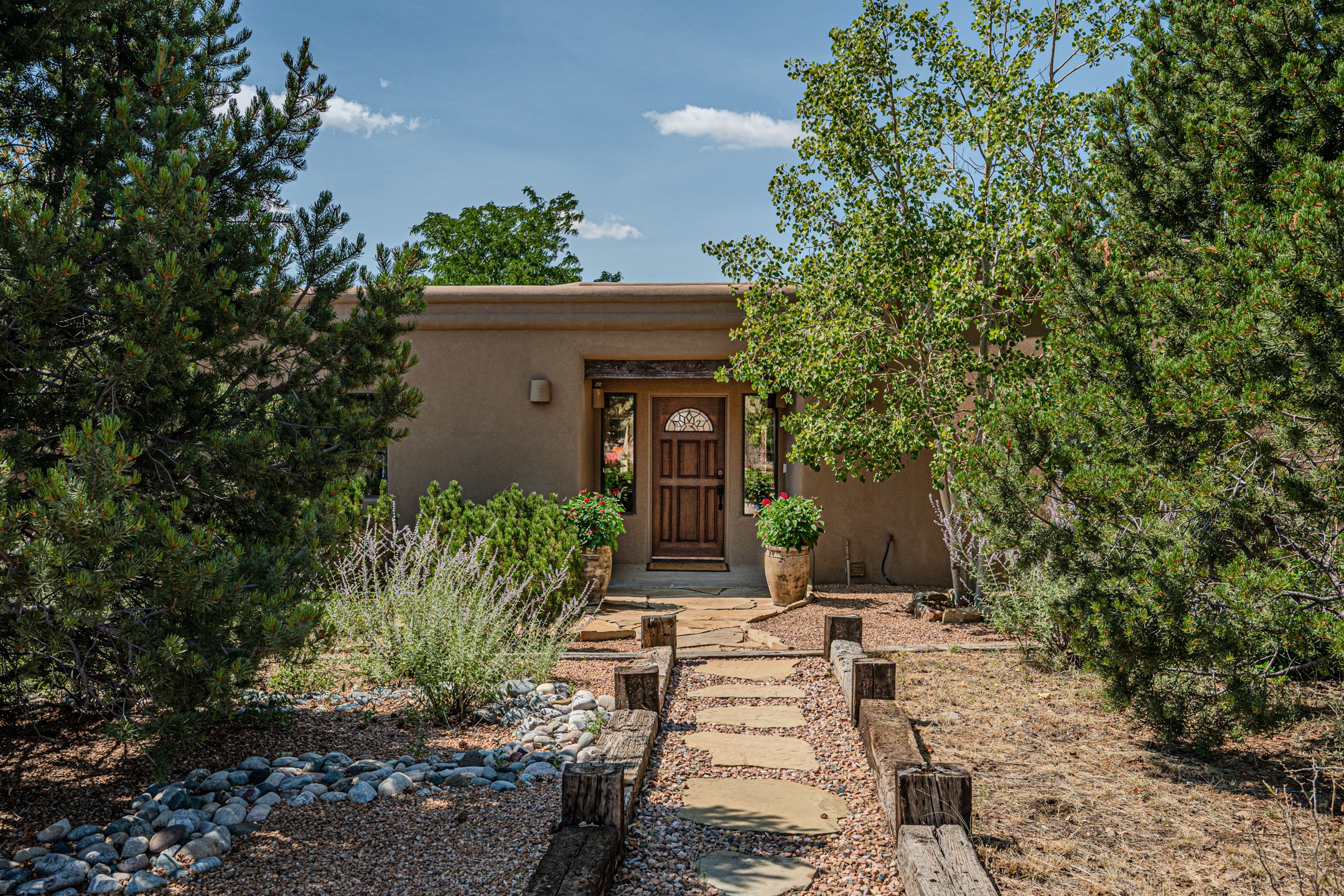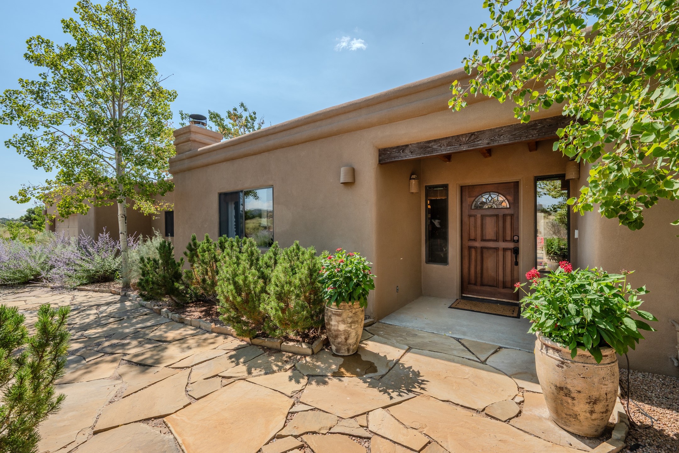 Fabulous Santa Fe detailing throughout this contemporary pueblo, open plan design. This home will wow you from landscaped entry through the foyer to view the pergola and dramatic garden fireplace. Romantic Kiva fireplaces in the owners suite, living room and study, high beam ceilings and gleaming Saltillo tile floors throughout. Remodeled spacious entertainers kitchen with large central island, a formal dining room overlooking the garden, and the main bedroom features a large walk in closet and updated spa-like bathroom. Privately fenced landscaped gardens and patios, portal and pergola for outside entertaining and enjoyment. Located on a quiet cul de sac within easy reach of the Eldorado amenities including the community center, pool, tennis, pickleball, dog parks, playgrounds, parks and disc golf, as well as 2 local shopping centers, library, senior center and schools, and only minutes into Santa Fe.