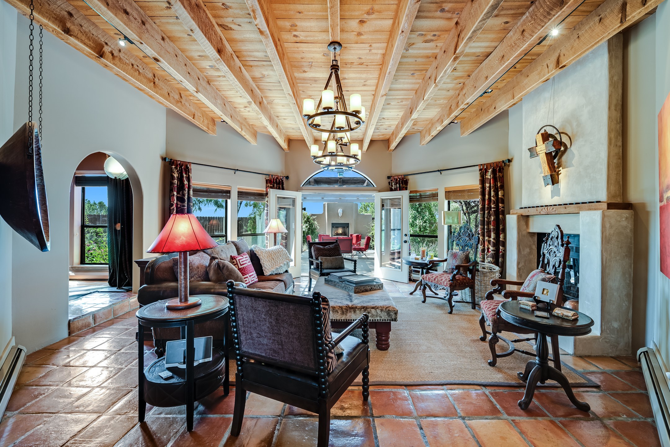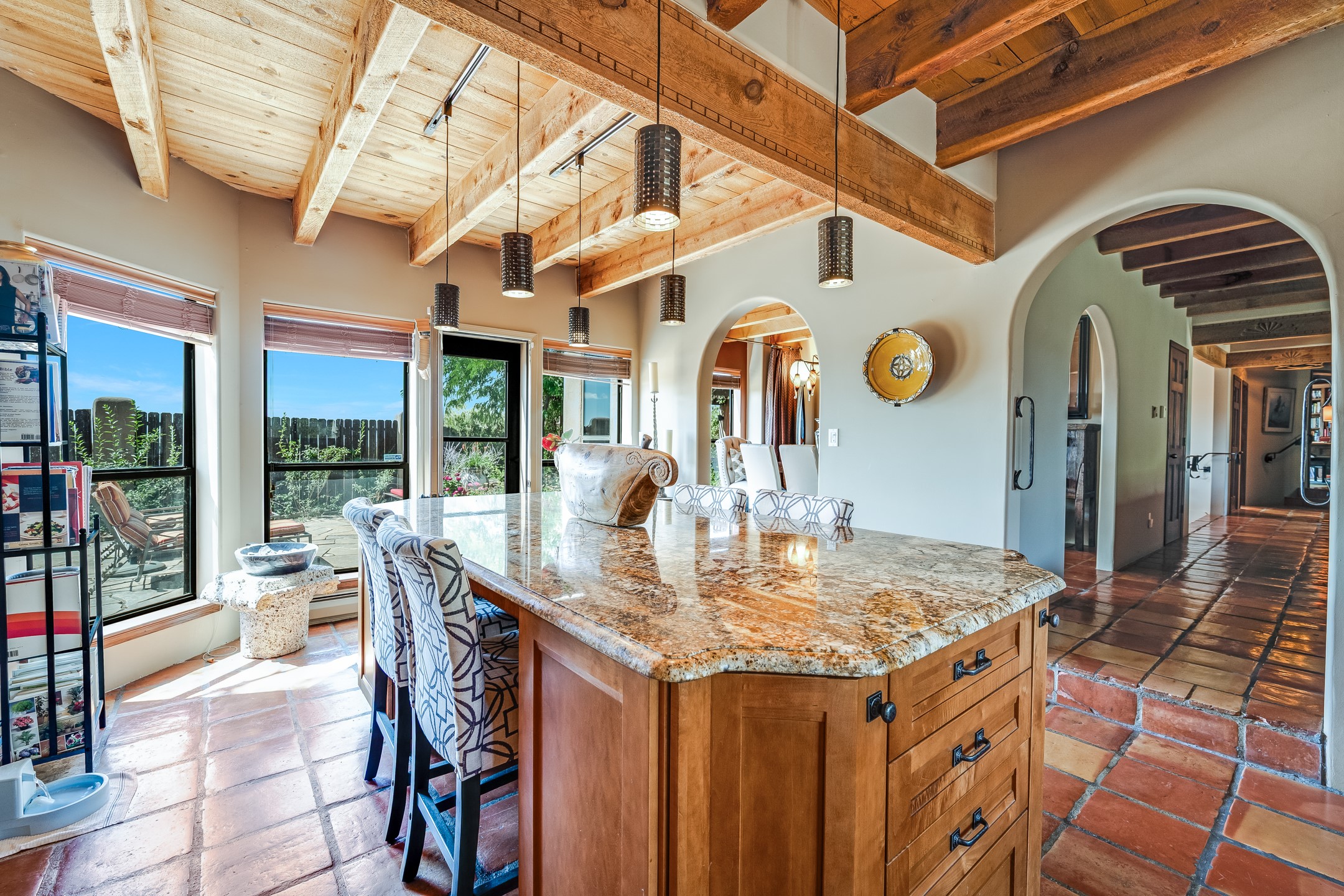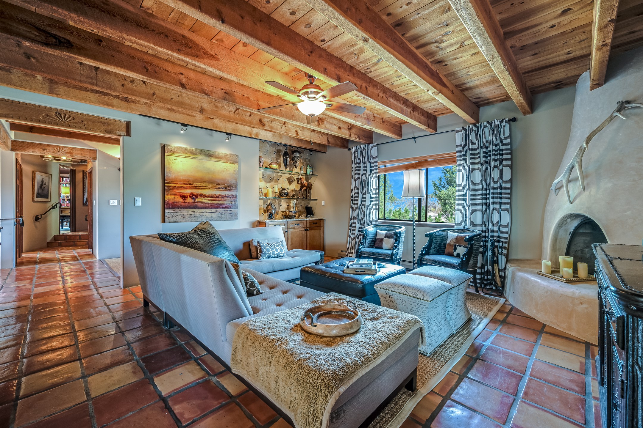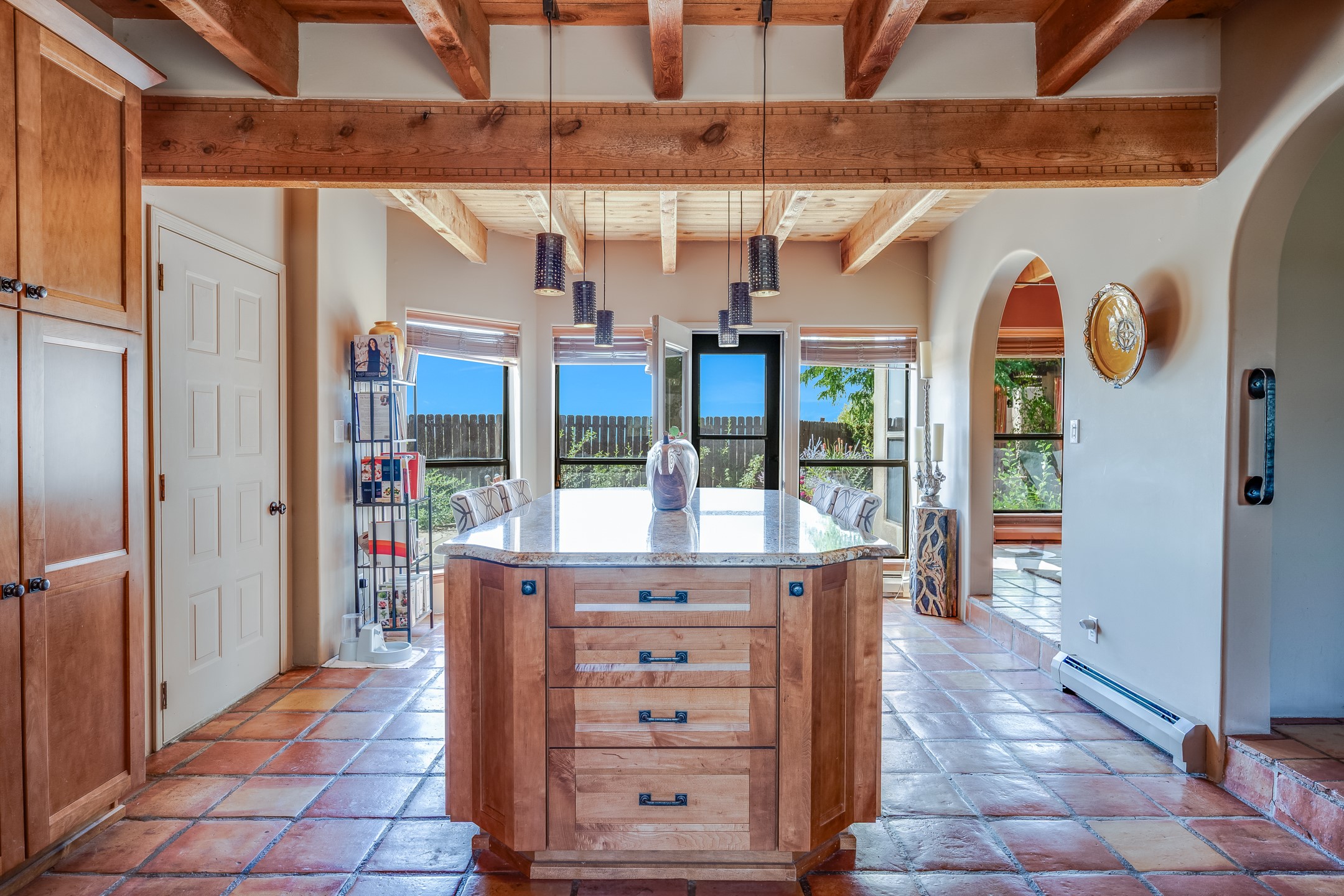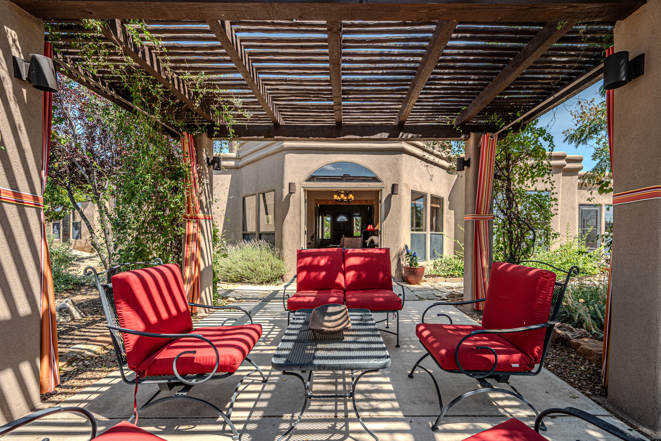 Fabulous Santa Fe detailing throughout this contemporary pueblo, open plan design. This home will wow you from landscaped entry through the foyer to view the pergola and dramatic garden fireplace. Romantic Kiva fireplaces in the owners suite, living room and study, high beam ceilings and gleaming Saltillo tile floors throughout. Remodeled spacious entertainers kitchen with large central island, a formal dining room overlooking the garden, and the main bedroom features a large walk in closet and updated spa-like bathroom. Privately fenced landscaped gardens and patios, portal and pergola for outside entertaining and enjoyment. Located on a quiet cul de sac within easy reach of the Eldorado amenities including the community center, pool, tennis, pickleball, dog parks, playgrounds, parks and disc golf, as well as 2 local shopping centers, library, senior center and schools, and only minutes into Santa Fe.