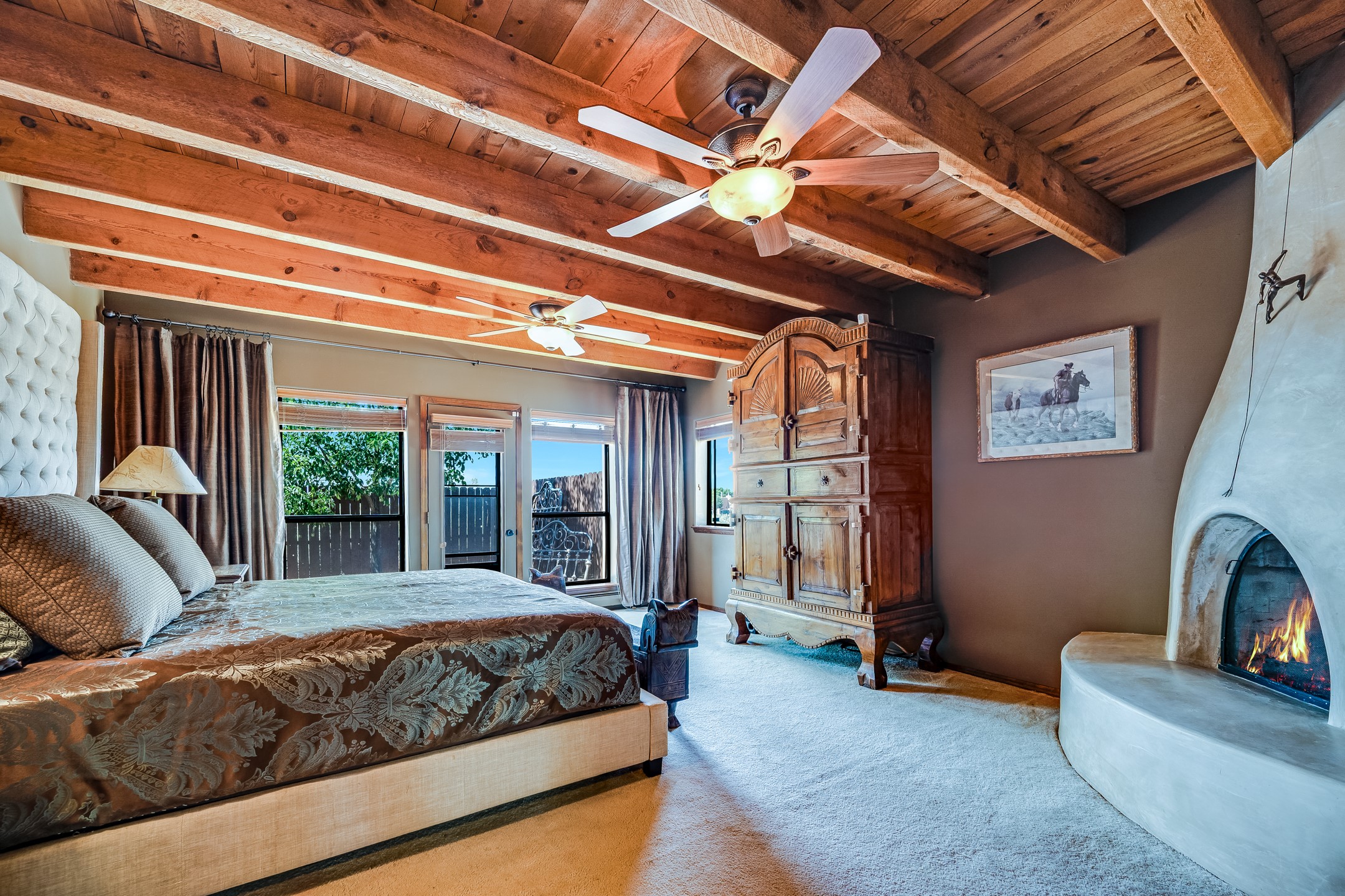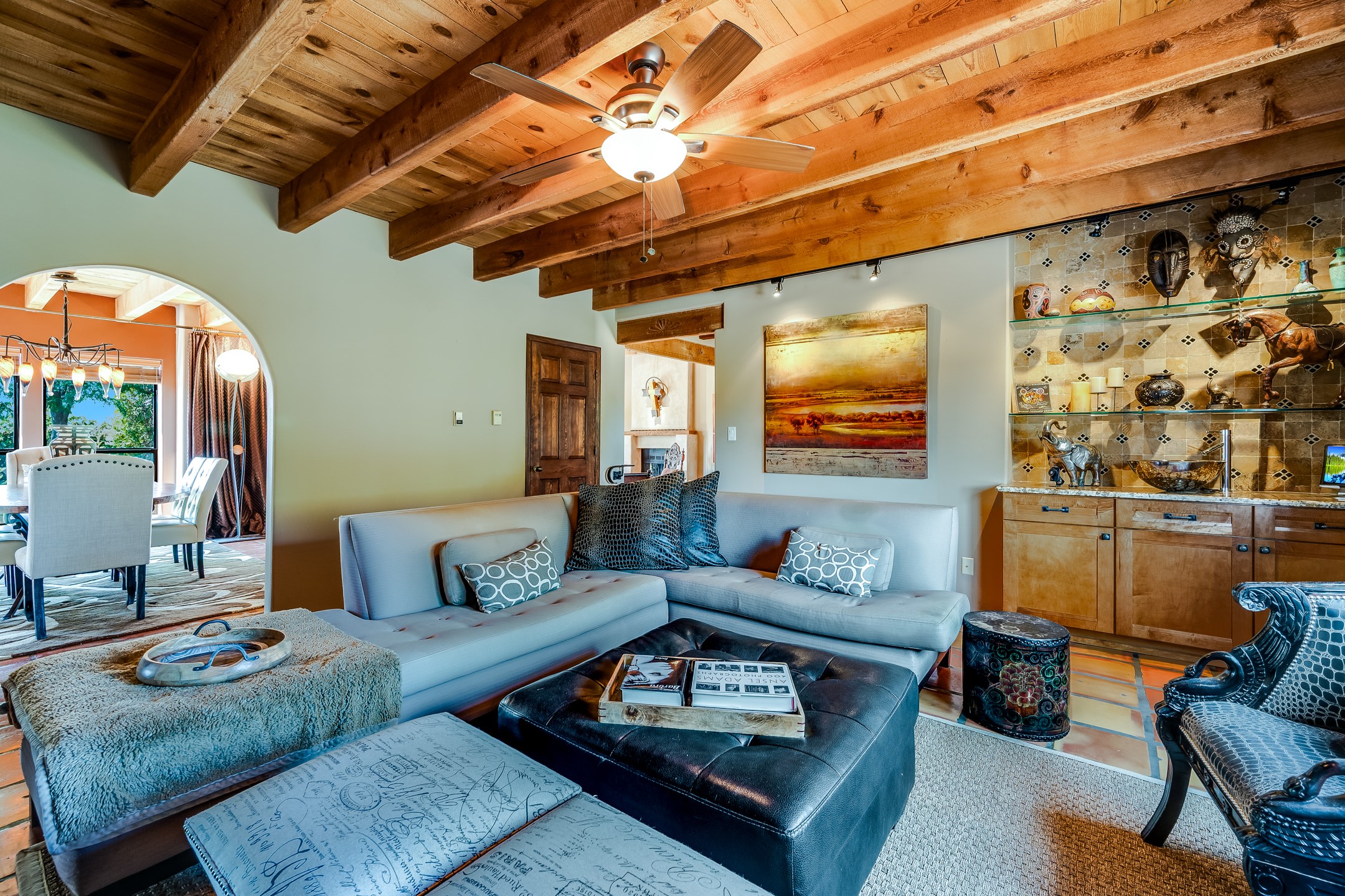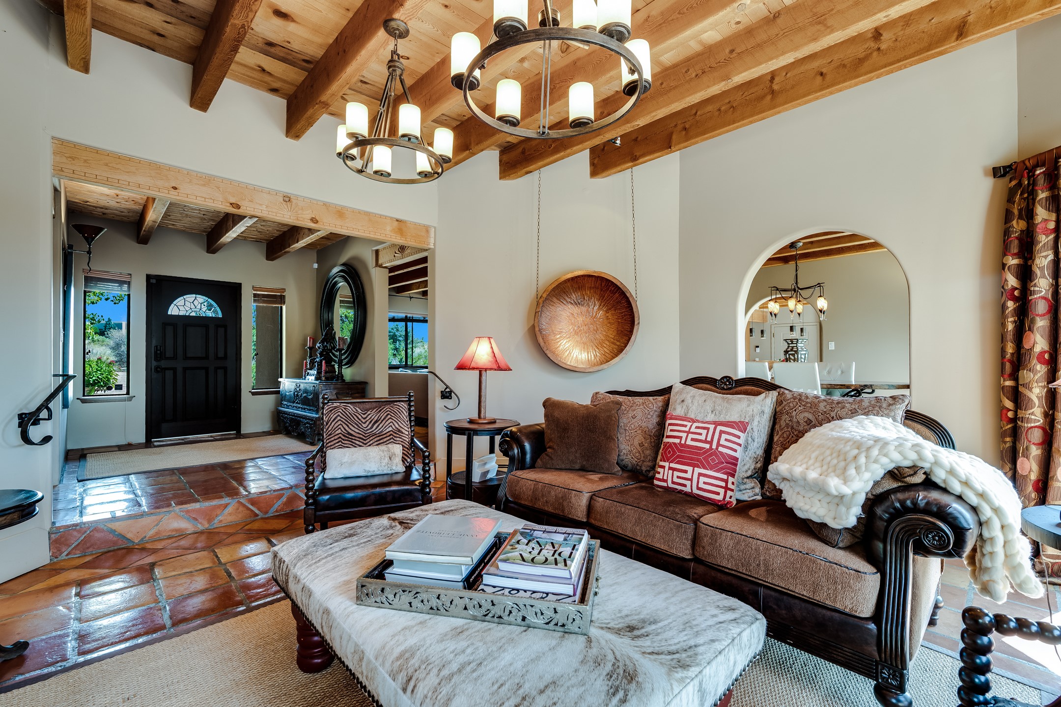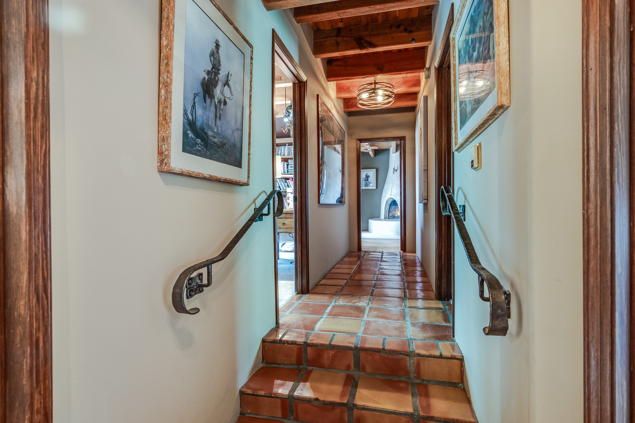 Fabulous Santa Fe detailing throughout this contemporary pueblo, open plan design. This home will wow you from landscaped entry through the foyer to view the pergola and dramatic garden fireplace. Romantic Kiva fireplaces in the owners suite, living room and study, high beam ceilings and gleaming Saltillo tile floors throughout. Remodeled spacious entertainers kitchen with large central island, a formal dining room overlooking the garden, and the main bedroom features a large walk in closet and updated spa-like bathroom. Privately fenced landscaped gardens and patios, portal and pergola for outside entertaining and enjoyment. Located on a quiet cul de sac within easy reach of the Eldorado amenities including the community center, pool, tennis, pickleball, dog parks, playgrounds, parks and disc golf, as well as 2 local shopping centers, library, senior center and schools, and only minutes into Santa Fe.