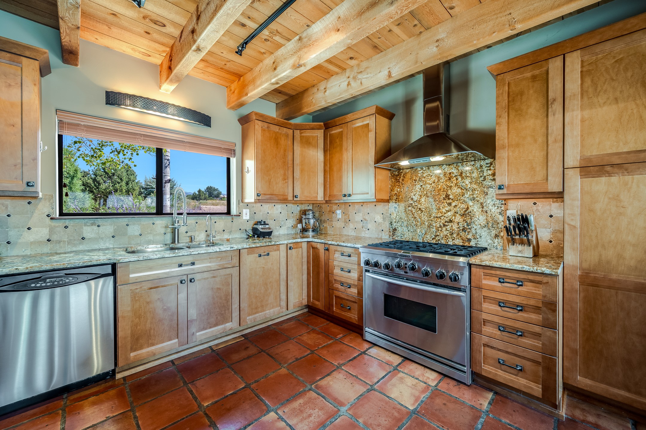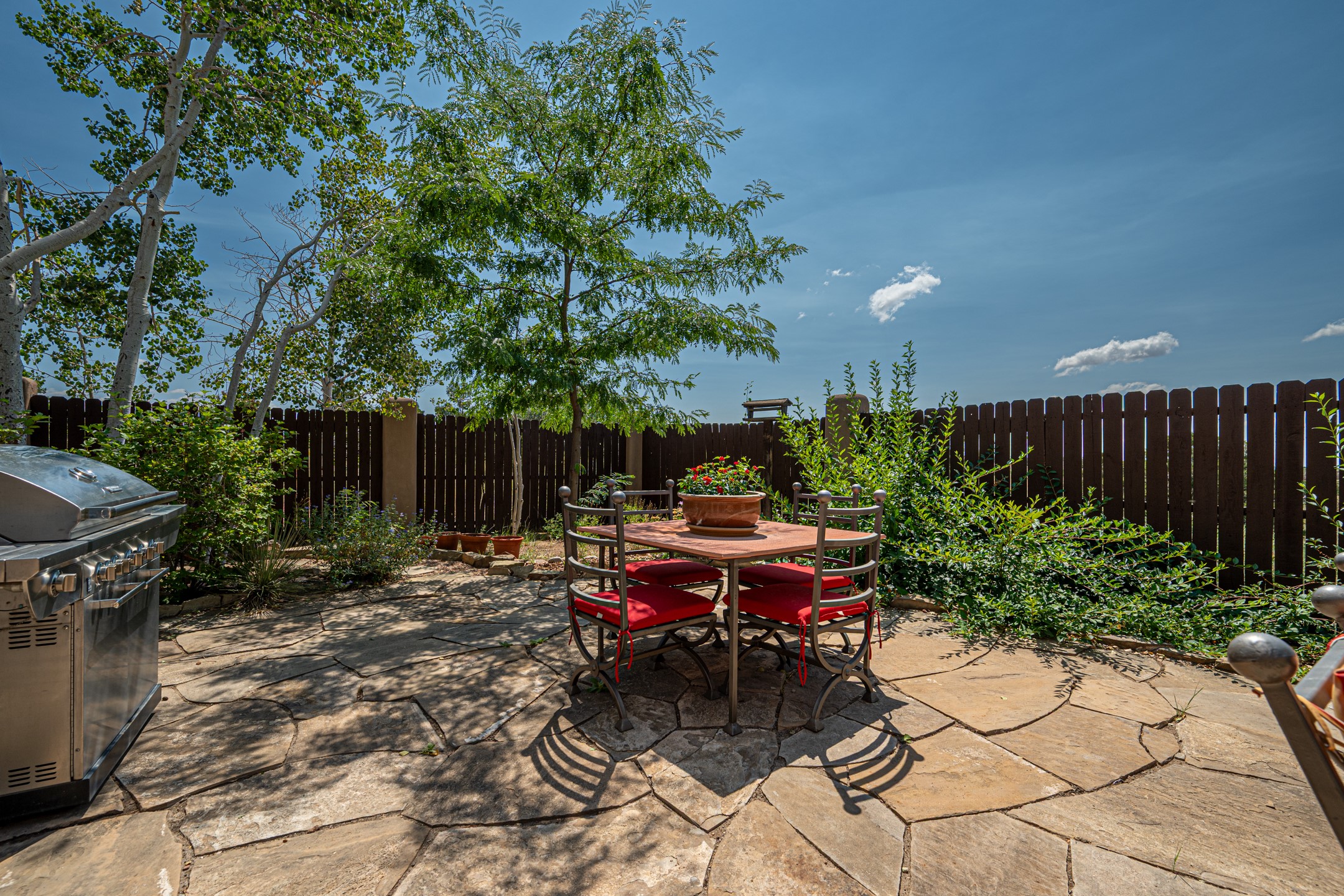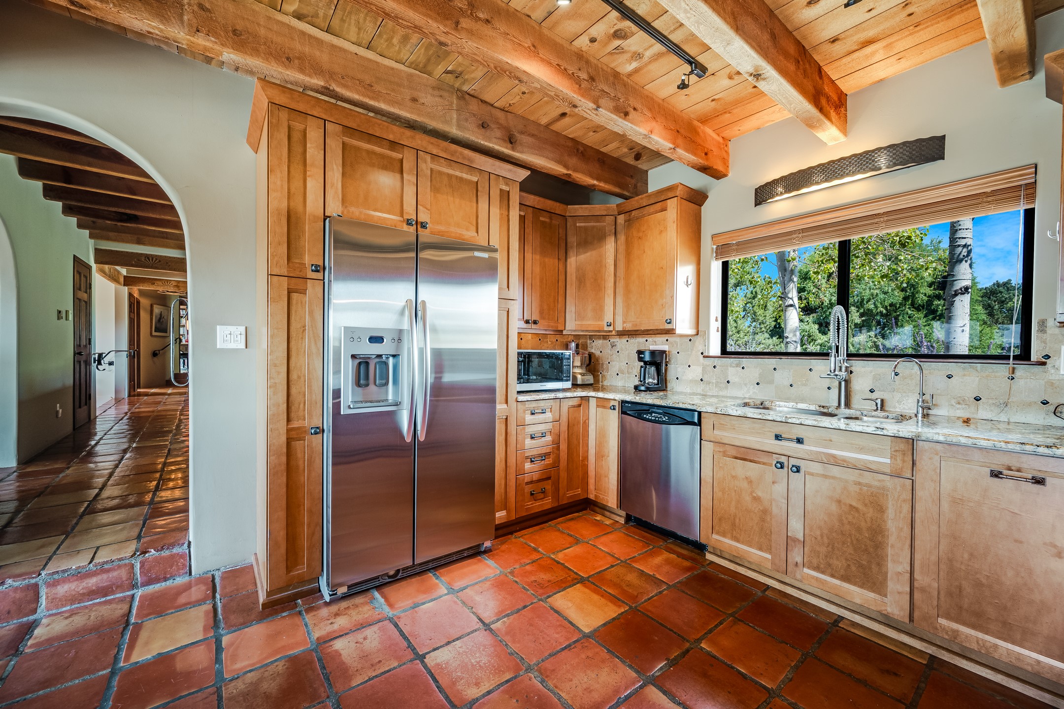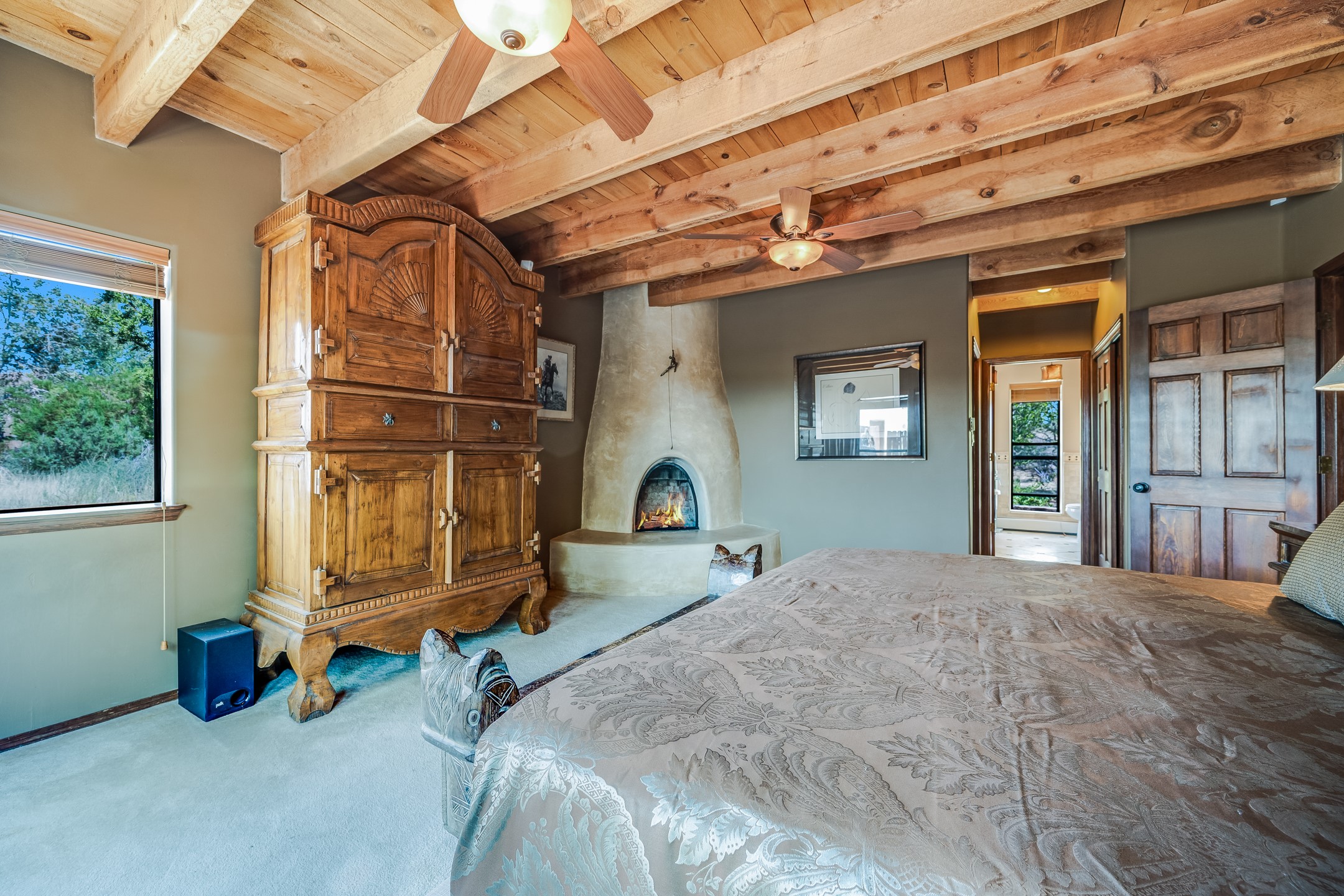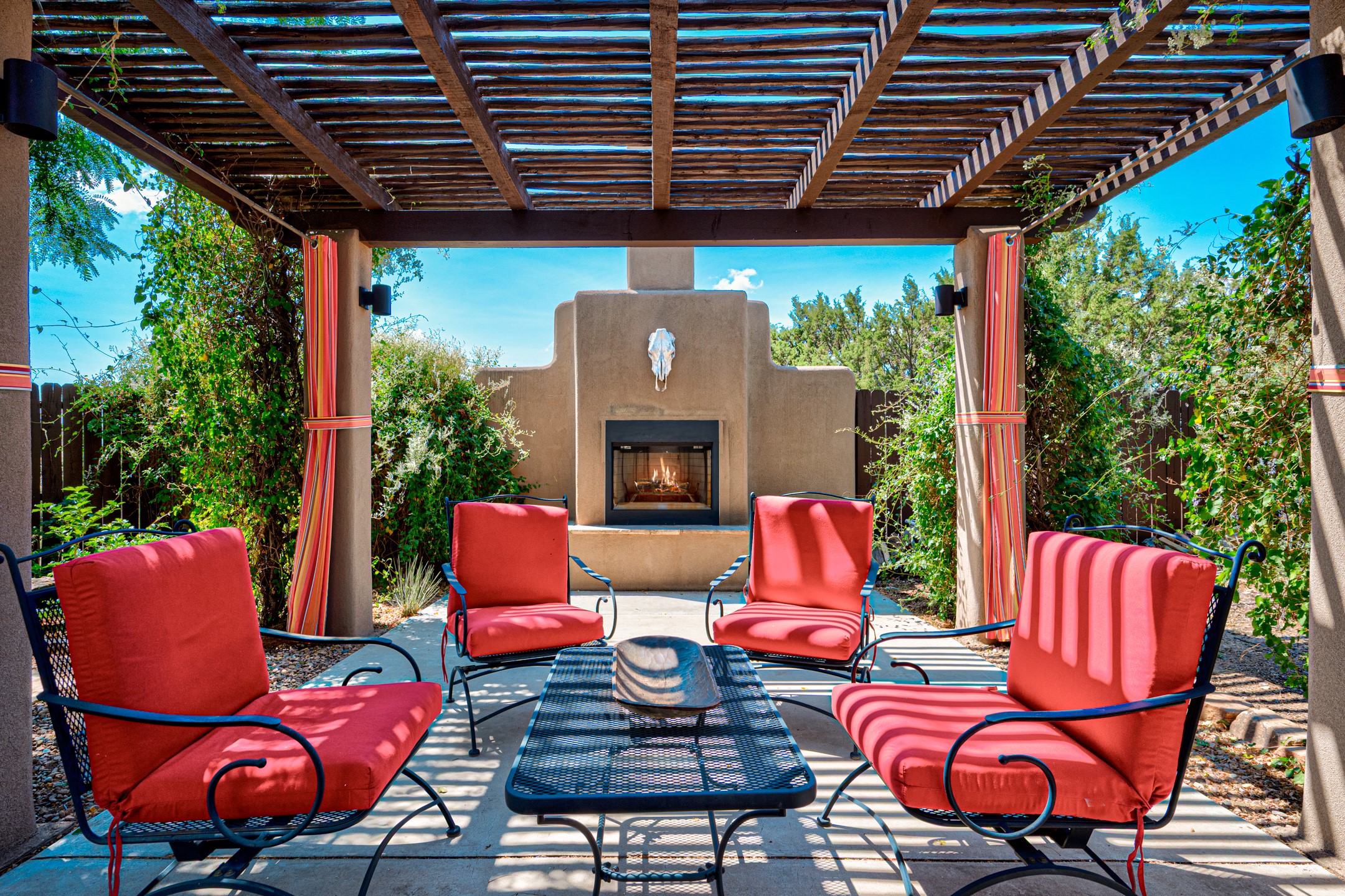 Fabulous Santa Fe detailing throughout this contemporary pueblo, open plan design. This home will wow you from landscaped entry through the foyer to view the pergola and dramatic garden fireplace. Romantic Kiva fireplaces in the owners suite, living room and study, high beam ceilings and gleaming Saltillo tile floors throughout. Remodeled spacious entertainers kitchen with large central island, a formal dining room overlooking the garden, and the main bedroom features a large walk in closet and updated spa-like bathroom. Privately fenced landscaped gardens and patios, portal and pergola for outside entertaining and enjoyment. Located on a quiet cul de sac within easy reach of the Eldorado amenities including the community center, pool, tennis, pickleball, dog parks, playgrounds, parks and disc golf, as well as 2 local shopping centers, library, senior center and schools, and only minutes into Santa Fe.
