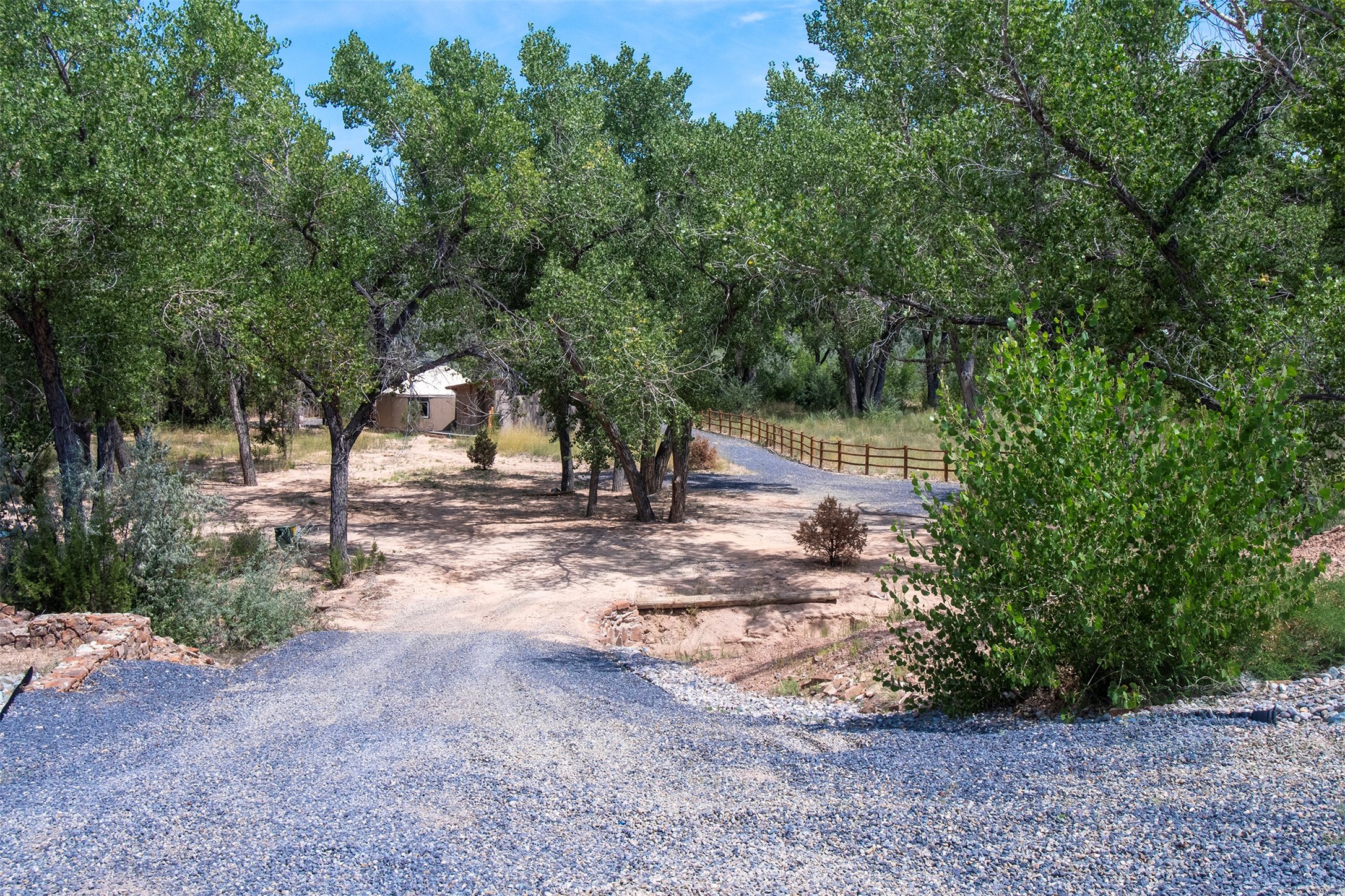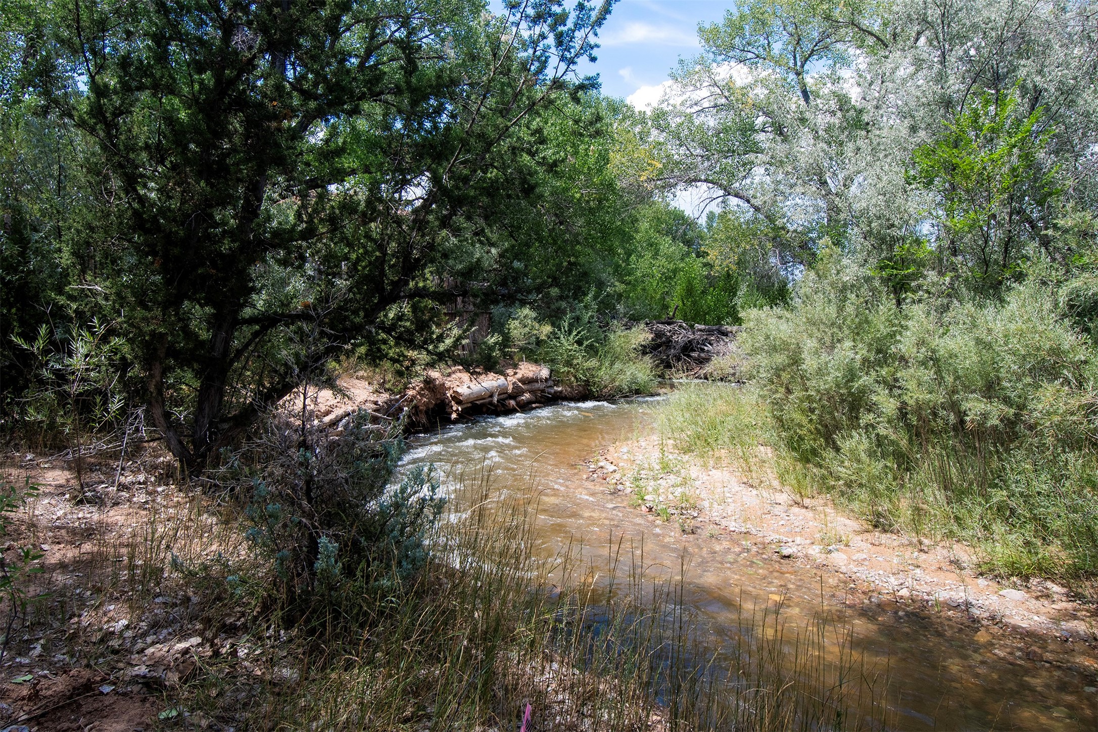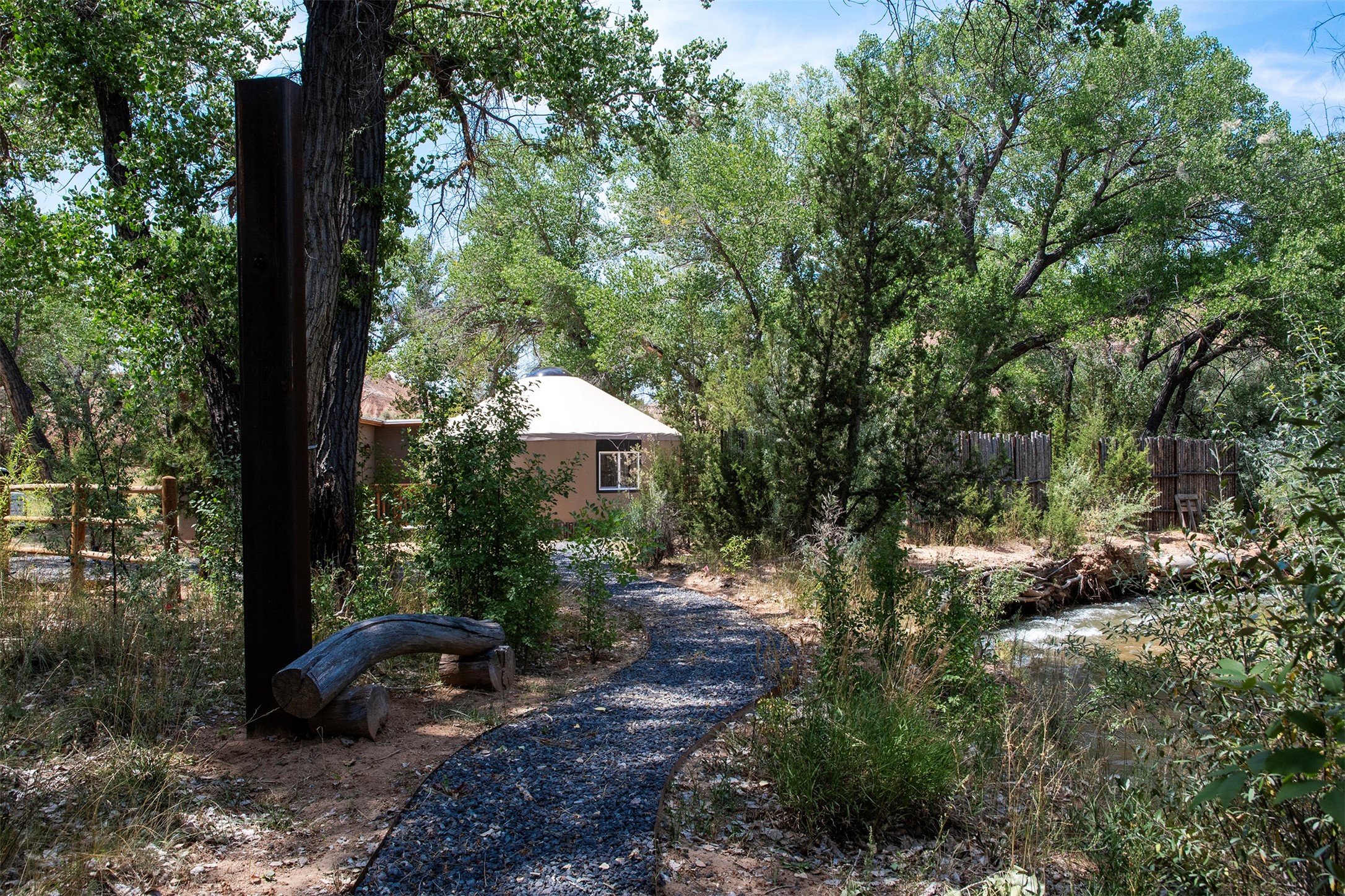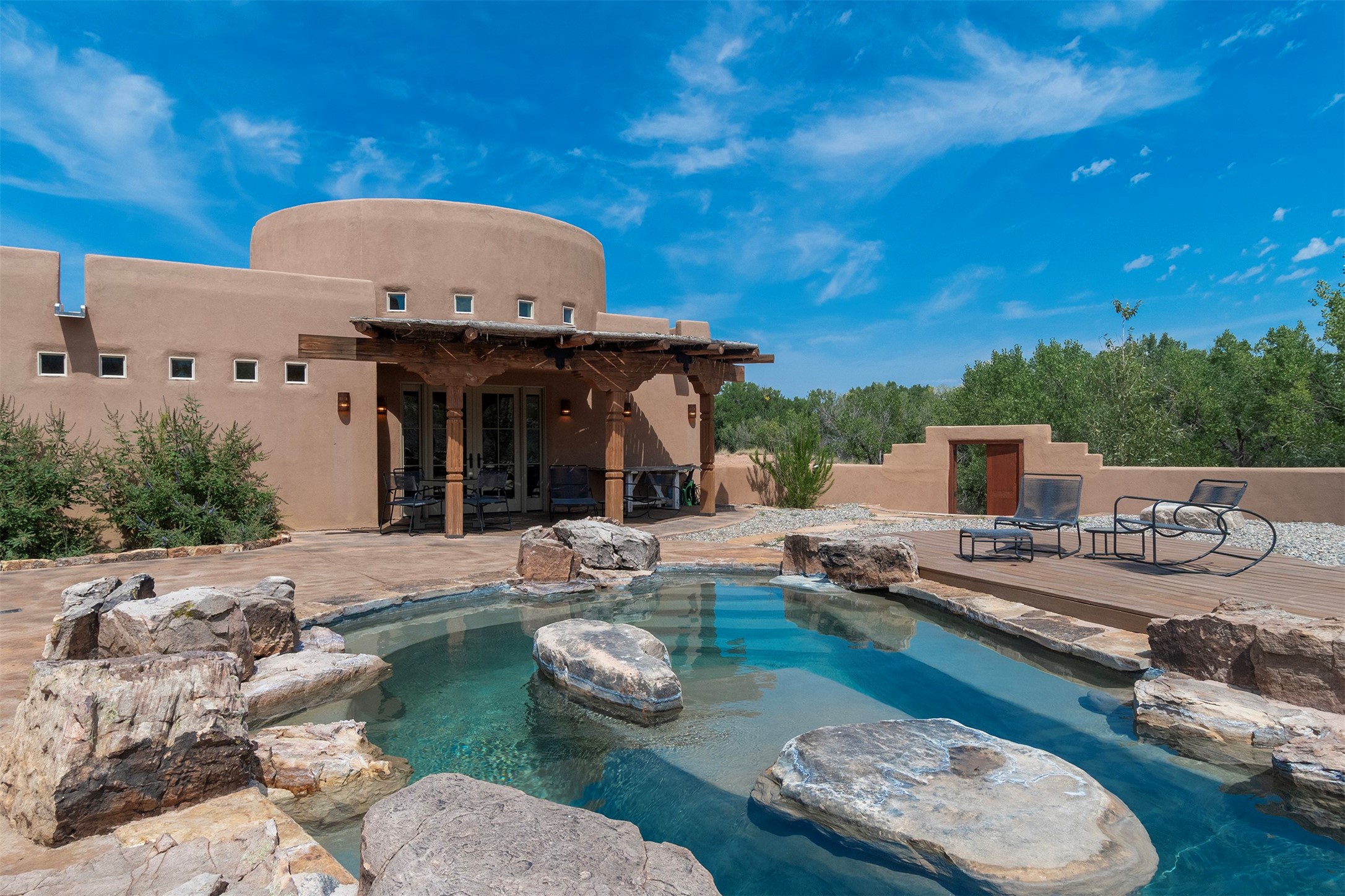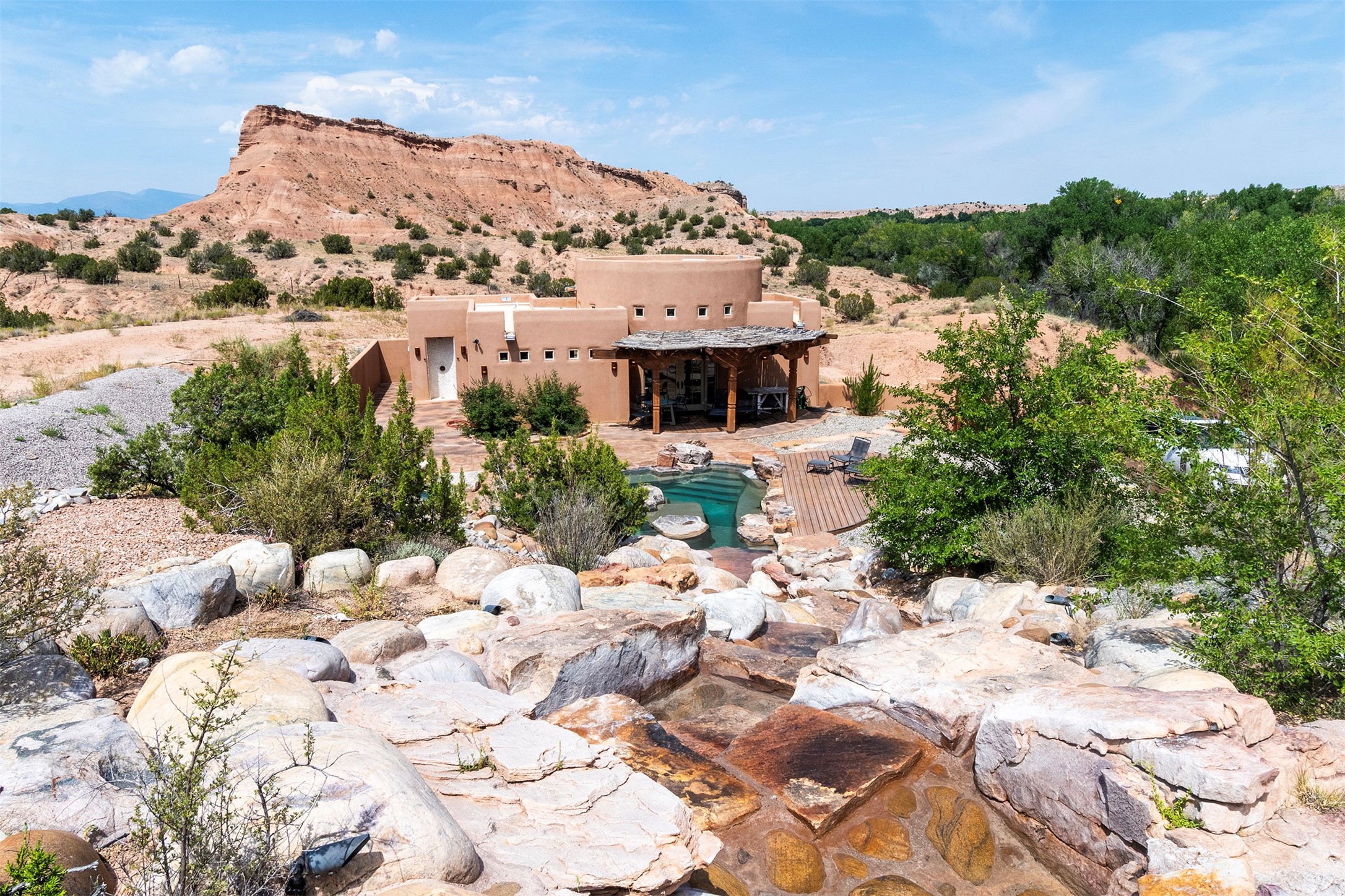 DESERT RIPARIAN DELIGHT - 2 CASITAS | 2 BATHS | 1,900 SQFT | 5.7 ACRES. Fabulously Fun Chimayo River Compound & Leisure Retreat. Welcome the natural bounty of the Chimayo river valley at this open concept modern pueblo casita compound with leisure pools and river access. Beat the heat with the soaking pool complete with waterfall grotto and lounging pad or cozy up in the winter with the hot tub or fire pit. Comprising 2 Casitas; The Pueblo Pool House Casita features a leisure pool, hot tub, waterfall grotto, outdoor shower area and beautiful stone work. The River Casitia is a finished 24' Yurt with added kitchen and bathroom on a permanent foundation next to the river featuring a fire pit area and river access trails. Each building is complete with an outdoor shower for apre l'eau - pool or river. Offering tile porcelain floors, art lighting, under cabinet lighting, 2 outdoor showers, built-in banquette with storage, dishwasher, on site laundry, electric range, insulated windows, hardwood cabinetry, and bronze hardware, Dos Casitas Compound on the River is a delightful wilderness retreat. Located on 5.7 dynamic and beautiful acres In the Chimayo Valley, 40 minutes from Historic Santa Fe and 60 from the Pueblos of Taos. Resting alongside the Santa Cruz River makes this a true oasis in the New Mexico desert. The property is plentiful with river life. Majestic cottonwoods grow alongside the river and vast views of the desert hills and mesas of northern New Mexico offer the senses peaceful imaginings. Adjacent to acres of BLM land, makes this a wonderfully secluded location at the end of a private road. Conveniently located just five mins from village stores, shopping, and not much further to nearby restaurants, historic and local attractions. Imagine this as the amazing Art Studio or Yoga Yurt of your dreams. Perfect for Investor Wilderness Spa Retreat or further Compound development. Visit today and own a piece of Northern New Mexico paradise tomorrow.