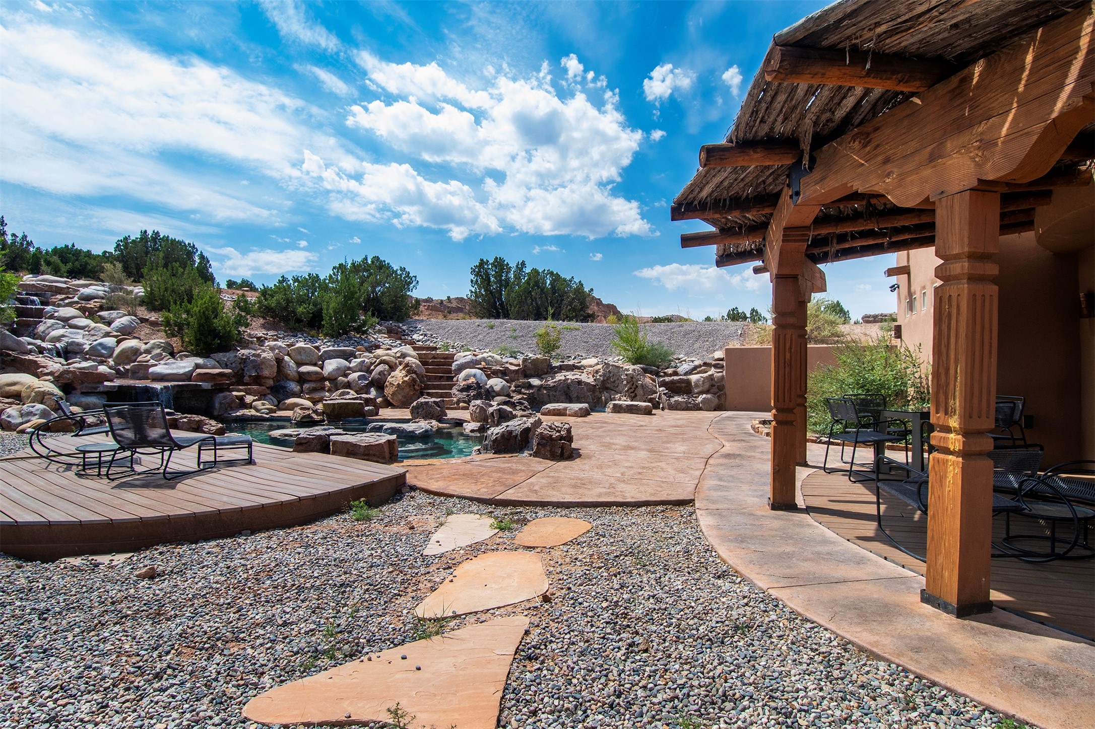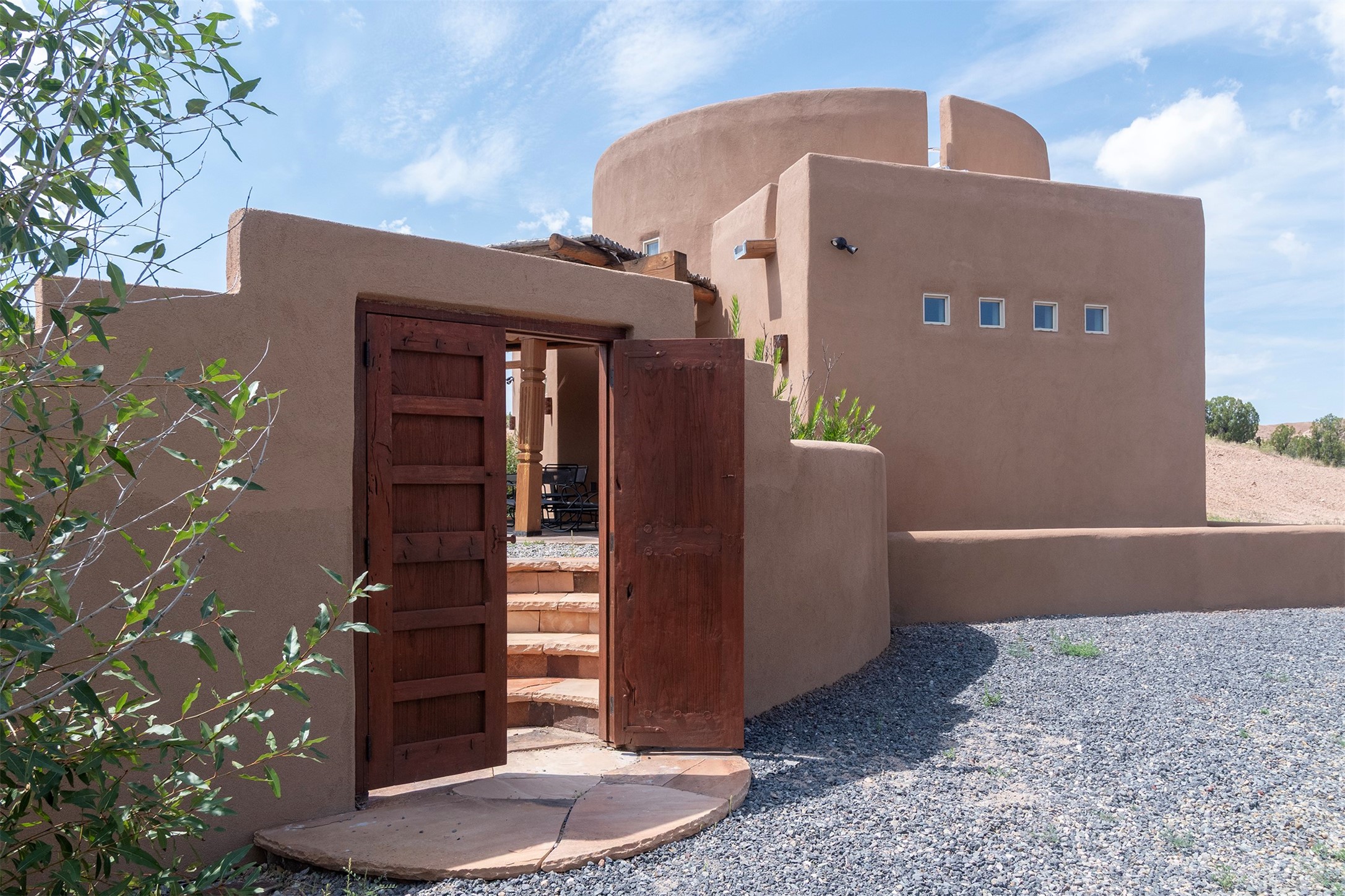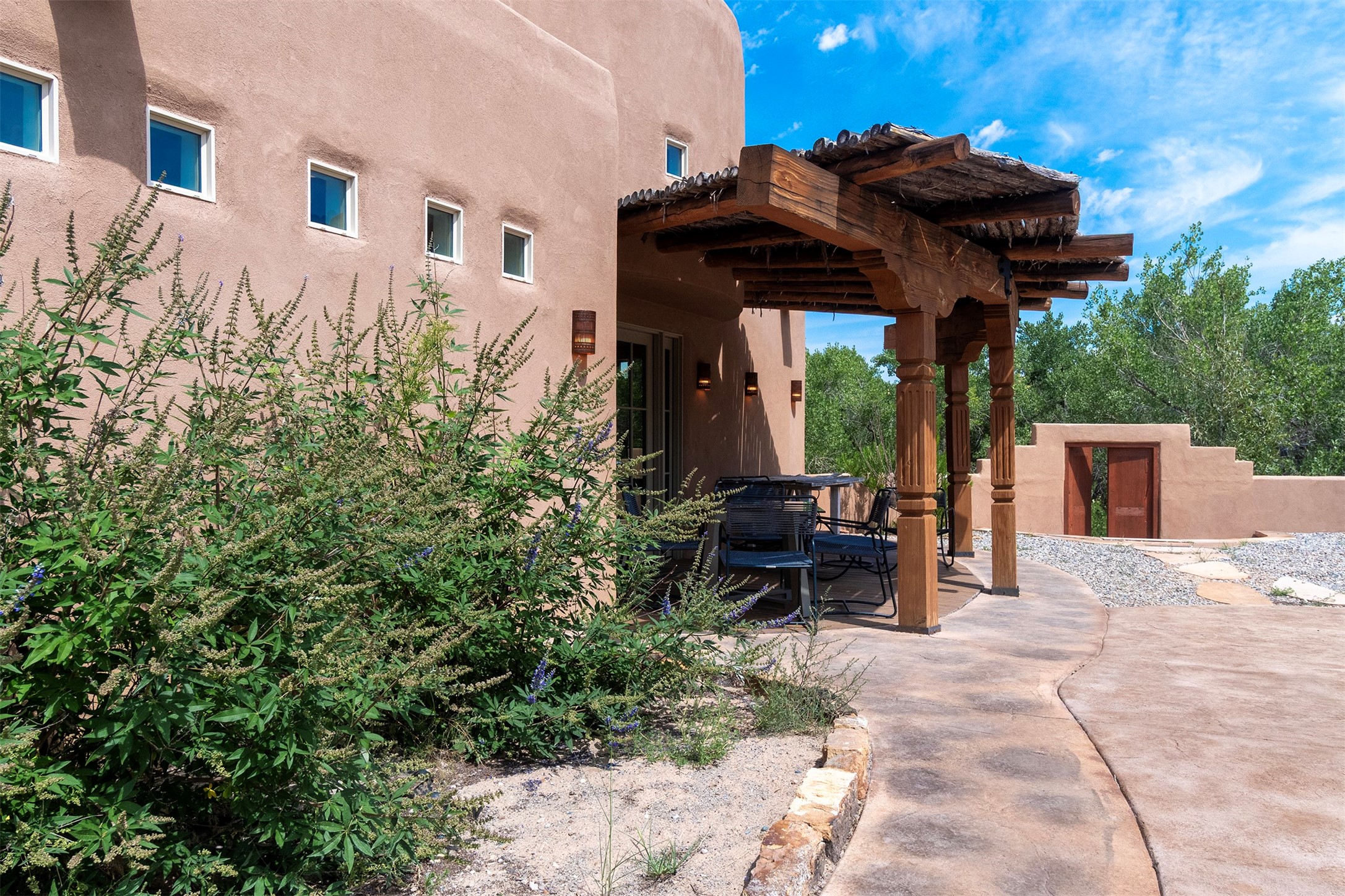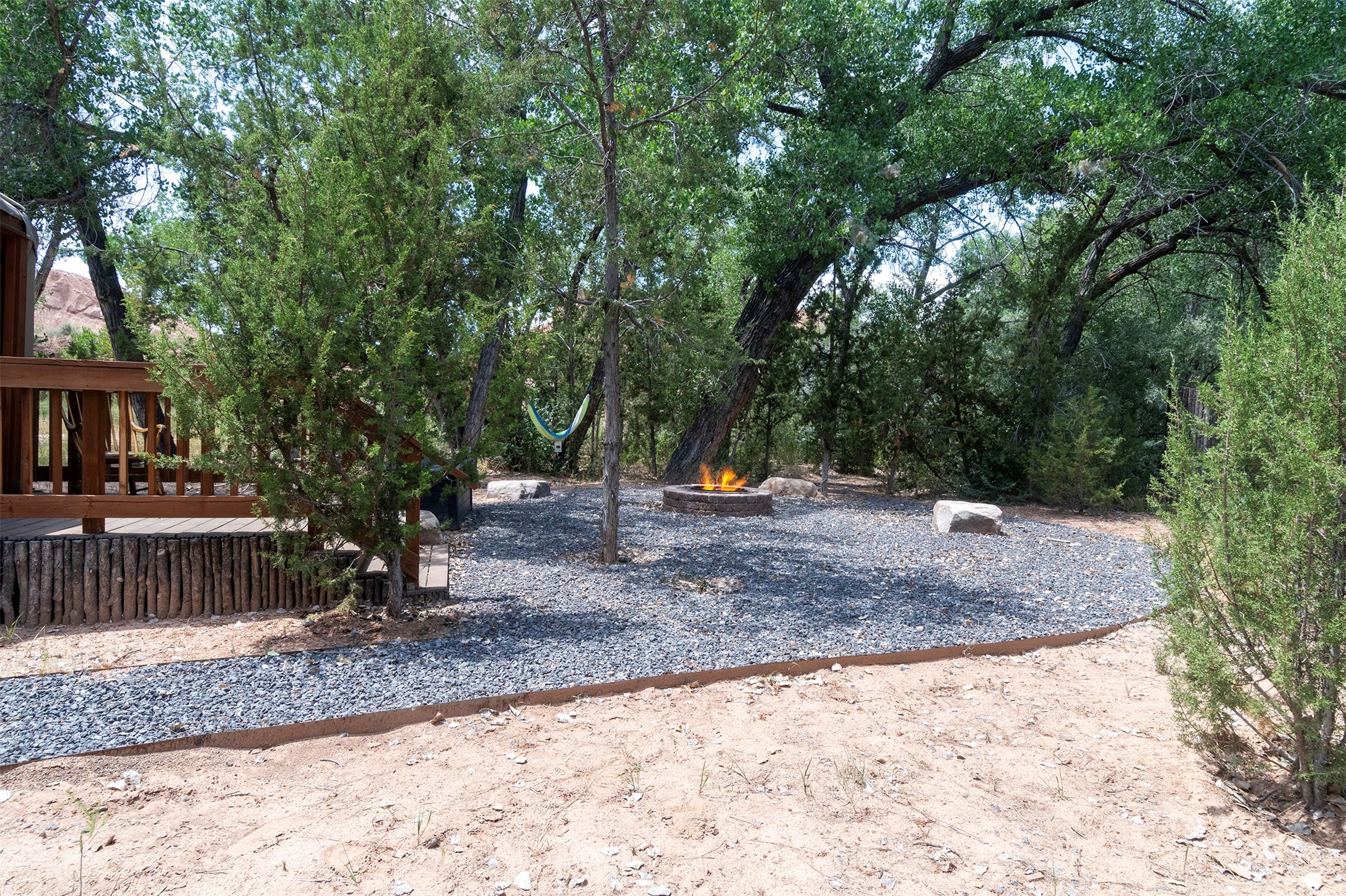 DESERT RIPARIAN DELIGHT - 2 CASITAS | 2 BATHS | 1,900 SQFT | 5.7 ACRES. Fabulously Fun Chimayo River Compound & Leisure Retreat. Welcome the natural bounty of the Chimayo river valley at this open concept modern pueblo casita compound with leisure pools and river access. Beat the heat with the soaking pool complete with waterfall grotto and lounging pad or cozy up in the winter with the hot tub or fire pit. Comprising 2 Casitas; The Pueblo Pool House Casita features a leisure pool, hot tub, waterfall grotto, outdoor shower area and beautiful stone work. The River Casitia is a finished 24' Yurt with added kitchen and bathroom on a permanent foundation next to the river featuring a fire pit area and river access trails. Each building is complete with an outdoor shower for apre l'eau - pool or river. Offering tile porcelain floors, art lighting, under cabinet lighting, 2 outdoor showers, built-in banquette with storage, dishwasher, on site laundry, electric range, insulated windows, hardwood cabinetry, and bronze hardware, Dos Casitas Compound on the River is a delightful wilderness retreat. Located on 5.7 dynamic and beautiful acres In the Chimayo Valley, 40 minutes from Historic Santa Fe and 60 from the Pueblos of Taos. Resting alongside the Santa Cruz River makes this a true oasis in the New Mexico desert. The property is plentiful with river life. Majestic cottonwoods grow alongside the river and vast views of the desert hills and mesas of northern New Mexico offer the senses peaceful imaginings. Adjacent to acres of BLM land, makes this a wonderfully secluded location at the end of a private road. Conveniently located just five mins from village stores, shopping, and not much further to nearby restaurants, historic and local attractions. Imagine this as the amazing Art Studio or Yoga Yurt of your dreams. Perfect for Investor Wilderness Spa Retreat or further Compound development. Visit today and own a piece of Northern New Mexico paradise tomorrow.