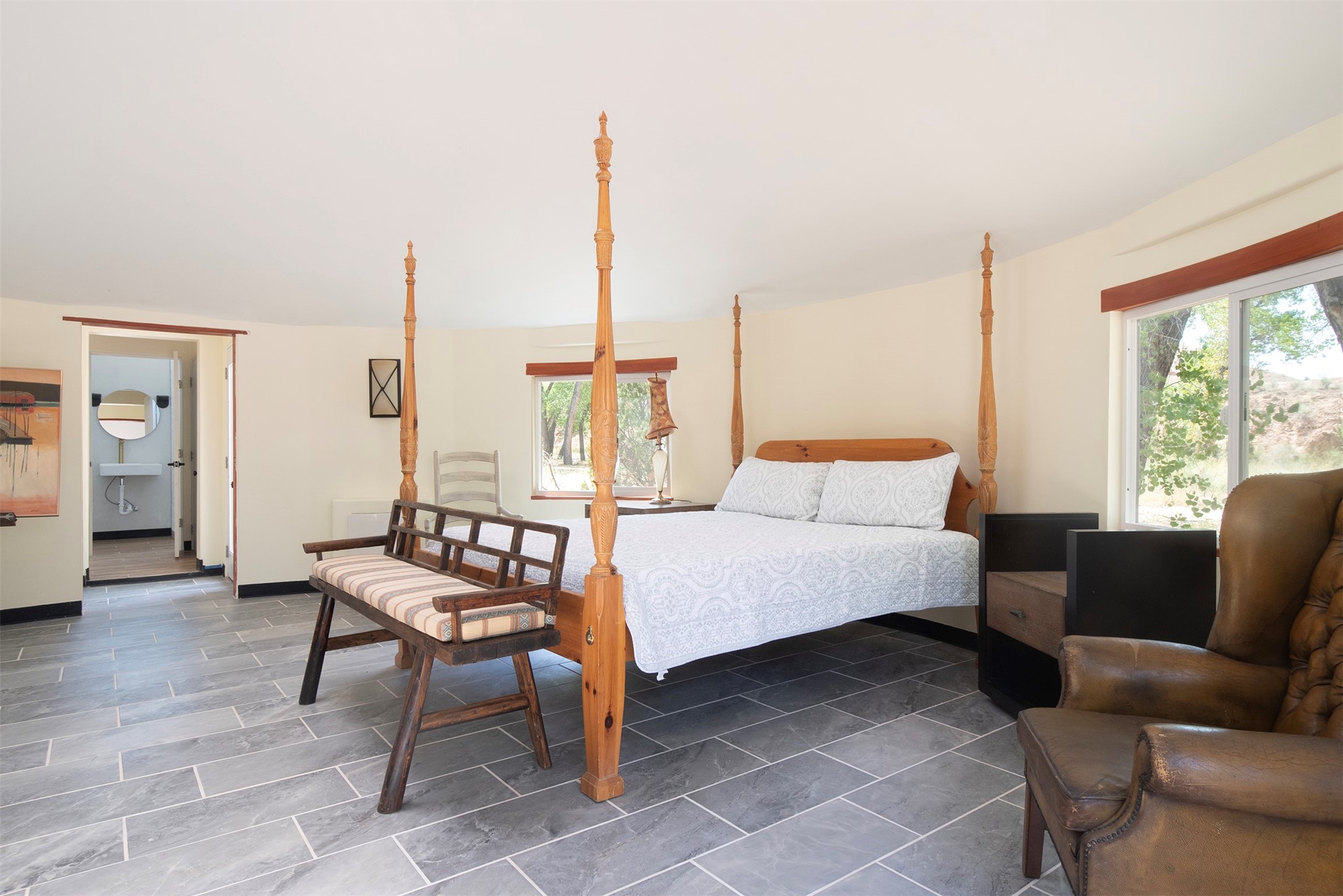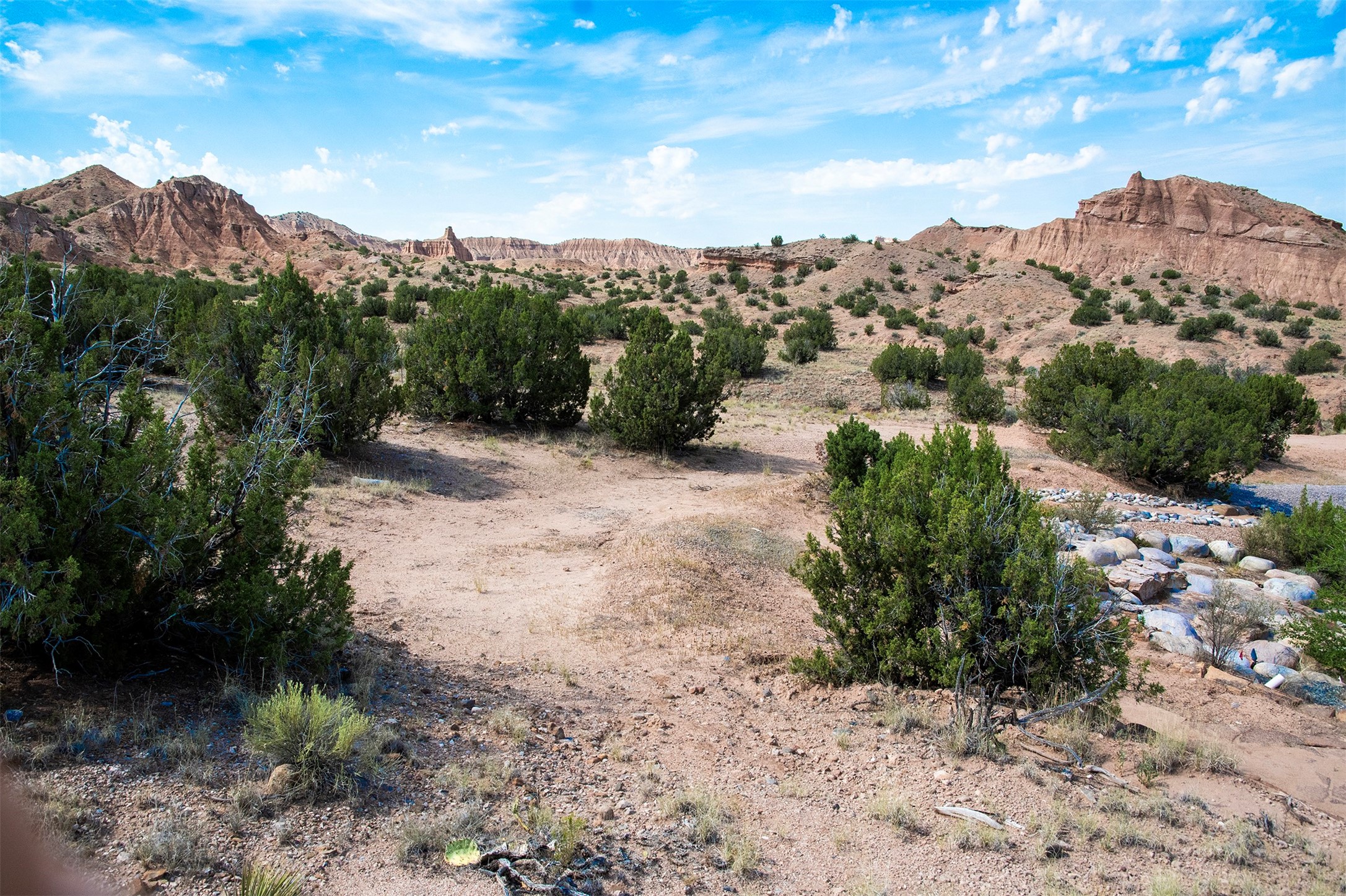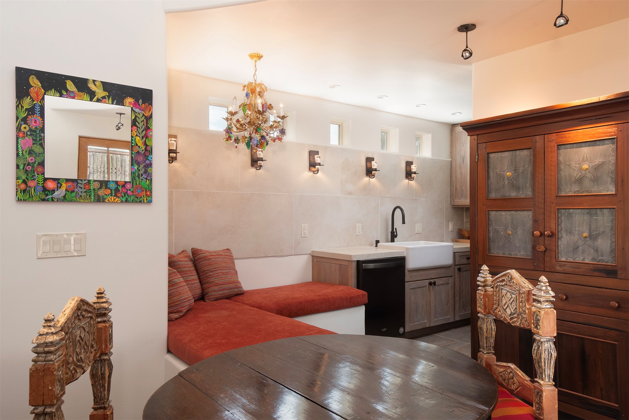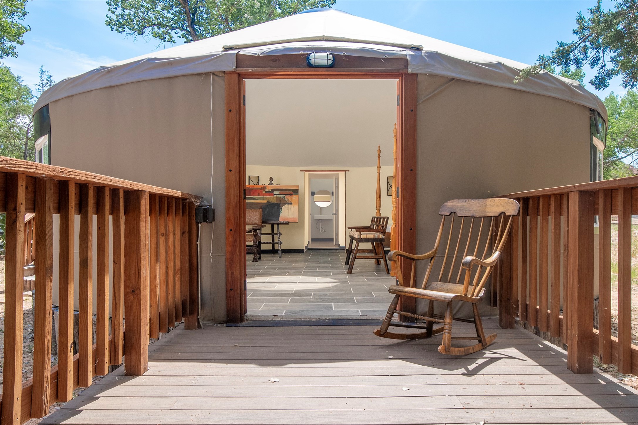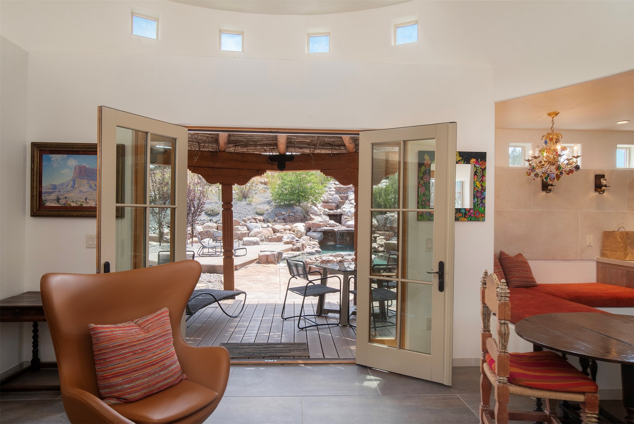 DESERT RIPARIAN DELIGHT - 2 CASITAS | 2 BATHS | 1,900 SQFT | 5.7 ACRES. Fabulously Fun Chimayo River Compound & Leisure Retreat. Welcome the natural bounty of the Chimayo river valley at this open concept modern pueblo casita compound with leisure pools and river access. Beat the heat with the soaking pool complete with waterfall grotto and lounging pad or cozy up in the winter with the hot tub or fire pit. Comprising 2 Casitas; The Pueblo Pool House Casita features a leisure pool, hot tub, waterfall grotto, outdoor shower area and beautiful stone work. The River Casitia is a finished 24' Yurt with added kitchen and bathroom on a permanent foundation next to the river featuring a fire pit area and river access trails. Each building is complete with an outdoor shower for apre l'eau - pool or river. Offering tile porcelain floors, art lighting, under cabinet lighting, 2 outdoor showers, built-in banquette with storage, dishwasher, on site laundry, electric range, insulated windows, hardwood cabinetry, and bronze hardware, Dos Casitas Compound on the River is a delightful wilderness retreat. Located on 5.7 dynamic and beautiful acres In the Chimayo Valley, 40 minutes from Historic Santa Fe and 60 from the Pueblos of Taos. Resting alongside the Santa Cruz River makes this a true oasis in the New Mexico desert. The property is plentiful with river life. Majestic cottonwoods grow alongside the river and vast views of the desert hills and mesas of northern New Mexico offer the senses peaceful imaginings. Adjacent to acres of BLM land, makes this a wonderfully secluded location at the end of a private road. Conveniently located just five mins from village stores, shopping, and not much further to nearby restaurants, historic and local attractions. Imagine this as the amazing Art Studio or Yoga Yurt of your dreams. Perfect for Investor Wilderness Spa Retreat or further Compound development. Visit today and own a piece of Northern New Mexico paradise tomorrow.