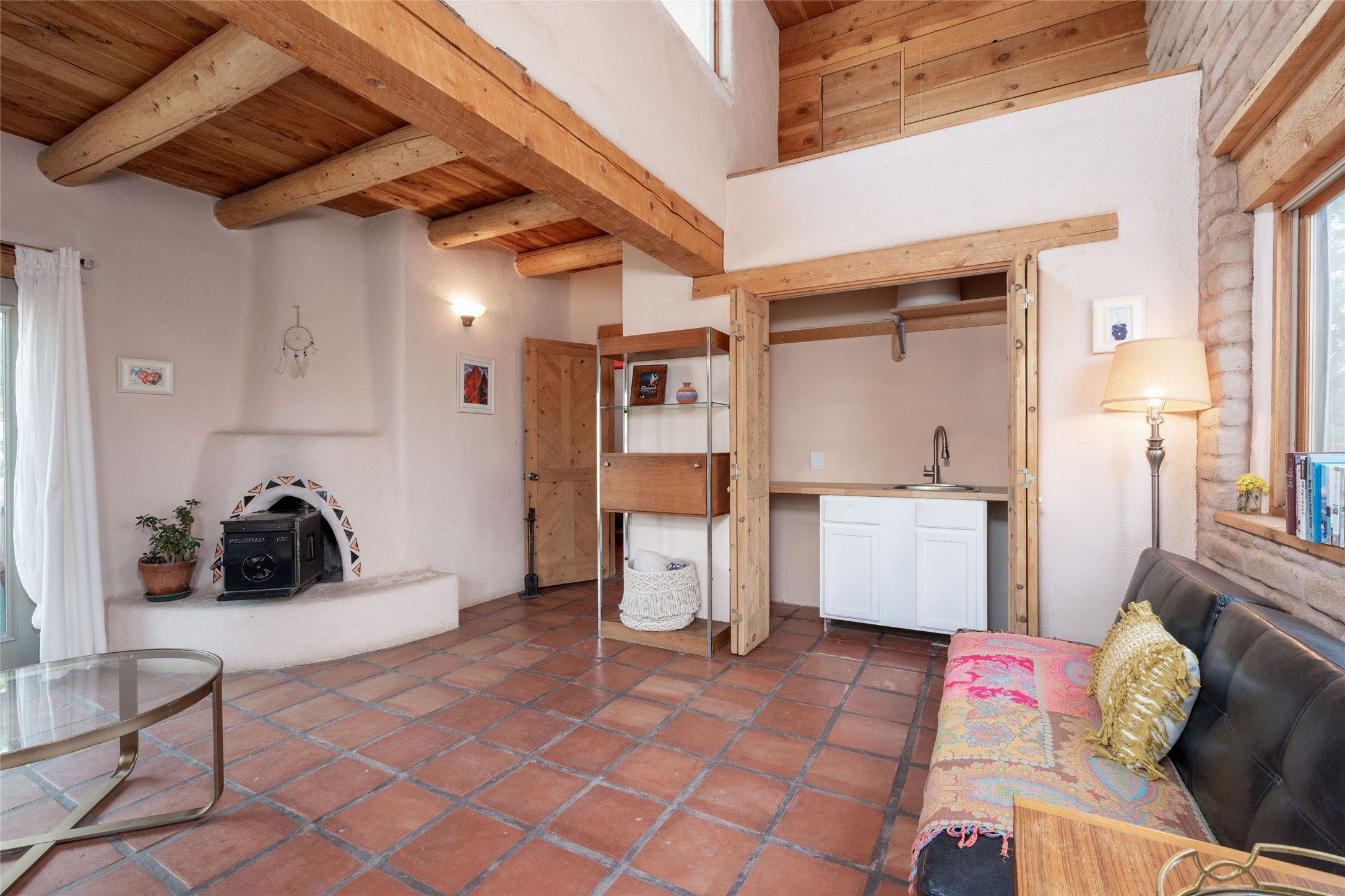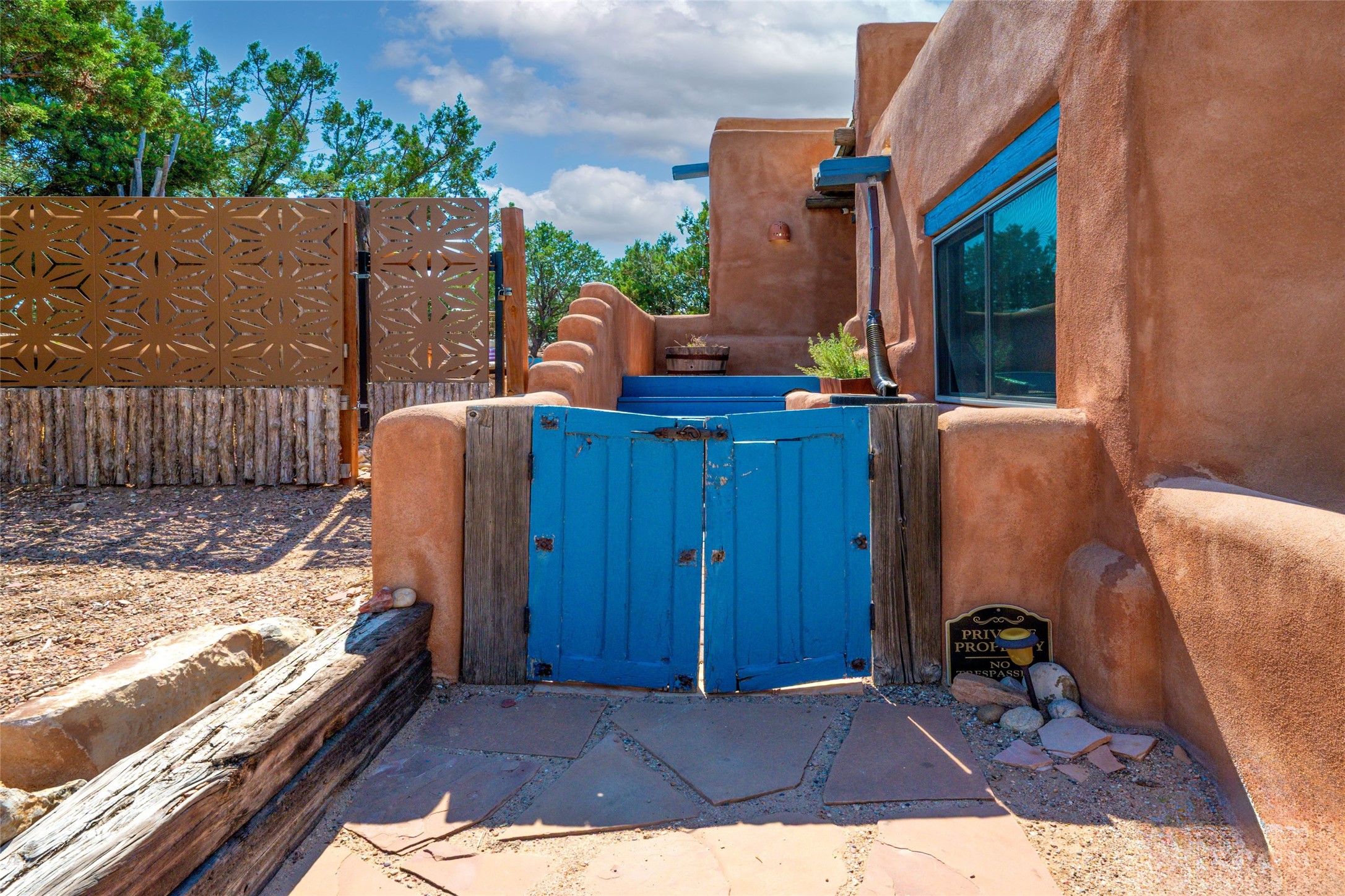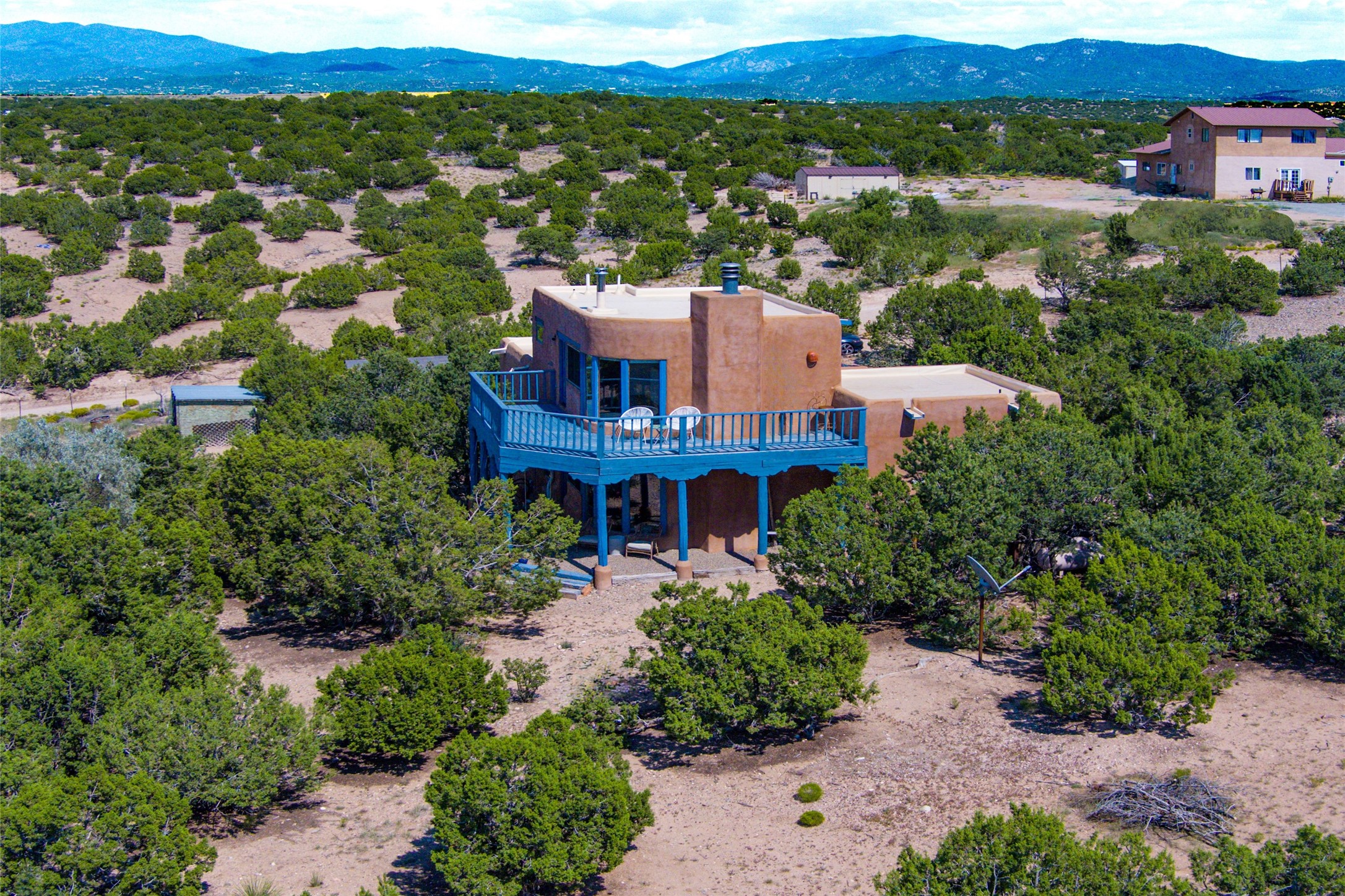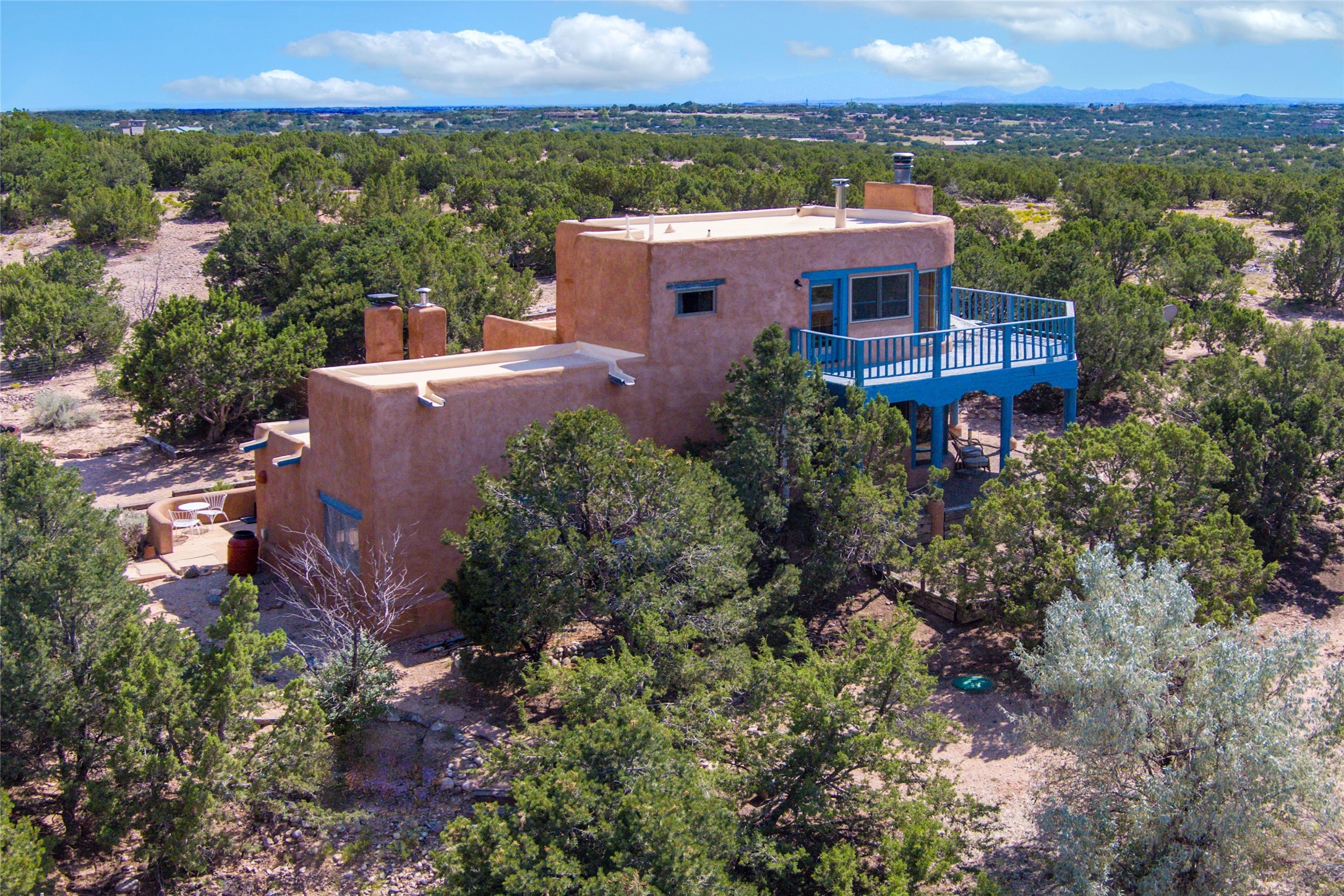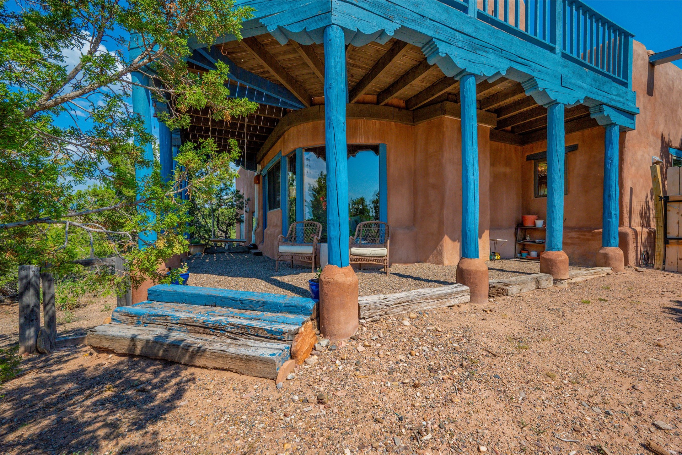 Located on 1.25 acres, a mere 4 miles from the Plaza, Casa del Sol feels like country living ten minutes from town. The Casa has 3 bedrooms and 2 full baths, ample privacy, stunning mountain views, and fantastic light. This classic Pueblo style adobe home was built by hand by artist Paul Glickman with careful attention to detail. You'll find all the classic finishes - vigas and beams, high ceilings, corbels, pretty wood doors, Saltillo tile floors, nichos and 4 fireplaces- kivas and 2 wood burning stoves. The main living areas have an open feel between kitchen, dining and living, as well as high ceilings with clerestory windows for added light and passive solar gain. The South-facing flagstone patio off the kitchen, as well as the Northwest outdoor area off the living room, are perfect for indoor and outdoor living and entertaining. A highlight of this home is the Loretto-inspired wooden spiral staircase to the second-floor primary bedroom, with custom bamboo floors, a wood-burning stove, and an ensuite bath. Outside the upstairs bedroom, a wrap-around deck makes it easy to enjoy big sunset and sunrise views. Down a few steps from the front entry is the guest bedroom, offering good separation and privacy, as well as a cozy corner kiva fireplace. The third bedroom, with its separate entry, can serve several functions: home office, guest suite, den, or studio, and has a wood stove insert in the fireplace as well as a sink. With the adobe construction and a mini split for cooling, the house stays comfortable in winter and summer. A ground-mount solar array provides a surplus of energy almost every month. The property is zoned for livestock, with space for a corral. Brand new roof fall of 2025, with 10 year transferrable warranty! This home is a special retreat, with its charm, exquisite craftsmanship, and stunning views in a tranquil, beautiful, and natural setting. Casa del Sol is one of a kind.