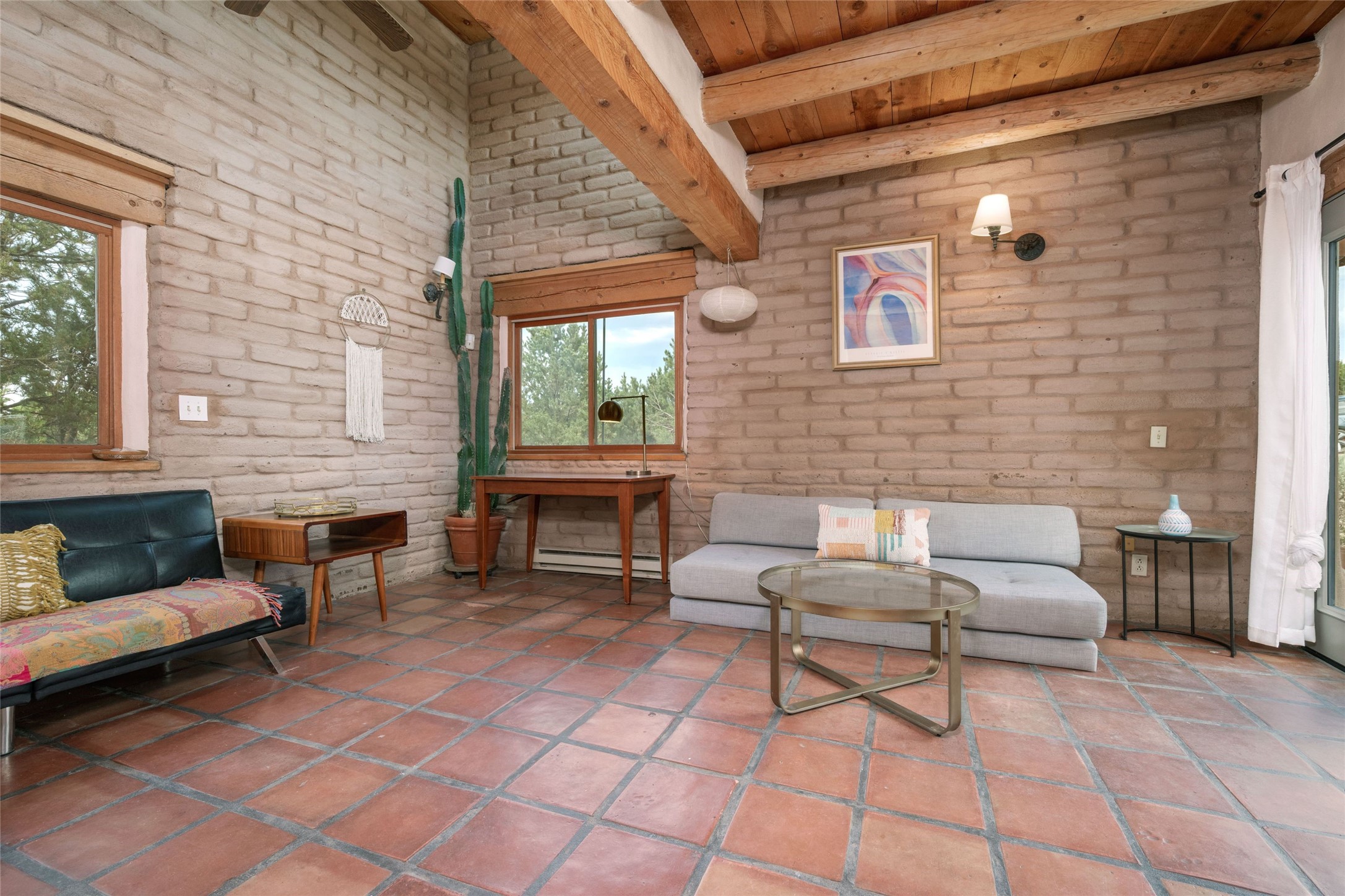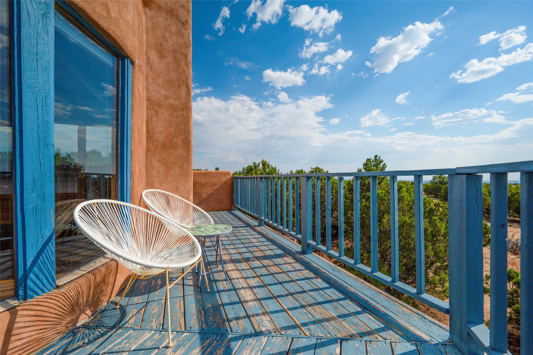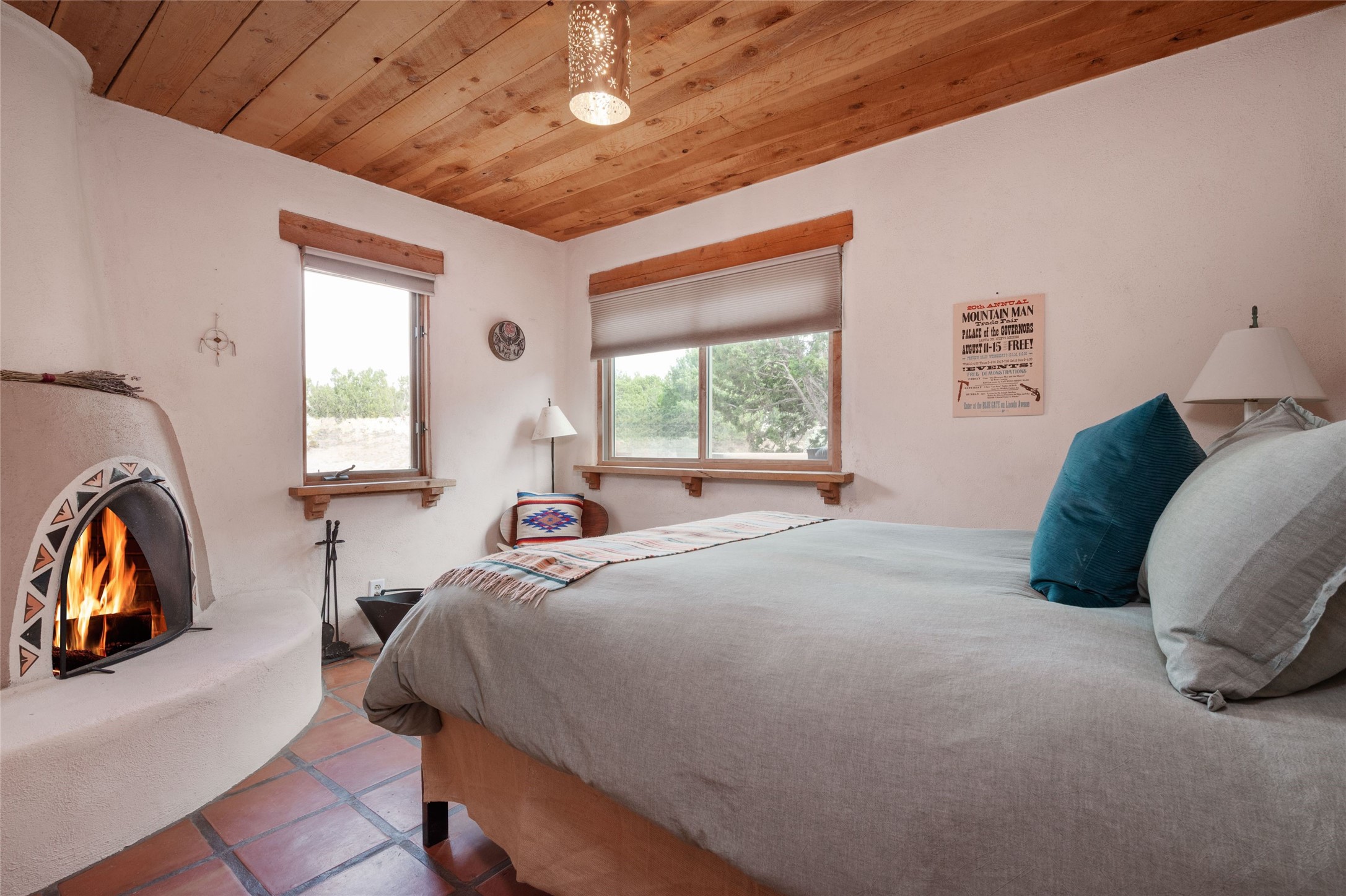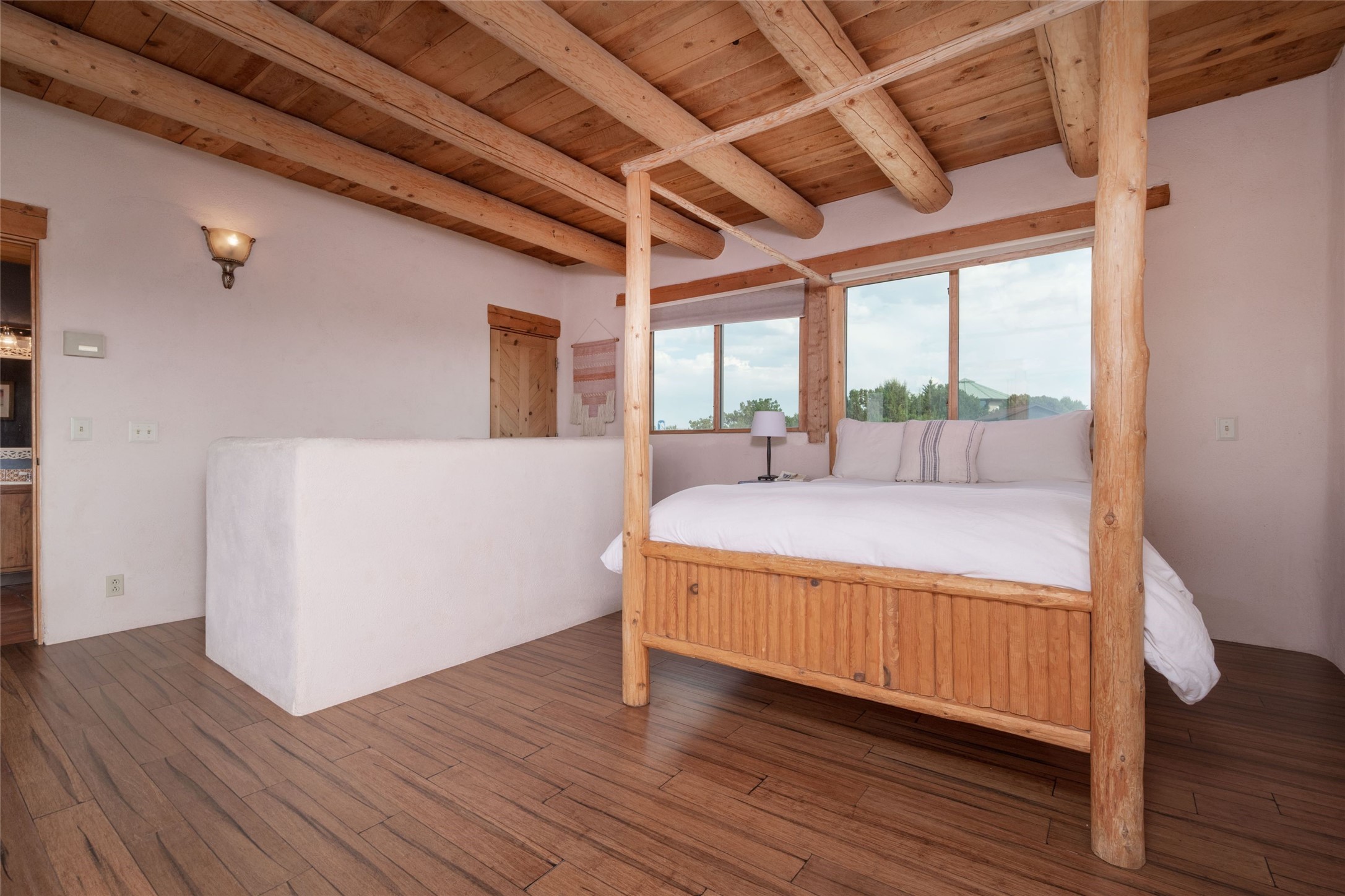 Located on 1.25 acres, a mere 4 miles from the Plaza, Casa del Sol feels like country living ten minutes from town. The Casa has 3 bedrooms and 2 full baths, ample privacy, stunning mountain views, and fantastic light. This classic Pueblo style adobe home was built by hand by artist Paul Glickman with careful attention to detail. You'll find all the classic finishes - vigas and beams, high ceilings, corbels, pretty wood doors, Saltillo tile floors, nichos and 4 fireplaces- kivas and 2 wood burning stoves. The main living areas have an open feel between kitchen, dining and living, as well as high ceilings with clerestory windows for added light and passive solar gain. The South-facing flagstone patio off the kitchen, as well as the Northwest outdoor area off the living room, are perfect for indoor and outdoor living and entertaining. A highlight of this home is the Loretto-inspired wooden spiral staircase to the second-floor primary bedroom, with custom bamboo floors, a wood-burning stove, and an ensuite bath. Outside the upstairs bedroom, a wrap-around deck makes it easy to enjoy big sunset and sunrise views. Down a few steps from the front entry is the guest bedroom, offering good separation and privacy, as well as a cozy corner kiva fireplace. The third bedroom, with its separate entry, can serve several functions: home office, guest suite, den, or studio, and has a wood stove insert in the fireplace as well as a sink. With the adobe construction and a mini split for cooling, the house stays comfortable in winter and summer. A ground-mount solar array provides a surplus of energy almost every month. The property is zoned for livestock, with space for a corral. Brand new roof fall of 2025, with 10 year transferrable warranty! This home is a special retreat, with its charm, exquisite craftsmanship, and stunning views in a tranquil, beautiful, and natural setting. Casa del Sol is one of a kind.