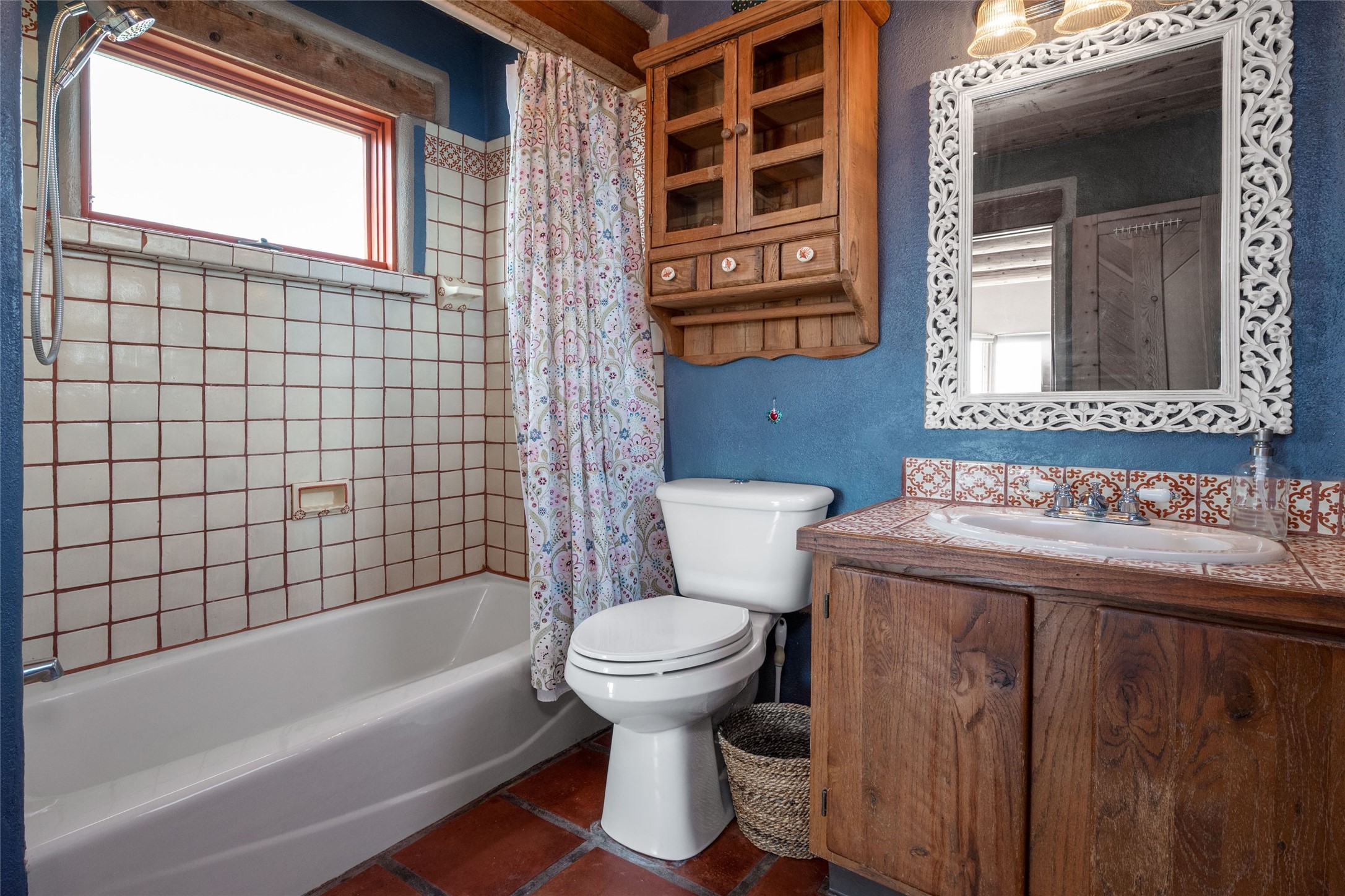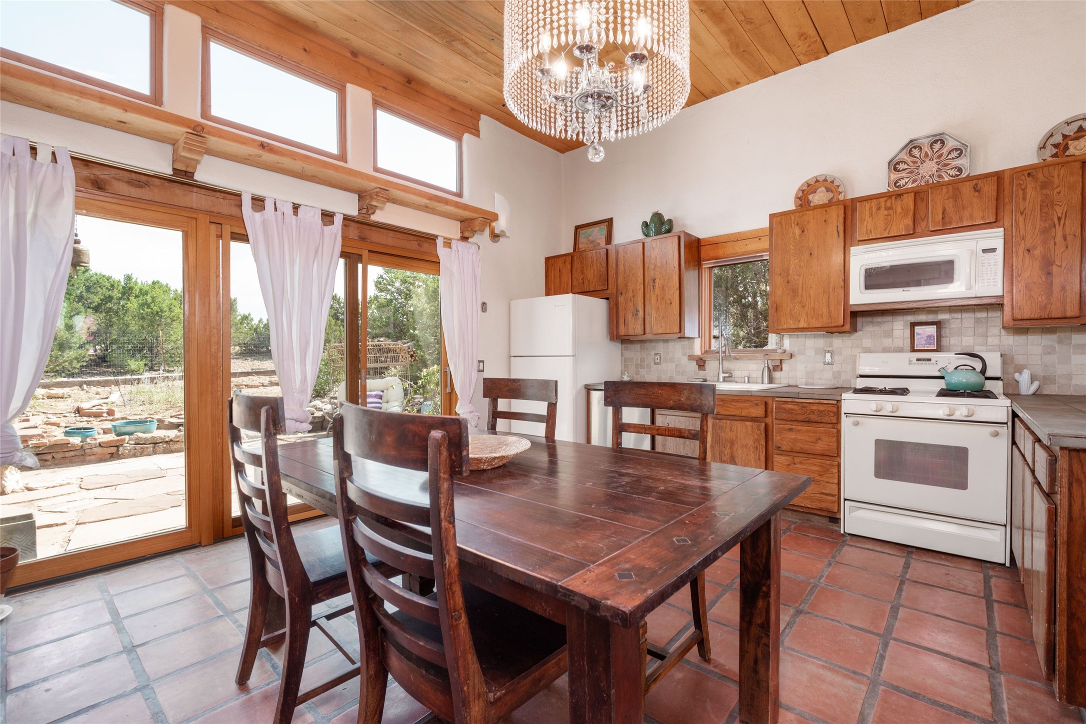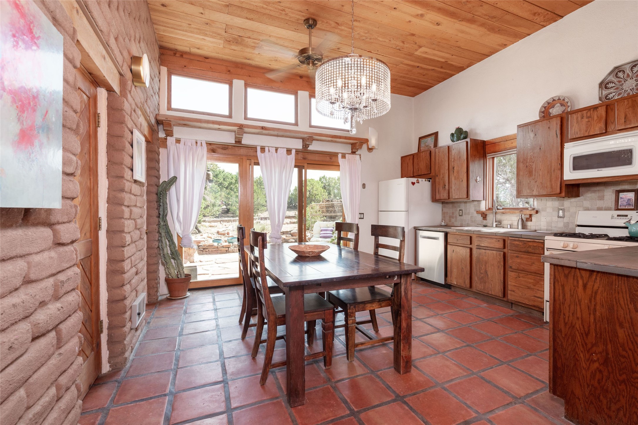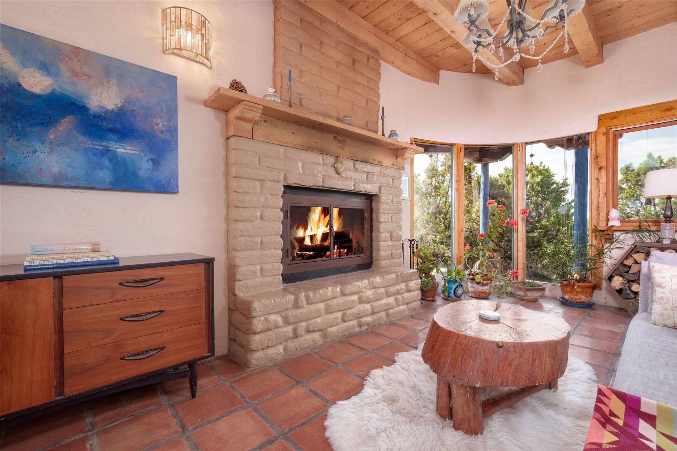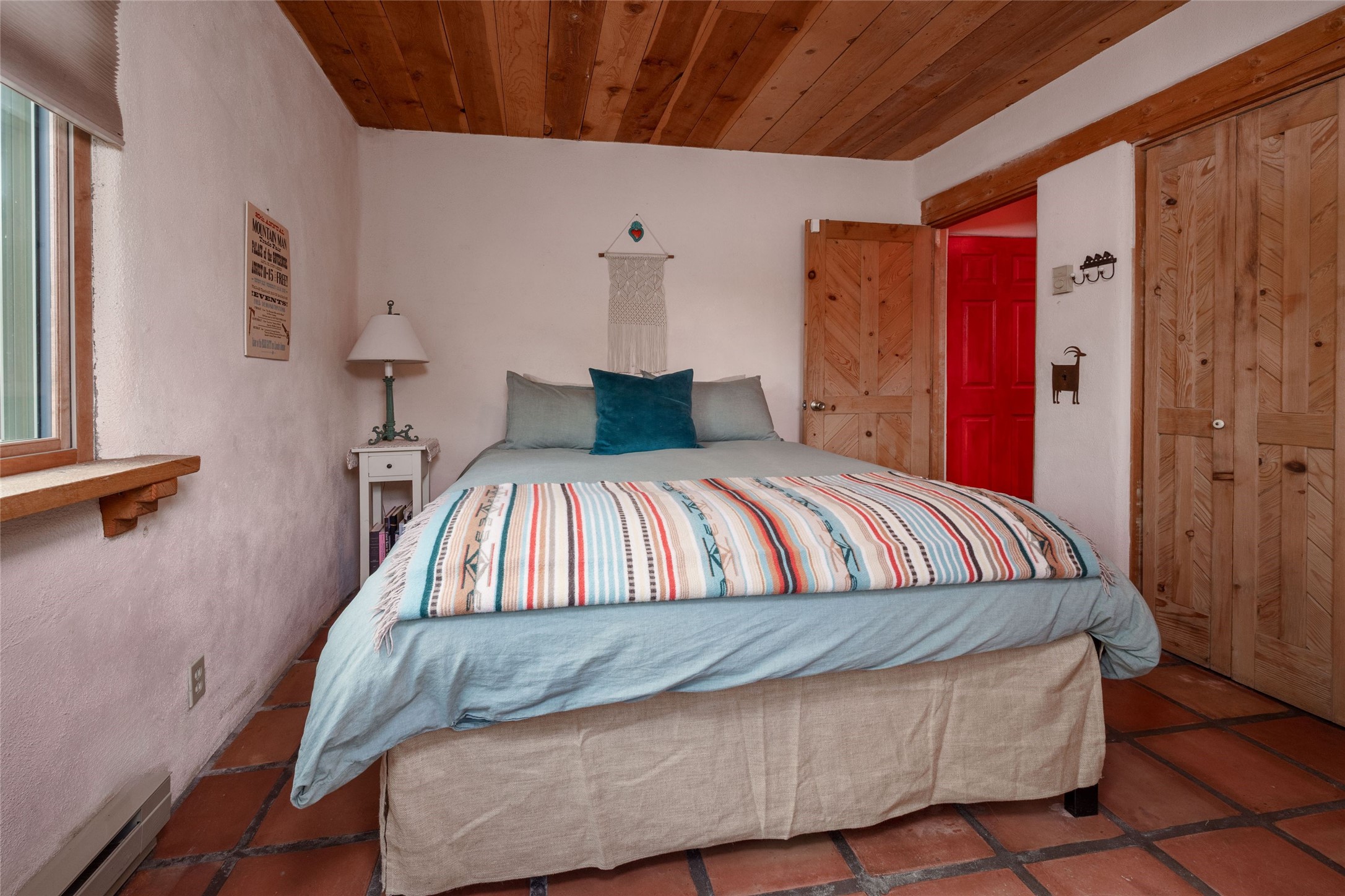 Located on 1.25 acres, a mere 4 miles from the Plaza, Casa del Sol feels like country living ten minutes from town. The Casa has 3 bedrooms and 2 full baths, ample privacy, stunning mountain views, and fantastic light. This classic Pueblo style adobe home was built by hand by artist Paul Glickman with careful attention to detail. You'll find all the classic finishes - vigas and beams, high ceilings, corbels, pretty wood doors, Saltillo tile floors, nichos and 4 fireplaces- kivas and 2 wood burning stoves. The main living areas have an open feel between kitchen, dining and living, as well as high ceilings with clerestory windows for added light and passive solar gain. The South-facing flagstone patio off the kitchen, as well as the Northwest outdoor area off the living room, are perfect for indoor and outdoor living and entertaining. A highlight of this home is the Loretto-inspired wooden spiral staircase to the second-floor primary bedroom, with custom bamboo floors, a wood-burning stove, and an ensuite bath. Outside the upstairs bedroom, a wrap-around deck makes it easy to enjoy big sunset and sunrise views. Down a few steps from the front entry is the guest bedroom, offering good separation and privacy, as well as a cozy corner kiva fireplace. The third bedroom, with its separate entry, can serve several functions: home office, guest suite, den, or studio, and has a wood stove insert in the fireplace as well as a sink. With the adobe construction and a mini split for cooling, the house stays comfortable in winter and summer. A ground-mount solar array provides a surplus of energy almost every month. The property is zoned for livestock, with space for a corral. Brand new roof fall of 2025, with 10 year transferrable warranty! This home is a special retreat, with its charm, exquisite craftsmanship, and stunning views in a tranquil, beautiful, and natural setting. Casa del Sol is one of a kind.