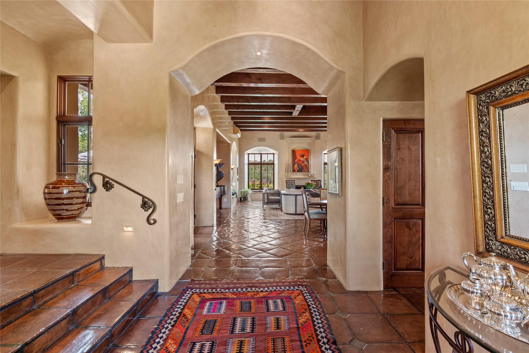 Welcome to a stunning Tesuque area compound in the prestigious gated Los Caminitos subdivision. On over 5 acres with a private well, fantastic Jemez and sunset views from main house built by Sharon Woods in 95'. The kitchen is stunning with doors to the portal with outdoor fireplace. Elegant living/dinning room surrounded on three sides by windows with upper end metal shades. Primary bedroom includes fireplace and access to rear patio. Two guest bedrooms have their own private deck with views of the Sangres. 3 car garage. Separate guest house with bath, as well as a large studio apartment and spacious studio with large north windows and new modern bathroom. Several owner upgrades including new entrance gate and septic field, new drip irrigation and pantry. Community pool and racquet courts. Lavender, roses, aspens, lilacs crab apple and peonies. 15 minutes from the plaza, adjacent to the Four Seasons resort, close to Tesuque Village Market and the world renowned Santa Fe Opera. If privacy, security and the New Mexico landscape is what you are looking for, come see.