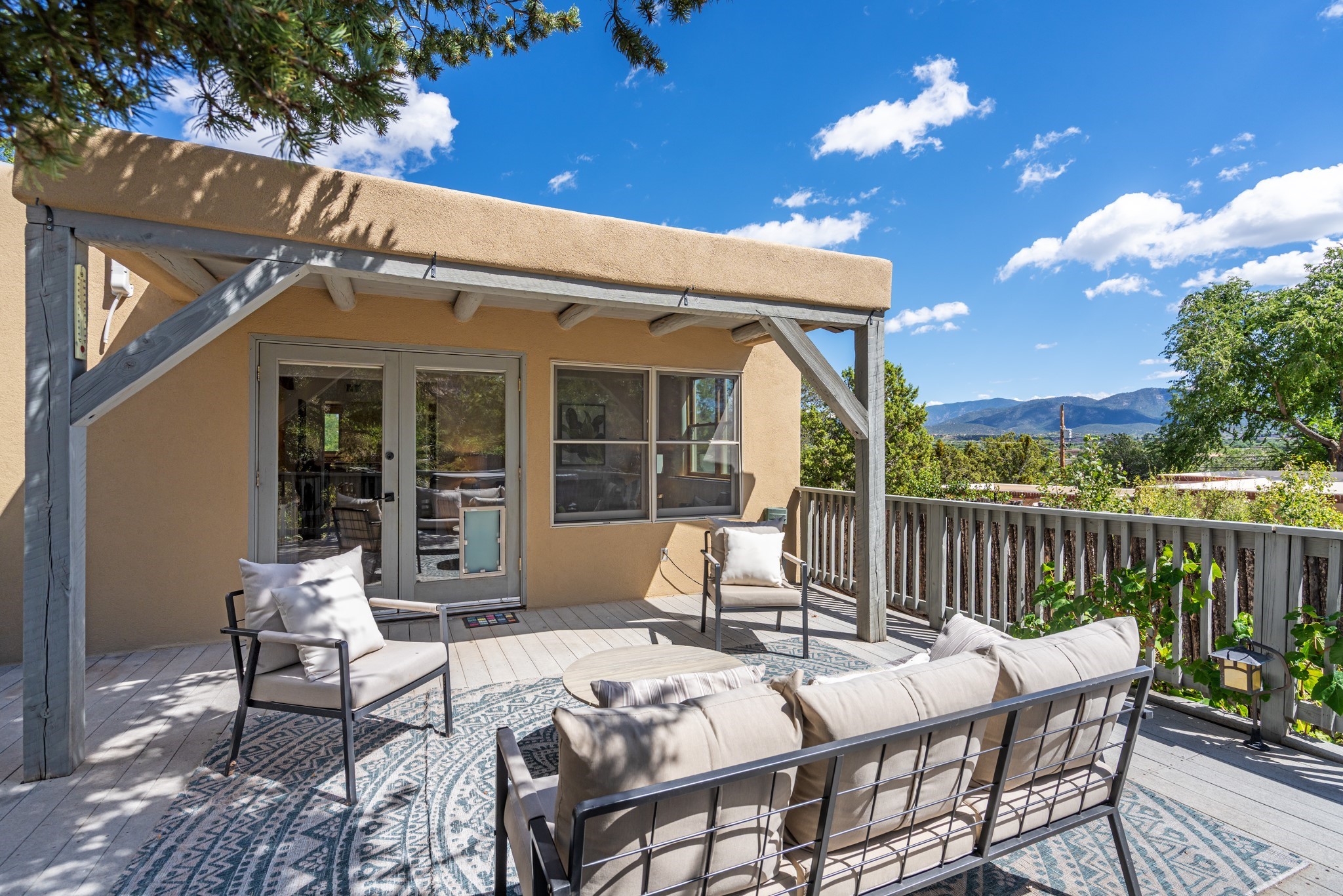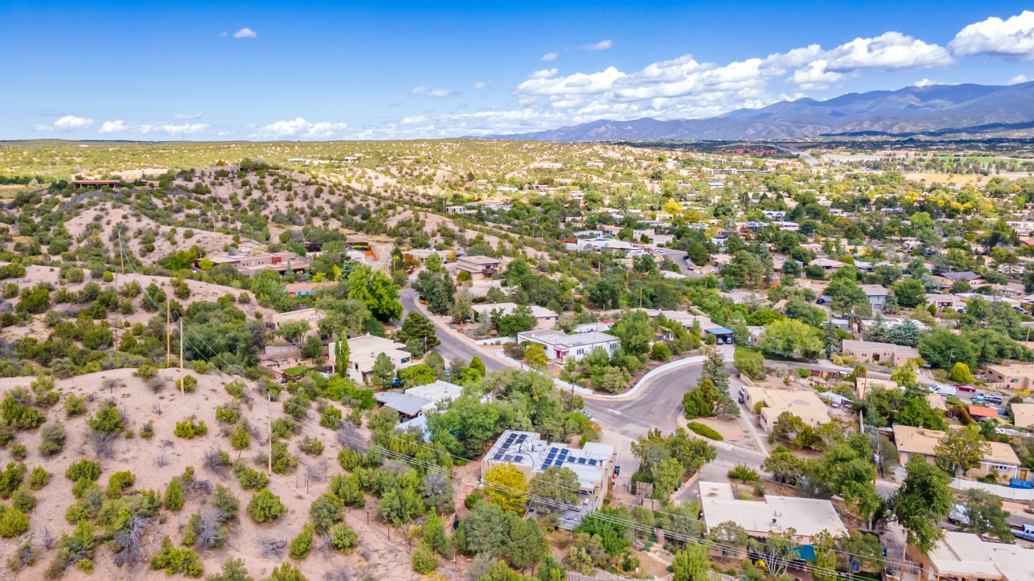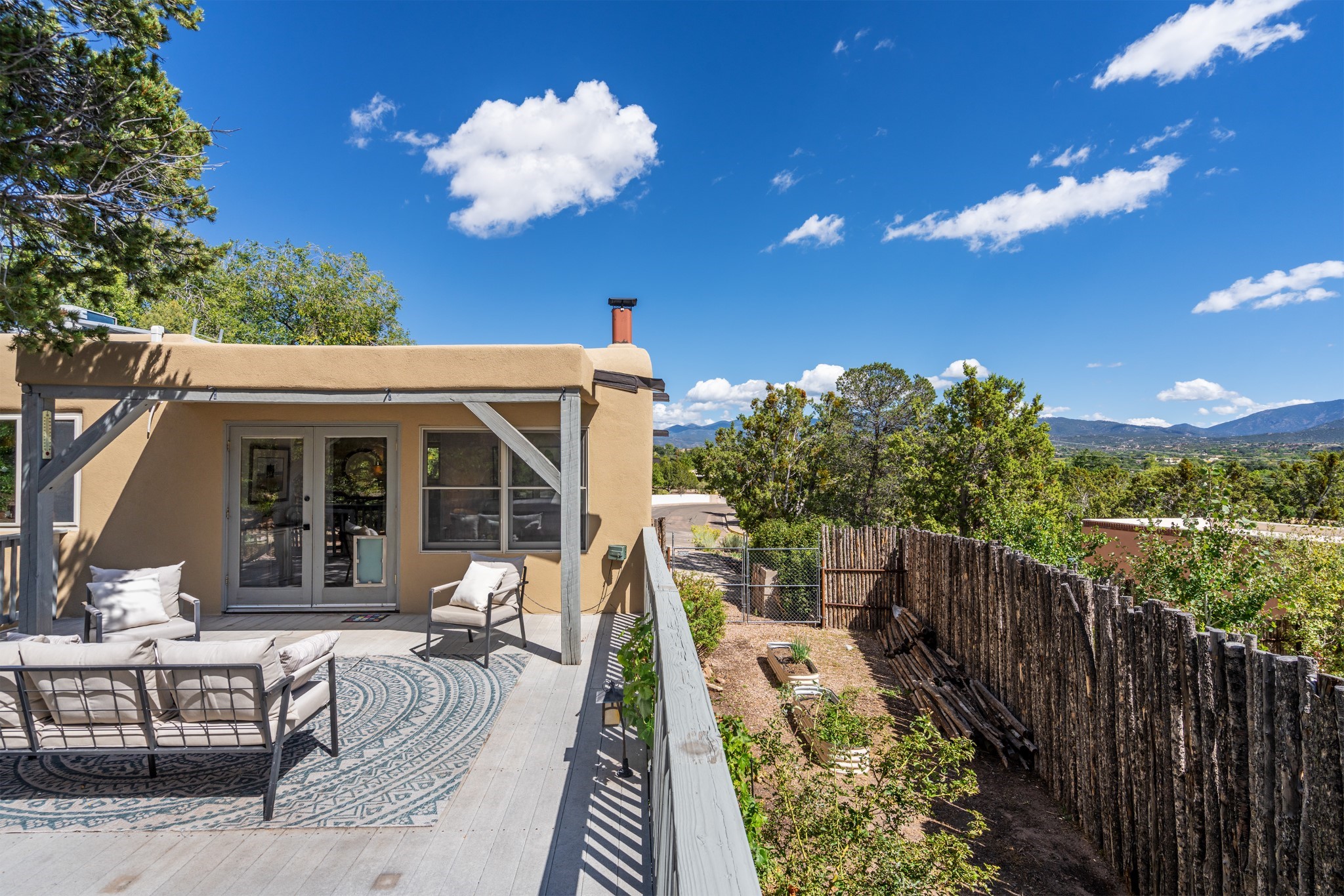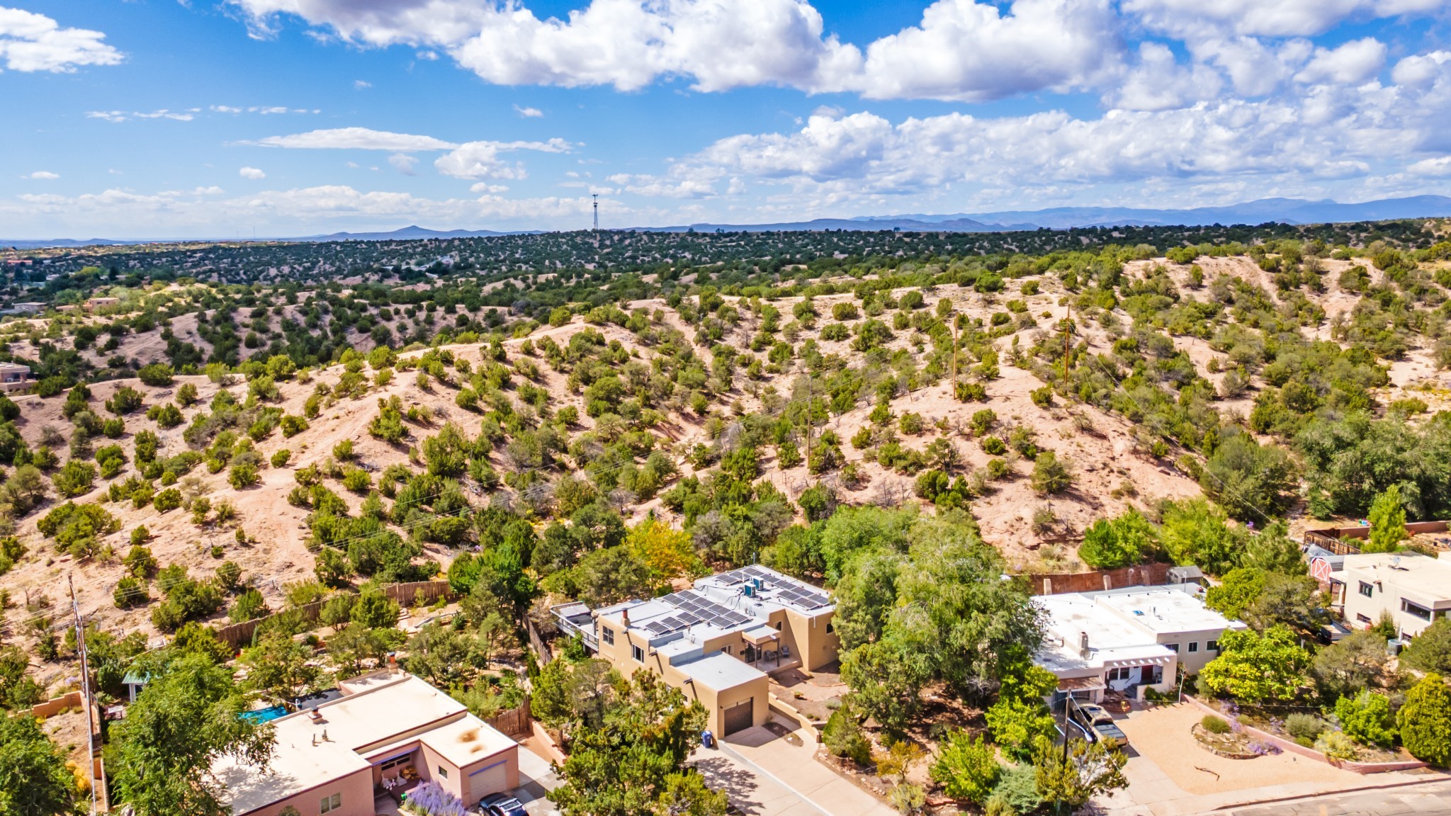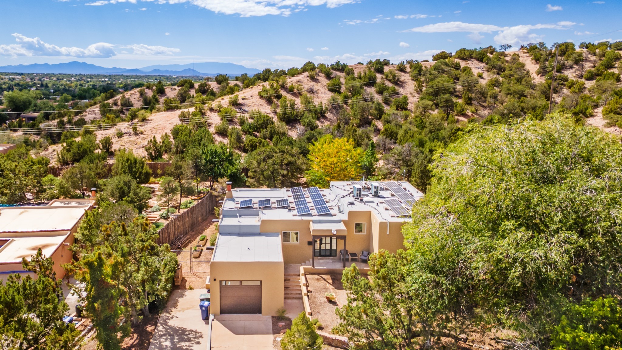 Perched above Santa Fe, this updated Casa Solana home frames mountain vistas by day and city lights by night. Backed by the Dog park and set near the end of a low-traffic street, it offers privacy just a mile to the Plaza and an easy commute to Los Alamos. Inside, nearly 1,900 square feet of light-filled living space flows seamlessly across hardwood floors with a bright, open plan. The main level includes four bedrooms and two baths, with a primary suite featuring a custom closet. French doors open to a spacious deck designed for entertaining, stargazing, or soaking in a hot tub. The finished 700+ square foot basement is a rare find in Santa Fe, offering flexible space for a media room, guest suite, gym, or studio. It connects directly to the finished, heated garage--ideal for a workshop, flex space, or even a potential casita.The quarter-acre, fully fenced backyard features a private gate that opens onto a secluded trail into one of Santa Fe's largest dog-friendly parks. Generous off-street parking provides room for multiple vehicles--bring your RV. Recent upgrades include: New 8.8 kW solar system, Mini-splits in every room, 4-year-old roof, On-demand hot water heater, High-efficiency heating system and New Stucco. This Casa Solana property offers space, flexibility, and modern updates in one of Santa Fe's most established neighborhoods.