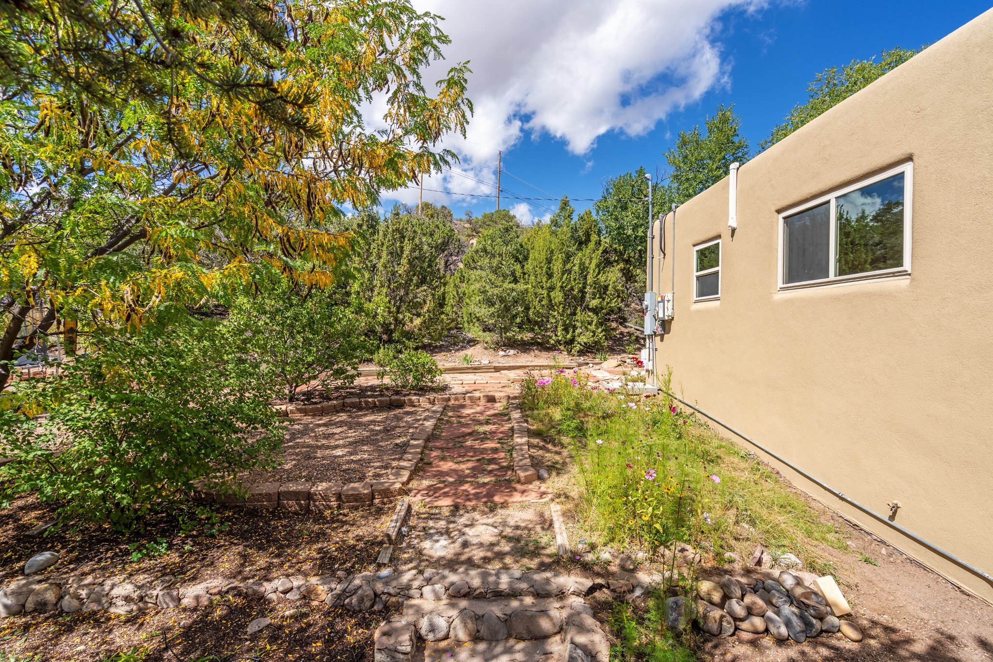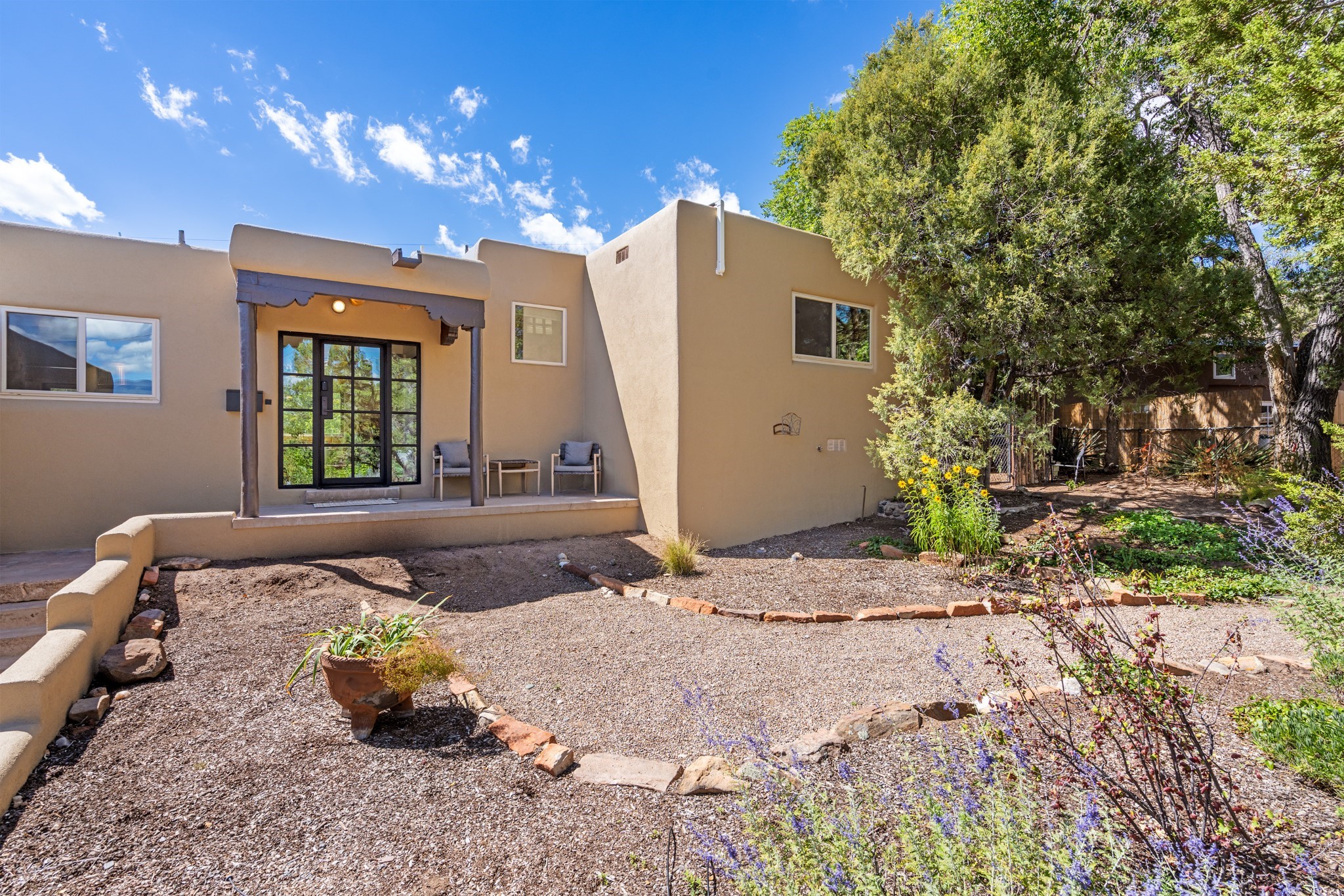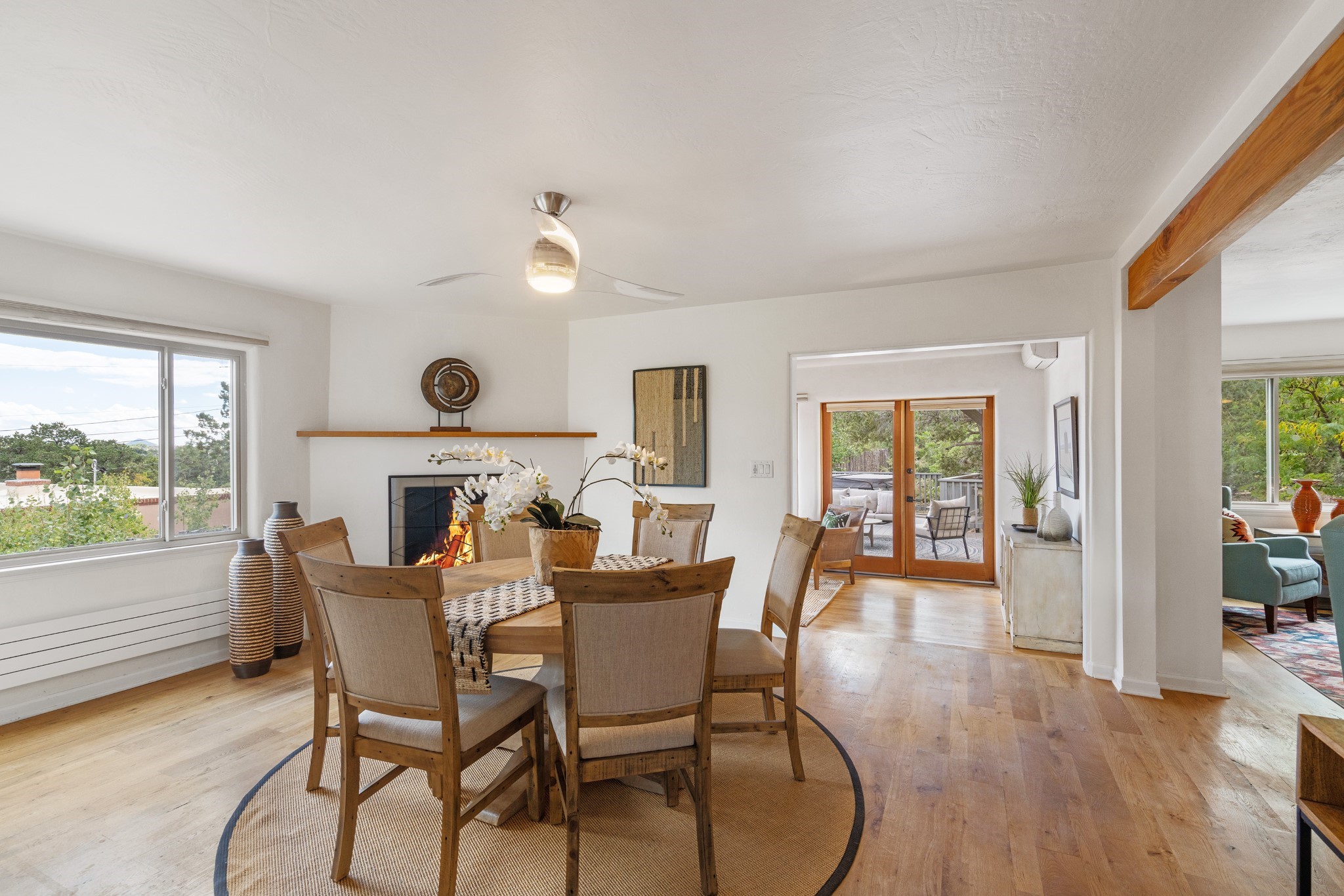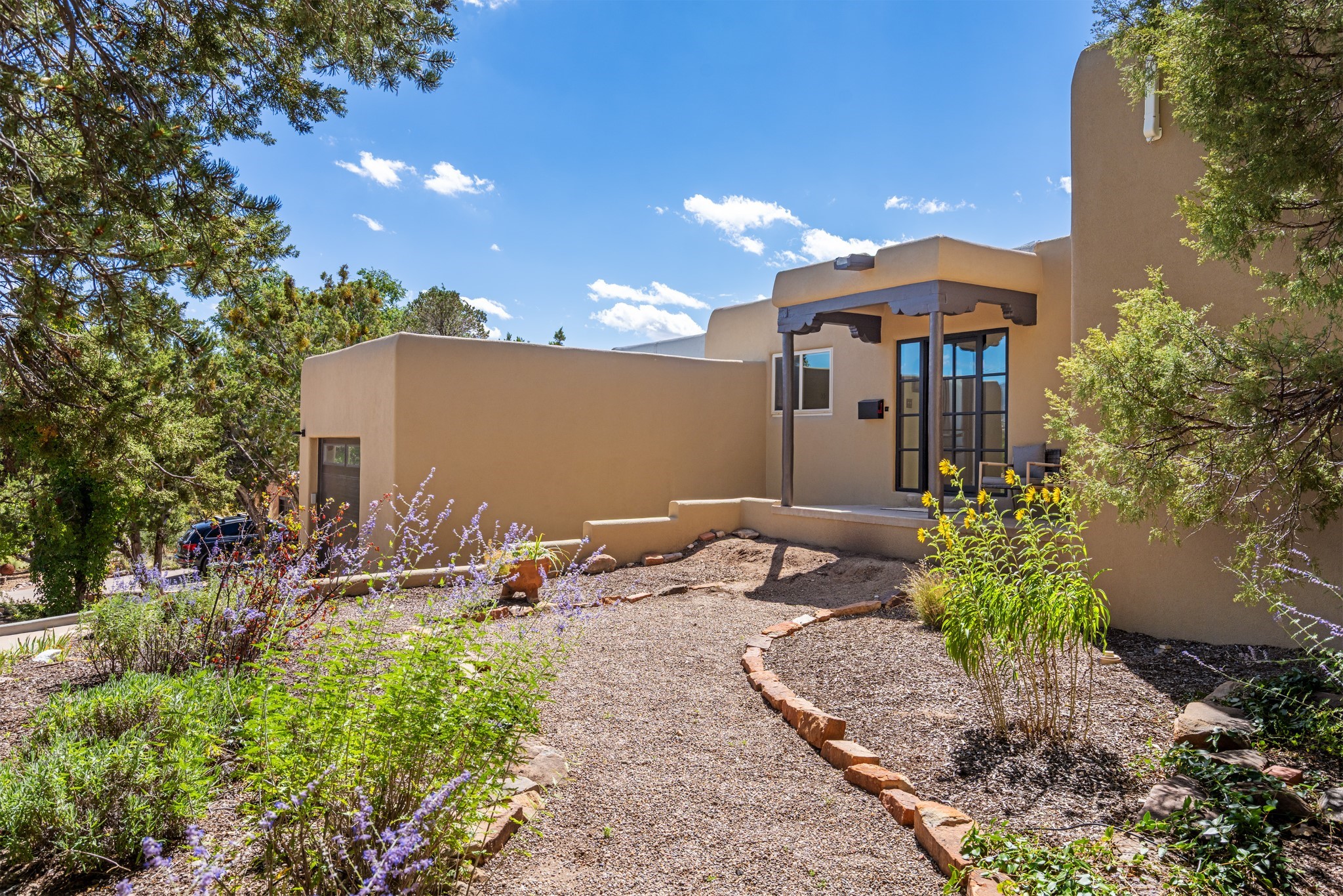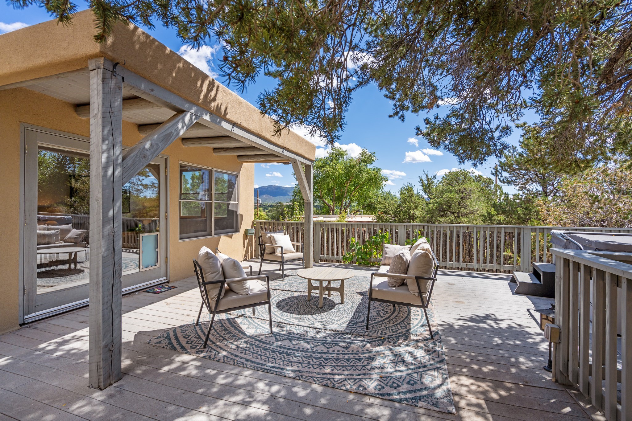 Perched above Santa Fe, this updated Casa Solana home frames mountain vistas by day and city lights by night. Backed by the Dog park and set near the end of a low-traffic street, it offers privacy just a mile to the Plaza and an easy commute to Los Alamos. Inside, nearly 1,900 square feet of light-filled living space flows seamlessly across hardwood floors with a bright, open plan. The main level includes four bedrooms and two baths, with a primary suite featuring a custom closet. French doors open to a spacious deck designed for entertaining, stargazing, or soaking in a hot tub. The finished 700+ square foot basement is a rare find in Santa Fe, offering flexible space for a media room, guest suite, gym, or studio. It connects directly to the finished, heated garage--ideal for a workshop, flex space, or even a potential casita.The quarter-acre, fully fenced backyard features a private gate that opens onto a secluded trail into one of Santa Fe's largest dog-friendly parks. Generous off-street parking provides room for multiple vehicles--bring your RV. Recent upgrades include: New 8.8 kW solar system, Mini-splits in every room, 4-year-old roof, On-demand hot water heater, High-efficiency heating system and New Stucco. This Casa Solana property offers space, flexibility, and modern updates in one of Santa Fe's most established neighborhoods.