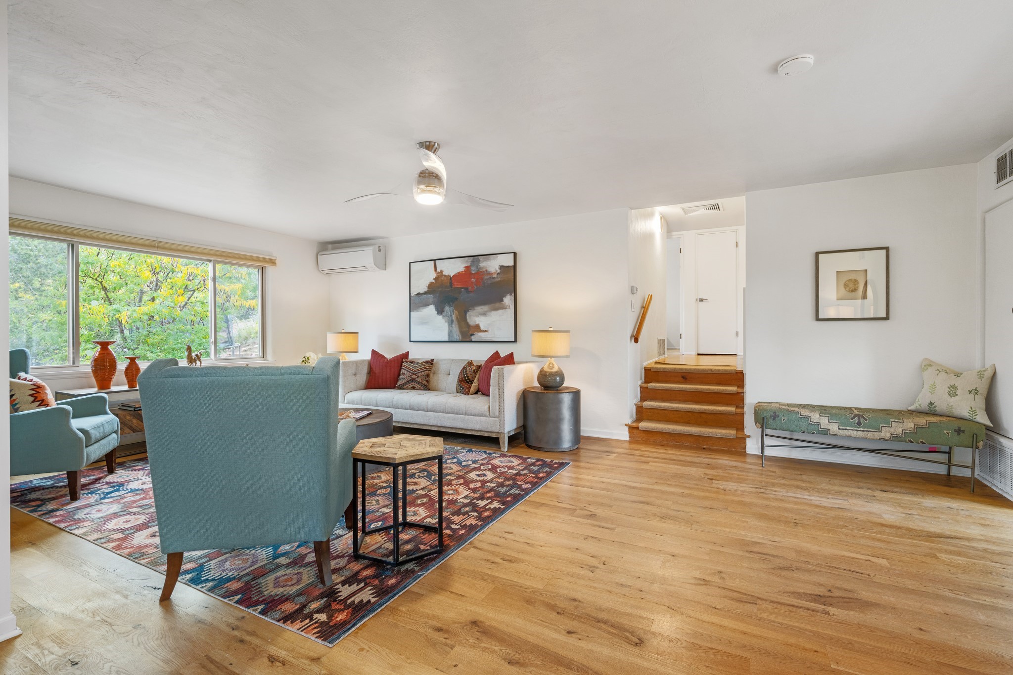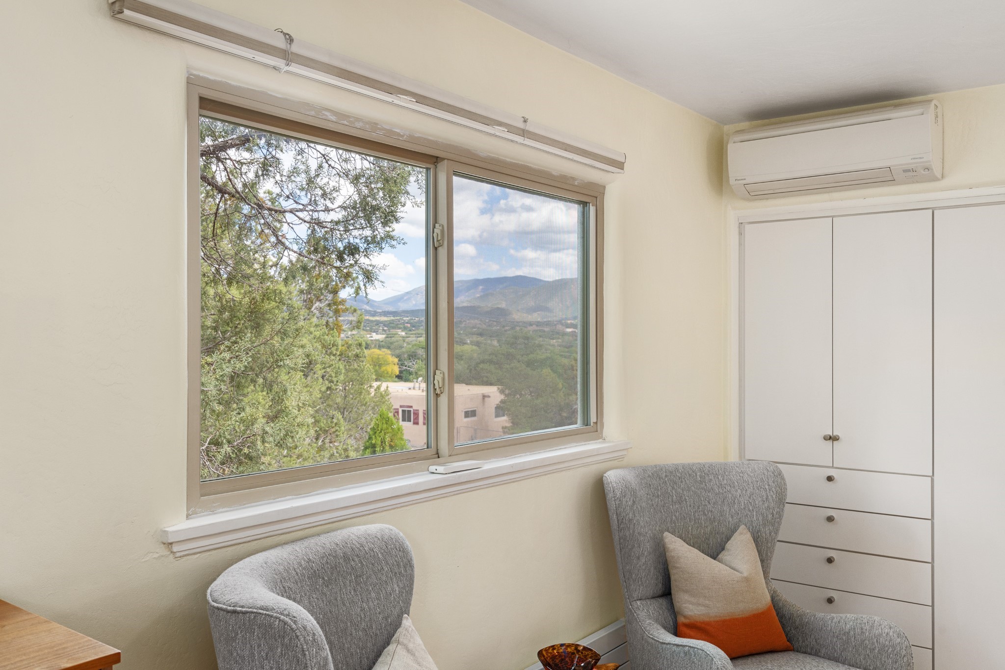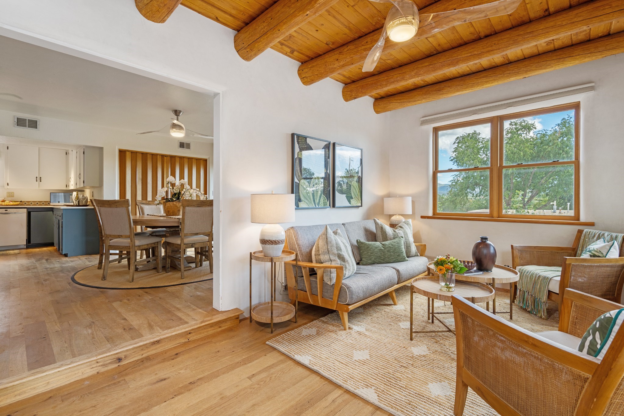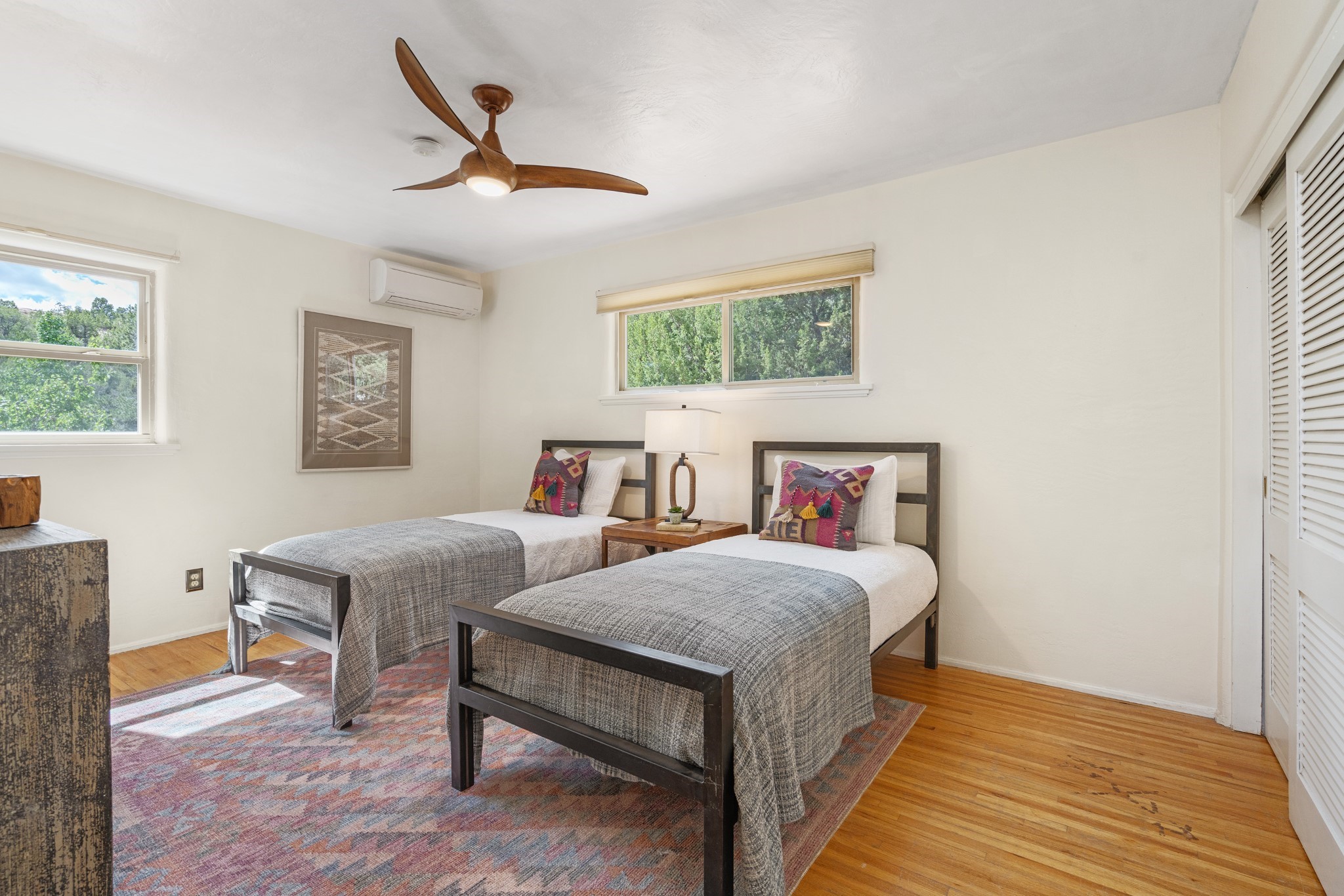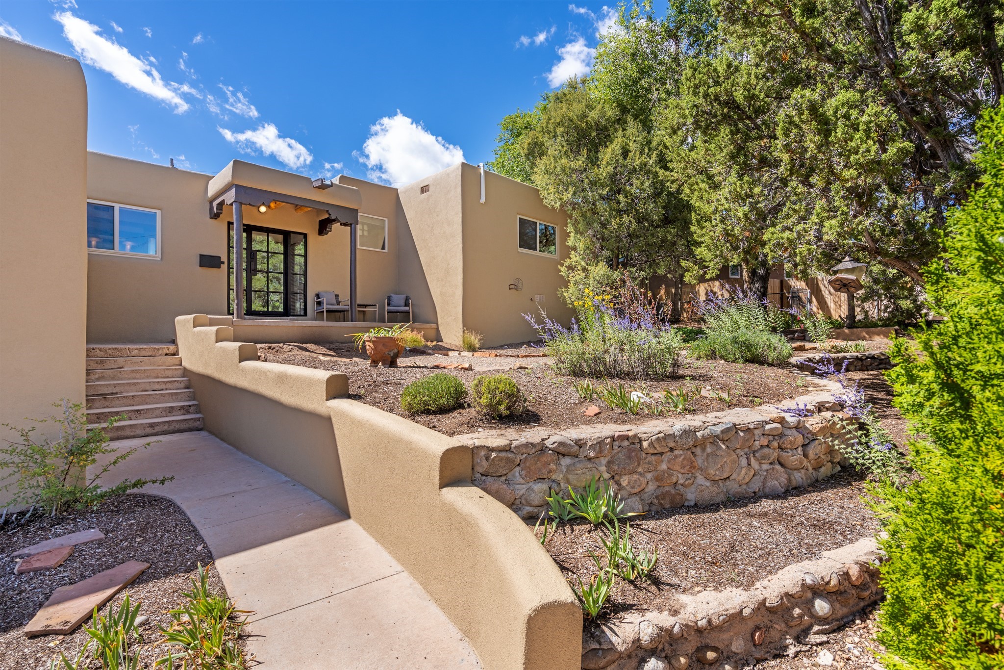 Perched above Santa Fe, this updated Casa Solana home frames mountain vistas by day and city lights by night. Backed by the Dog park and set near the end of a low-traffic street, it offers privacy just a mile to the Plaza and an easy commute to Los Alamos. Inside, nearly 1,900 square feet of light-filled living space flows seamlessly across hardwood floors with a bright, open plan. The main level includes four bedrooms and two baths, with a primary suite featuring a custom closet. French doors open to a spacious deck designed for entertaining, stargazing, or soaking in a hot tub. The finished 700+ square foot basement is a rare find in Santa Fe, offering flexible space for a media room, guest suite, gym, or studio. It connects directly to the finished, heated garage--ideal for a workshop, flex space, or even a potential casita.The quarter-acre, fully fenced backyard features a private gate that opens onto a secluded trail into one of Santa Fe's largest dog-friendly parks. Generous off-street parking provides room for multiple vehicles--bring your RV. Recent upgrades include: New 8.8 kW solar system, Mini-splits in every room, 4-year-old roof, On-demand hot water heater, High-efficiency heating system and New Stucco. This Casa Solana property offers space, flexibility, and modern updates in one of Santa Fe's most established neighborhoods.