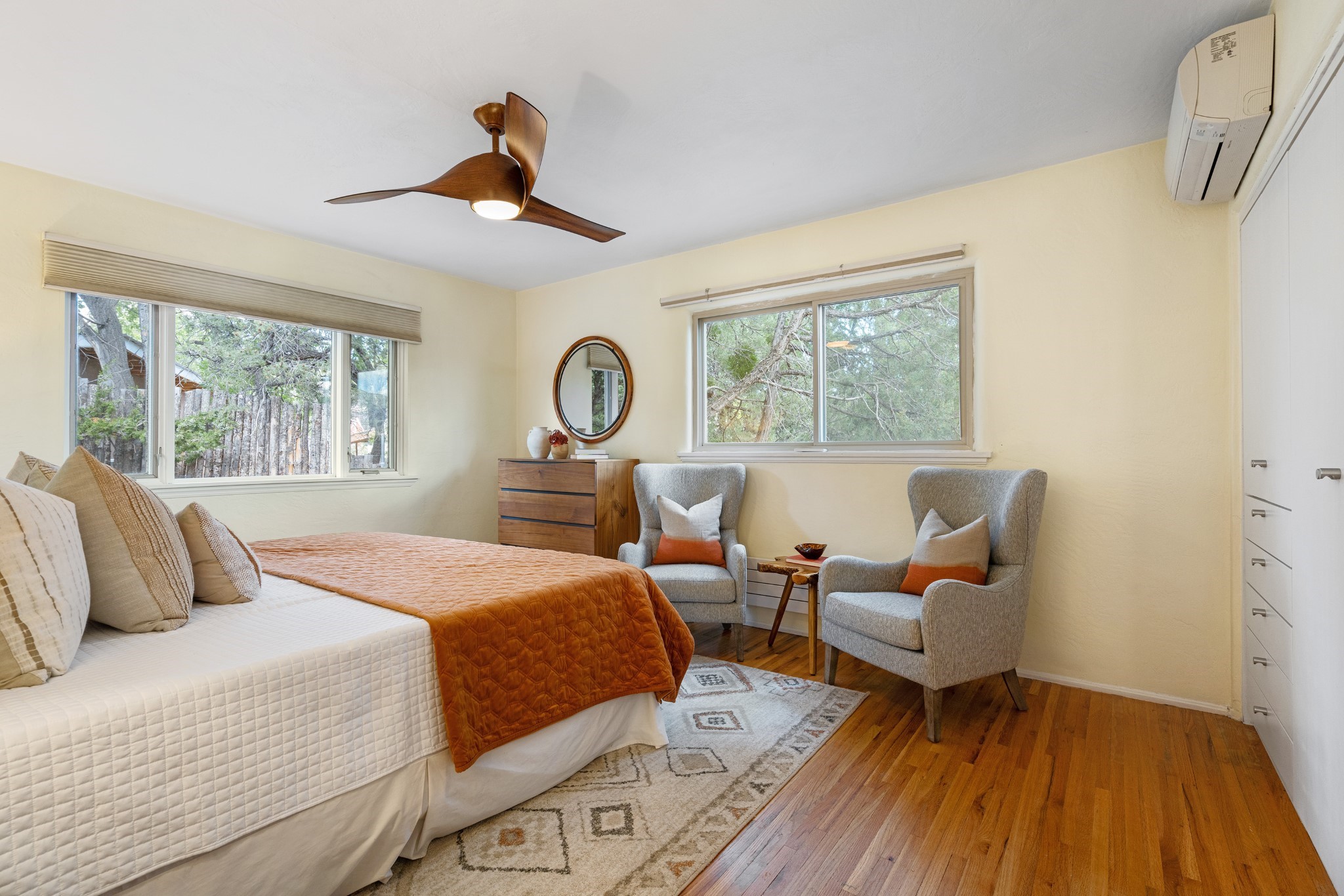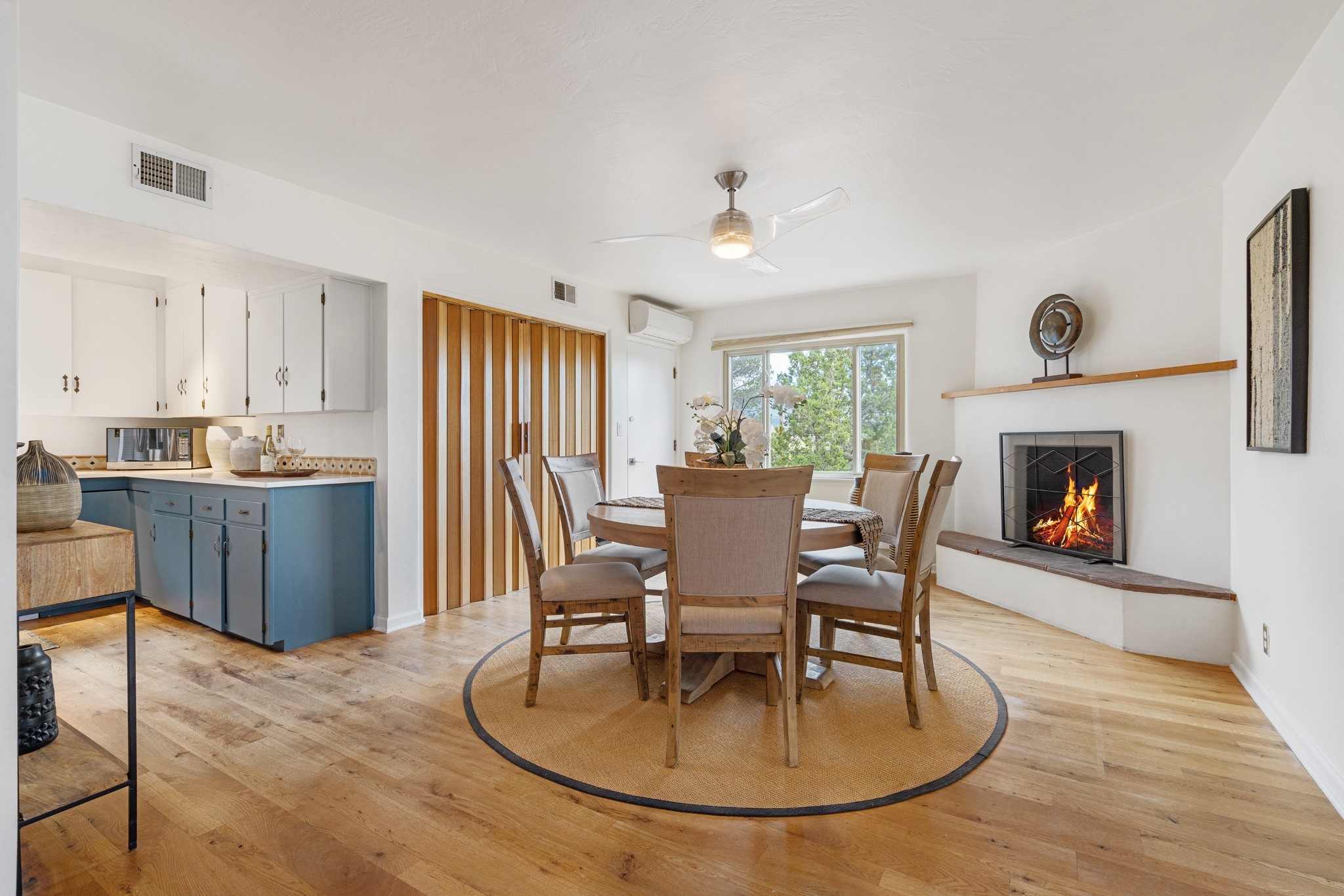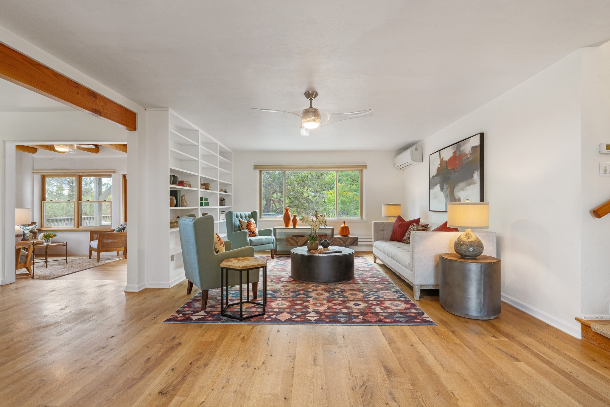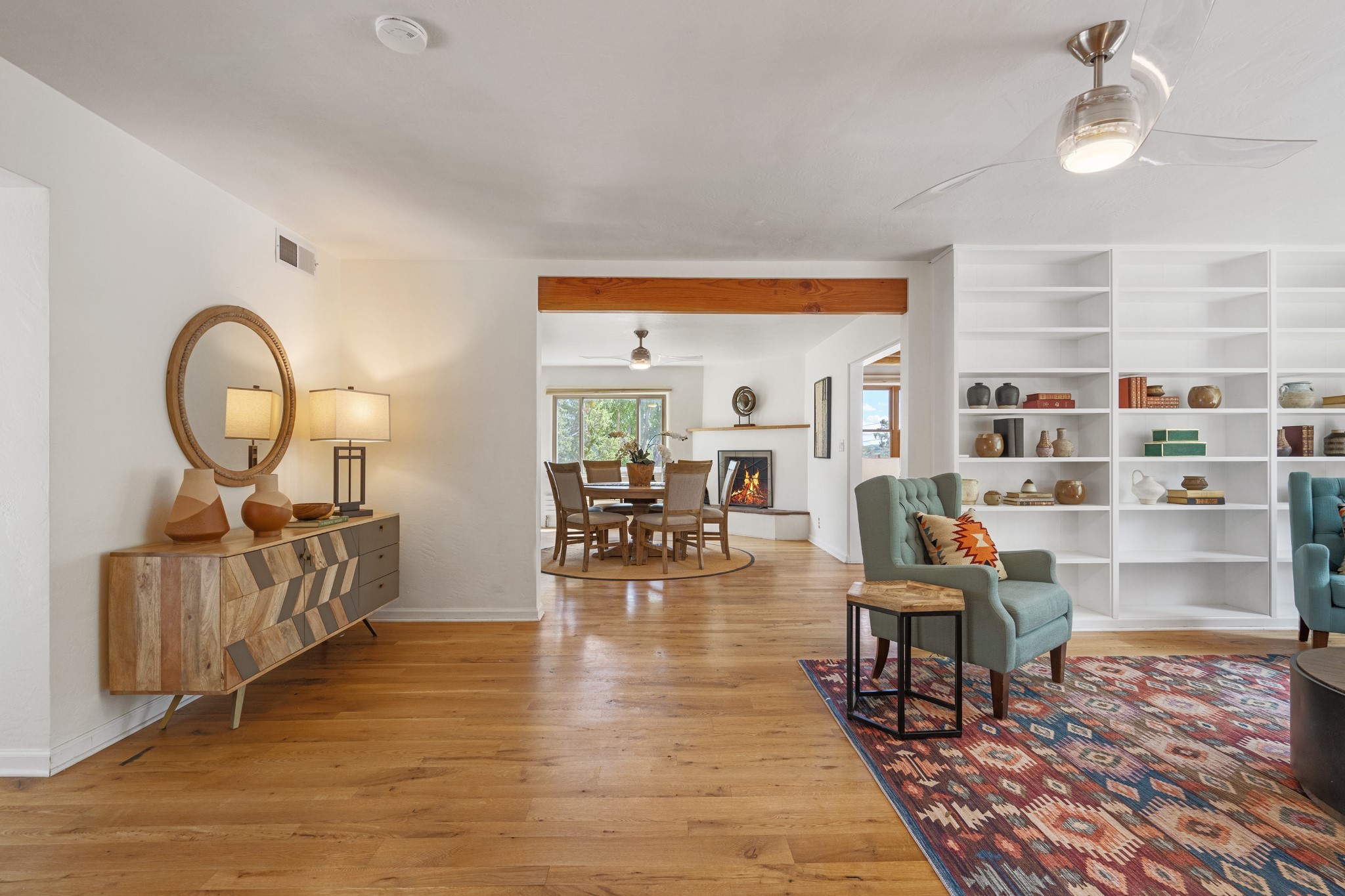 Perched above Santa Fe, this updated Casa Solana home frames mountain vistas by day and city lights by night. Backed by the Dog park and set near the end of a low-traffic street, it offers privacy just a mile to the Plaza and an easy commute to Los Alamos. Inside, nearly 1,900 square feet of light-filled living space flows seamlessly across hardwood floors with a bright, open plan. The main level includes four bedrooms and two baths, with a primary suite featuring a custom closet. French doors open to a spacious deck designed for entertaining, stargazing, or soaking in a hot tub. The finished 700+ square foot basement is a rare find in Santa Fe, offering flexible space for a media room, guest suite, gym, or studio. It connects directly to the finished, heated garage--ideal for a workshop, flex space, or even a potential casita.The quarter-acre, fully fenced backyard features a private gate that opens onto a secluded trail into one of Santa Fe's largest dog-friendly parks. Generous off-street parking provides room for multiple vehicles--bring your RV. Recent upgrades include: New 8.8 kW solar system, Mini-splits in every room, 4-year-old roof, On-demand hot water heater, High-efficiency heating system and New Stucco. This Casa Solana property offers space, flexibility, and modern updates in one of Santa Fe's most established neighborhoods.