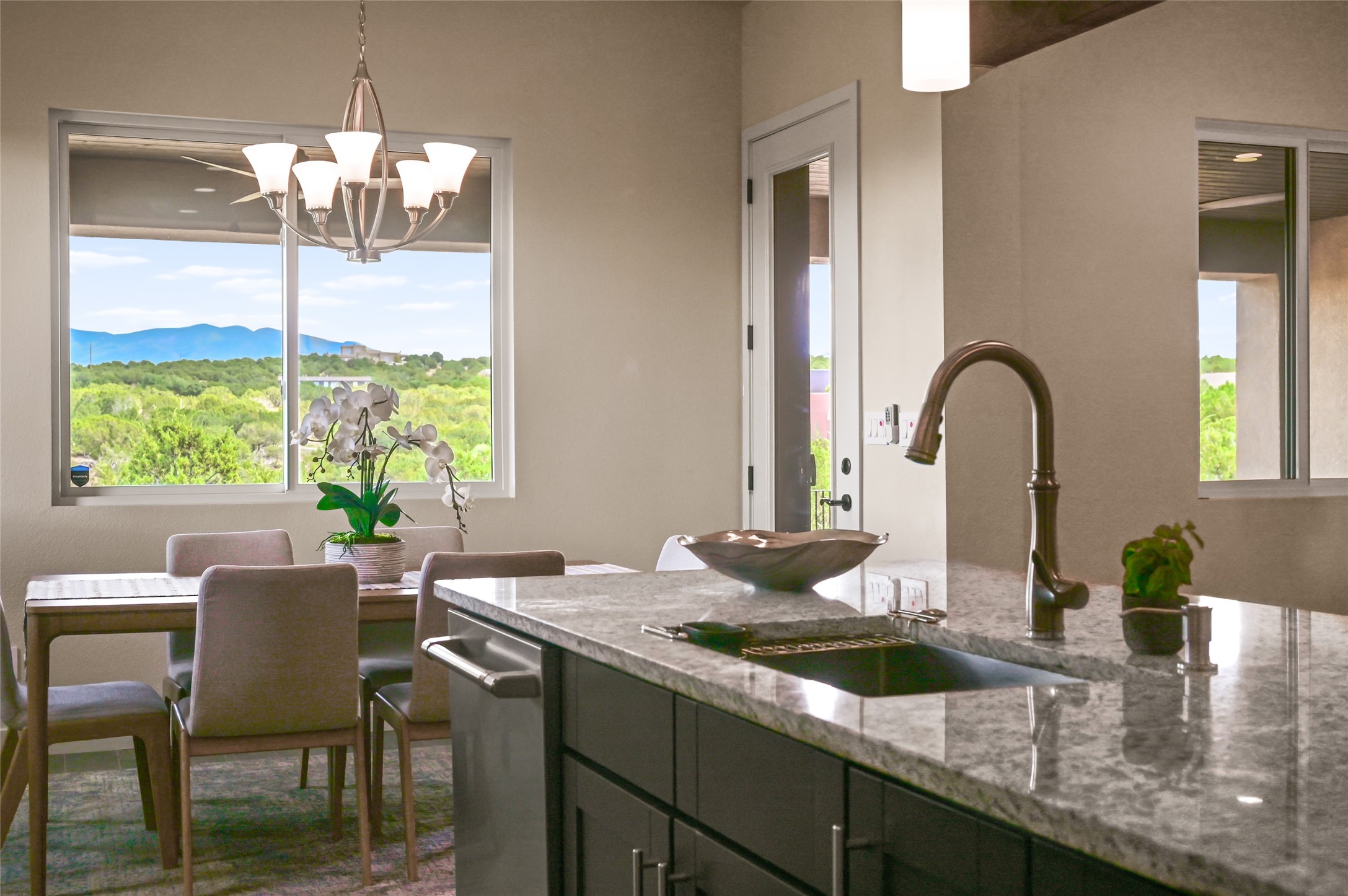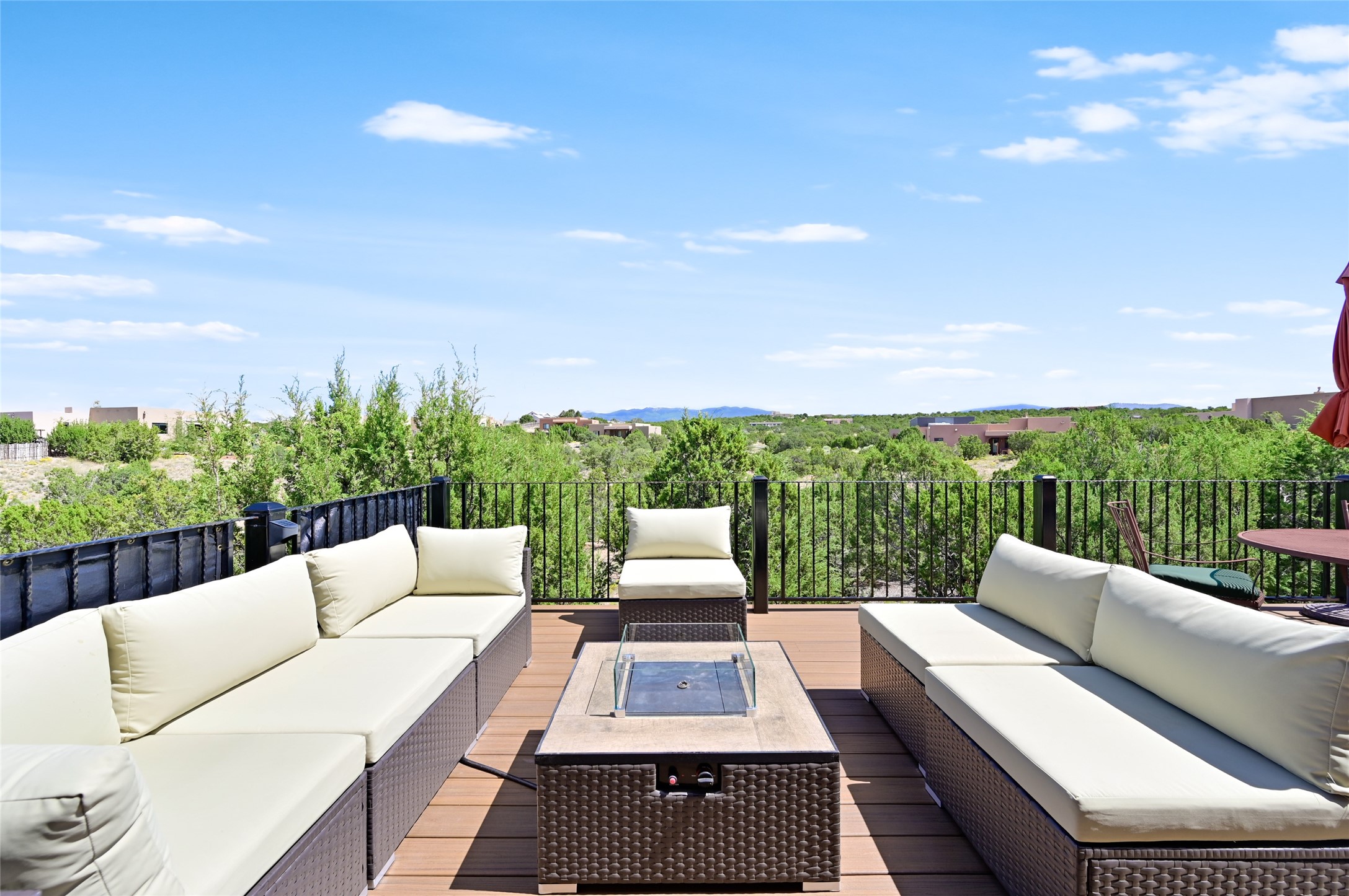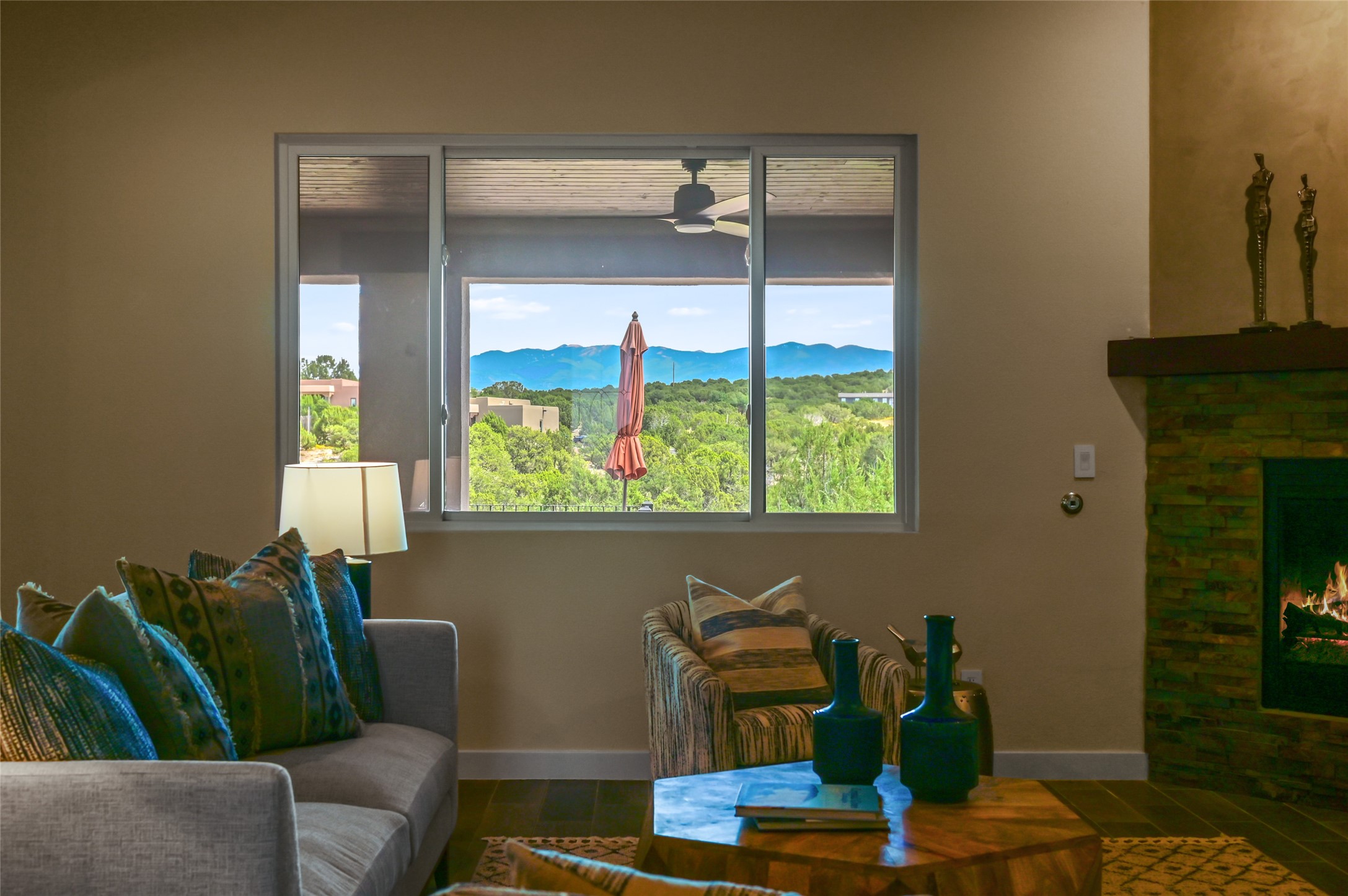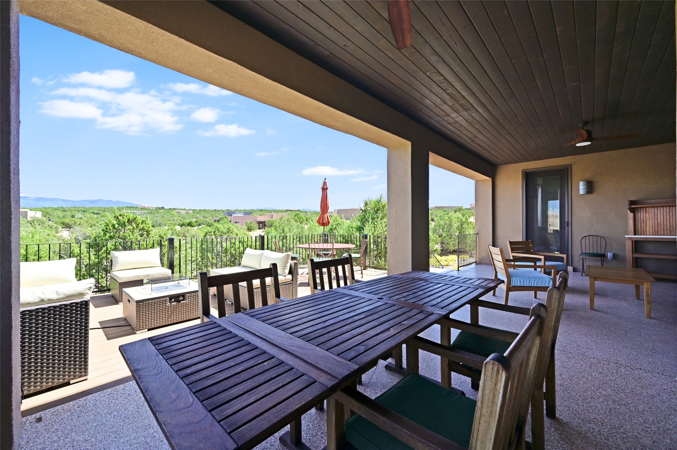 Located in the sought-after Tessera neighborhood, this stunning contemporary home blends modern design, functionality, and sweeping views of the Sangre de Cristo Mountains. Built in 2021, the residence offers 3 bedrooms, 2.5 baths, and 2,165 square feet of stylish living on a beautifully landscaped .36-acre lot.Created with both comfort and entertaining in mind, the home showcases all-tile flooring, a spacious living room with a gas fireplace, and a covered portal with an expanded deck and sleek metal railing that can easily host gatherings of 20 or more. Expansive picture windows capture the breathtaking mountain views, bringing the beauty of Santa Fe indoors.The chef's kitchen is appointed with stainless steel Caf appliances, including a six-burner gas stove with Bluetooth capabilities, refrigerator, dishwasher, microwave/convection oven with side wall venting, and a wine refrigerator. Stone countertops, abundant cabinetry with deep bin drawers, and above- and below-counter lighting strike the perfect balance of elegance and practicality.The generous primary suite opens directly to the portal and features a spa-like walk-in shower and excellent closet space. Additional highlights include lush professional landscaping, a flagstone walk-up, concrete drive with side parking, a striking glass front door, whisper fans and Bali shades throughout, and an oversized washer/dryer on raised pedestals with plumbing in place for a utility sink.With quick access to Highway 599, downtown Santa Fe, the airport, and Los Alamos, this home offers a rare combination of convenience, modern style, and extraordinary mountain views in one of the city's most desirable communities.
