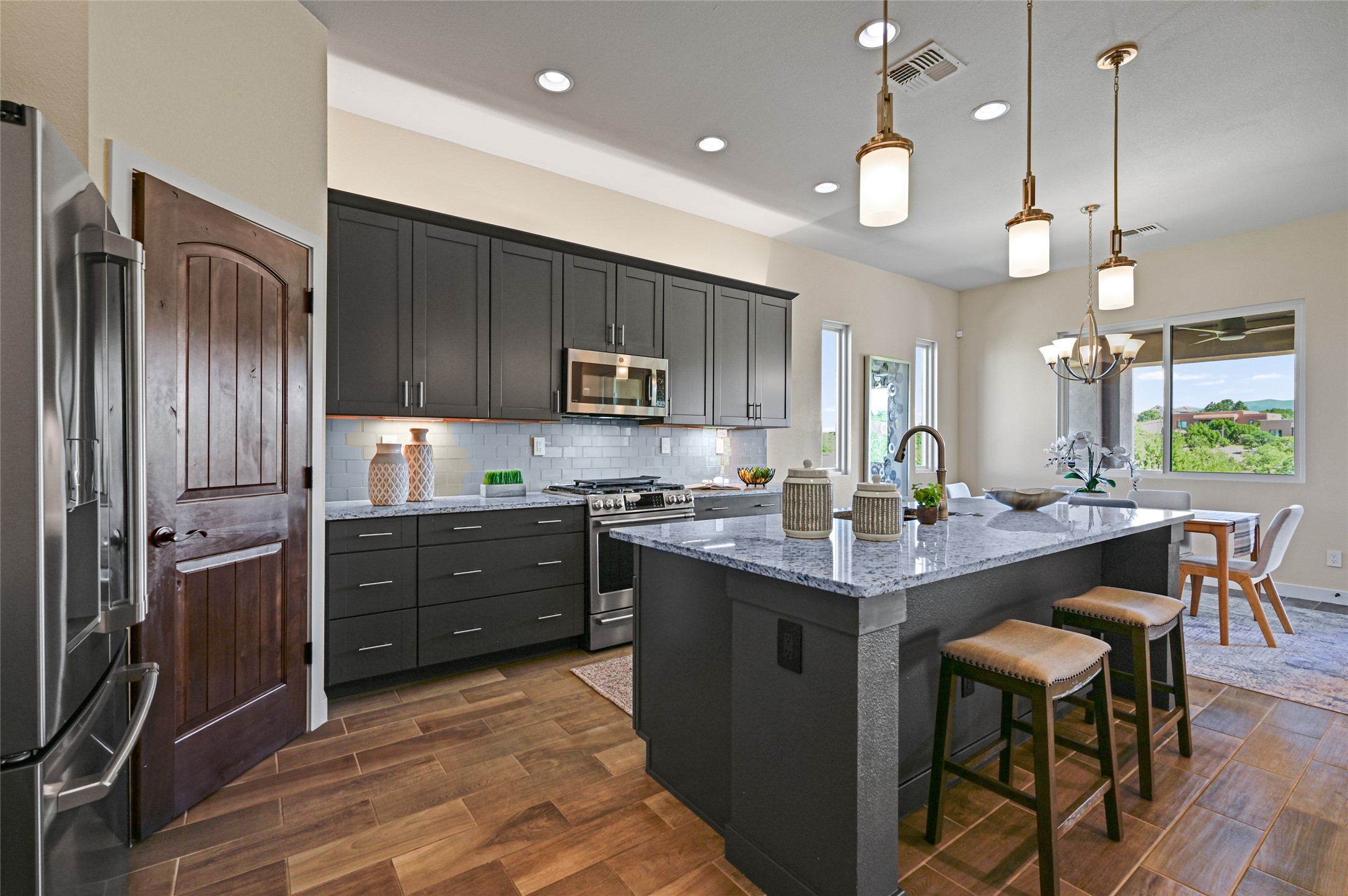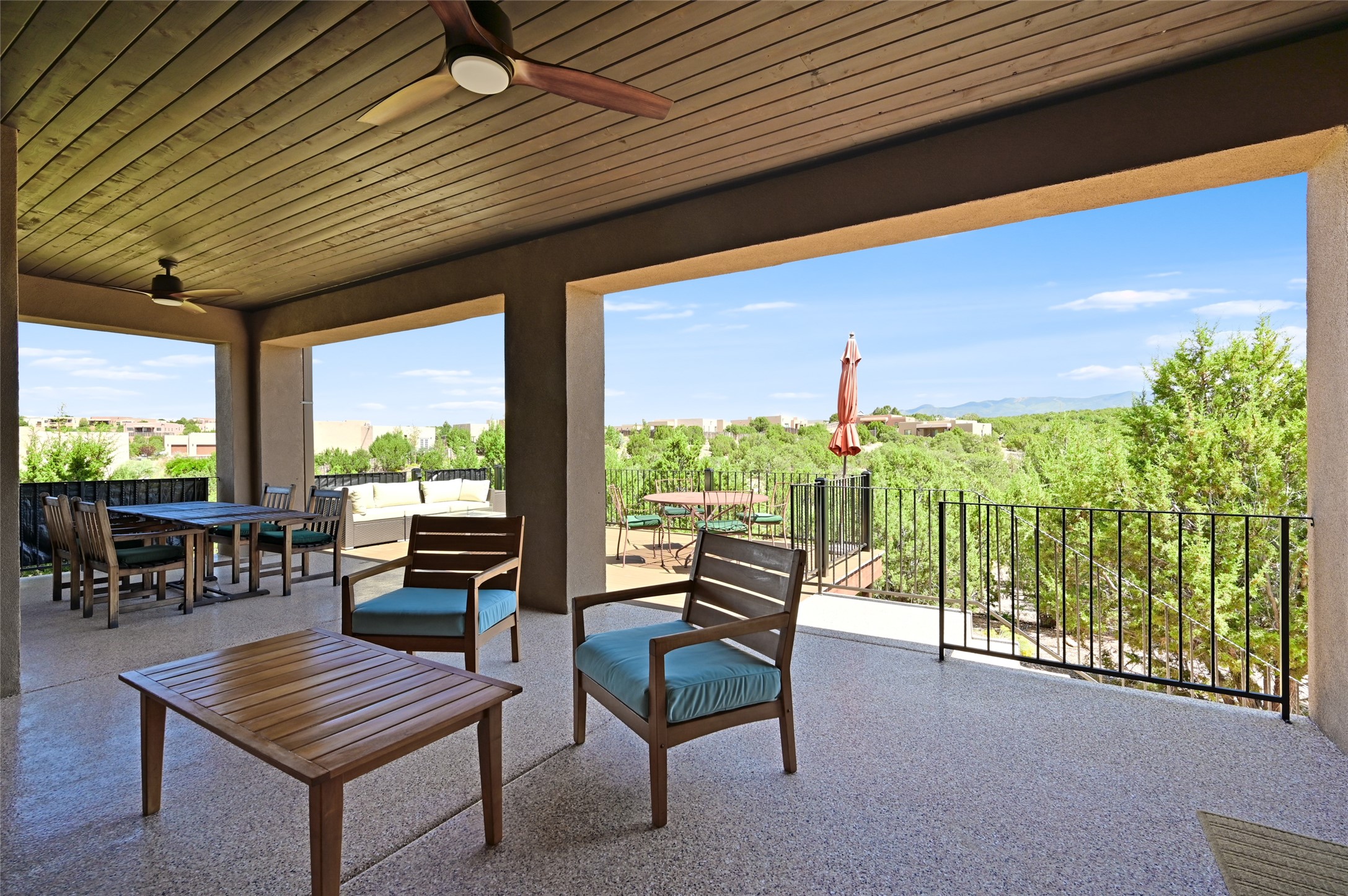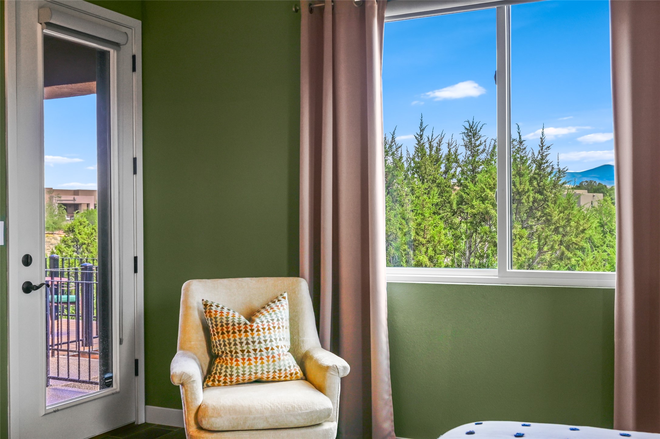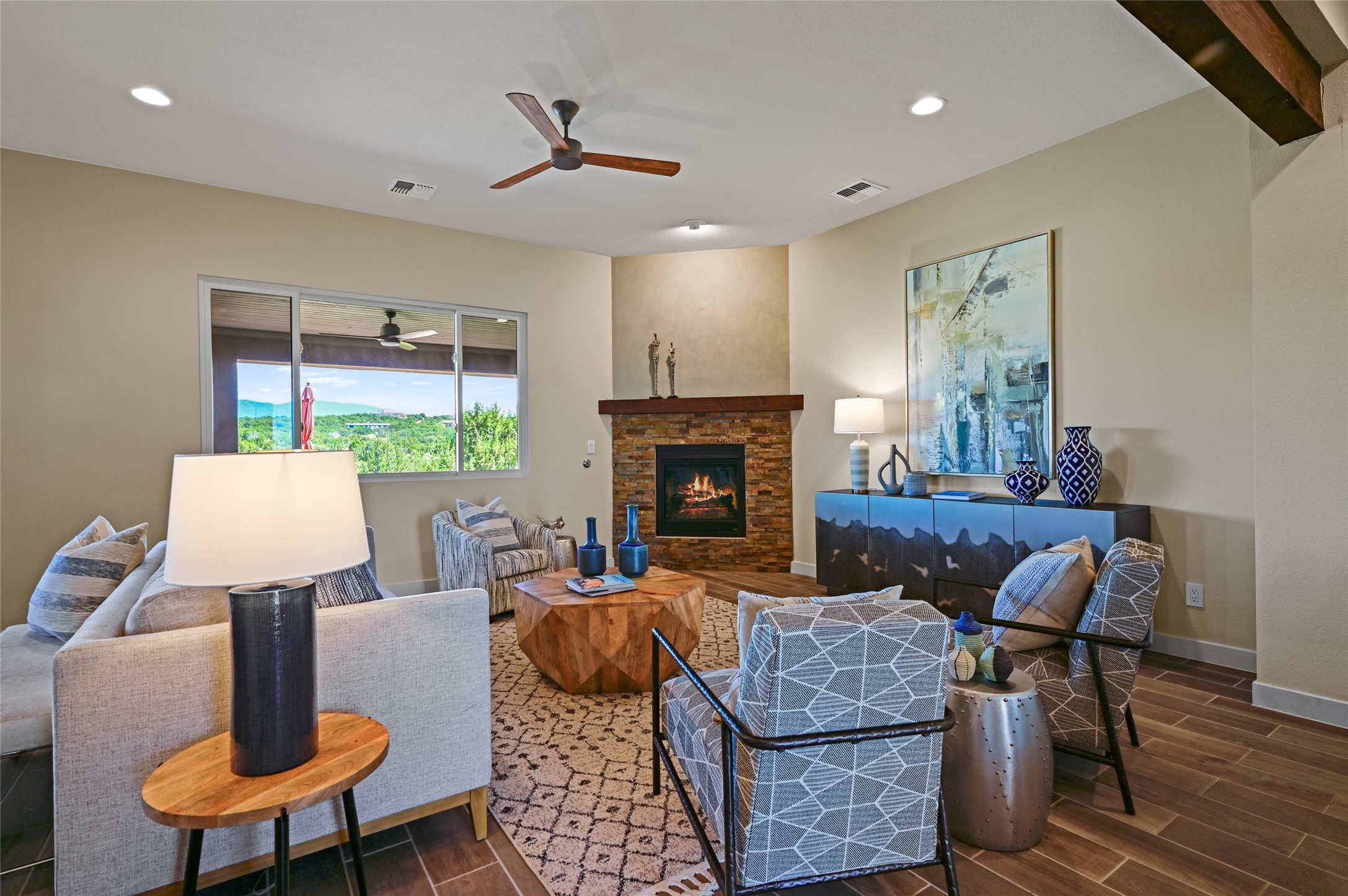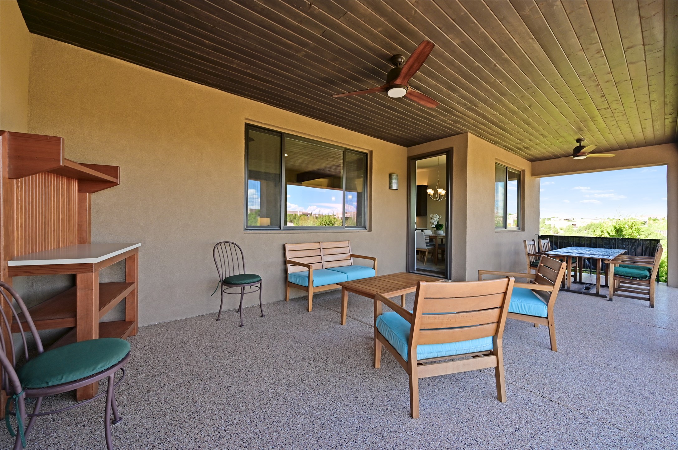 Located in the sought-after Tessera neighborhood, this stunning contemporary home blends modern design, functionality, and sweeping views of the Sangre de Cristo Mountains. Built in 2021, the residence offers 3 bedrooms, 2.5 baths, and 2,165 square feet of stylish living on a beautifully landscaped .36-acre lot.Created with both comfort and entertaining in mind, the home showcases all-tile flooring, a spacious living room with a gas fireplace, and a covered portal with an expanded deck and sleek metal railing that can easily host gatherings of 20 or more. Expansive picture windows capture the breathtaking mountain views, bringing the beauty of Santa Fe indoors.The chef's kitchen is appointed with stainless steel Caf appliances, including a six-burner gas stove with Bluetooth capabilities, refrigerator, dishwasher, microwave/convection oven with side wall venting, and a wine refrigerator. Stone countertops, abundant cabinetry with deep bin drawers, and above- and below-counter lighting strike the perfect balance of elegance and practicality.The generous primary suite opens directly to the portal and features a spa-like walk-in shower and excellent closet space. Additional highlights include lush professional landscaping, a flagstone walk-up, concrete drive with side parking, a striking glass front door, whisper fans and Bali shades throughout, and an oversized washer/dryer on raised pedestals with plumbing in place for a utility sink.With quick access to Highway 599, downtown Santa Fe, the airport, and Los Alamos, this home offers a rare combination of convenience, modern style, and extraordinary mountain views in one of the city's most desirable communities.