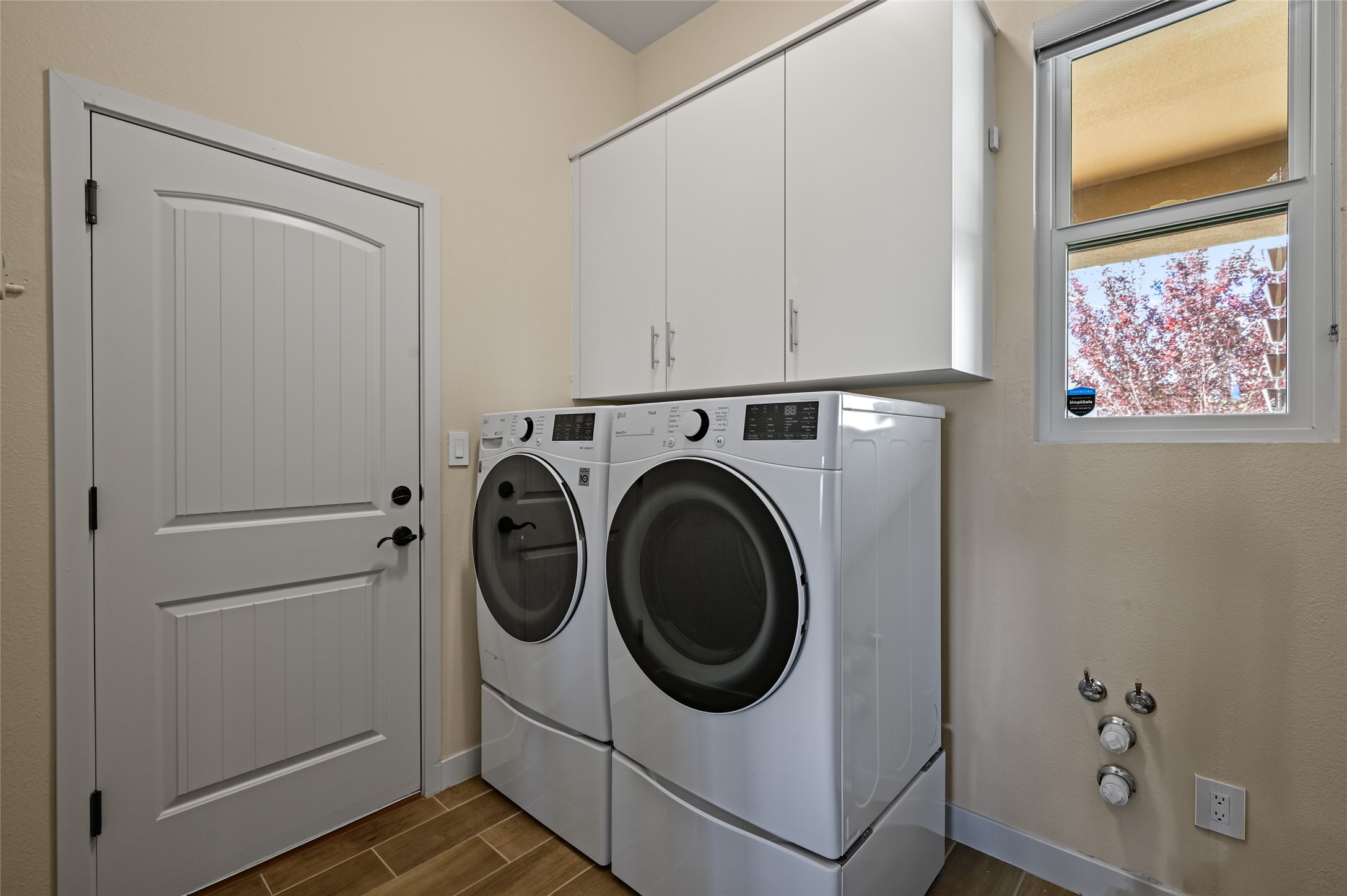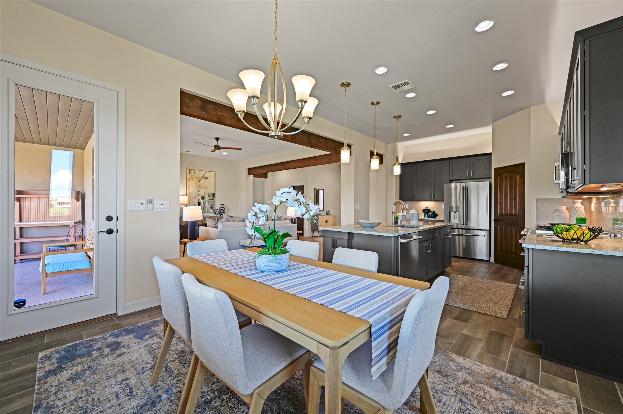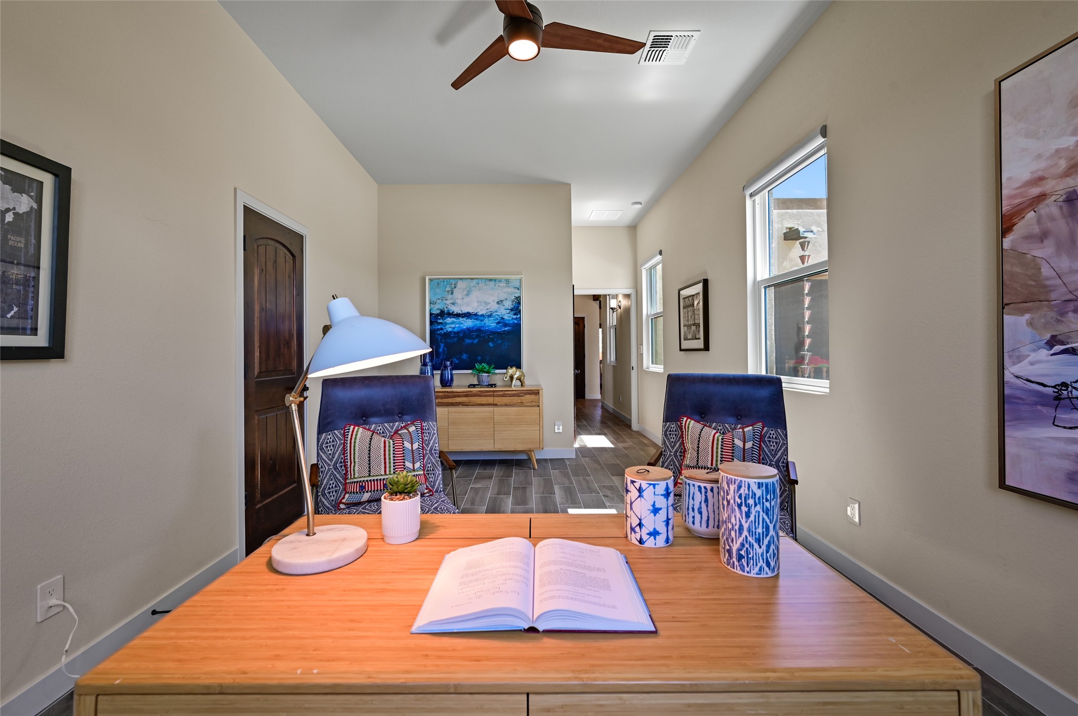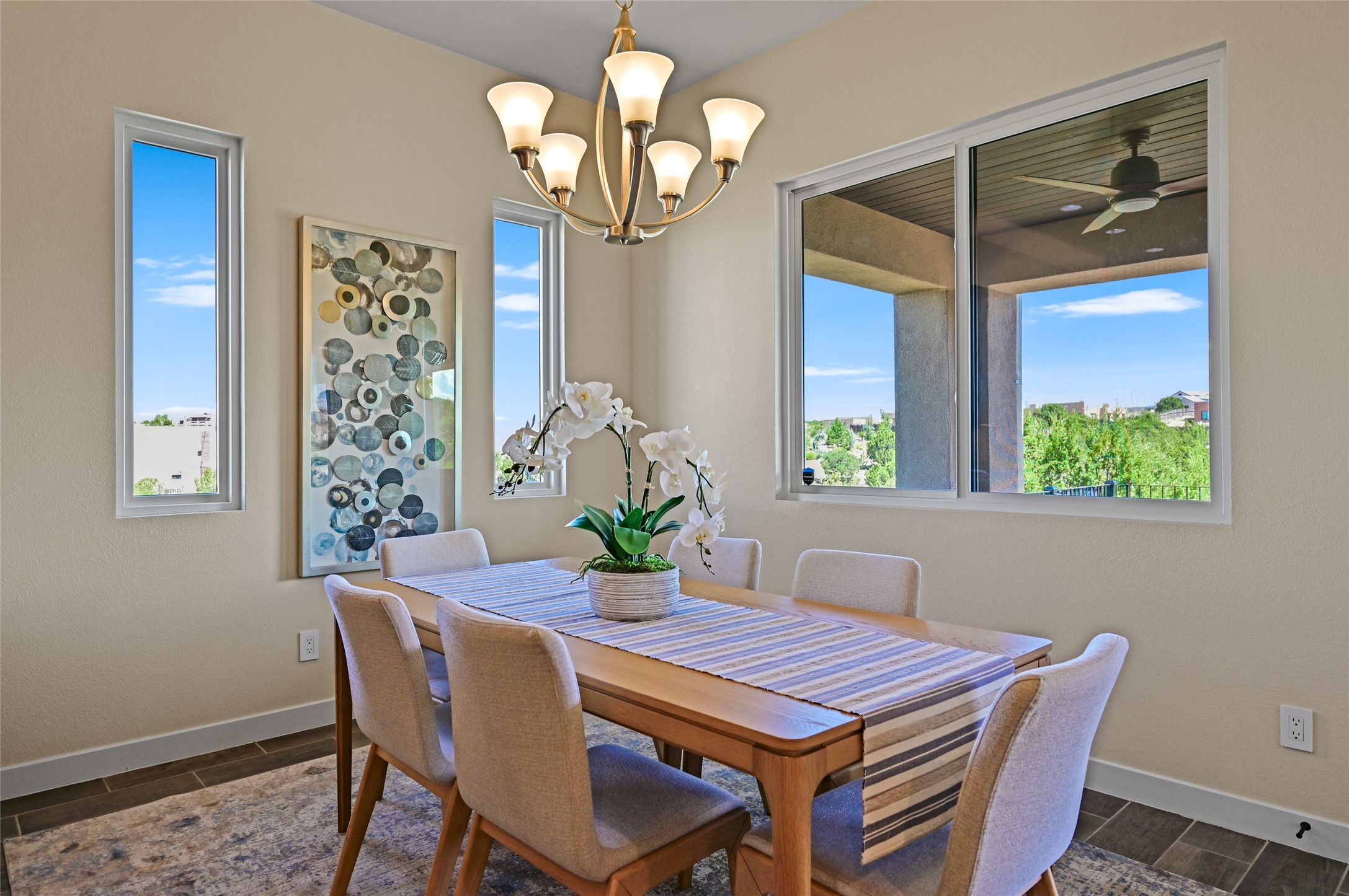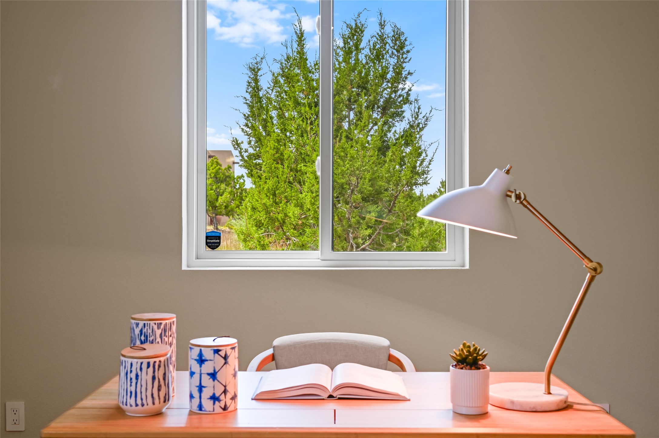 Located in the sought-after Tessera neighborhood, this stunning contemporary home blends modern design, functionality, and sweeping views of the Sangre de Cristo Mountains. Built in 2021, the residence offers 3 bedrooms, 2.5 baths, and 2,165 square feet of stylish living on a beautifully landscaped .36-acre lot.Created with both comfort and entertaining in mind, the home showcases all-tile flooring, a spacious living room with a gas fireplace, and a covered portal with an expanded deck and sleek metal railing that can easily host gatherings of 20 or more. Expansive picture windows capture the breathtaking mountain views, bringing the beauty of Santa Fe indoors.The chef's kitchen is appointed with stainless steel Caf appliances, including a six-burner gas stove with Bluetooth capabilities, refrigerator, dishwasher, microwave/convection oven with side wall venting, and a wine refrigerator. Stone countertops, abundant cabinetry with deep bin drawers, and above- and below-counter lighting strike the perfect balance of elegance and practicality.The generous primary suite opens directly to the portal and features a spa-like walk-in shower and excellent closet space. Additional highlights include lush professional landscaping, a flagstone walk-up, concrete drive with side parking, a striking glass front door, whisper fans and Bali shades throughout, and an oversized washer/dryer on raised pedestals with plumbing in place for a utility sink.With quick access to Highway 599, downtown Santa Fe, the airport, and Los Alamos, this home offers a rare combination of convenience, modern style, and extraordinary mountain views in one of the city's most desirable communities.