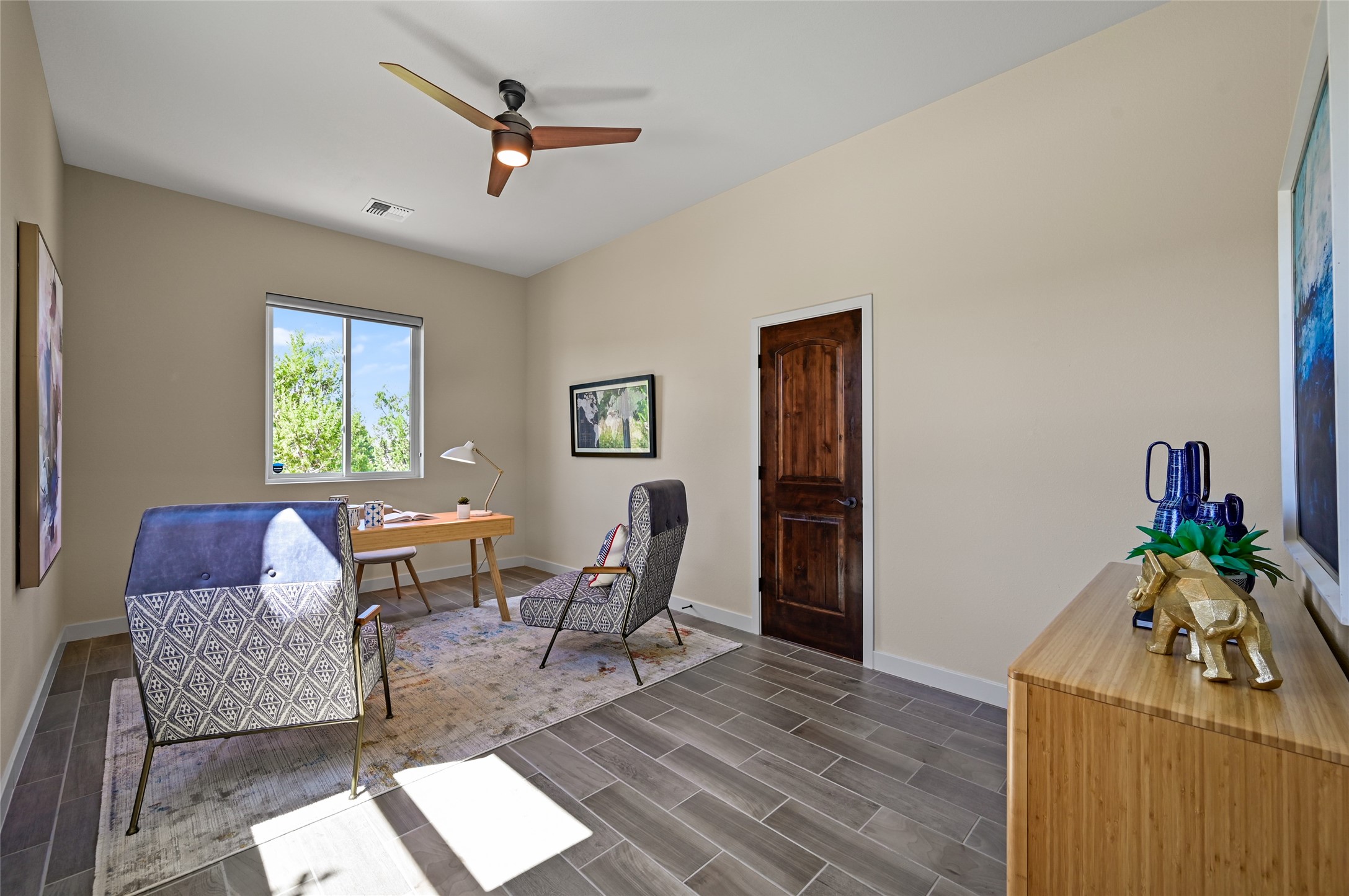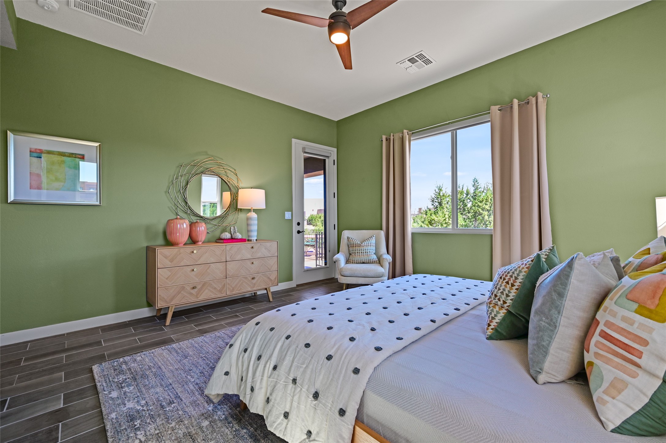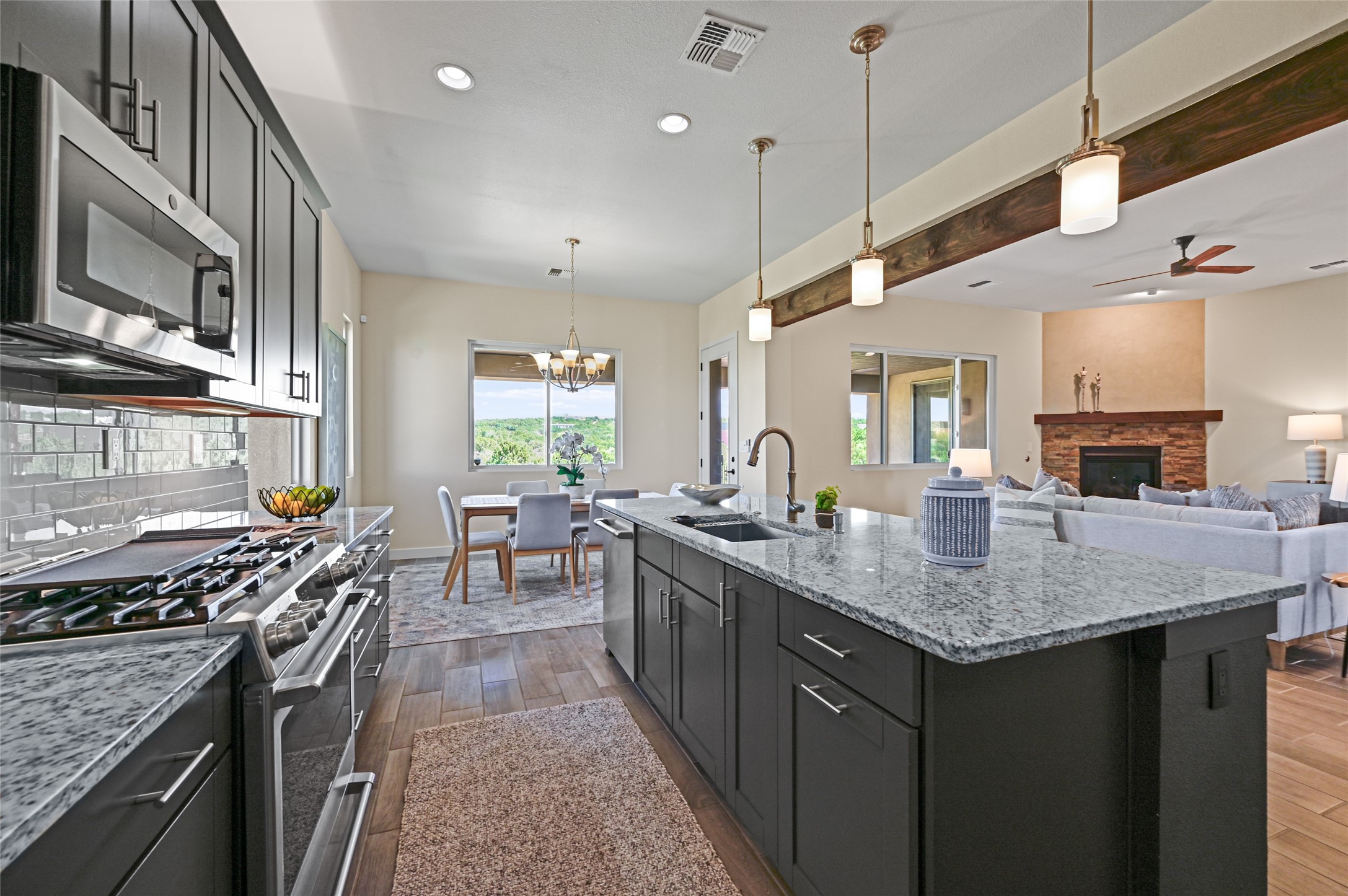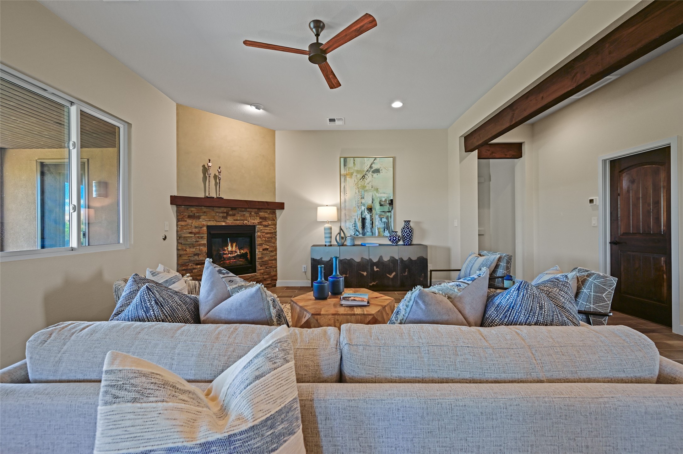 Located in the sought-after Tessera neighborhood, this stunning contemporary home blends modern design, functionality, and sweeping views of the Sangre de Cristo Mountains. Built in 2021, the residence offers 3 bedrooms, 2.5 baths, and 2,165 square feet of stylish living on a beautifully landscaped .36-acre lot.Created with both comfort and entertaining in mind, the home showcases all-tile flooring, a spacious living room with a gas fireplace, and a covered portal with an expanded deck and sleek metal railing that can easily host gatherings of 20 or more. Expansive picture windows capture the breathtaking mountain views, bringing the beauty of Santa Fe indoors.The chef's kitchen is appointed with stainless steel Caf appliances, including a six-burner gas stove with Bluetooth capabilities, refrigerator, dishwasher, microwave/convection oven with side wall venting, and a wine refrigerator. Stone countertops, abundant cabinetry with deep bin drawers, and above- and below-counter lighting strike the perfect balance of elegance and practicality.The generous primary suite opens directly to the portal and features a spa-like walk-in shower and excellent closet space. Additional highlights include lush professional landscaping, a flagstone walk-up, concrete drive with side parking, a striking glass front door, whisper fans and Bali shades throughout, and an oversized washer/dryer on raised pedestals with plumbing in place for a utility sink.With quick access to Highway 599, downtown Santa Fe, the airport, and Los Alamos, this home offers a rare combination of convenience, modern style, and extraordinary mountain views in one of the city's most desirable communities.
