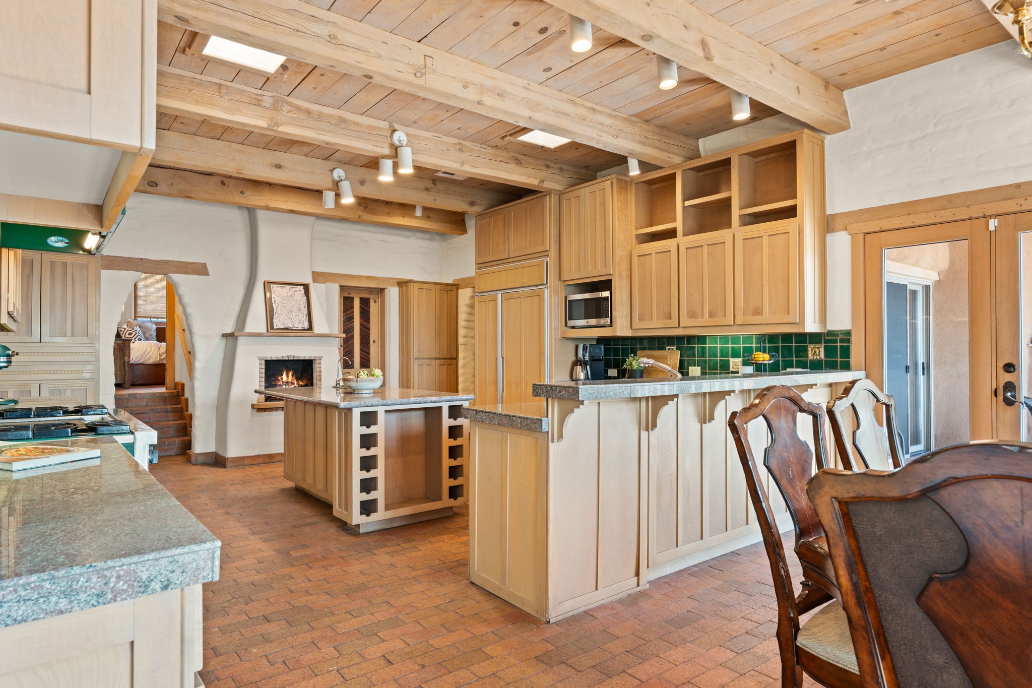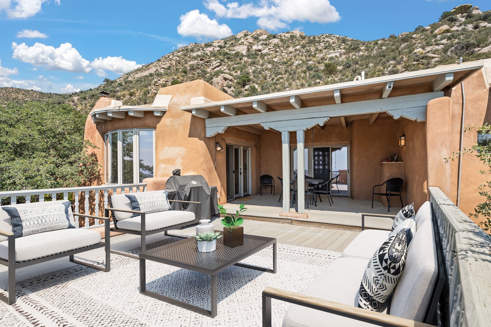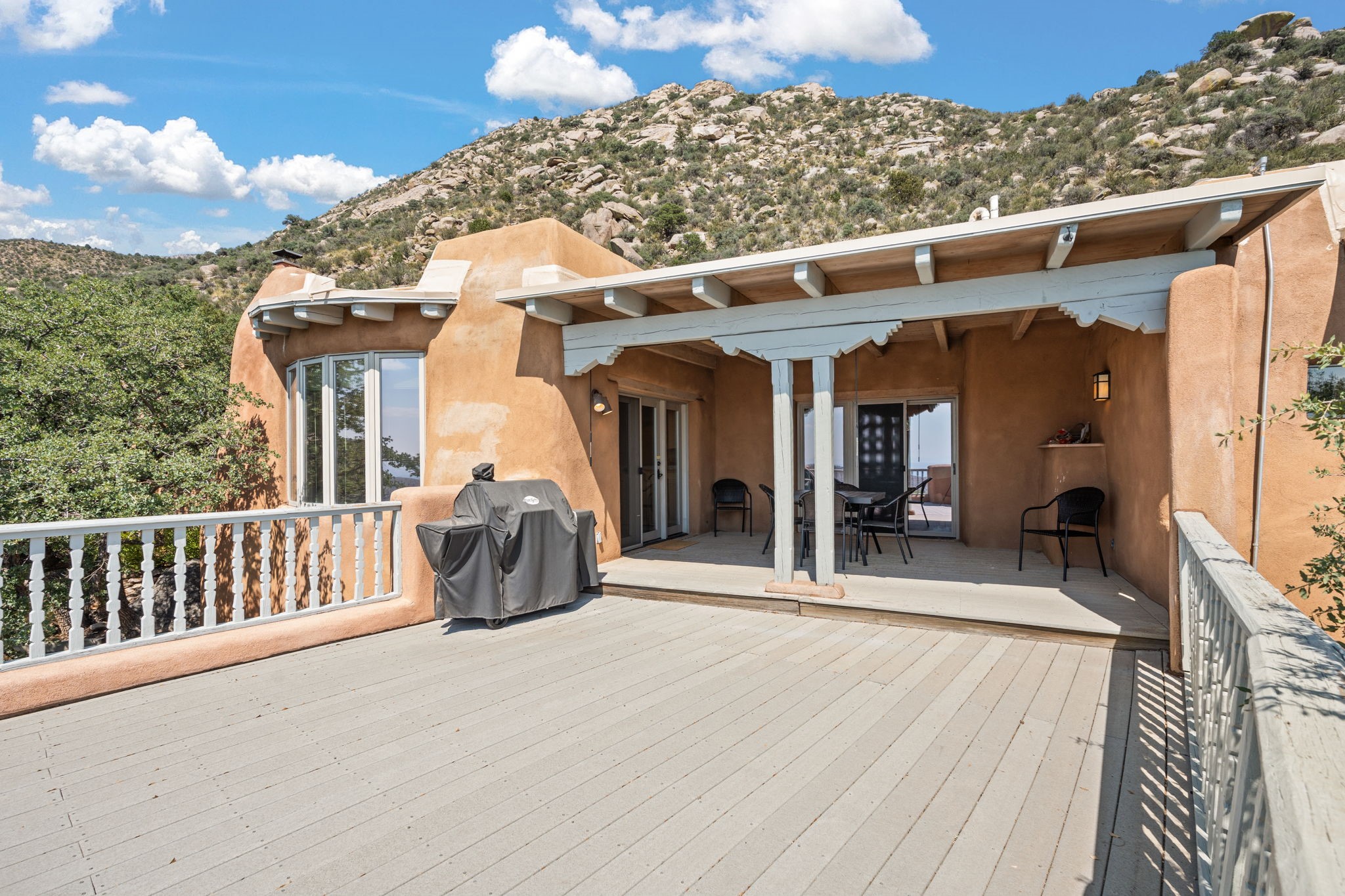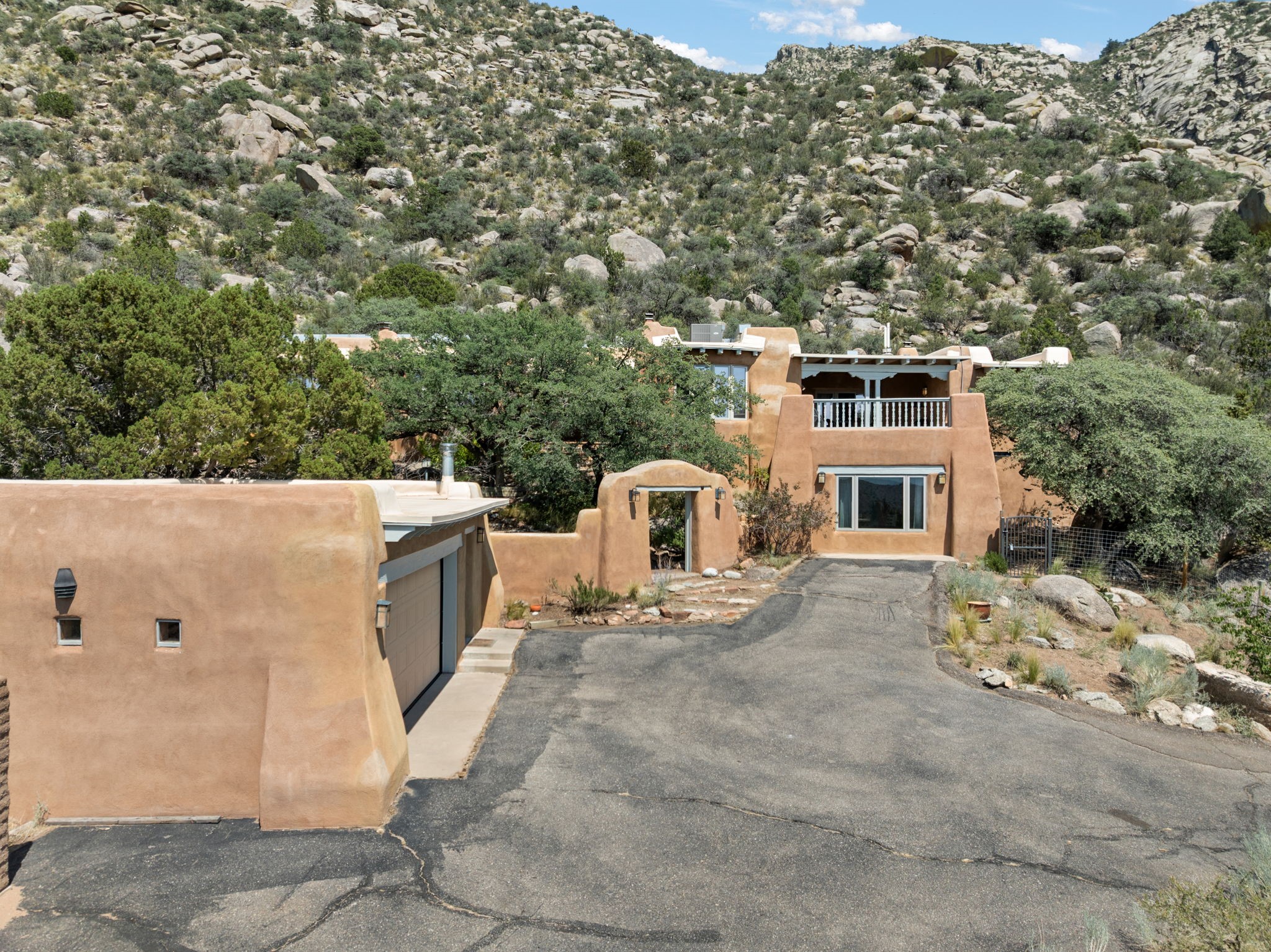 This Charming and authentic Adobe home in Tierra Monte offers a rare blend of luxury living and natural splendor at the base of the iconic Sandia Mountains. This spacious 3,680 sq. ft. residence is thoughtfully designed with updated roofing and mechanical systems, ensuring both comfort and elegance. Step inside to discover adobe construction, beamed ceilings, and a gourmet kitchen featuring a massive granite island, a veggie sink, a Viking gas range and double ovens, a Sub-Zero fridge/freezer, and an incredible deck off the kitchen and the primary bedroom suite, perfect for entertaining or relaxing after a long week. The interior boasts five fireplaces, brick, Saltillo, and carpet flooring, and windows that frame breathtaking vistas. Set on a private lot, the home offers unparalleled....privacy and panoramic views of dramatic sunsets, starlit skies, and the rugged cliffs of the Sandias. Enjoy serene mornings on your patio, watching the ever-changing light play across the peaks, or unwind in the jetted tub after exploring the famed La Luz Trail, a world-renowned hiking destination just steps from your door. The property is ideally located within the sought-after 87122 zip code, with top-rated schools nearby. It's more than a home, it's a gateway to adventure and tranquility, offering a lifestyle defined by outdoor beauty and classic Pueblo architecture. It could be your ABQ Dream Home!
