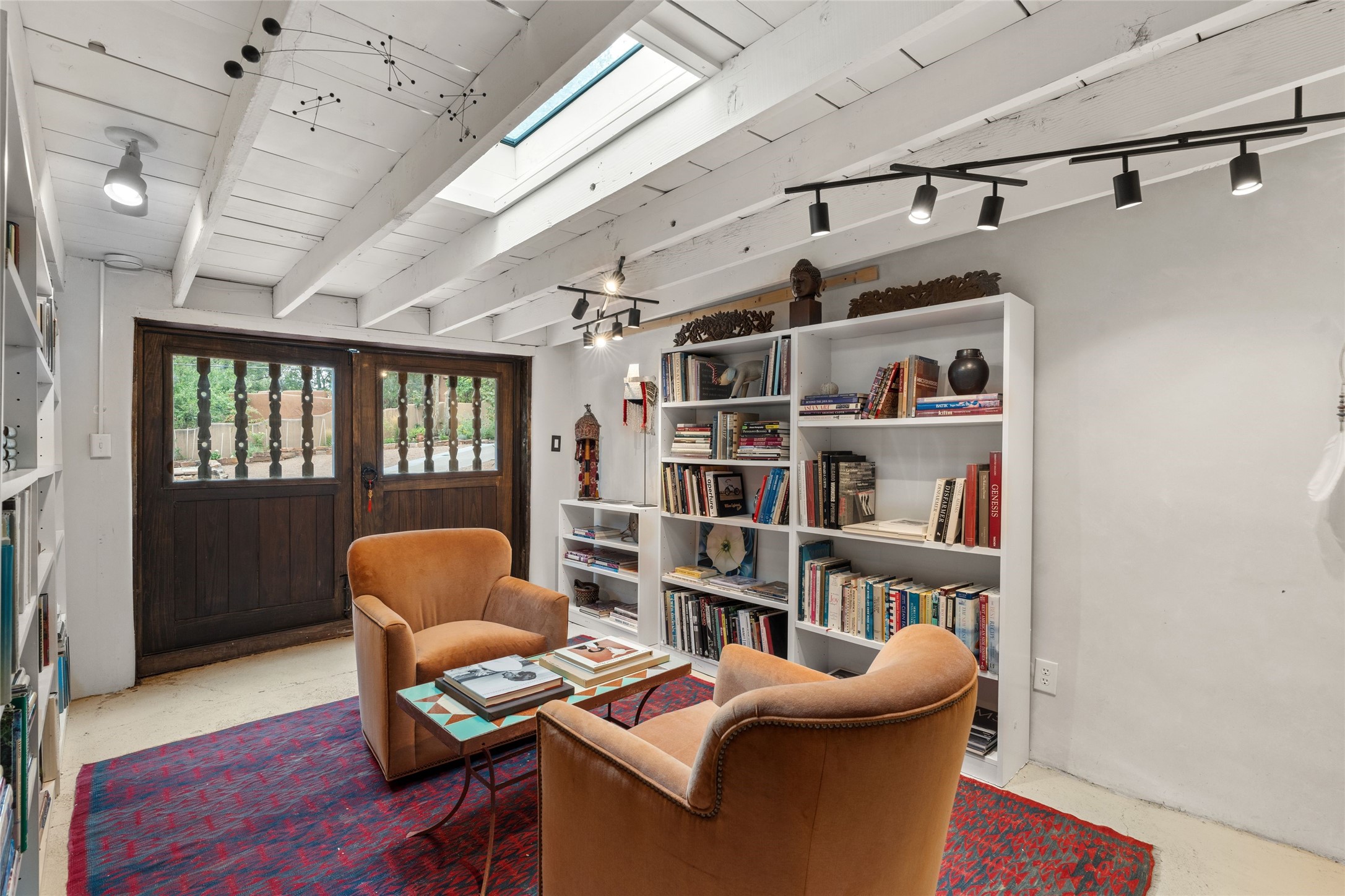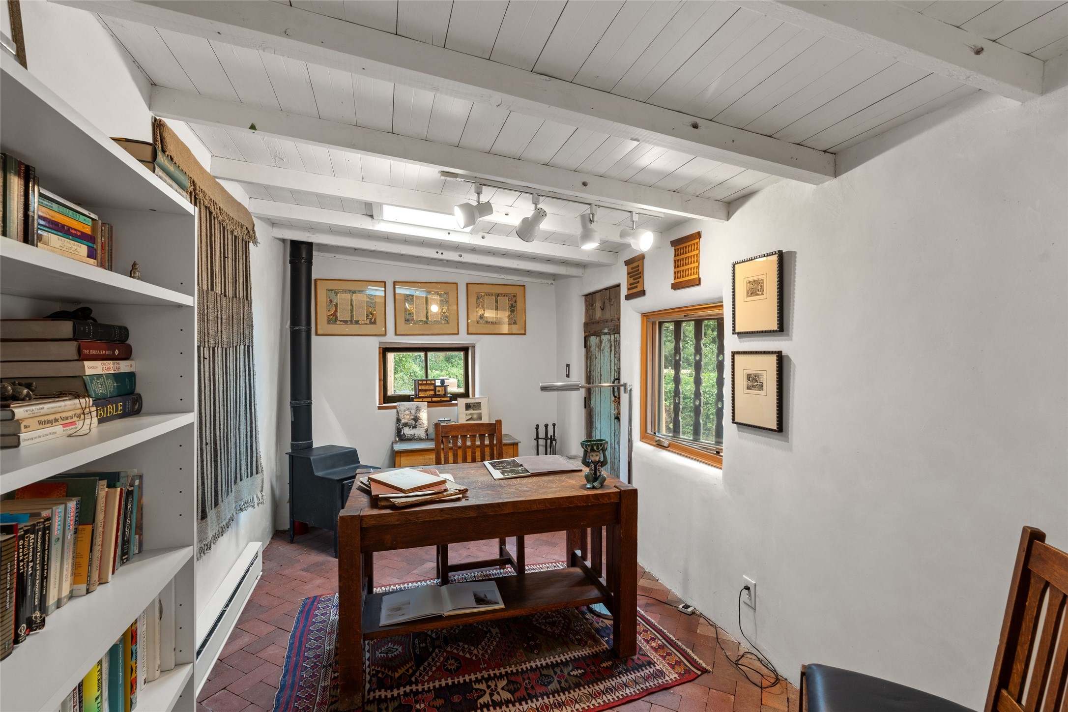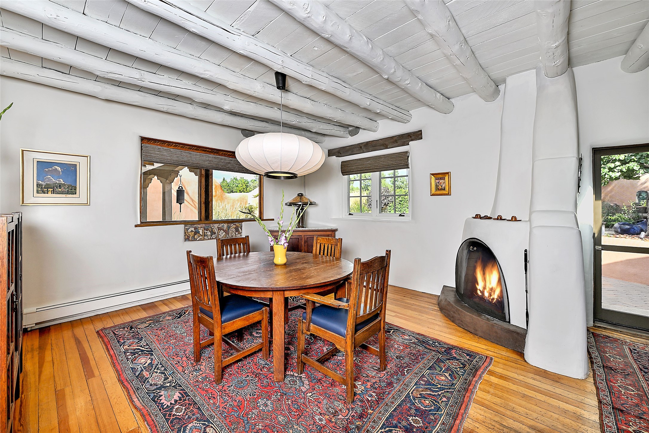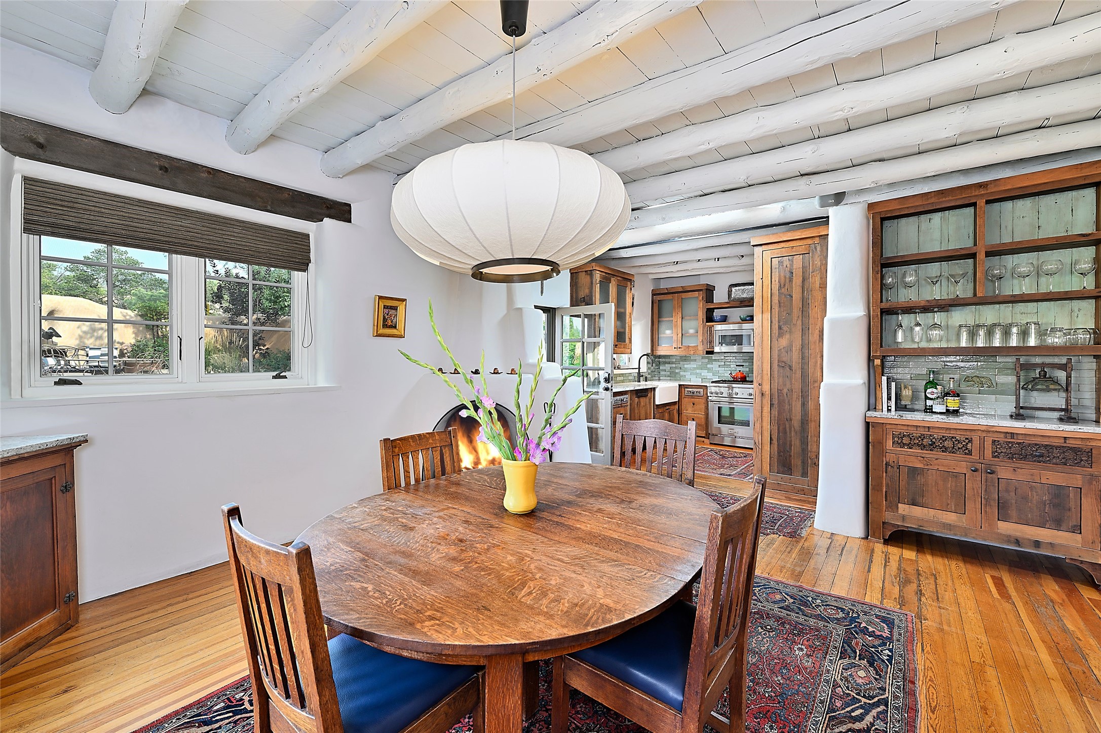 Located in the highly sought-after A++ location on Camino Del Monte Sol, this beautifully remodeled Eastside gem blends timeless Santa Fe charm with modern comfort. Once the residence of renowned artist Joseph Bakos, this one-of-a-kind property offers a rare opportunity to own a piece of Santa Fe history. With approximately 2,843 sq ft of living space, the main home features 3 bedrooms and 3 baths, set on a serene lot with several enchanting outdoor living areas and gardens lovingly curated by the current owners. A magical entry courtyard welcomes you into a space rich in character and authenticity. Classic Santa Fe architectural elements include adobe and frame construction, plaster walls, vigas and beams, kiva fireplaces, and a mix of wood and tile flooring. The custom La Puerta kitchen is a true centerpiece--beautifully crafted and fully equipped for modern living. In addition to the main house, a detached 300 sq ft studio or library offers flexible space for creative work, quiet reading, or extra storage. Ample off-street parking adds convenience to this exceptional property. Turn-key and meticulously maintained, this residence exemplifies the finest in Santa Fe real estate--where heritage, elegance, and location converge.