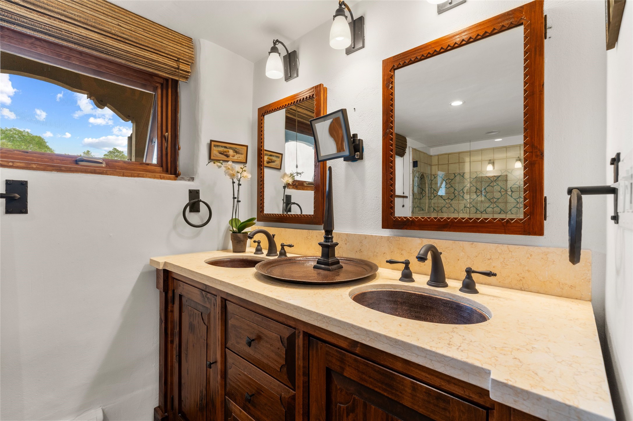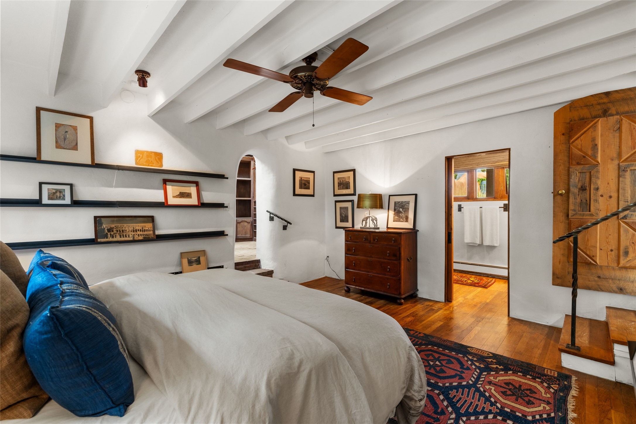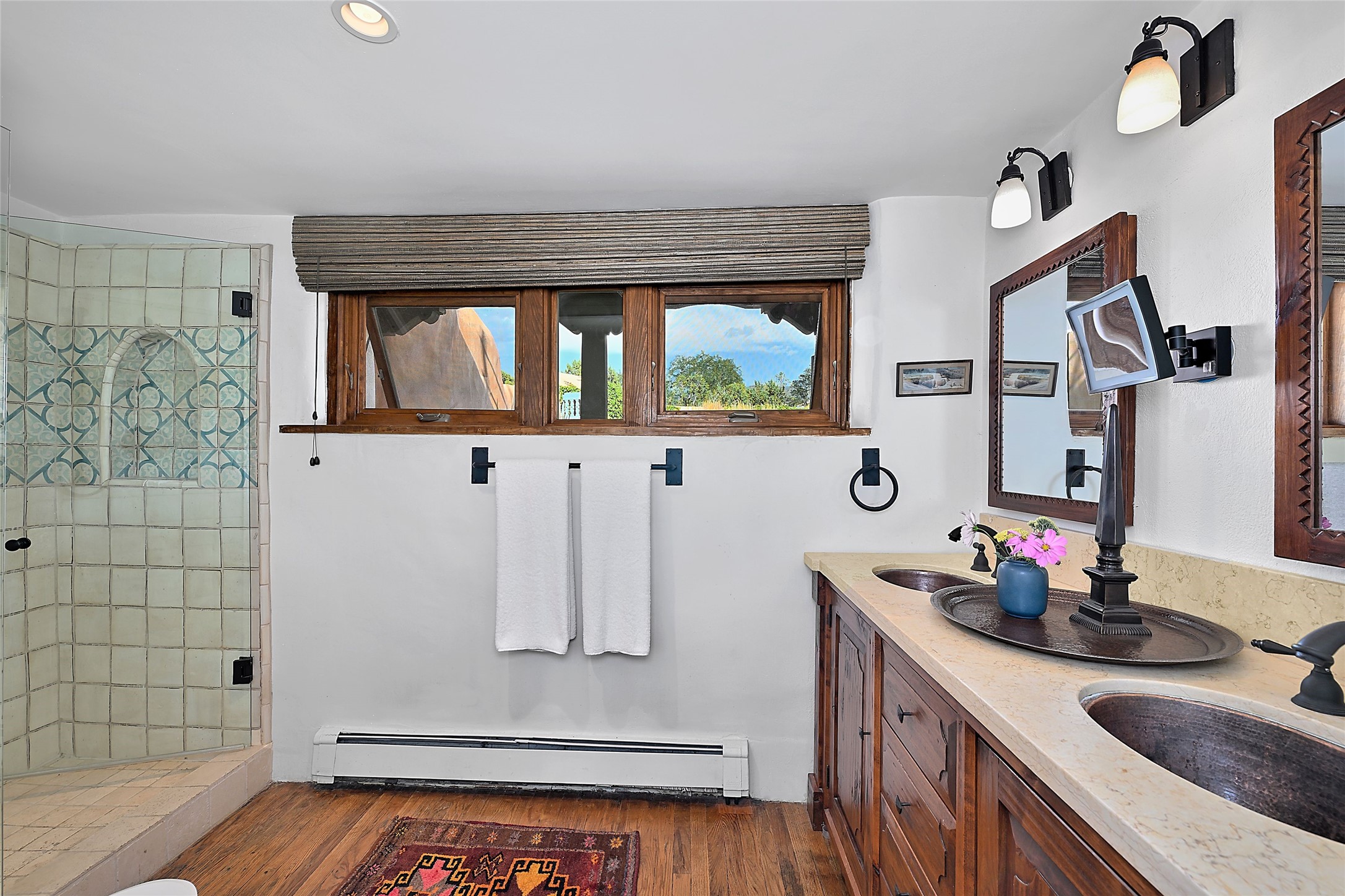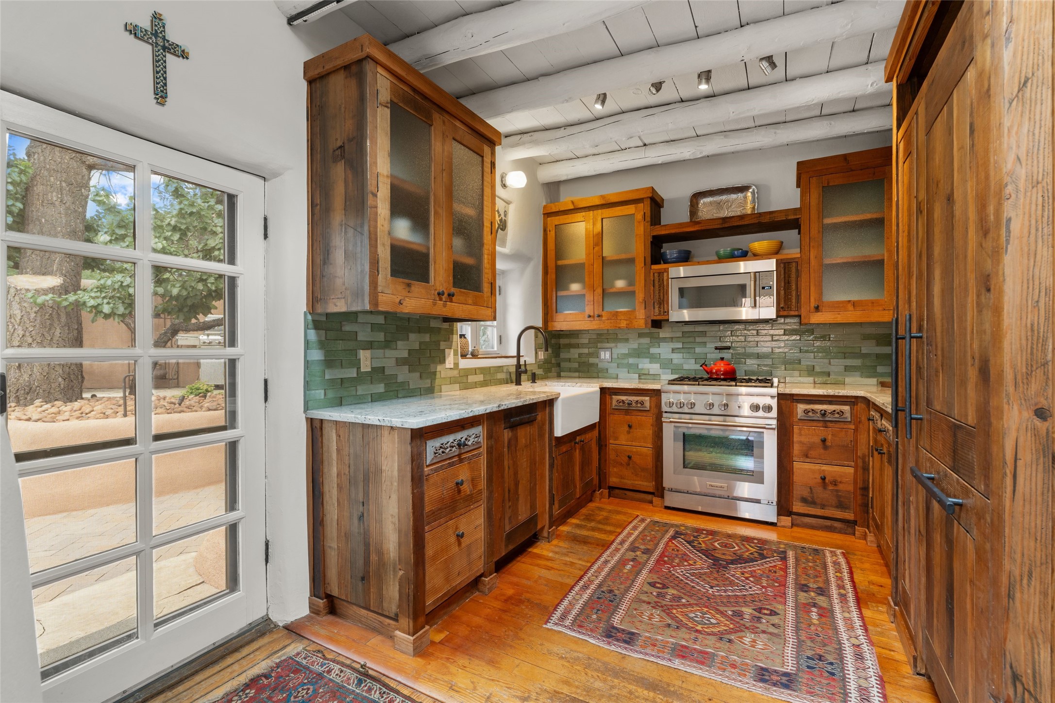 Located in the highly sought-after A++ location on Camino Del Monte Sol, this beautifully remodeled Eastside gem blends timeless Santa Fe charm with modern comfort. Once the residence of renowned artist Joseph Bakos, this one-of-a-kind property offers a rare opportunity to own a piece of Santa Fe history. With approximately 2,843 sq ft of living space, the main home features 3 bedrooms and 3 baths, set on a serene lot with several enchanting outdoor living areas and gardens lovingly curated by the current owners. A magical entry courtyard welcomes you into a space rich in character and authenticity. Classic Santa Fe architectural elements include adobe and frame construction, plaster walls, vigas and beams, kiva fireplaces, and a mix of wood and tile flooring. The custom La Puerta kitchen is a true centerpiece--beautifully crafted and fully equipped for modern living. In addition to the main house, a detached 300 sq ft studio or library offers flexible space for creative work, quiet reading, or extra storage. Ample off-street parking adds convenience to this exceptional property. Turn-key and meticulously maintained, this residence exemplifies the finest in Santa Fe real estate--where heritage, elegance, and location converge.