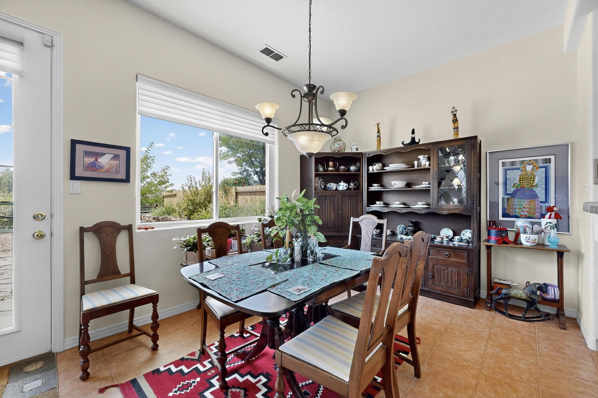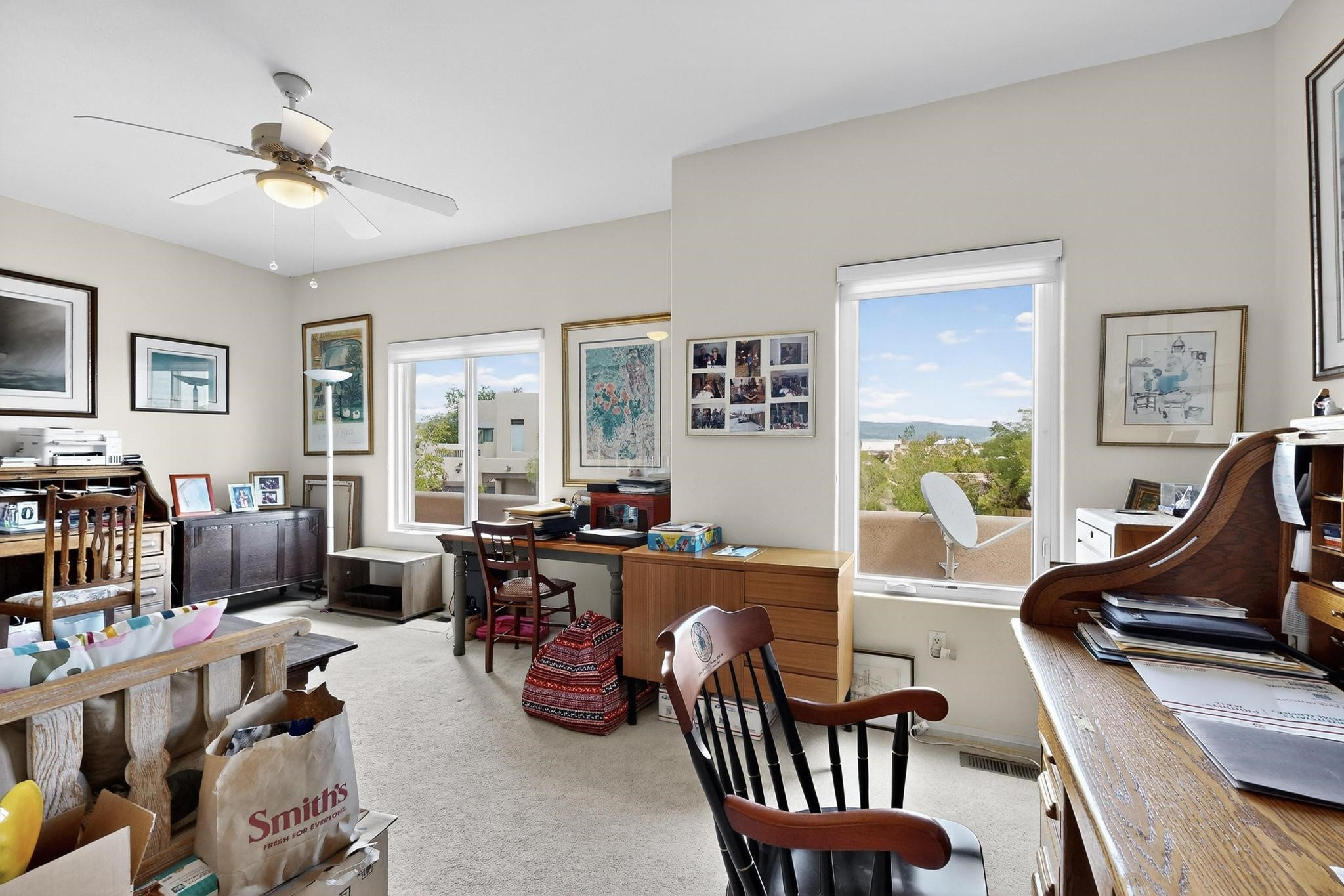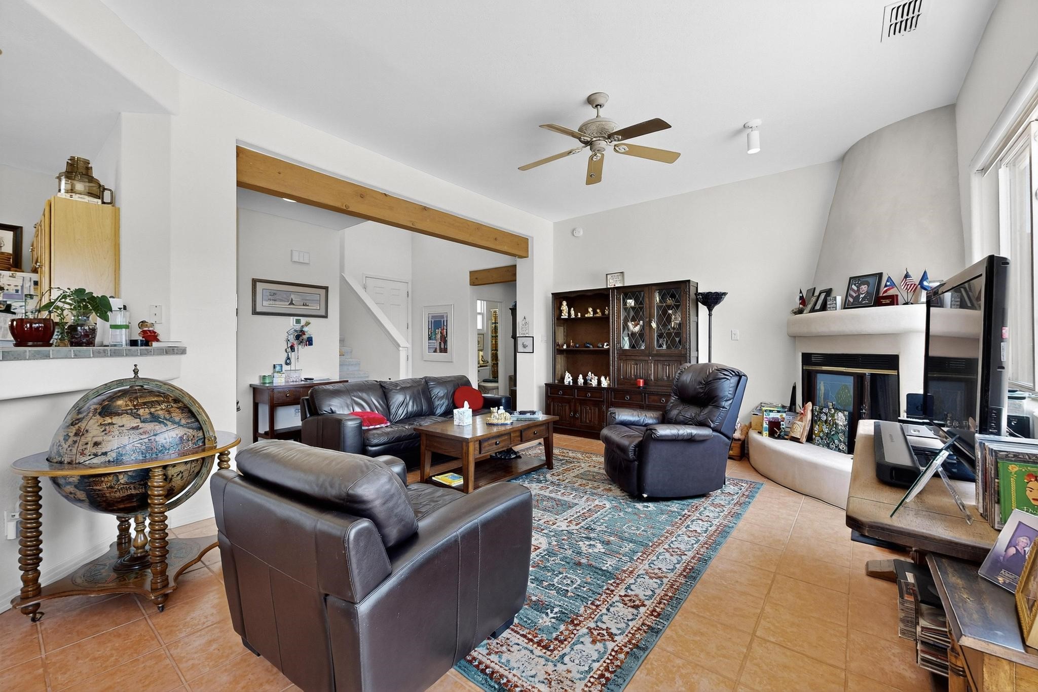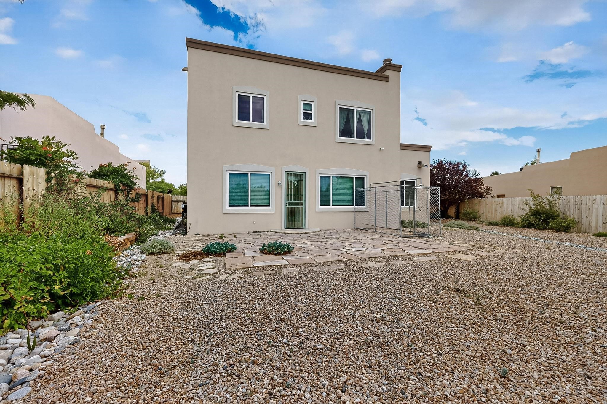 This well maintained 4 bedroom, 3 bath home is located on the southside of Santa Fe in the Sunset Ridge subdivision, is sited on a larger corner lot and backs up to a greenbelt/arroyo enjoying views of the neighboring mountain ranges! Features include raised ceilings, tile countertops, skylights, a trex deck, fenced yard and landscaping. Step inside and enjoy the warm and inviting feel this open floor plan has to offer. The large kitchen features a center island and includes a cozy breakfast nook. There is a downstairs bedroom and bath just off the living room. The spacious main bedroom upstairs features new carpeting, a large walk-in closet and en-suite bath. Take your coffee and sit out on your private deck and enjoy the views! The second floor also features a large bonus room that includes a closet - could make a 5th bedroom, TV room or whatever your imagination can dream up! Recent improvements include a new HVAC system and new carpet in the MB, hallway and bedroom downstairs. This home is move-in ready and just waiting for you to make it your own!!