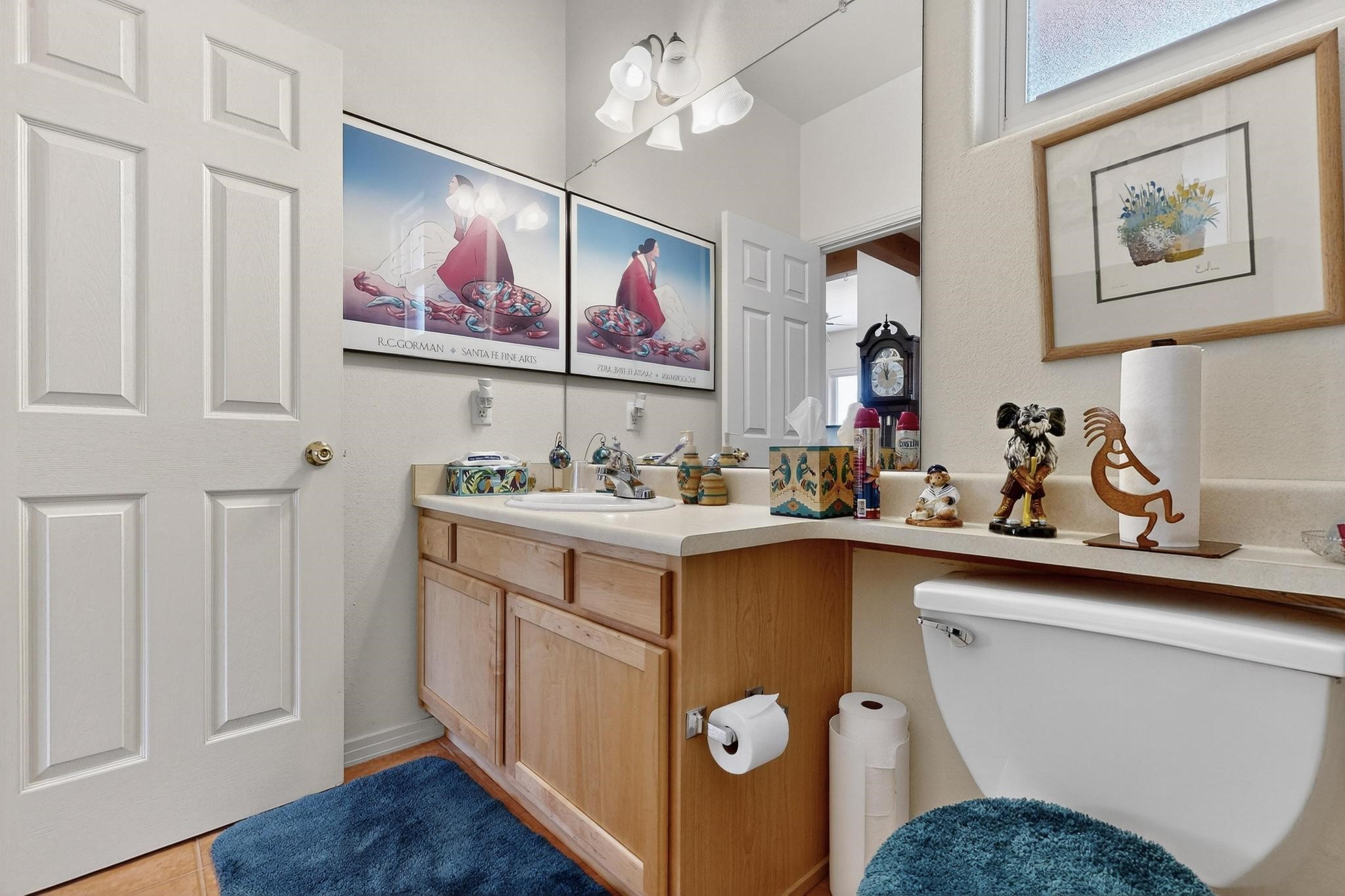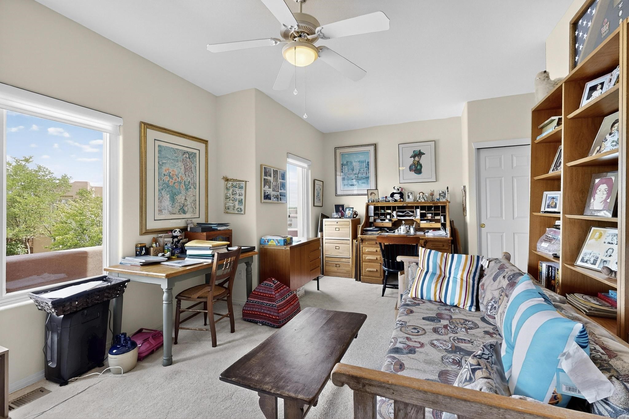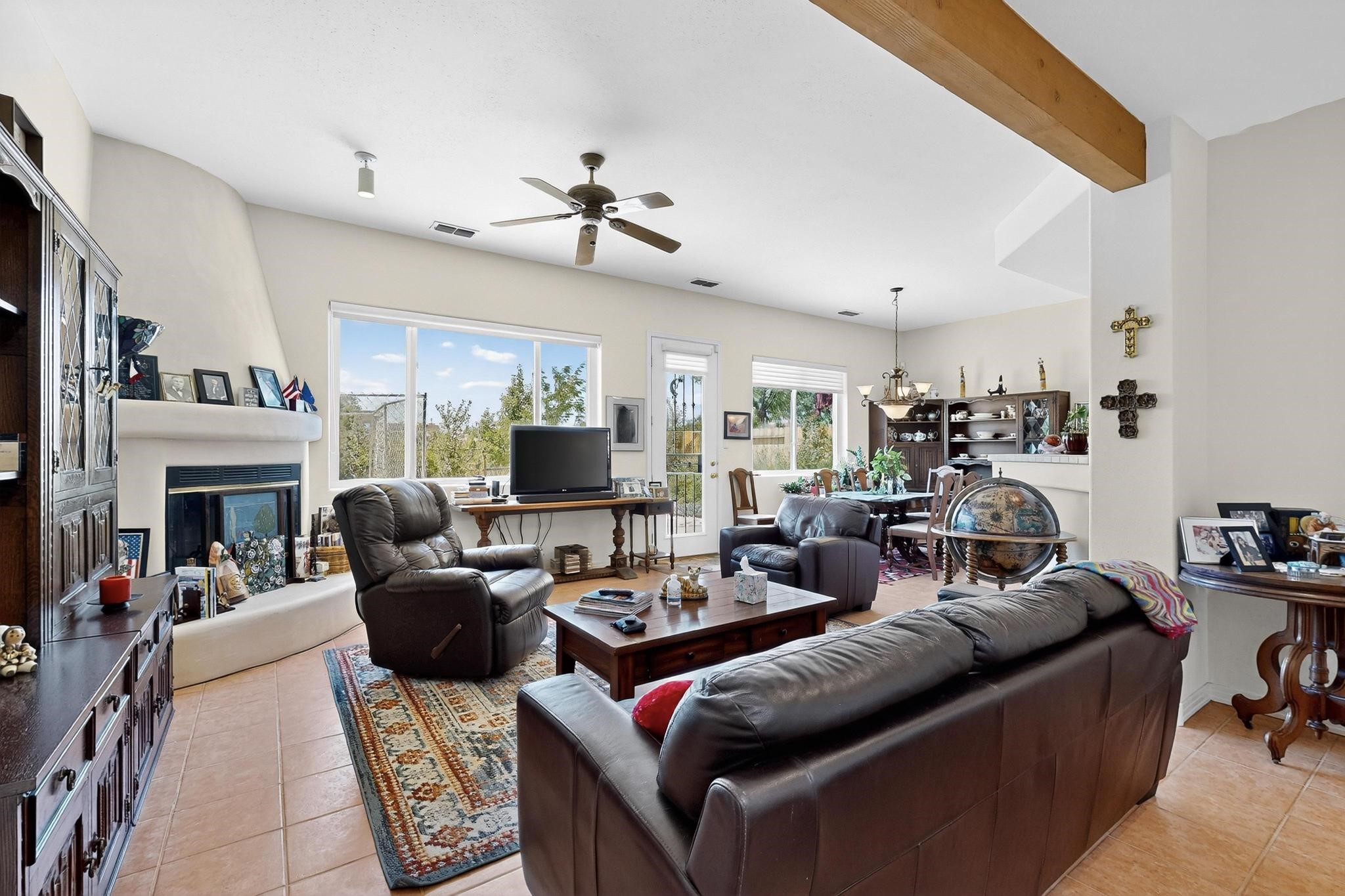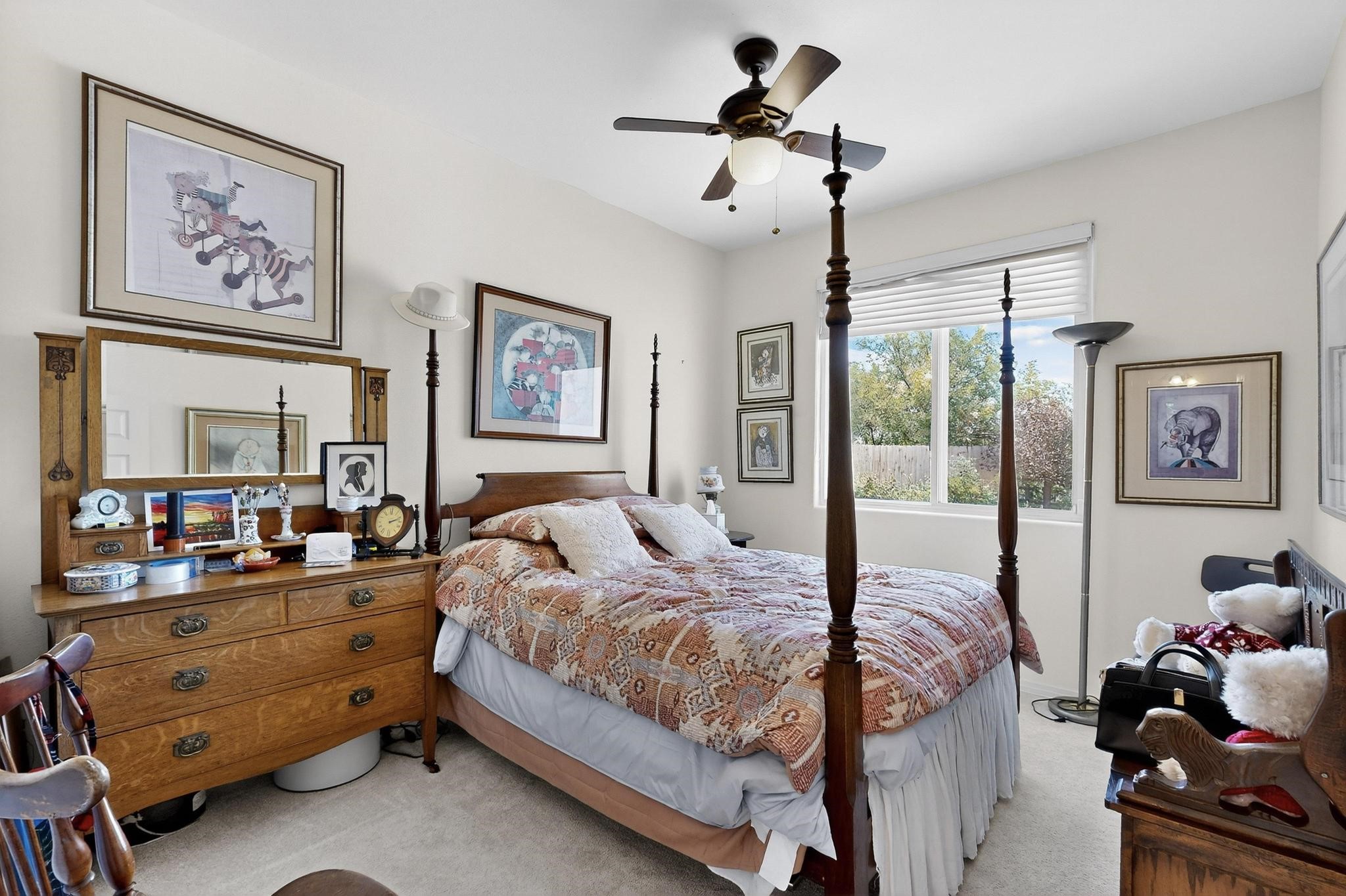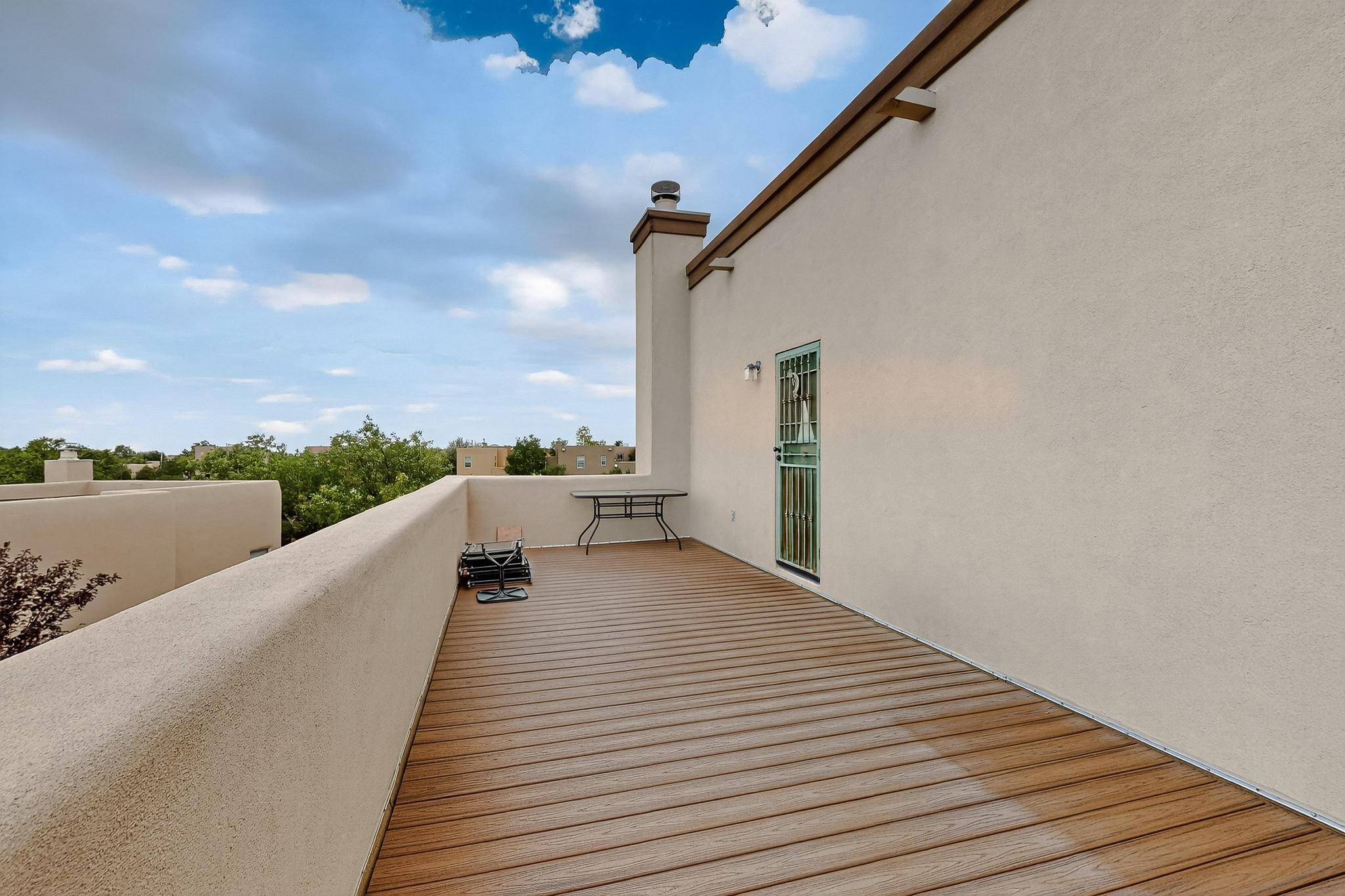 This well maintained 4 bedroom, 3 bath home is located on the southside of Santa Fe in the Sunset Ridge subdivision, is sited on a larger corner lot and backs up to a greenbelt/arroyo enjoying views of the neighboring mountain ranges! Features include raised ceilings, tile countertops, skylights, a trex deck, fenced yard and landscaping. Step inside and enjoy the warm and inviting feel this open floor plan has to offer. The large kitchen features a center island and includes a cozy breakfast nook. There is a downstairs bedroom and bath just off the living room. The spacious main bedroom upstairs features new carpeting, a large walk-in closet and en-suite bath. Take your coffee and sit out on your private deck and enjoy the views! The second floor also features a large bonus room that includes a closet - could make a 5th bedroom, TV room or whatever your imagination can dream up! Recent improvements include a new HVAC system and new carpet in the MB, hallway and bedroom downstairs. This home is move-in ready and just waiting for you to make it your own!!