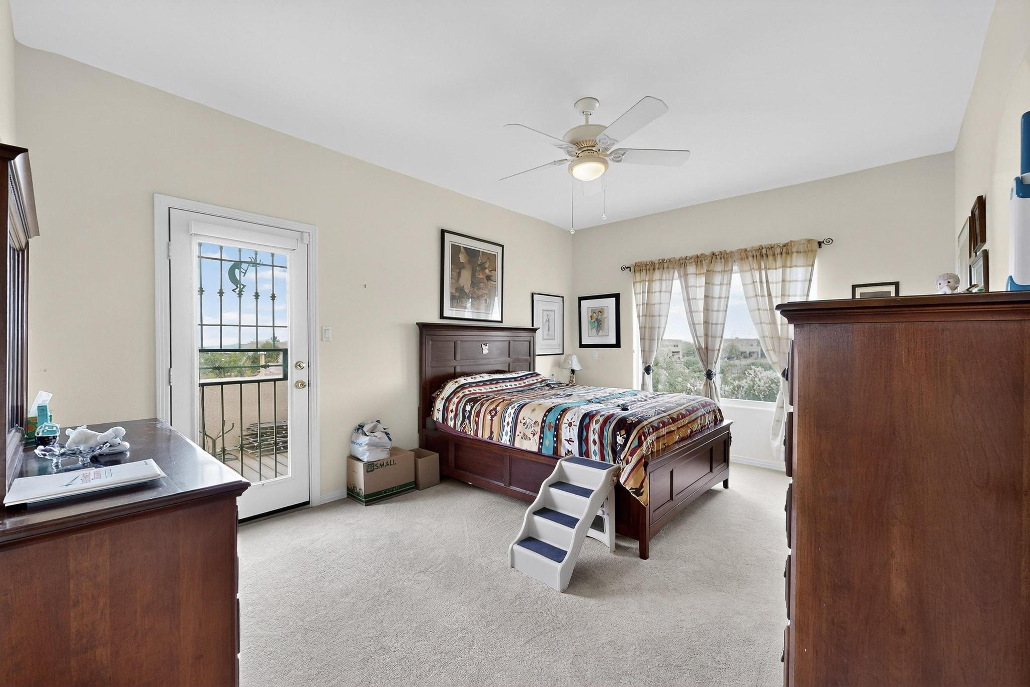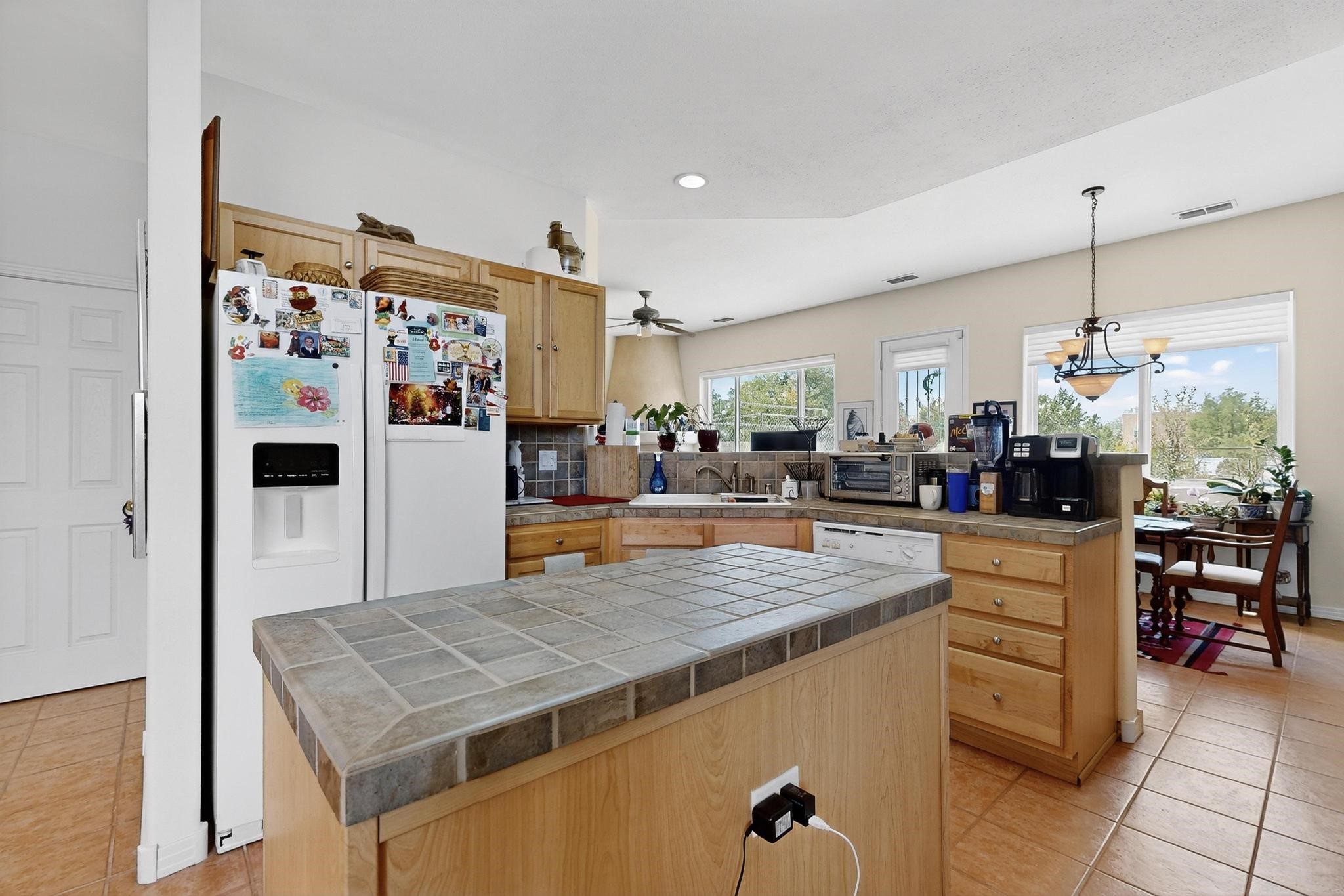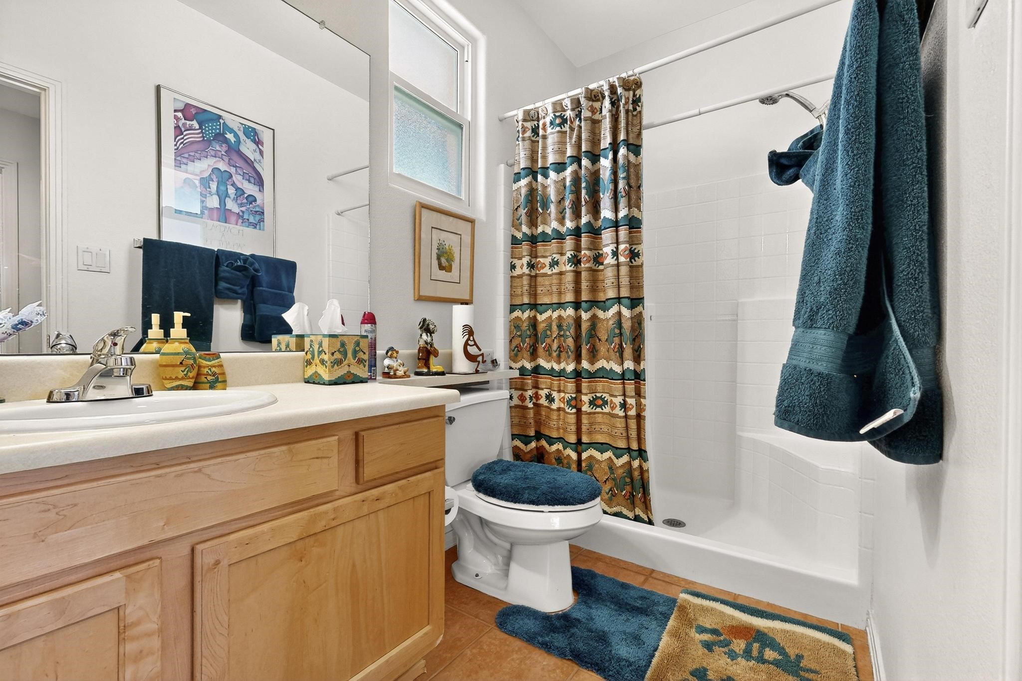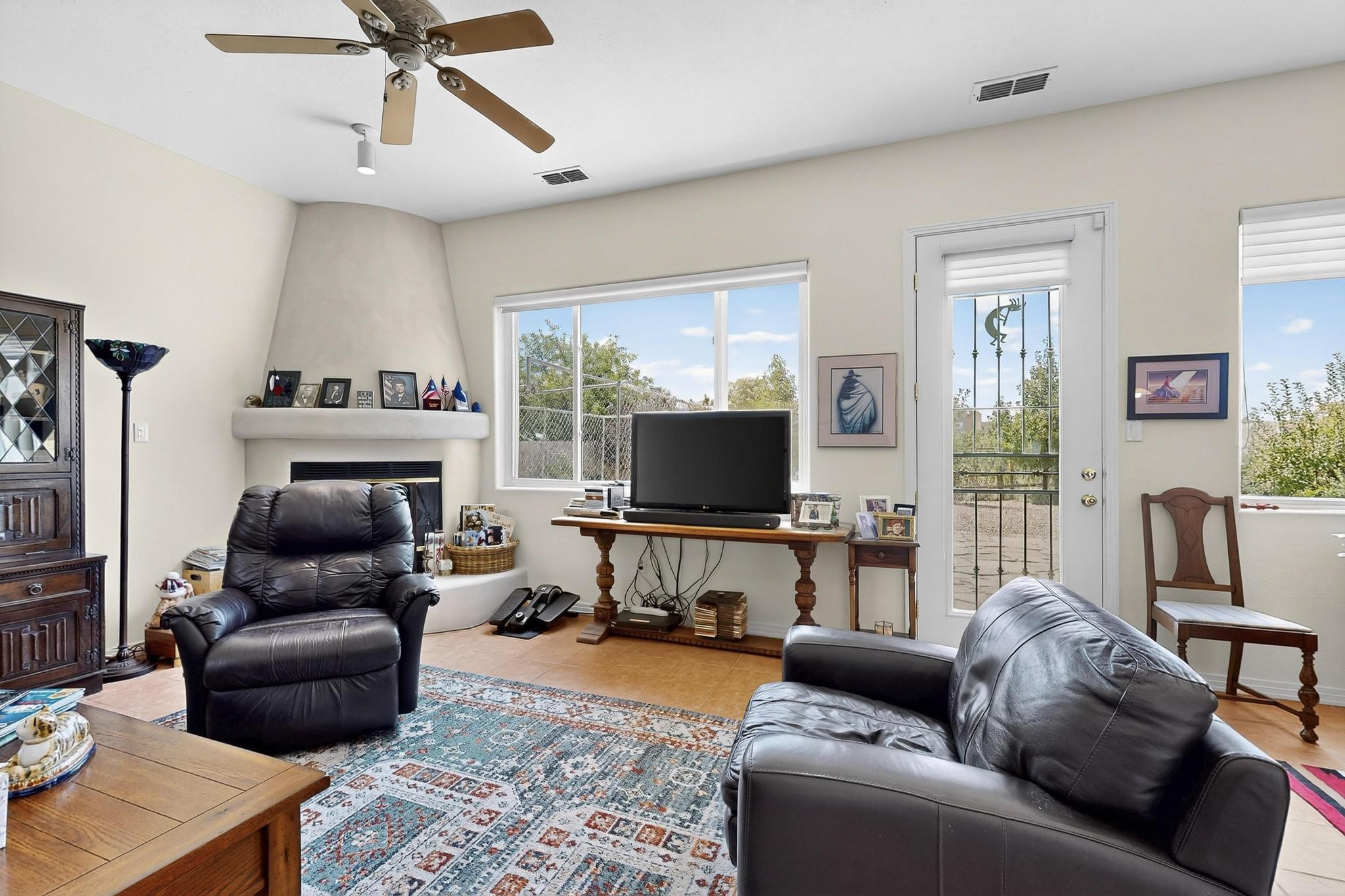 This well maintained 4 bedroom, 3 bath home is located on the southside of Santa Fe in the Sunset Ridge subdivision, is sited on a larger corner lot and backs up to a greenbelt/arroyo enjoying views of the neighboring mountain ranges! Features include raised ceilings, tile countertops, skylights, a trex deck, fenced yard and landscaping. Step inside and enjoy the warm and inviting feel this open floor plan has to offer. The large kitchen features a center island and includes a cozy breakfast nook. There is a downstairs bedroom and bath just off the living room. The spacious main bedroom upstairs features new carpeting, a large walk-in closet and en-suite bath. Take your coffee and sit out on your private deck and enjoy the views! The second floor also features a large bonus room that includes a closet - could make a 5th bedroom, TV room or whatever your imagination can dream up! Recent improvements include a new HVAC system and new carpet in the MB, hallway and bedroom downstairs. This home is move-in ready and just waiting for you to make it your own!!