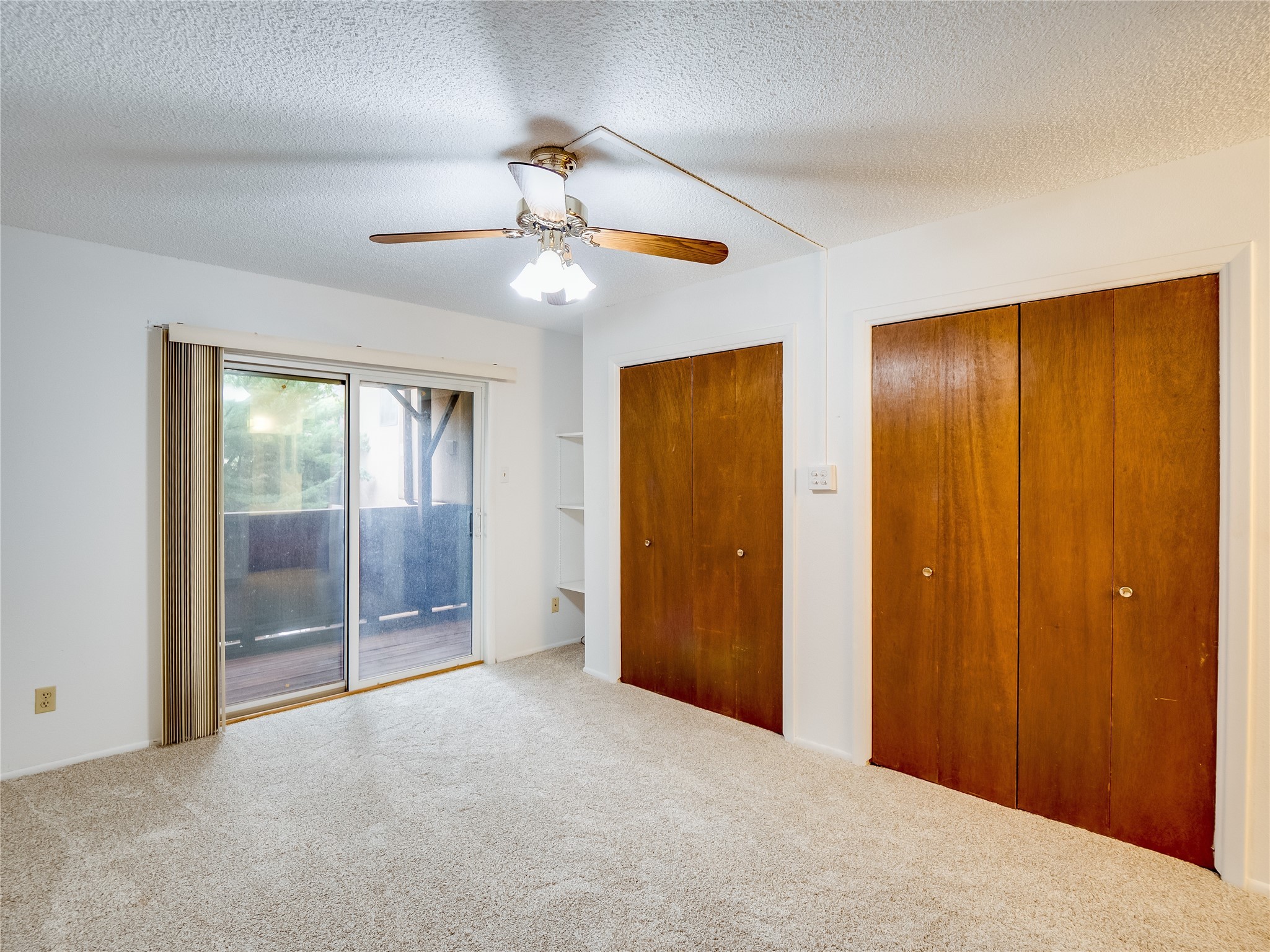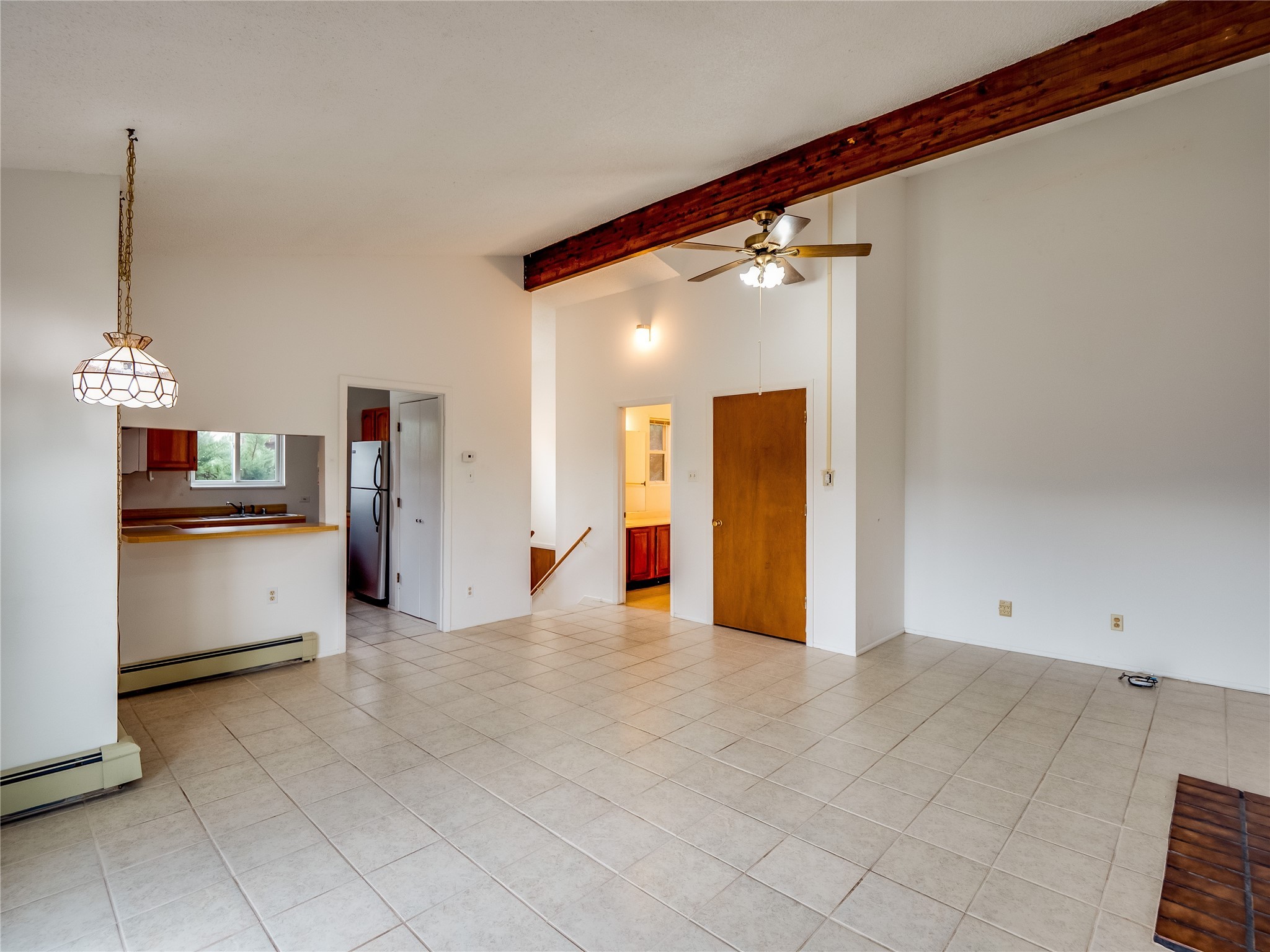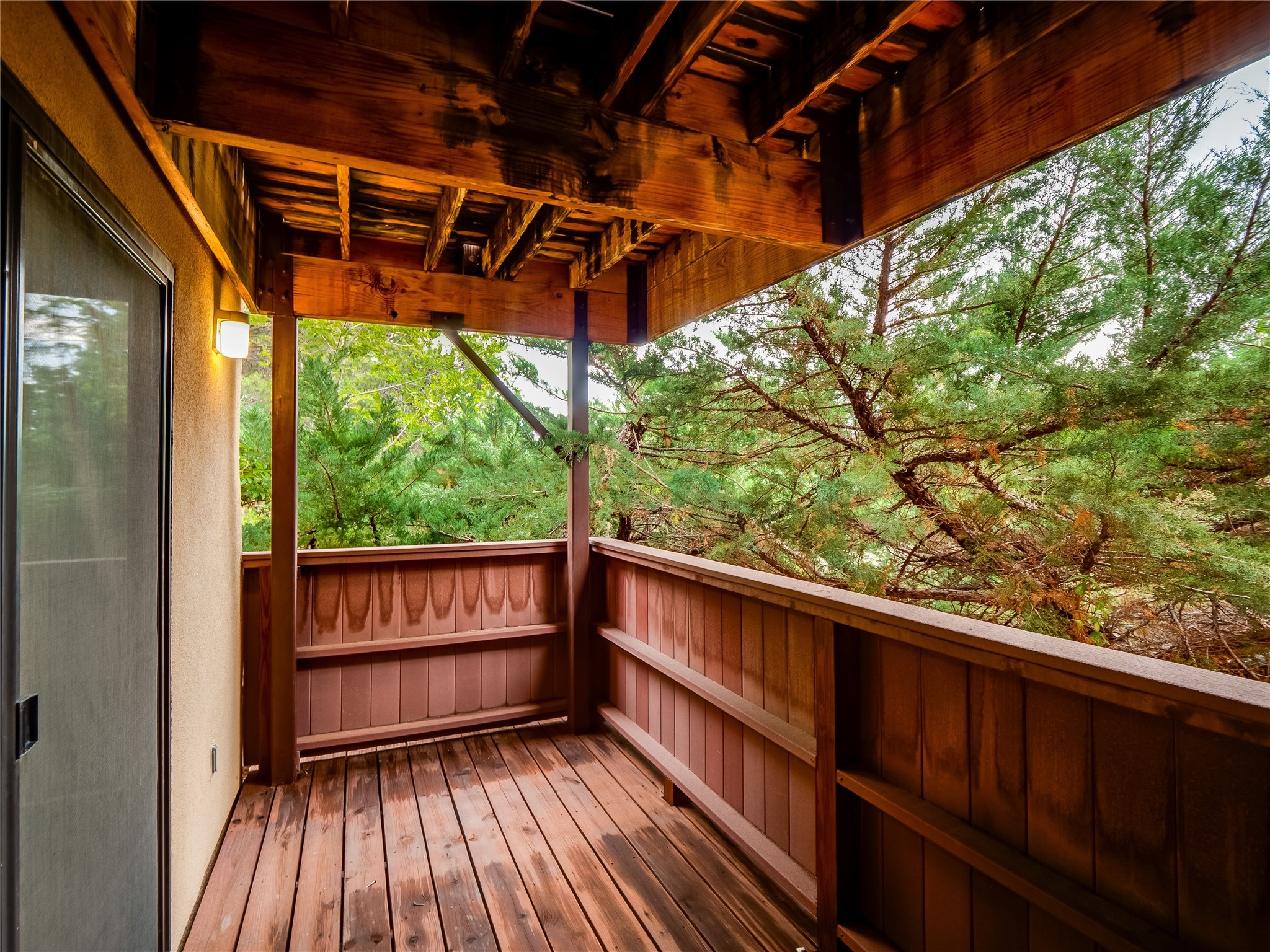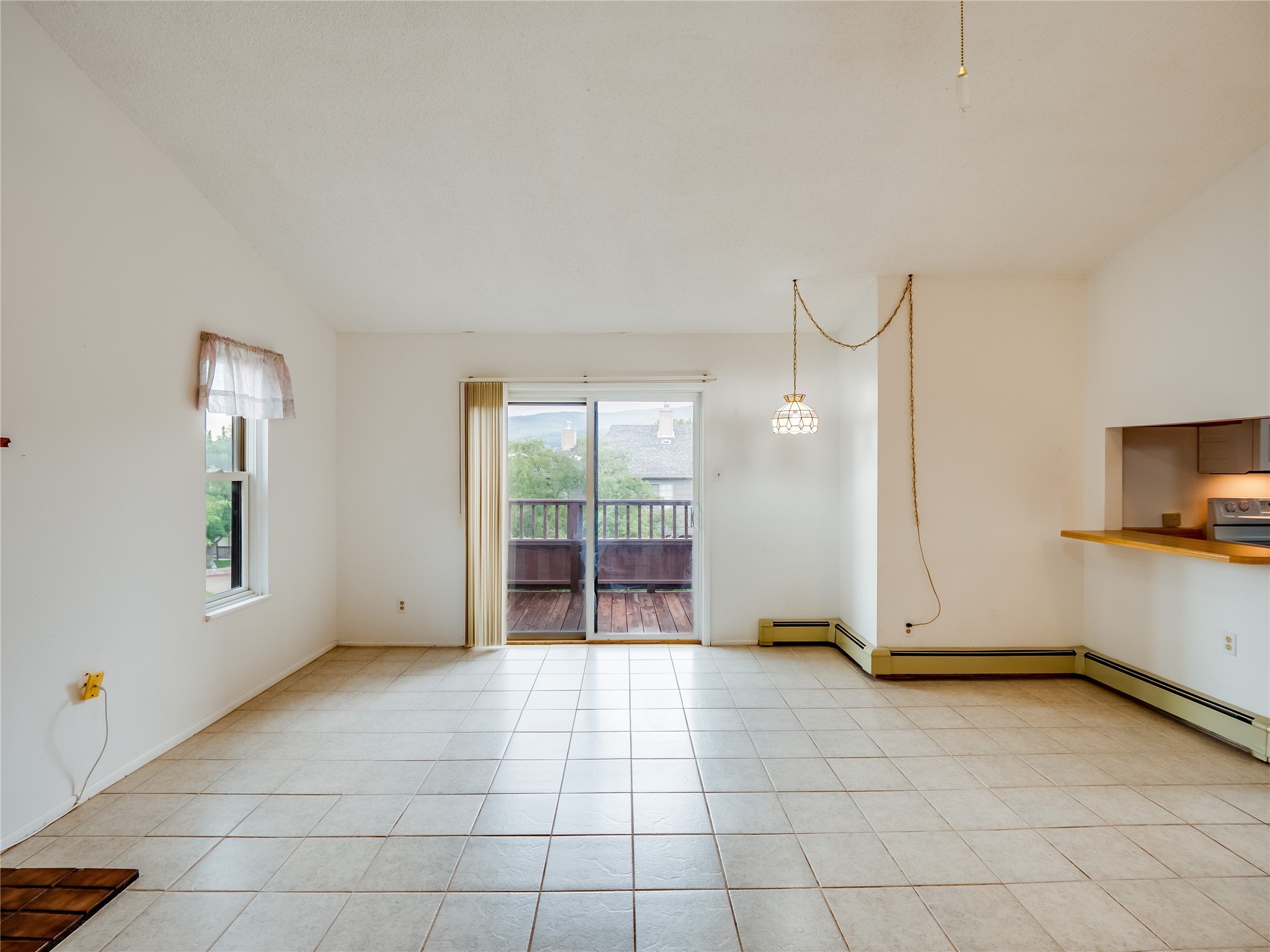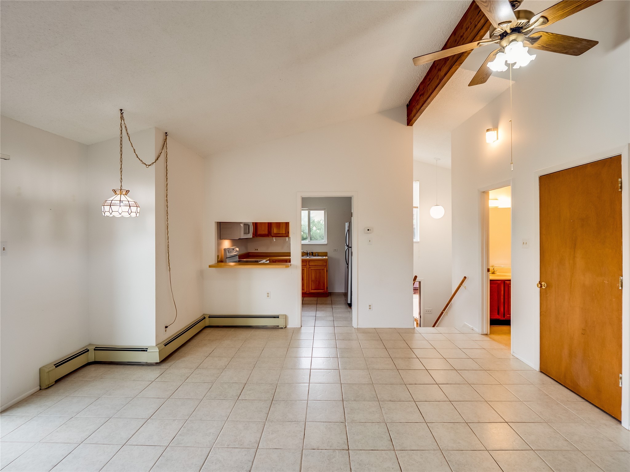 Welcome to this charming two-story condo located in the desirable Eastern area, offering comfort, functionality, and inviting spaces both indoors and out. Step through the front entrance and head upstairs to the main living level, where natural light fills the open-concept living and dining area. Vaulted ceilings and tile flooring create a bright, airy atmosphere, while the centerpiece wood-burning fireplace adds warmth and character. Sliding glass doors lead to a spacious wood deck with stunning mountain views--perfect for outdoor lounging, morning coffee, or summer BBQs. The kitchen is conveniently connected to the dining space, featuring wood cabinetry, a stainless steel refrigerator, a pantry, and a peninsula counter with a pass-through window for easy serving and conversation. Also on this level is a generous powder room, complete with a long vanity and single sink. Downstairs, brand-new plush carpet adds comfort throughout. This level includes a spacious guest bedroom and a private primary en-suite. The primary retreat boasts a large bedroom with double closets and access to a secluded deck--an ideal spot for unwinding at the end of the day. A shared full bathroom offers a tiled shower/tub and a single-sink vanity. For added convenience, a laundry closet with included washer and dryer, along with a deep storage closet, completes the lower level. This property also comes with a detached one-car garage, providing covered parking and extra storage space. Set in a quiet location close to parks, trails, shopping, and entertainment, this condo provides the perfect combination of peaceful living and everyday convenience. Don't miss the opportunity to make this inviting property yours--schedule a tour today!