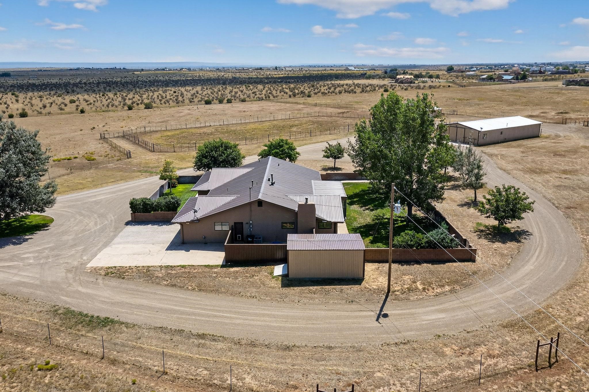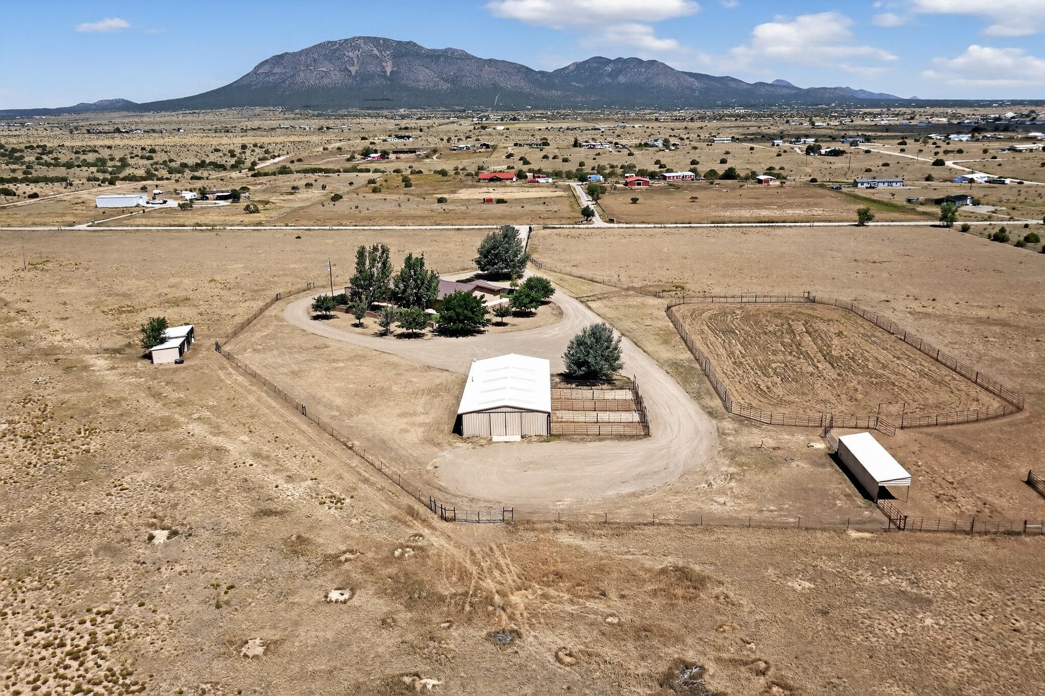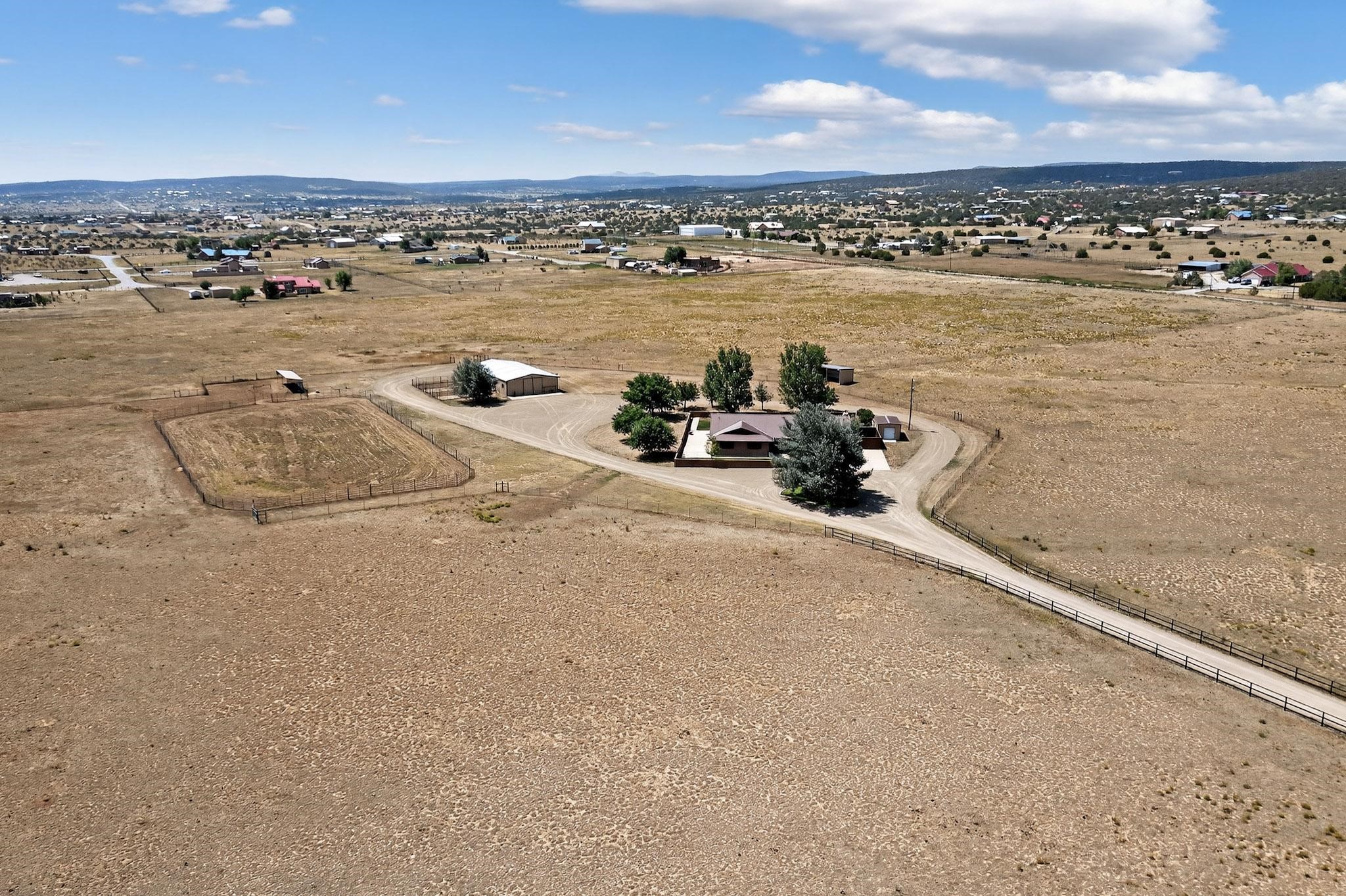 This true equine estate has finally come on the market so don't miss your opportunity to own this amazing property. 38.8 acres fully fenced and cross fenced! 3051 heated sqft of main home and guest suite. This estate home boasts hardwood floors throughout, with custom touches, large spacious open floor plan with great room and kitchen for entertaining, primary bedroom suite with wall to wall closets, double vanities, and exterior access. 3bed 2bath main home, 2 living areas, gourmet stainless steel kitchen, laundry room with storage. There are so many built in storage and closets the possibilities are endless on how you use it. Oversized finished 2 car garage with built in storage. 4 stall barn with finished tack room, and 1 bedroom, 1 bath, kitchenette, walk in closet: guest suite.Not only are you going to love this estate, but your animals will love it too! Full sized arena for your use and three cross fenced pastures all with barn loafing sheds. Water has been run throughout the property to the barns for the convenience of keeping the critters taken care of. The approx. 2300 sqft barn has pull through capability, a finished tack room, 4 walk out stalls, hay storage, rubber floor mats, and a 363 sqft guest living quarters! A large equine estate like this doesn't come up for sale in the East Mountains/Southern Santa Fe County area too often, and none are as nice and custom as this property. If you are needing a place to kick up your boots, let your critters stretch their legs, and for yourself to relax from dawn to dusk, you have found your 38.8 acre slice of paradise with this equine estate.