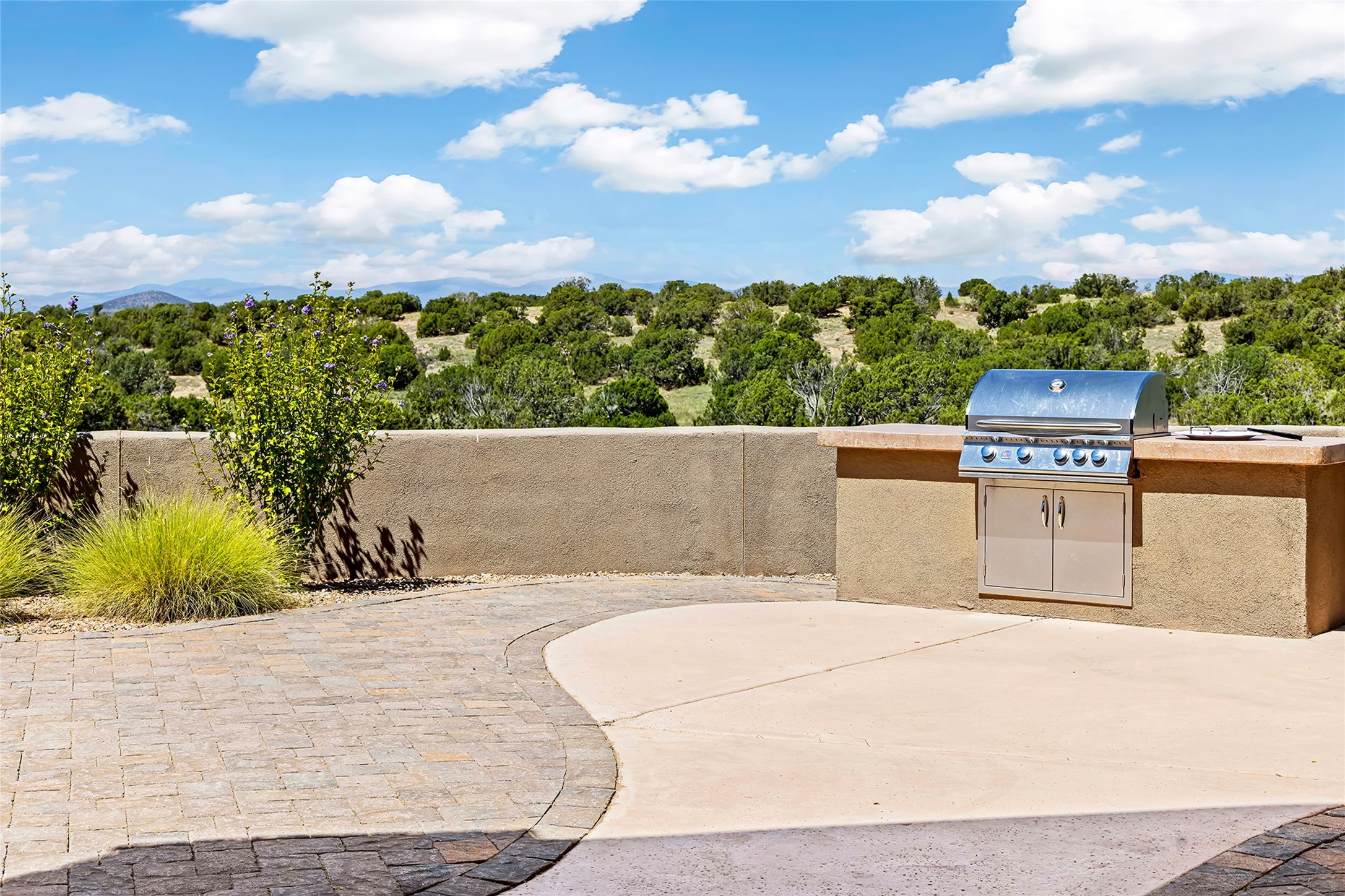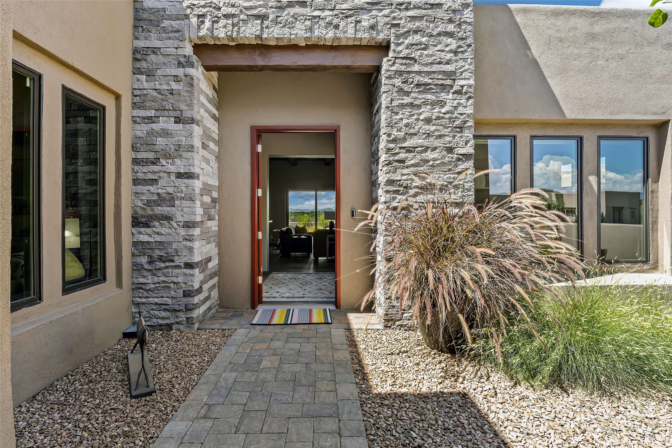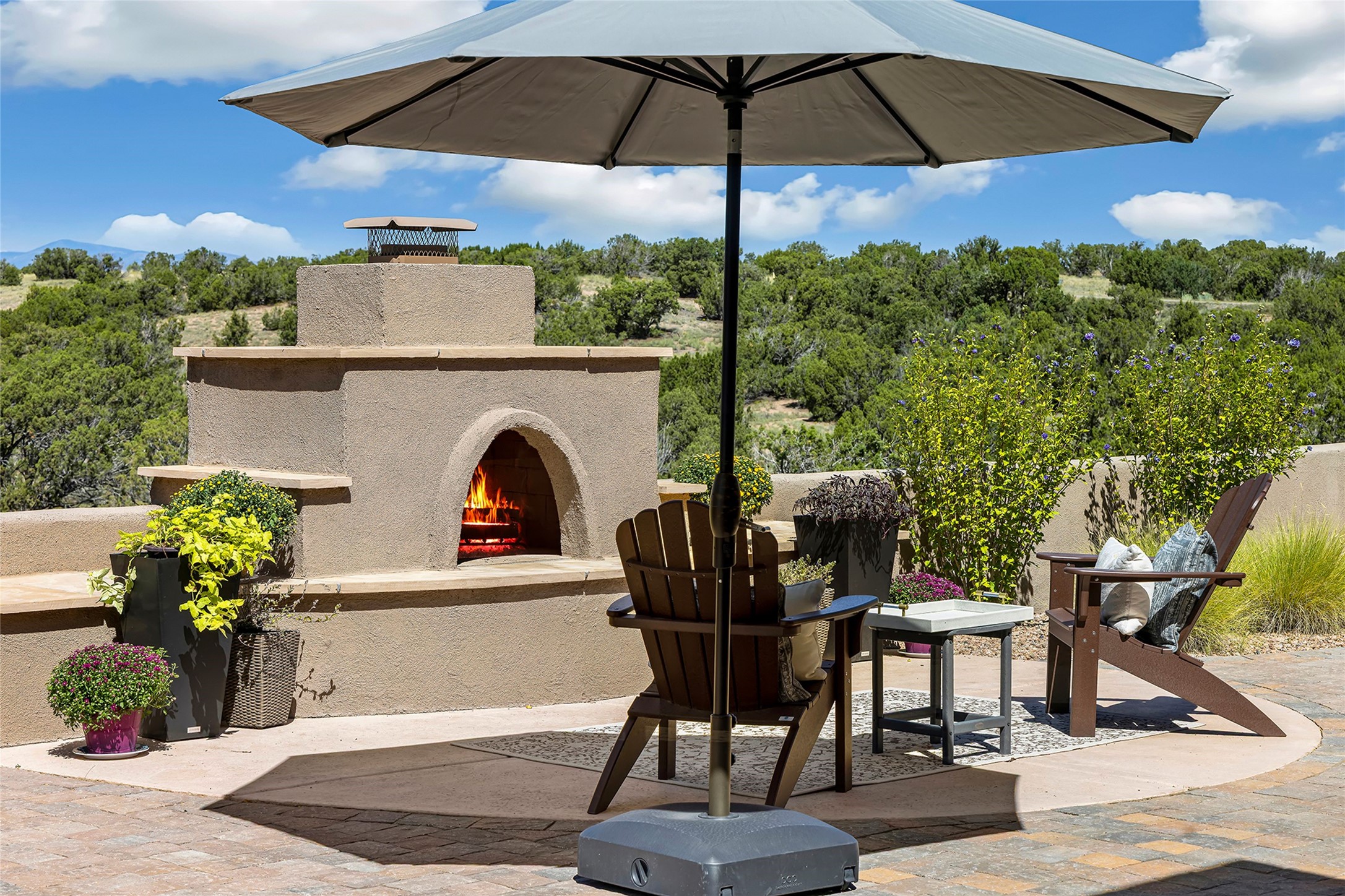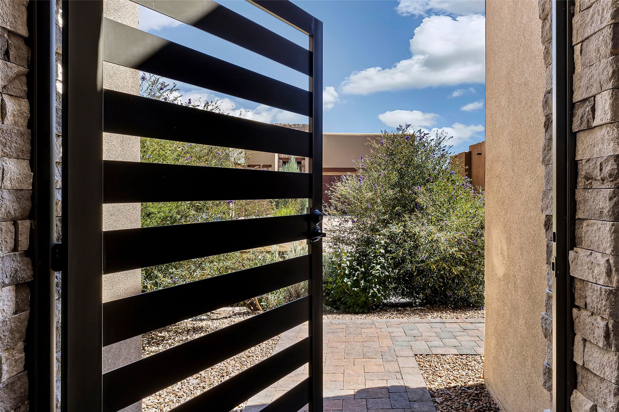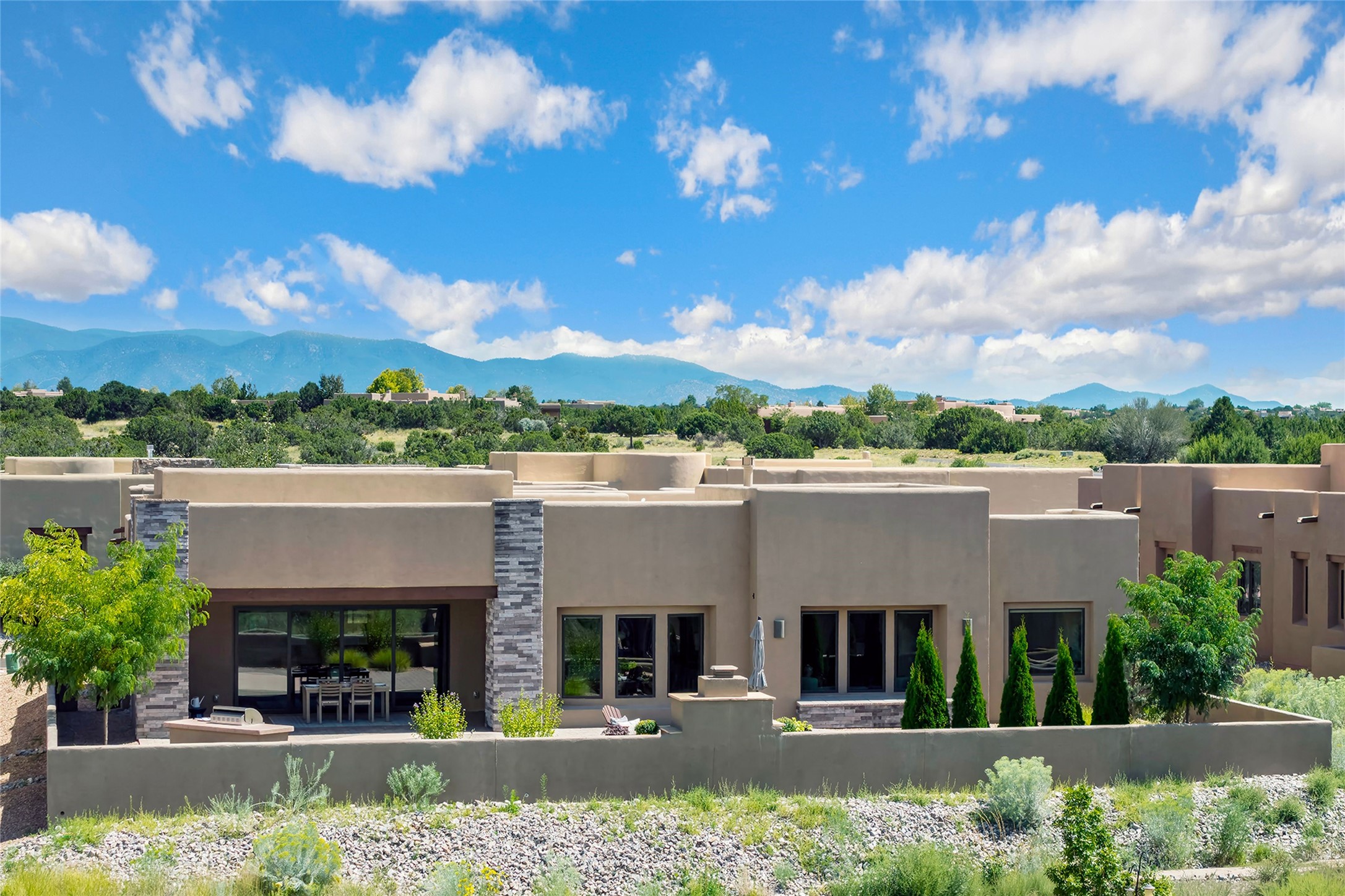 Live the Ultimate Las Campanas Lifestyle. Perfectly sited on a premier elevated lot with Jemez Mountain and dramatic sunset views, this exciting 2022-built residence with a private casita and 3-car garage is a rare offering. Located within walking distance of The Club at Las Campanas, this exceptional home seamlessly blends sophisticated modern design with the true essence of Santa Fe. The gated front entrance opens to an intimate courtyard with a tranquil fountain, which connects the main home and casita. Thoughtfully designed, this floor plan highlights a spectacular living room ideal for both relaxed living and grand entertaining with western views which frame the space, rich wood plank and and beam ceiling accents, a modern gas fireplace with surround stacked stone, wet bar or barista area and retractable glass doors which create a true indoor-outdoor living experience. The chef's island kitchen is a delight, featuring natural stone counters, a generous breakfast bar, Wolf 6-burner range with double ovens and griddle, a Wolf wall oven and microwave, Sub-Zero refrigerator, dual dishwashers and a large walk-in pantry. This culinary haven flows into a gracious dining room with mountain views and designer lighting. The private, luxurious primary suite offers beautiful Jemez Mountain views, a cozy sitting area with fireplace and a spa-inspired bath with a soaking tub, walk-through shower, dual vanities and a custom walk-in closet. Separate from the main living areas are two guest suites, each with ensuite baths, which share a secondary living area or media room. The dedicated office with courtyard views provides an ideal work-from-home setting, while the separate casita with a 3/4 bath is an ideal guest quarters or studio. Outdoor living is elevated with multiple entertainment areas, a covered portal, two outdoor fireplaces and a built-in BBQ. This special home with smart-home technology and soft natural light throughout, defines excellence and is not to be missed.