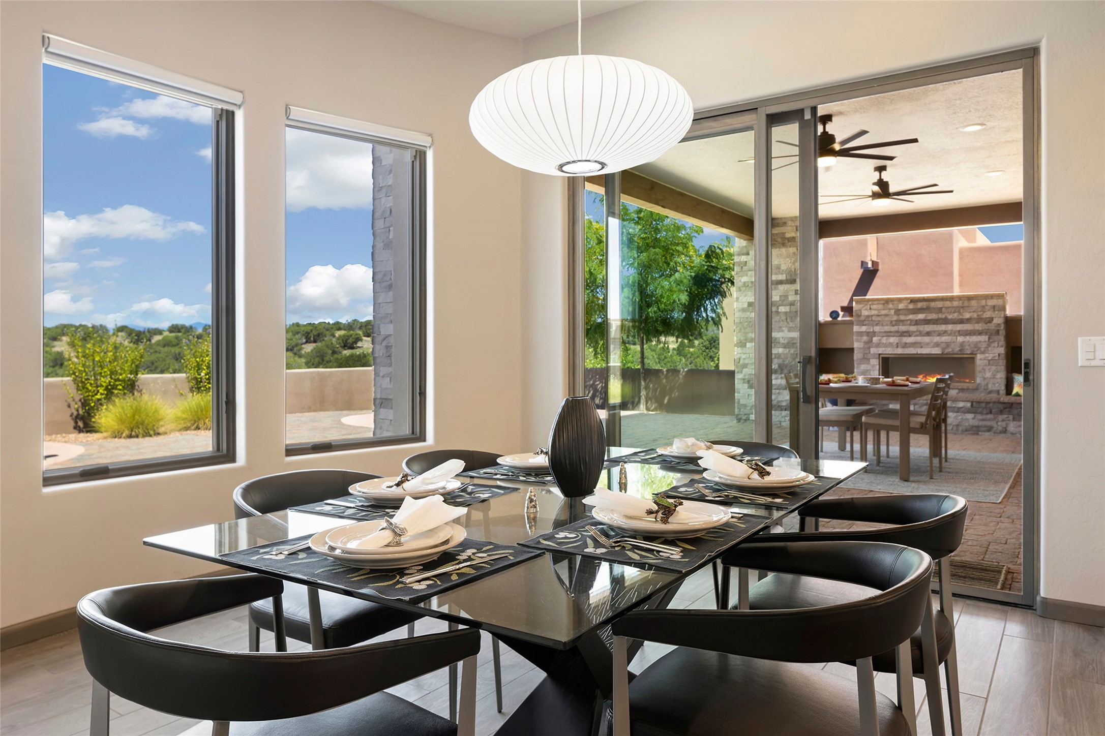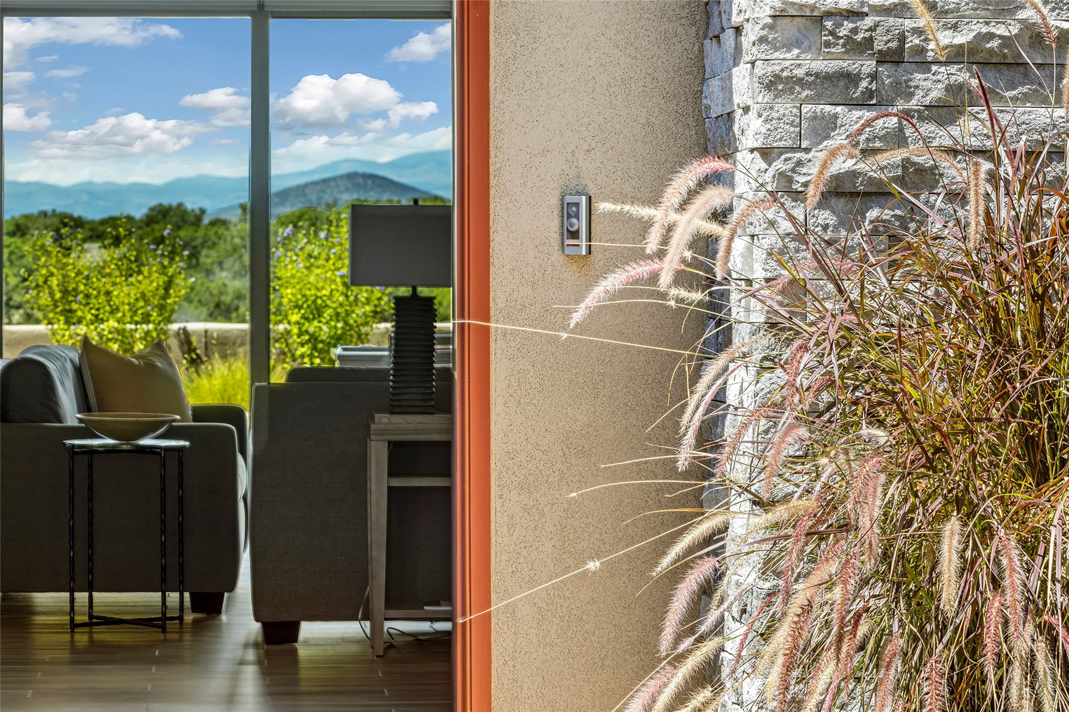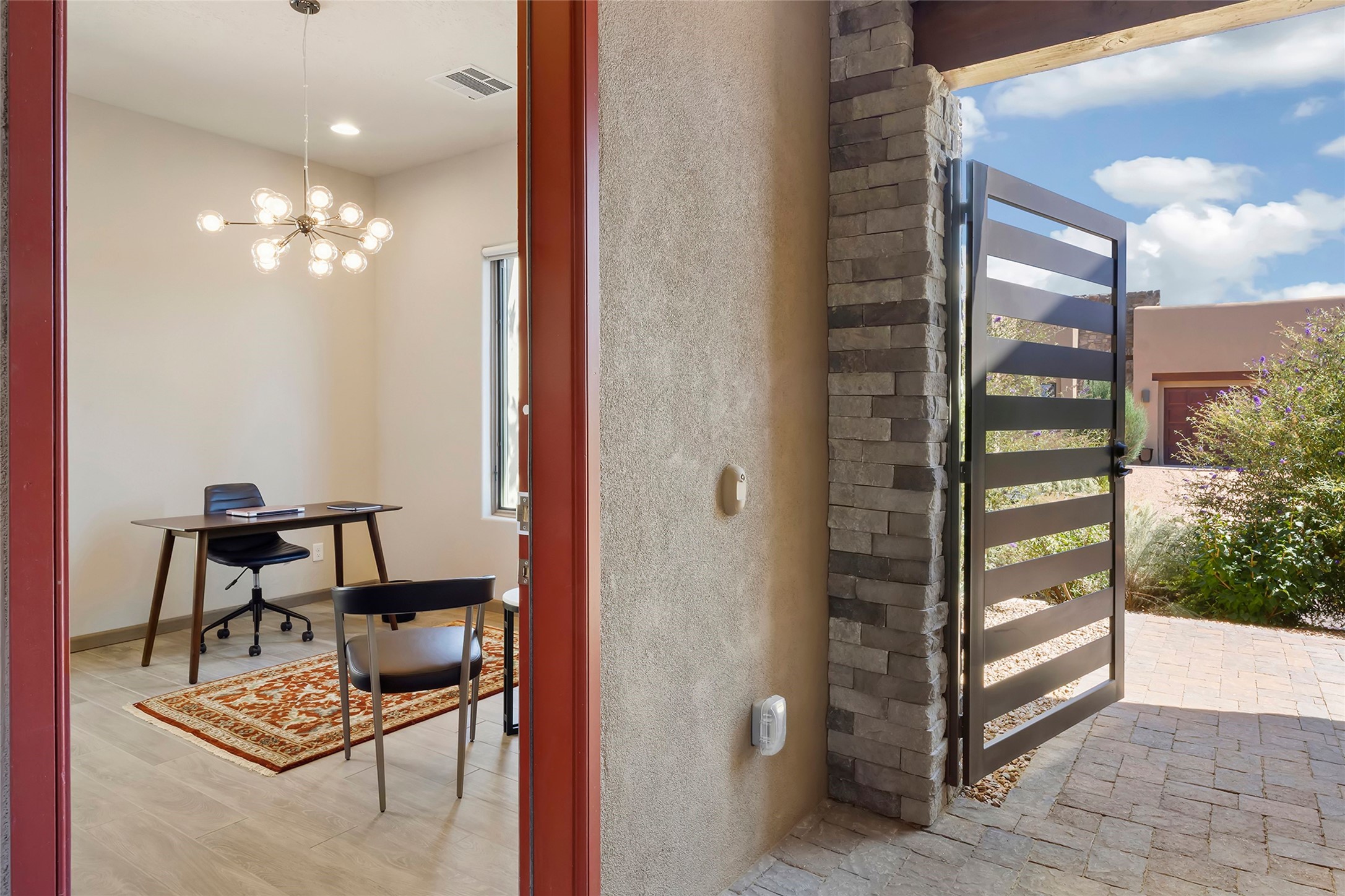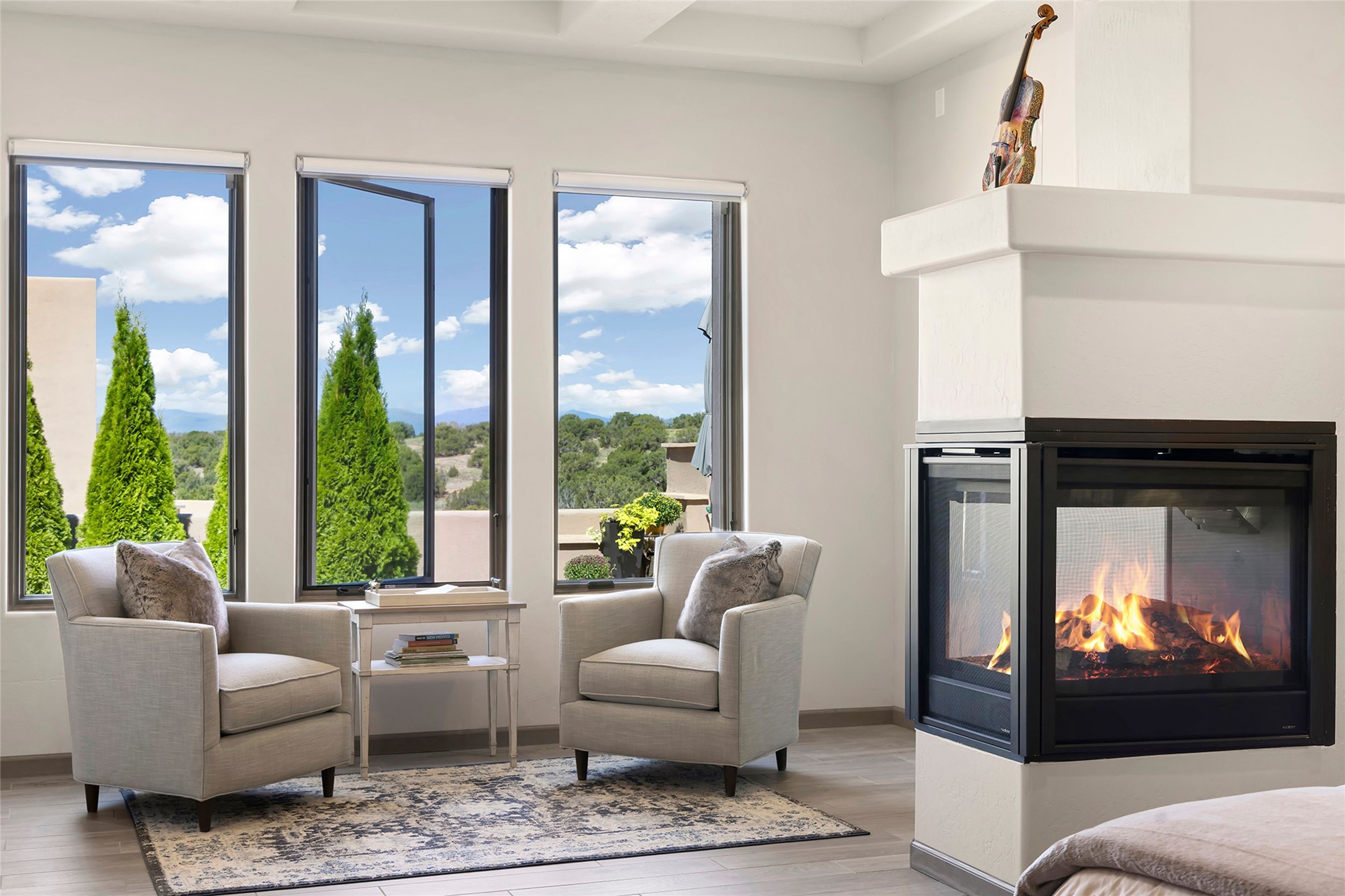 Live the Ultimate Las Campanas Lifestyle. Perfectly sited on a premier elevated lot with Jemez Mountain and dramatic sunset views, this exciting 2022-built residence with a private casita and 3-car garage is a rare offering. Located within walking distance of The Club at Las Campanas, this exceptional home seamlessly blends sophisticated modern design with the true essence of Santa Fe. The gated front entrance opens to an intimate courtyard with a tranquil fountain, which connects the main home and casita. Thoughtfully designed, this floor plan highlights a spectacular living room ideal for both relaxed living and grand entertaining with western views which frame the space, rich wood plank and and beam ceiling accents, a modern gas fireplace with surround stacked stone, wet bar or barista area and retractable glass doors which create a true indoor-outdoor living experience. The chef's island kitchen is a delight, featuring natural stone counters, a generous breakfast bar, Wolf 6-burner range with double ovens and griddle, a Wolf wall oven and microwave, Sub-Zero refrigerator, dual dishwashers and a large walk-in pantry. This culinary haven flows into a gracious dining room with mountain views and designer lighting. The private, luxurious primary suite offers beautiful Jemez Mountain views, a cozy sitting area with fireplace and a spa-inspired bath with a soaking tub, walk-through shower, dual vanities and a custom walk-in closet. Separate from the main living areas are two guest suites, each with ensuite baths, which share a secondary living area or media room. The dedicated office with courtyard views provides an ideal work-from-home setting, while the separate casita with a 3/4 bath is an ideal guest quarters or studio. Outdoor living is elevated with multiple entertainment areas, a covered portal, two outdoor fireplaces and a built-in BBQ. This special home with smart-home technology and soft natural light throughout, defines excellence and is not to be missed.