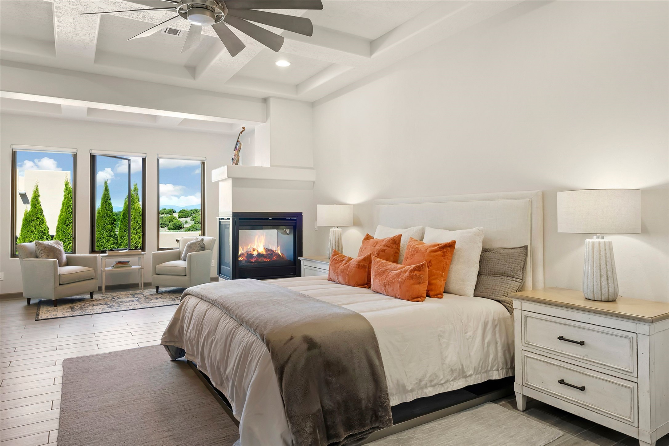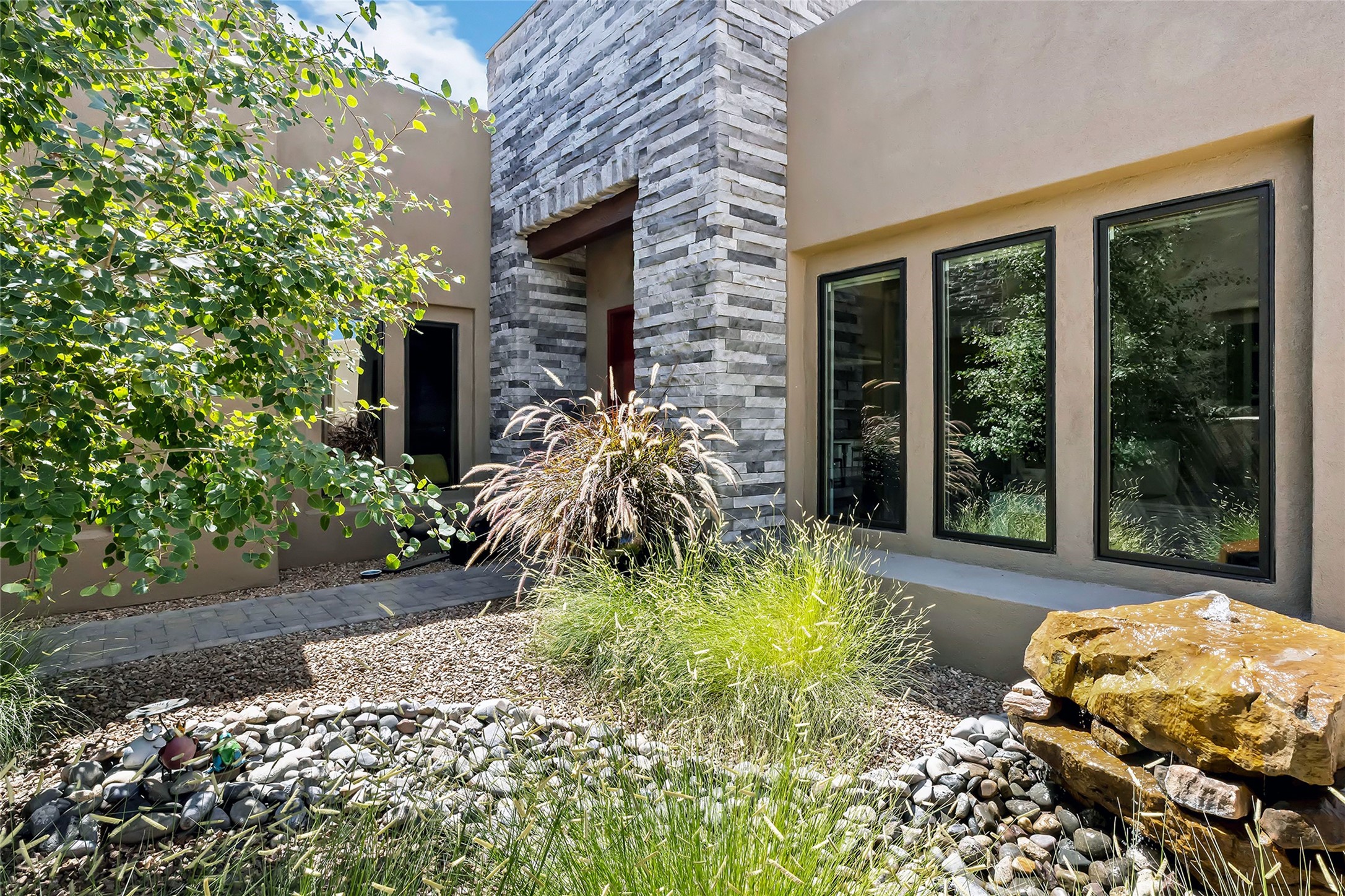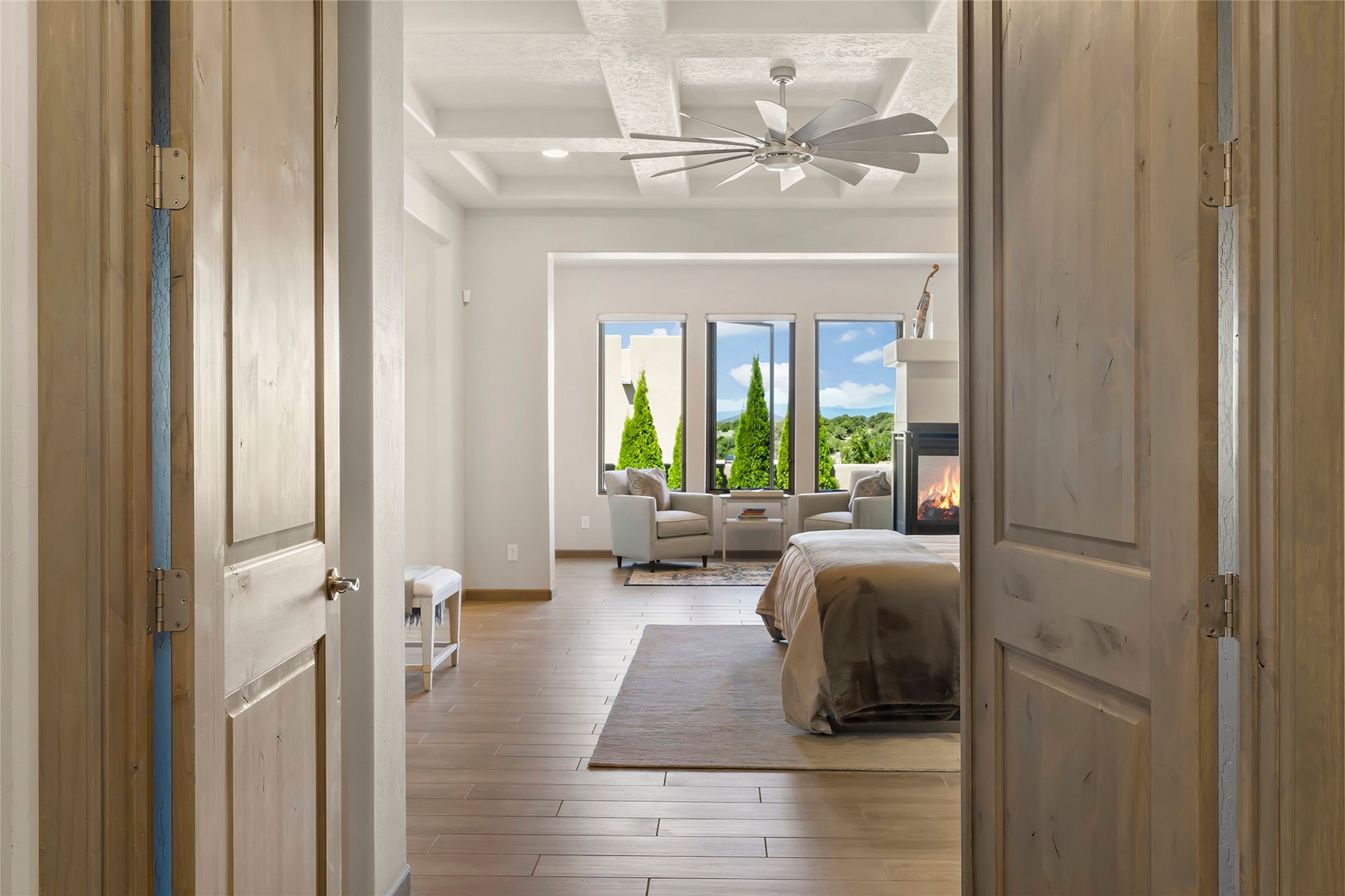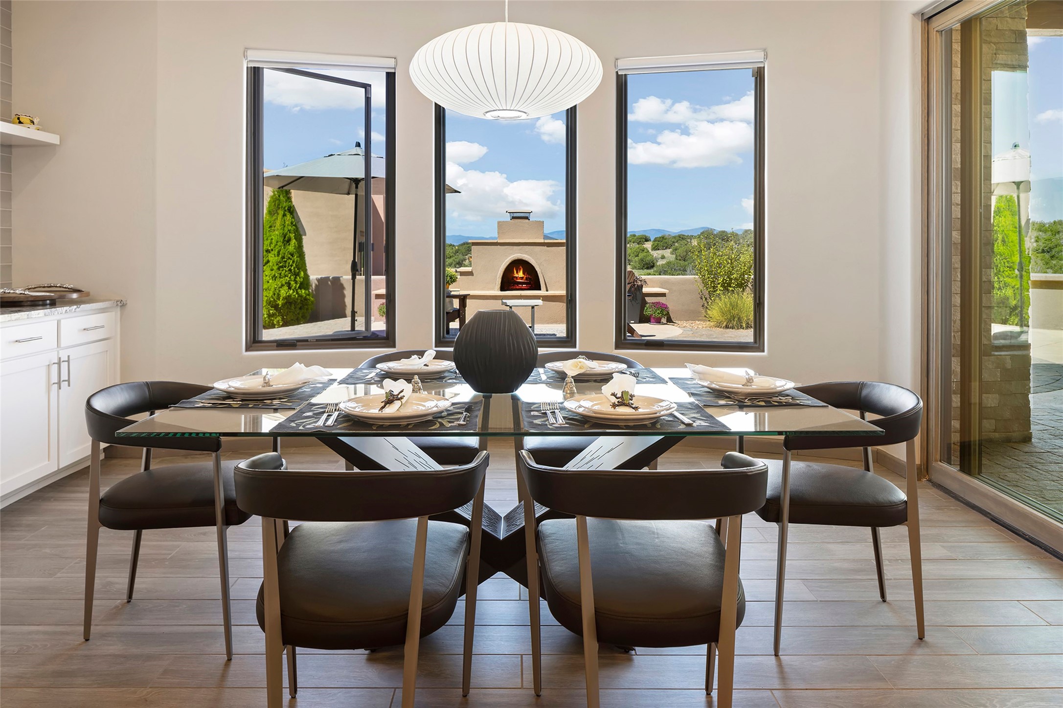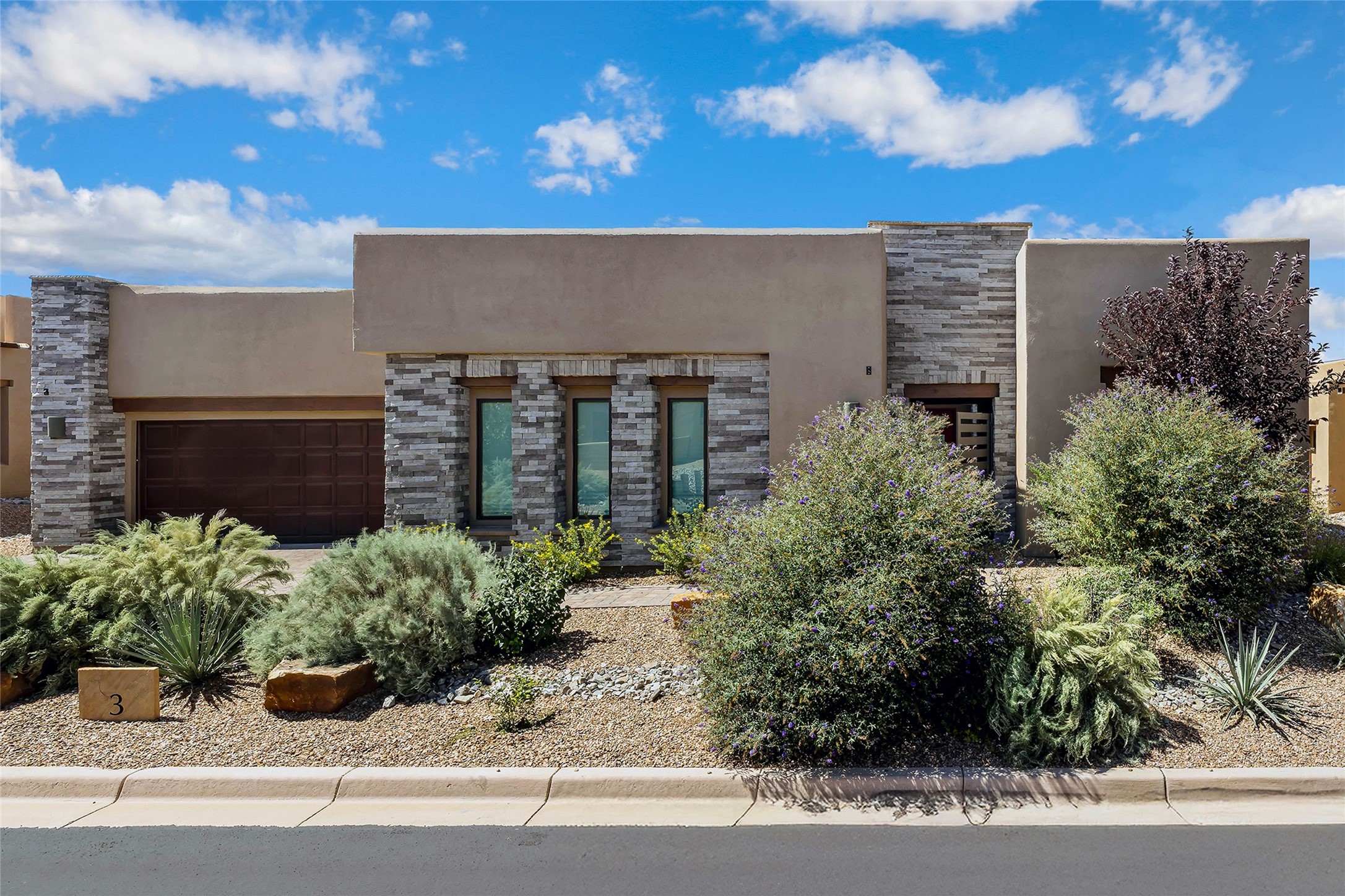 Live the Ultimate Las Campanas Lifestyle. Perfectly sited on a premier elevated lot with Jemez Mountain and dramatic sunset views, this exciting 2022-built residence with a private casita and 3-car garage is a rare offering. Located within walking distance of The Club at Las Campanas, this exceptional home seamlessly blends sophisticated modern design with the true essence of Santa Fe. The gated front entrance opens to an intimate courtyard with a tranquil fountain, which connects the main home and casita. Thoughtfully designed, this floor plan highlights a spectacular living room ideal for both relaxed living and grand entertaining with western views which frame the space, rich wood plank and and beam ceiling accents, a modern gas fireplace with surround stacked stone, wet bar or barista area and retractable glass doors which create a true indoor-outdoor living experience. The chef's island kitchen is a delight, featuring natural stone counters, a generous breakfast bar, Wolf 6-burner range with double ovens and griddle, a Wolf wall oven and microwave, Sub-Zero refrigerator, dual dishwashers and a large walk-in pantry. This culinary haven flows into a gracious dining room with mountain views and designer lighting. The private, luxurious primary suite offers beautiful Jemez Mountain views, a cozy sitting area with fireplace and a spa-inspired bath with a soaking tub, walk-through shower, dual vanities and a custom walk-in closet. Separate from the main living areas are two guest suites, each with ensuite baths, which share a secondary living area or media room. The dedicated office with courtyard views provides an ideal work-from-home setting, while the separate casita with a 3/4 bath is an ideal guest quarters or studio. Outdoor living is elevated with multiple entertainment areas, a covered portal, two outdoor fireplaces and a built-in BBQ. This special home with smart-home technology and soft natural light throughout, defines excellence and is not to be missed.
