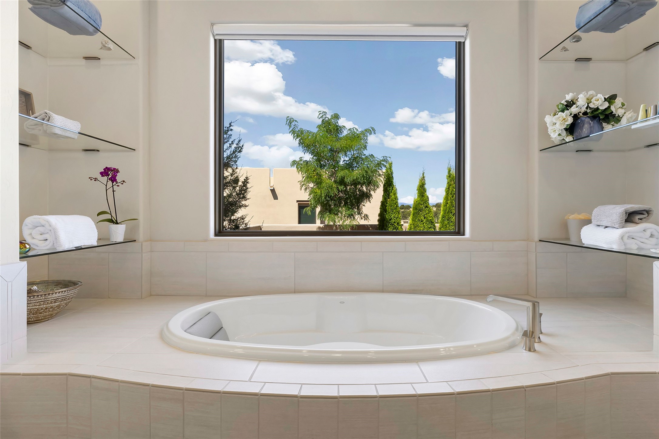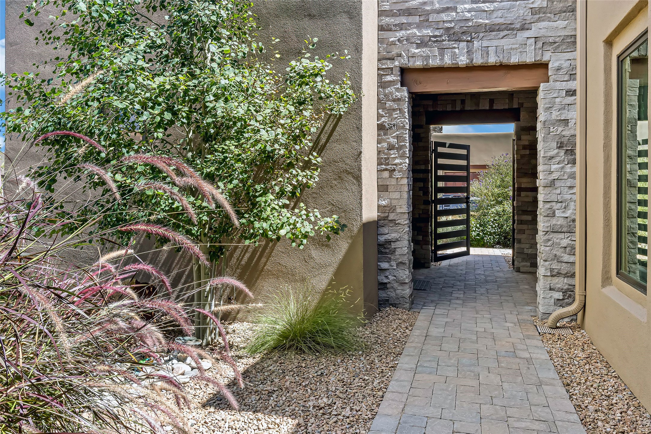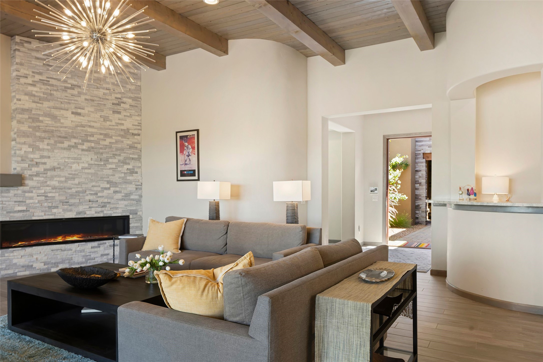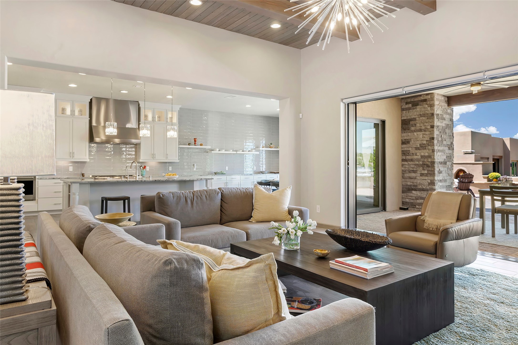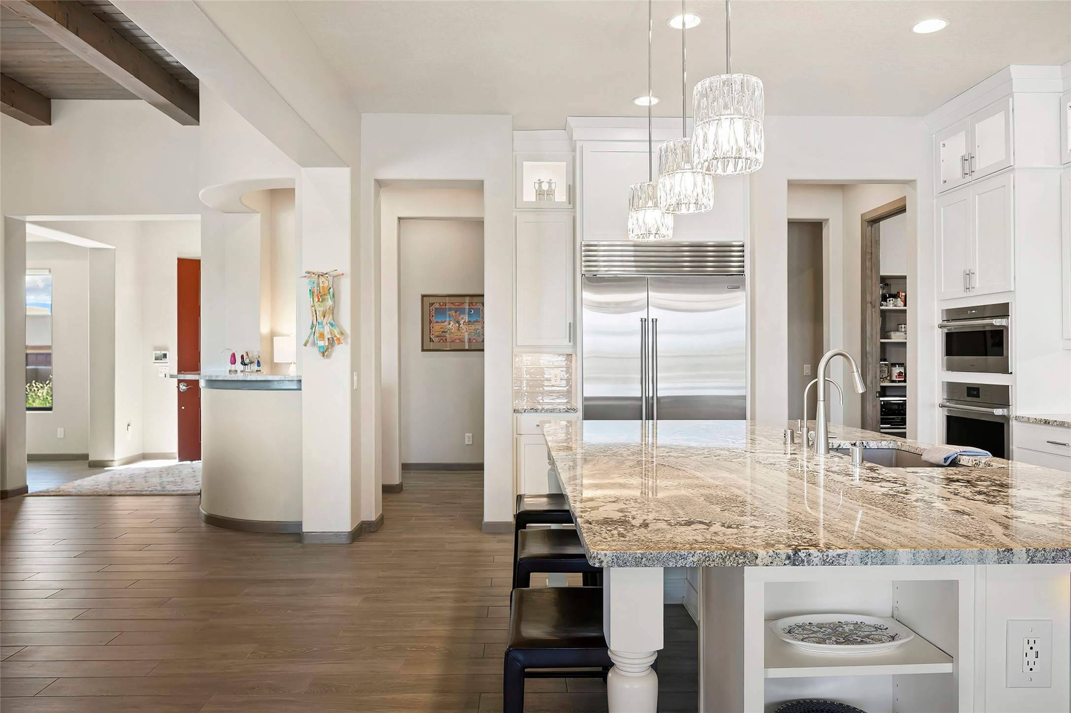 Live the Ultimate Las Campanas Lifestyle. Perfectly sited on a premier elevated lot with Jemez Mountain and dramatic sunset views, this exciting 2022-built residence with a private casita and 3-car garage is a rare offering. Located within walking distance of The Club at Las Campanas, this exceptional home seamlessly blends sophisticated modern design with the true essence of Santa Fe. The gated front entrance opens to an intimate courtyard with a tranquil fountain, which connects the main home and casita. Thoughtfully designed, this floor plan highlights a spectacular living room ideal for both relaxed living and grand entertaining with western views which frame the space, rich wood plank and and beam ceiling accents, a modern gas fireplace with surround stacked stone, wet bar or barista area and retractable glass doors which create a true indoor-outdoor living experience. The chef's island kitchen is a delight, featuring natural stone counters, a generous breakfast bar, Wolf 6-burner range with double ovens and griddle, a Wolf wall oven and microwave, Sub-Zero refrigerator, dual dishwashers and a large walk-in pantry. This culinary haven flows into a gracious dining room with mountain views and designer lighting. The private, luxurious primary suite offers beautiful Jemez Mountain views, a cozy sitting area with fireplace and a spa-inspired bath with a soaking tub, walk-through shower, dual vanities and a custom walk-in closet. Separate from the main living areas are two guest suites, each with ensuite baths, which share a secondary living area or media room. The dedicated office with courtyard views provides an ideal work-from-home setting, while the separate casita with a 3/4 bath is an ideal guest quarters or studio. Outdoor living is elevated with multiple entertainment areas, a covered portal, two outdoor fireplaces and a built-in BBQ. This special home with smart-home technology and soft natural light throughout, defines excellence and is not to be missed.