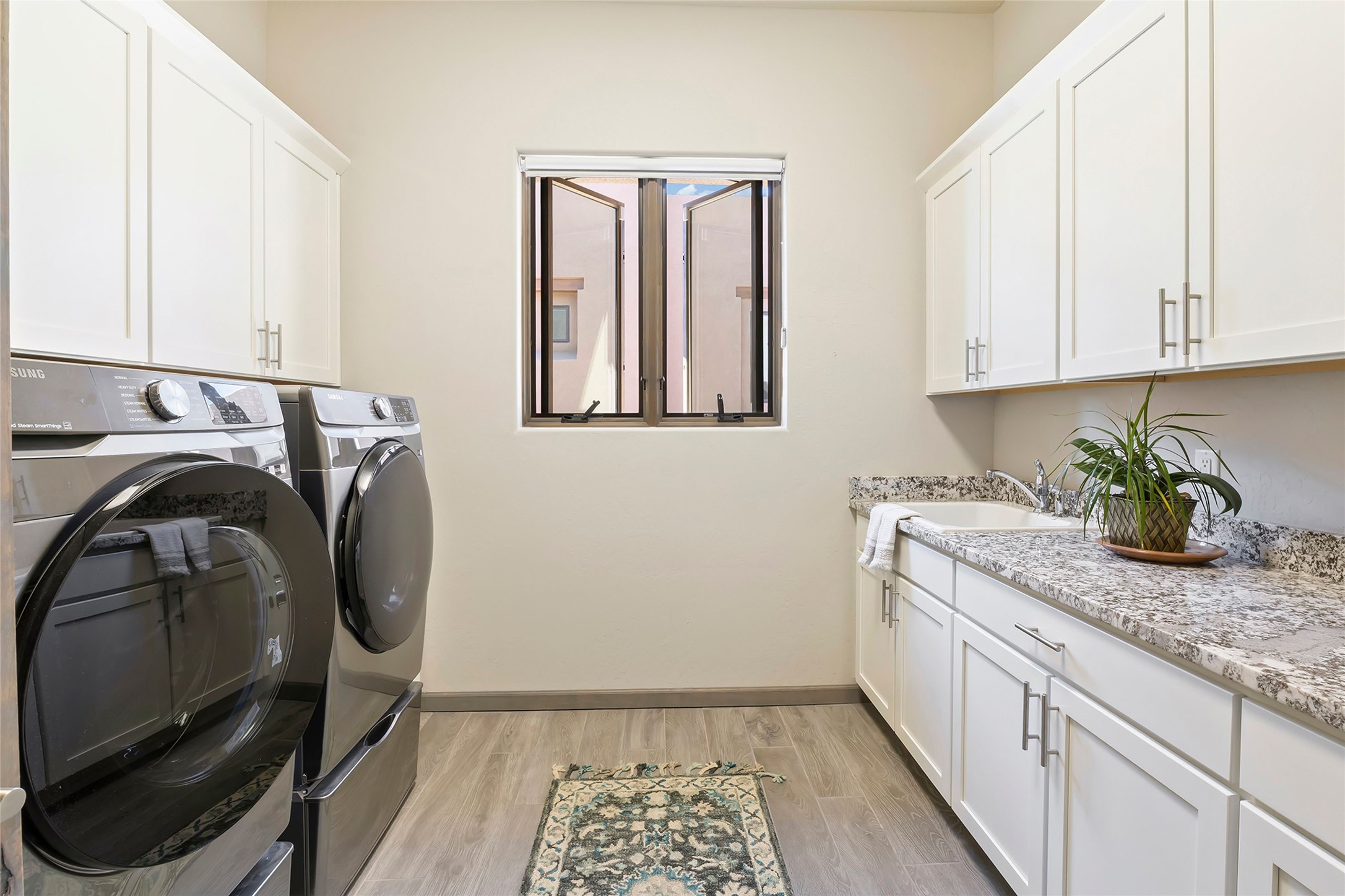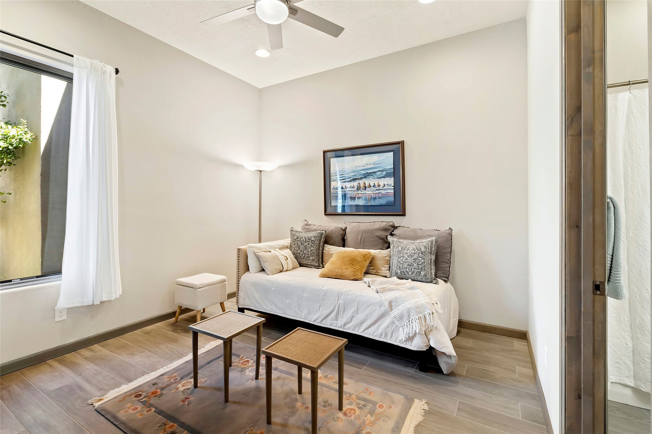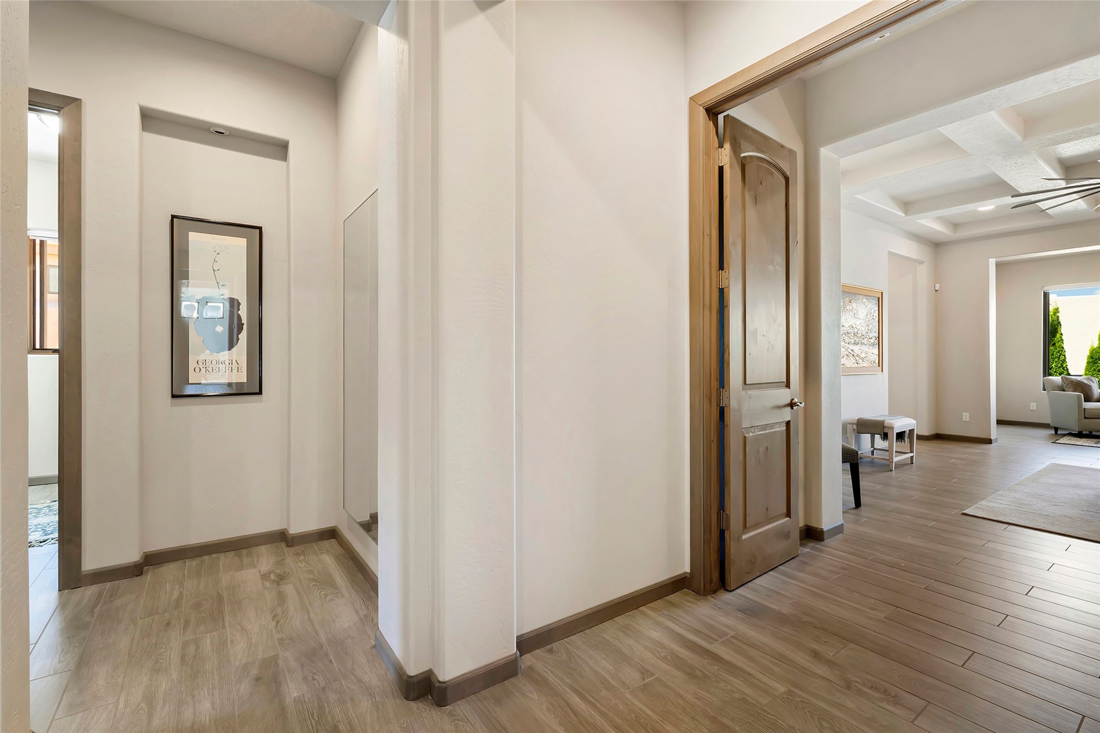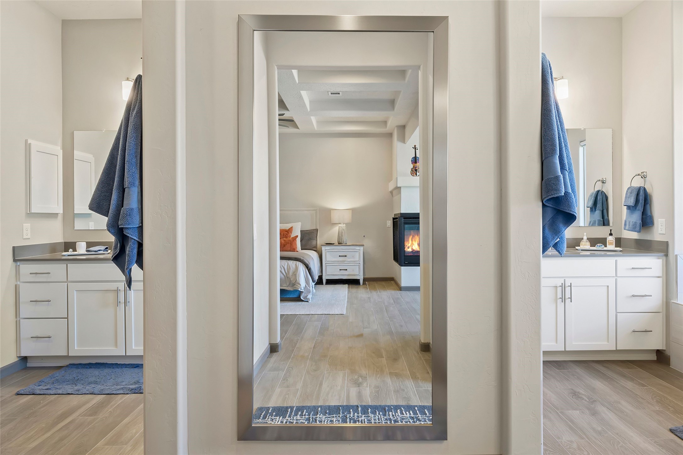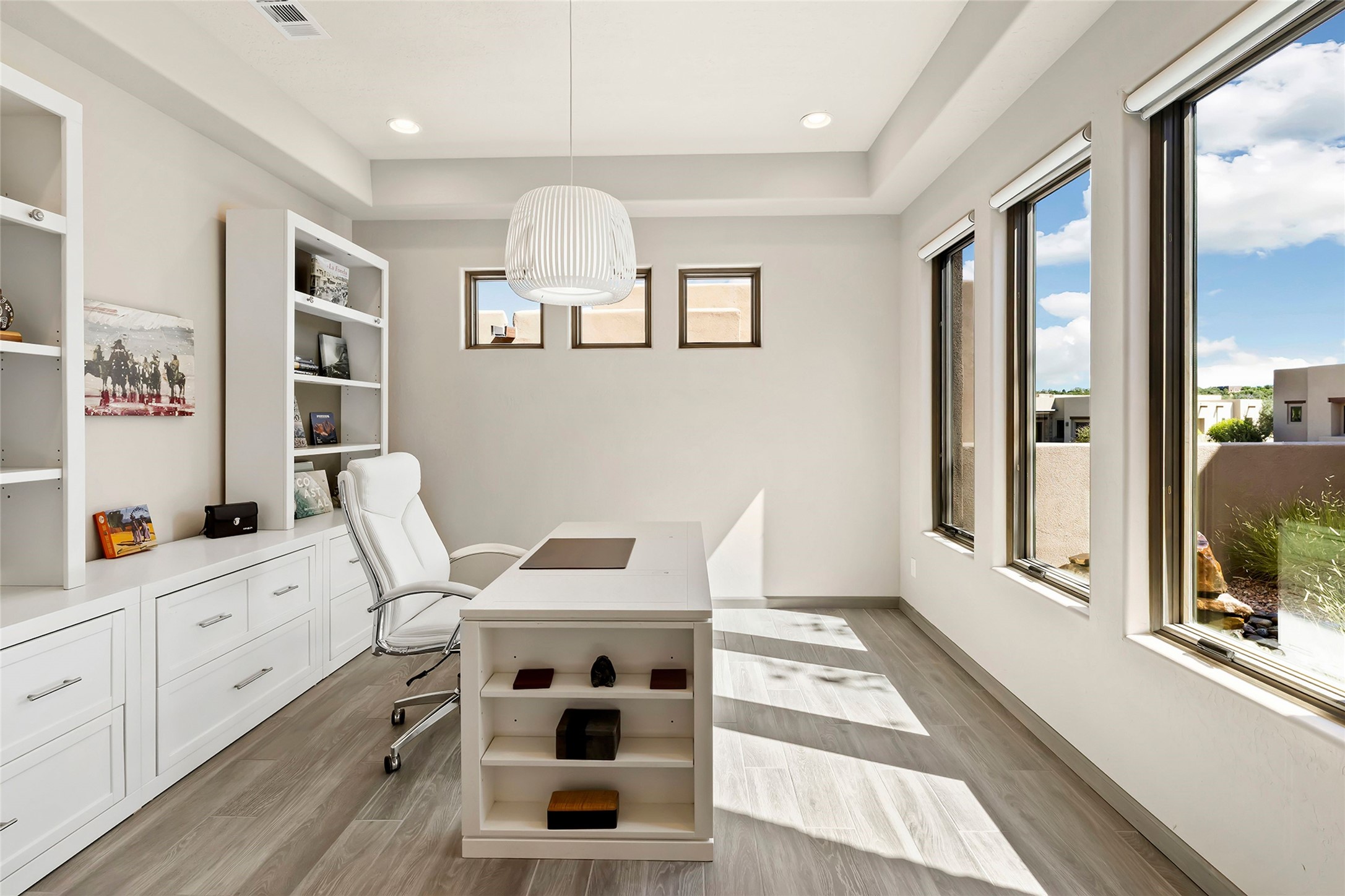 Live the Ultimate Las Campanas Lifestyle. Perfectly sited on a premier elevated lot with Jemez Mountain and dramatic sunset views, this exciting 2022-built residence with a private casita and 3-car garage is a rare offering. Located within walking distance of The Club at Las Campanas, this exceptional home seamlessly blends sophisticated modern design with the true essence of Santa Fe. The gated front entrance opens to an intimate courtyard with a tranquil fountain, which connects the main home and casita. Thoughtfully designed, this floor plan highlights a spectacular living room ideal for both relaxed living and grand entertaining with western views which frame the space, rich wood plank and and beam ceiling accents, a modern gas fireplace with surround stacked stone, wet bar or barista area and retractable glass doors which create a true indoor-outdoor living experience. The chef's island kitchen is a delight, featuring natural stone counters, a generous breakfast bar, Wolf 6-burner range with double ovens and griddle, a Wolf wall oven and microwave, Sub-Zero refrigerator, dual dishwashers and a large walk-in pantry. This culinary haven flows into a gracious dining room with mountain views and designer lighting. The private, luxurious primary suite offers beautiful Jemez Mountain views, a cozy sitting area with fireplace and a spa-inspired bath with a soaking tub, walk-through shower, dual vanities and a custom walk-in closet. Separate from the main living areas are two guest suites, each with ensuite baths, which share a secondary living area or media room. The dedicated office with courtyard views provides an ideal work-from-home setting, while the separate casita with a 3/4 bath is an ideal guest quarters or studio. Outdoor living is elevated with multiple entertainment areas, a covered portal, two outdoor fireplaces and a built-in BBQ. This special home with smart-home technology and soft natural light throughout, defines excellence and is not to be missed.