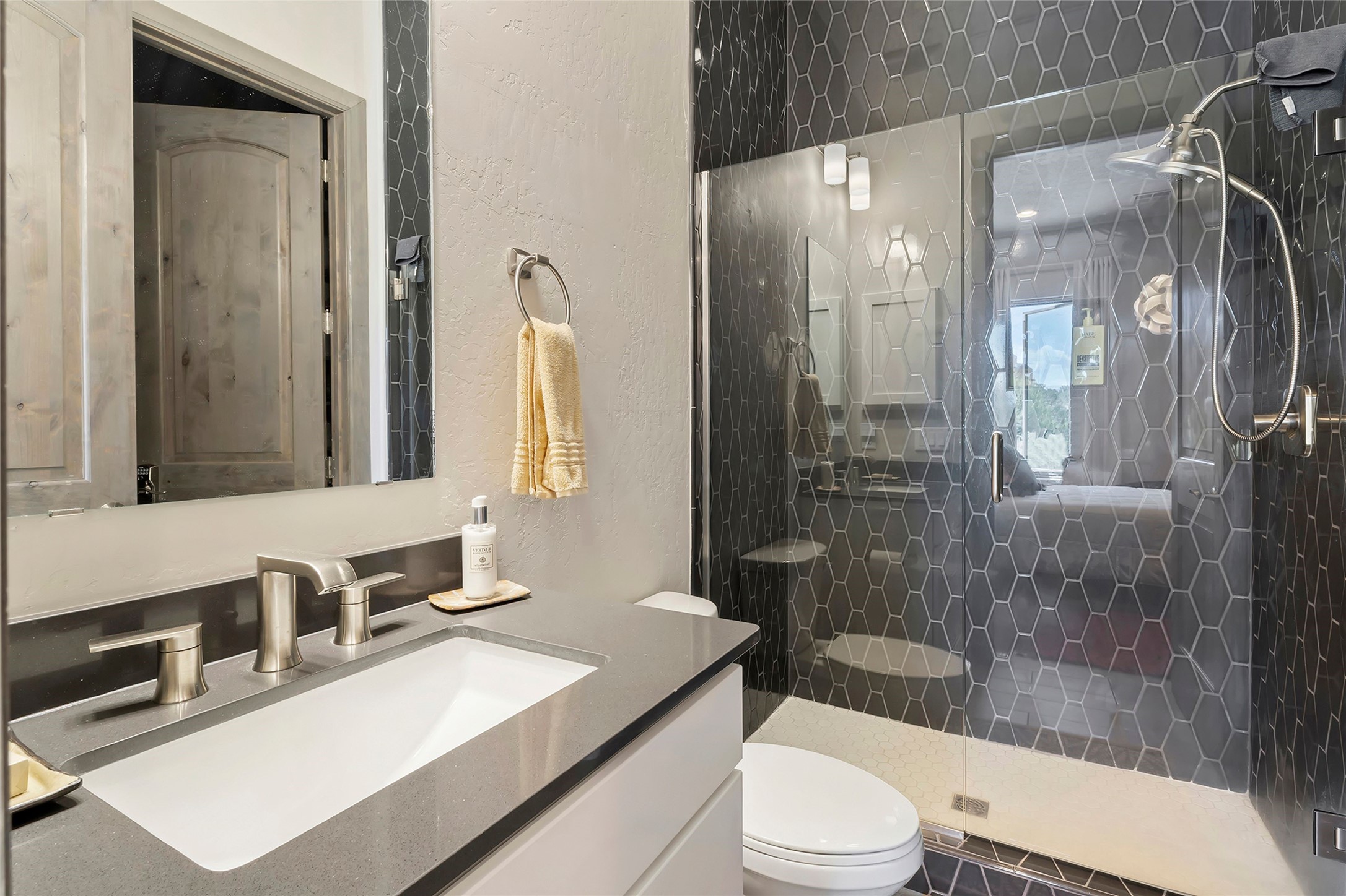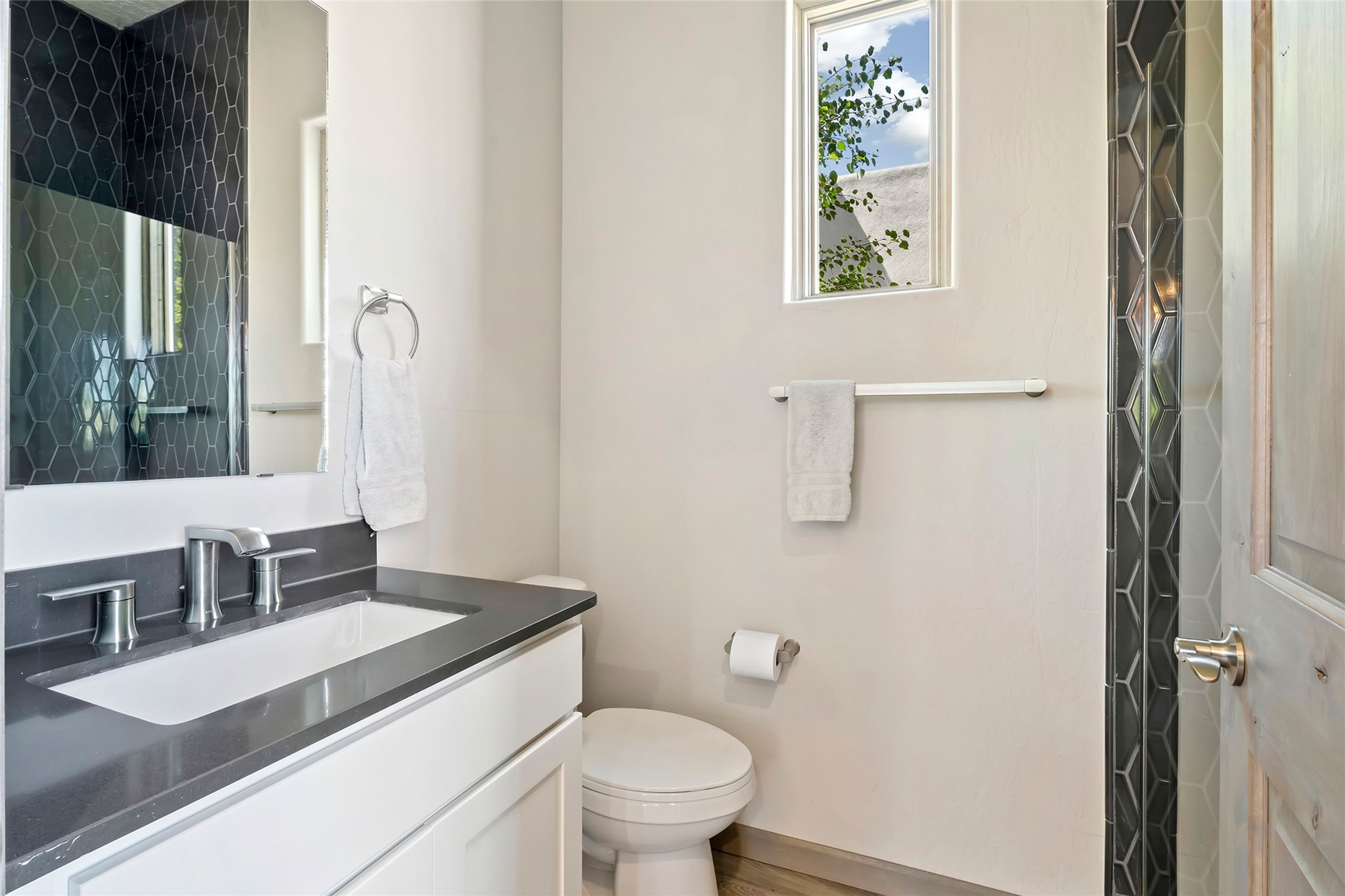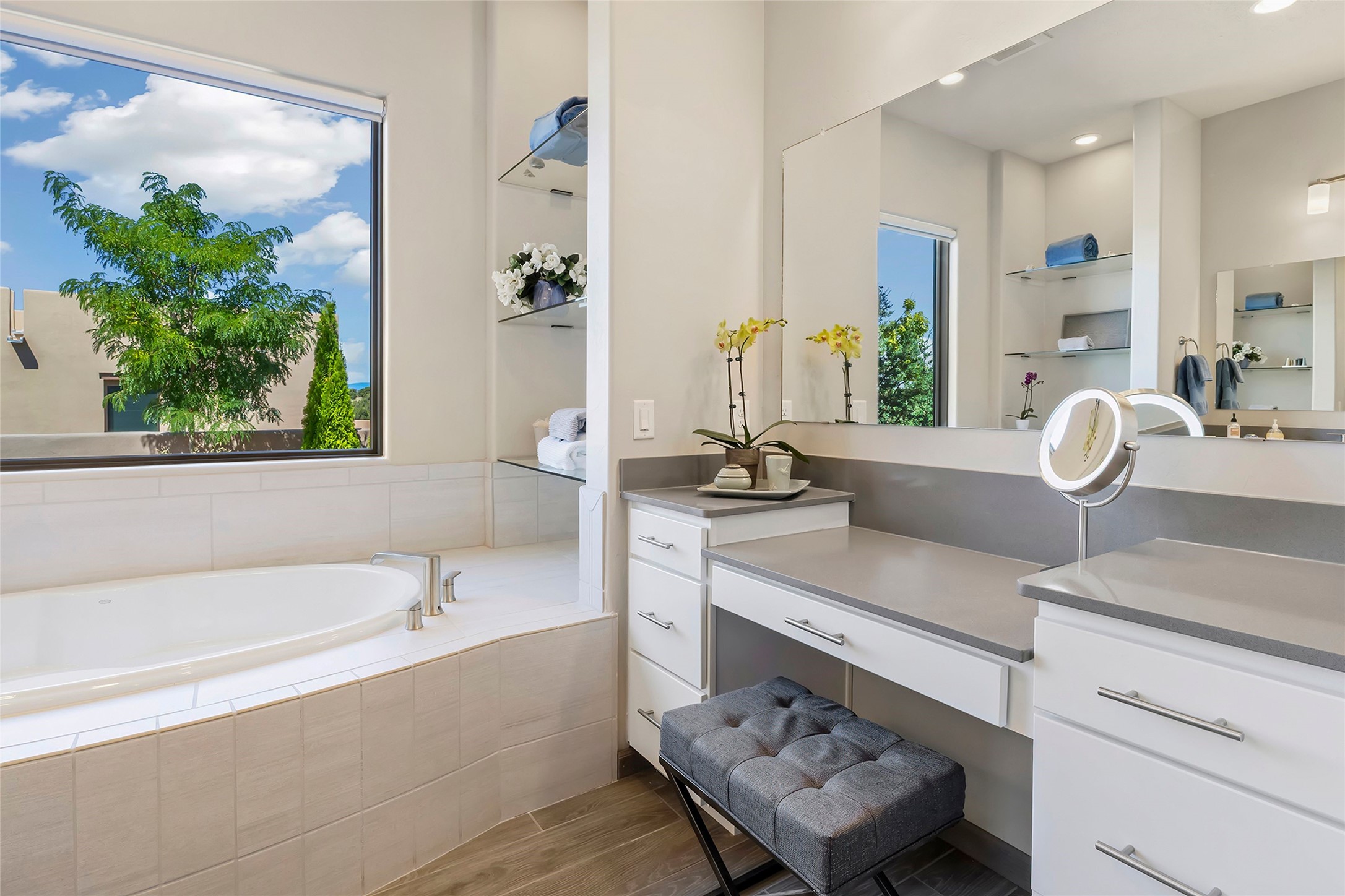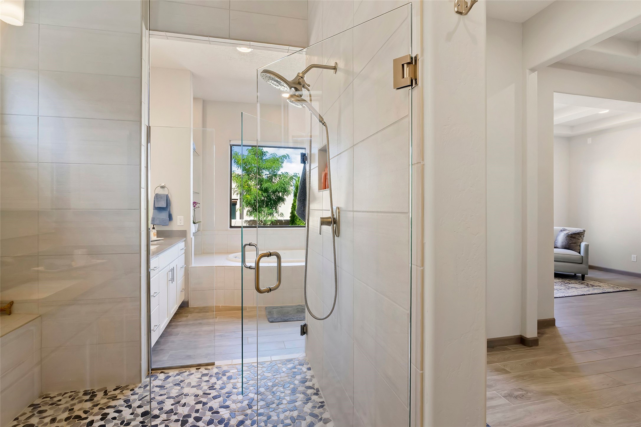 Live the Ultimate Las Campanas Lifestyle. Perfectly sited on a premier elevated lot with Jemez Mountain and dramatic sunset views, this exciting 2022-built residence with a private casita and 3-car garage is a rare offering. Located within walking distance of The Club at Las Campanas, this exceptional home seamlessly blends sophisticated modern design with the true essence of Santa Fe. The gated front entrance opens to an intimate courtyard with a tranquil fountain, which connects the main home and casita. Thoughtfully designed, this floor plan highlights a spectacular living room ideal for both relaxed living and grand entertaining with western views which frame the space, rich wood plank and and beam ceiling accents, a modern gas fireplace with surround stacked stone, wet bar or barista area and retractable glass doors which create a true indoor-outdoor living experience. The chef's island kitchen is a delight, featuring natural stone counters, a generous breakfast bar, Wolf 6-burner range with double ovens and griddle, a Wolf wall oven and microwave, Sub-Zero refrigerator, dual dishwashers and a large walk-in pantry. This culinary haven flows into a gracious dining room with mountain views and designer lighting. The private, luxurious primary suite offers beautiful Jemez Mountain views, a cozy sitting area with fireplace and a spa-inspired bath with a soaking tub, walk-through shower, dual vanities and a custom walk-in closet. Separate from the main living areas are two guest suites, each with ensuite baths, which share a secondary living area or media room. The dedicated office with courtyard views provides an ideal work-from-home setting, while the separate casita with a 3/4 bath is an ideal guest quarters or studio. Outdoor living is elevated with multiple entertainment areas, a covered portal, two outdoor fireplaces and a built-in BBQ. This special home with smart-home technology and soft natural light throughout, defines excellence and is not to be missed.