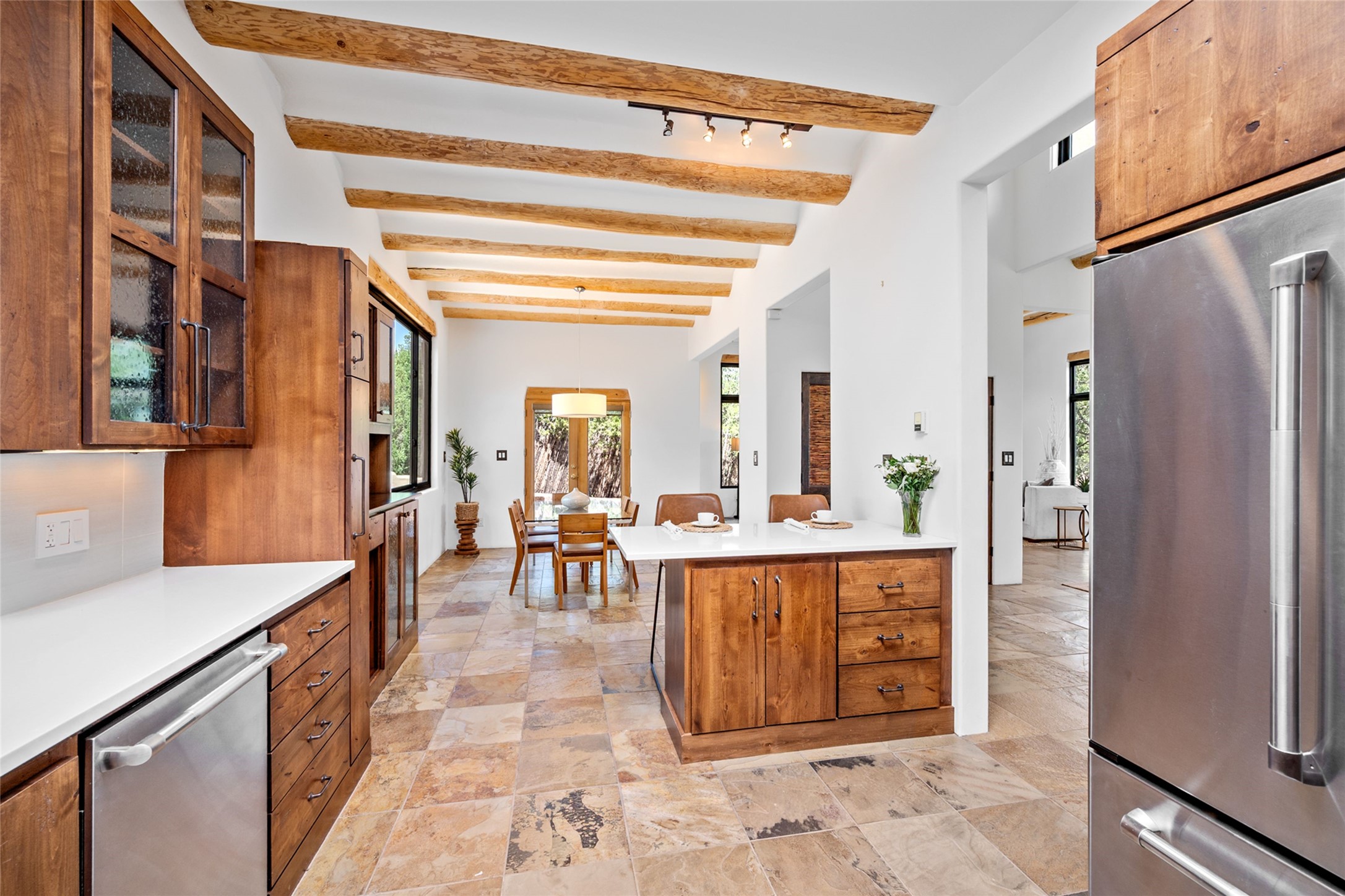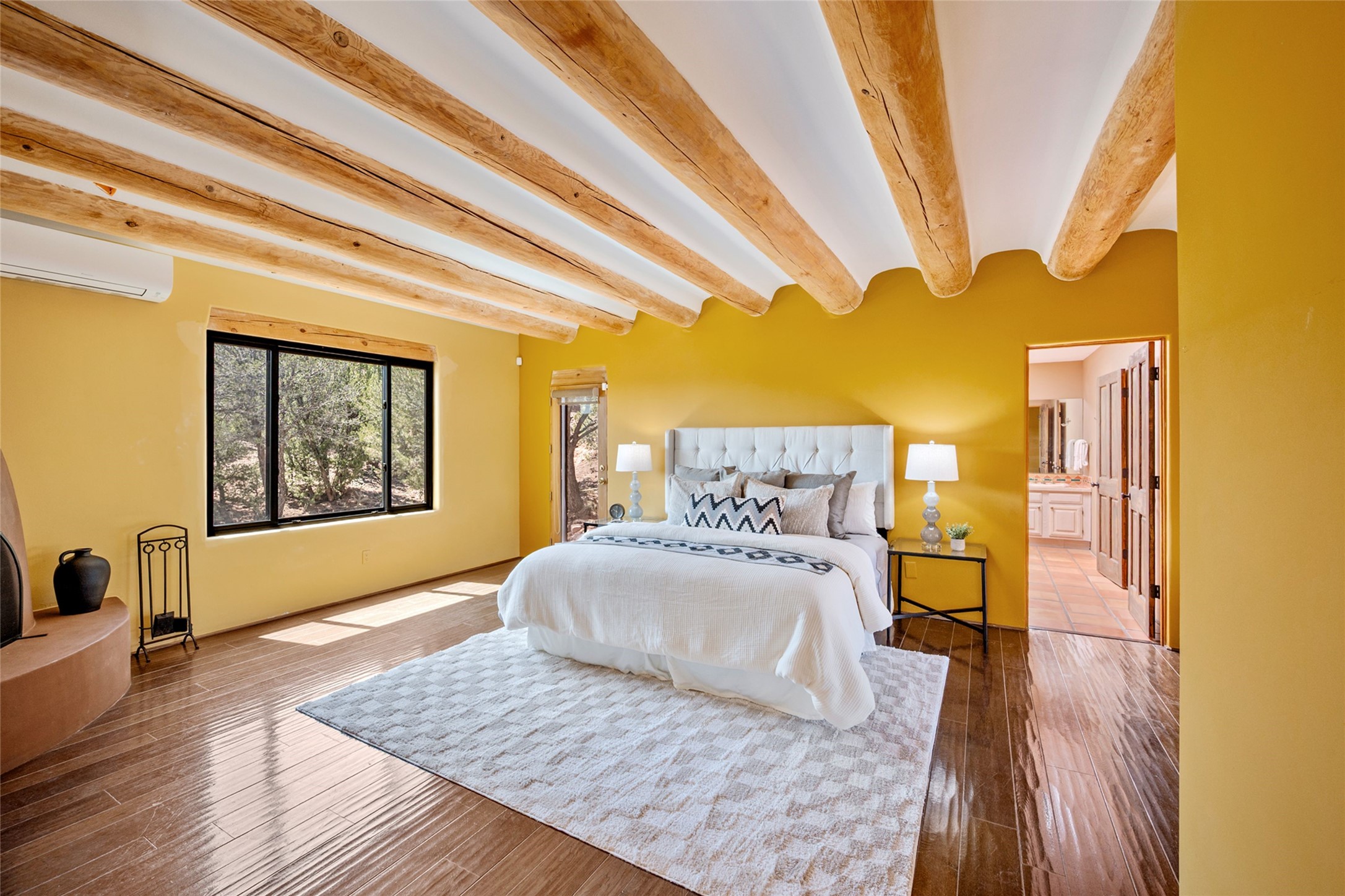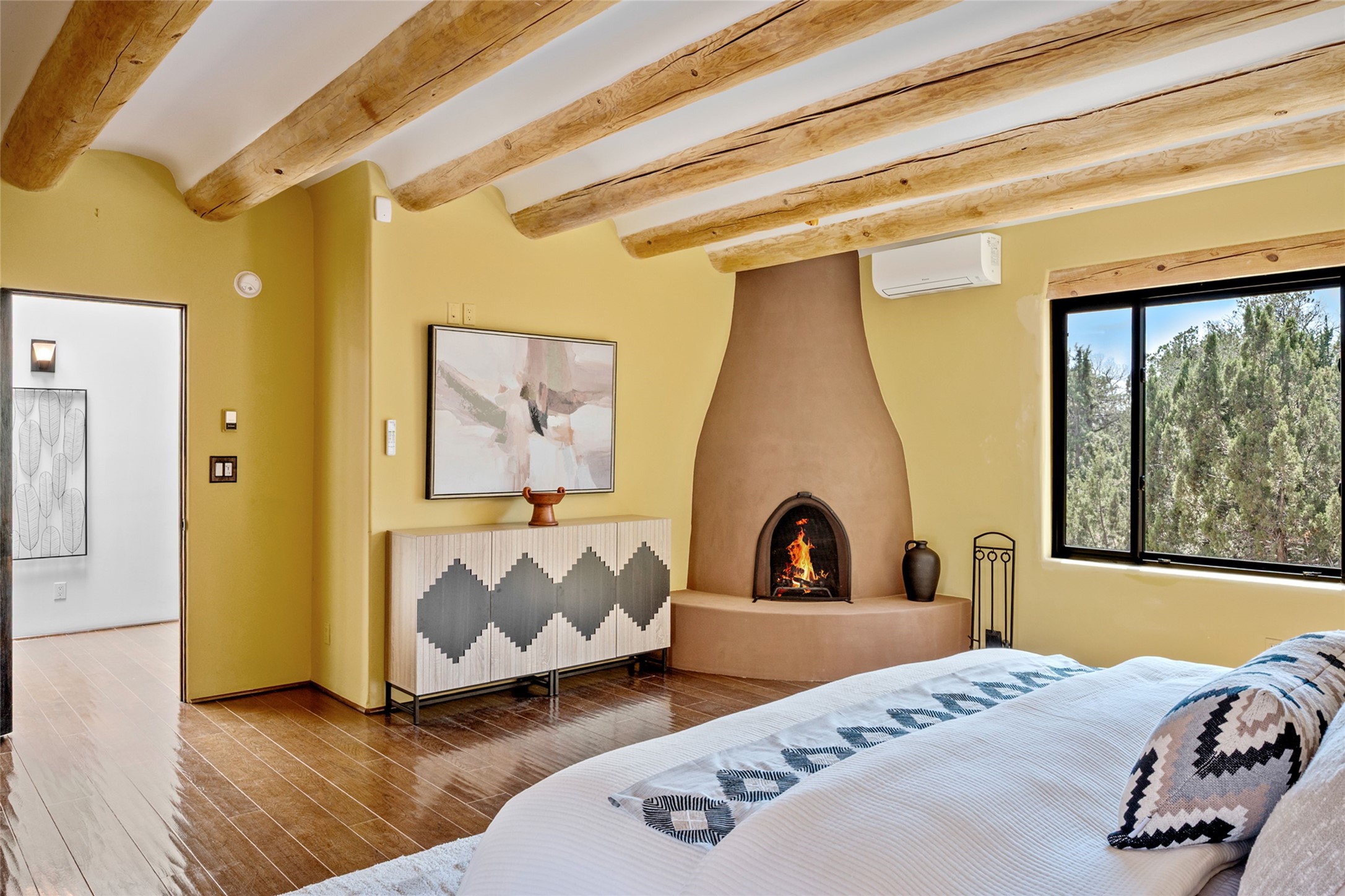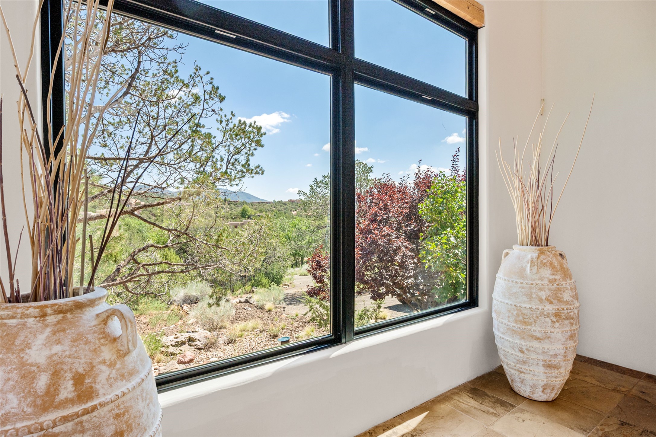 In the heart of the highly desirable Santa Fe Northside, this 4-bedroom, 2-bathroom bi-level home blends modern upgrades with timeless Santa Fe charm. Soaring ceilings, an open floor plan, and expansive picture windows flood the home with natural light and frame the surrounding landscape, seamlessly bringing the outdoors in.The kitchen features elegant glass-paned cabinetry, dual copper-toned lazy susans, and abundant storage--both functional and beautiful. The spacious primary suite includes a cozy wood-burning fireplace, a generous en-suite bath with walk-in closet, and direct access to a screened porch and private patio.Recent updates--new Anderson windows and efficient mini-splits ensure year-round comfort. The flexible bi-level layout and two-car garage add everyday convenience. Despite its serene setting, this home is just minutes from town--only a four-minute drive to the Plaza.Combining comfort, efficiency, and natural beauty, this inviting property is the perfect retreat in one of Santa Fe's most coveted locations.