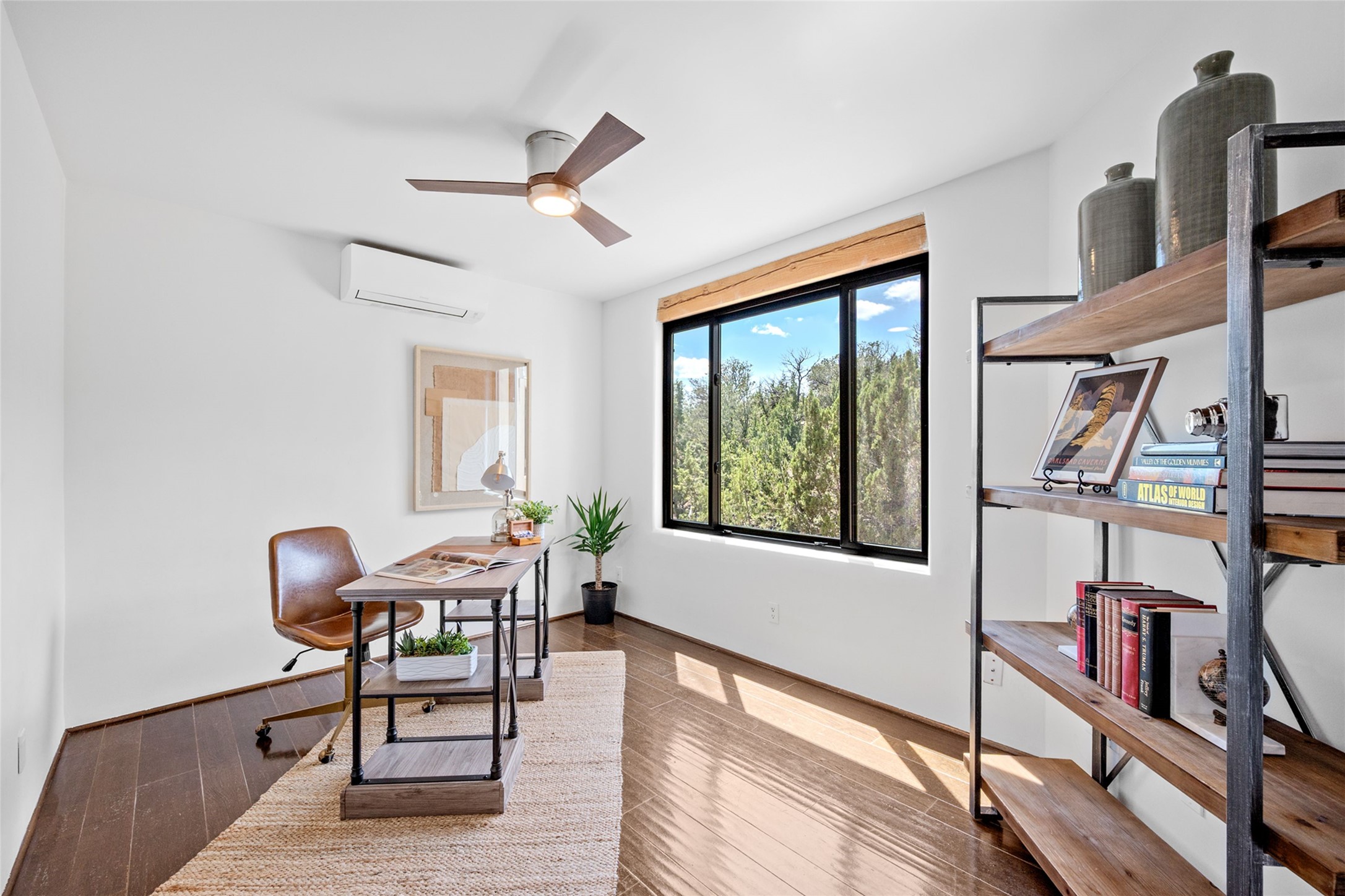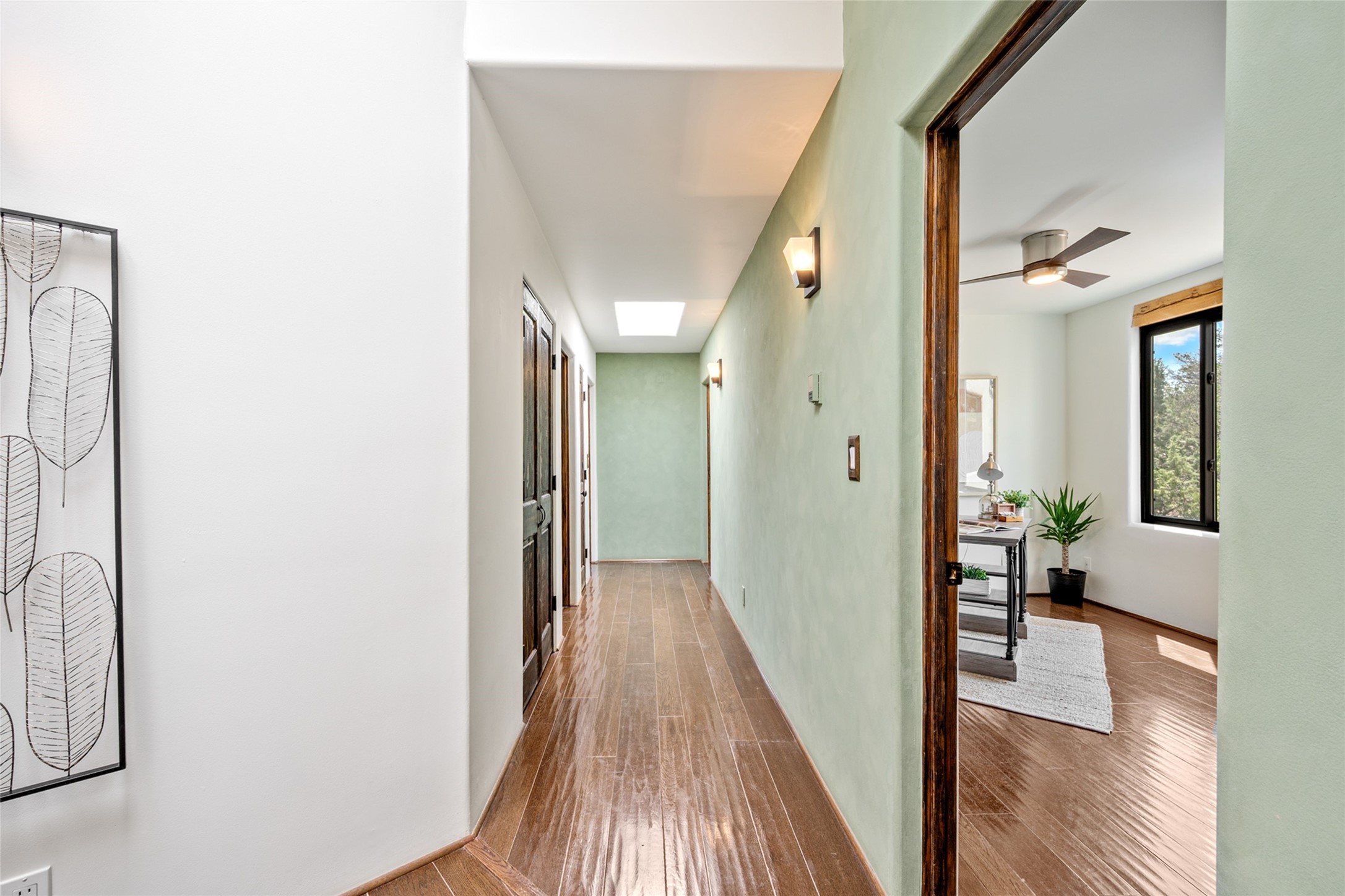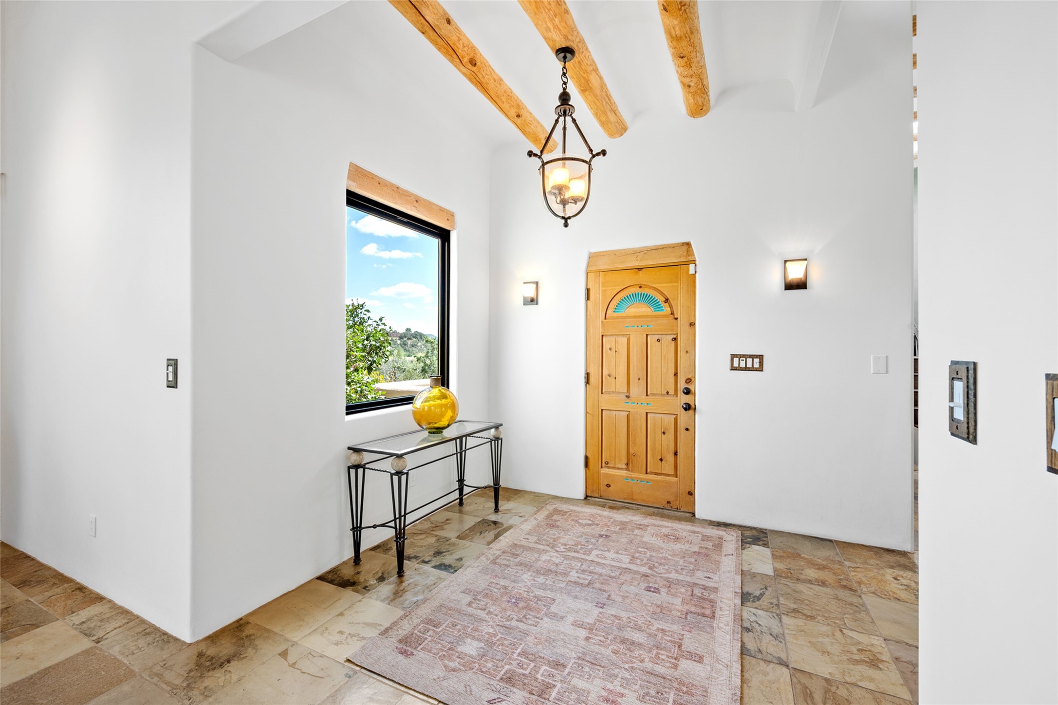 In the heart of the highly desirable Santa Fe Northside, this 4-bedroom, 2-bathroom bi-level home blends modern upgrades with timeless Santa Fe charm. Soaring ceilings, an open floor plan, and expansive picture windows flood the home with natural light and frame the surrounding landscape, seamlessly bringing the outdoors in.The kitchen features elegant glass-paned cabinetry, dual copper-toned lazy susans, and abundant storage--both functional and beautiful. The spacious primary suite includes a cozy wood-burning fireplace, a generous en-suite bath with walk-in closet, and direct access to a screened porch and private patio.Recent updates--new Anderson windows and efficient mini-splits ensure year-round comfort. The flexible bi-level layout and two-car garage add everyday convenience. Despite its serene setting, this home is just minutes from town--only a four-minute drive to the Plaza.Combining comfort, efficiency, and natural beauty, this inviting property is the perfect retreat in one of Santa Fe's most coveted locations.