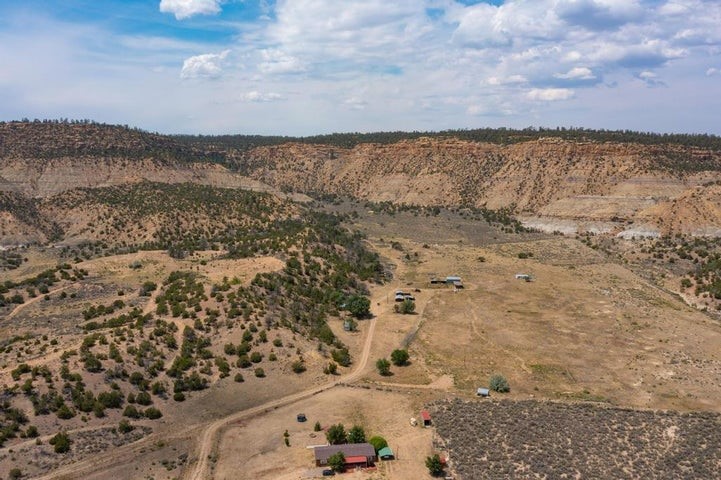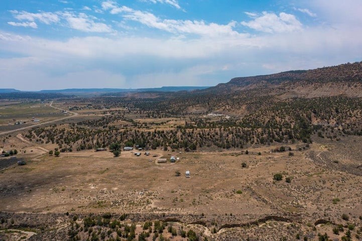 This versatile 81 acre property nestled in a peaceful canyon surrounded by grand mesas, abuts a 'hike-in' area of the Santa Fe National Forest to the west and BLM land to the north! Plenty of potential for horses, hunting, livestock and more. Watch Elk graze right outside your front porch while enjoying magnificent sunrises and sunsets. There is source of gravel and petrified wood is prevalent. Outbuildings include a shop/garage/storage 20'W x 40'D x 12'H (approx),a detached two level cellar/storage building, a tack room, a horse corral plus shaded area and more. The house has a propane line running to it.